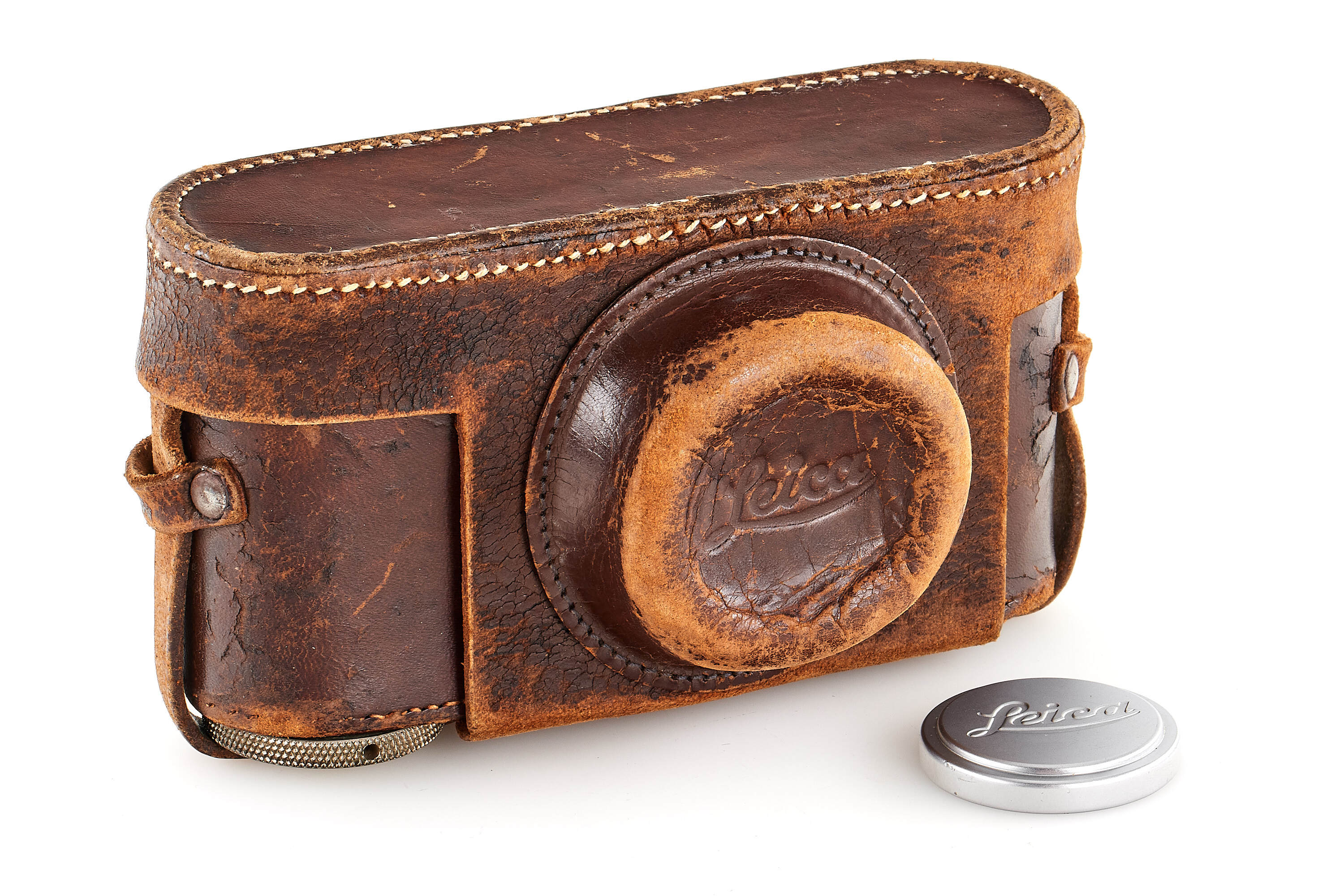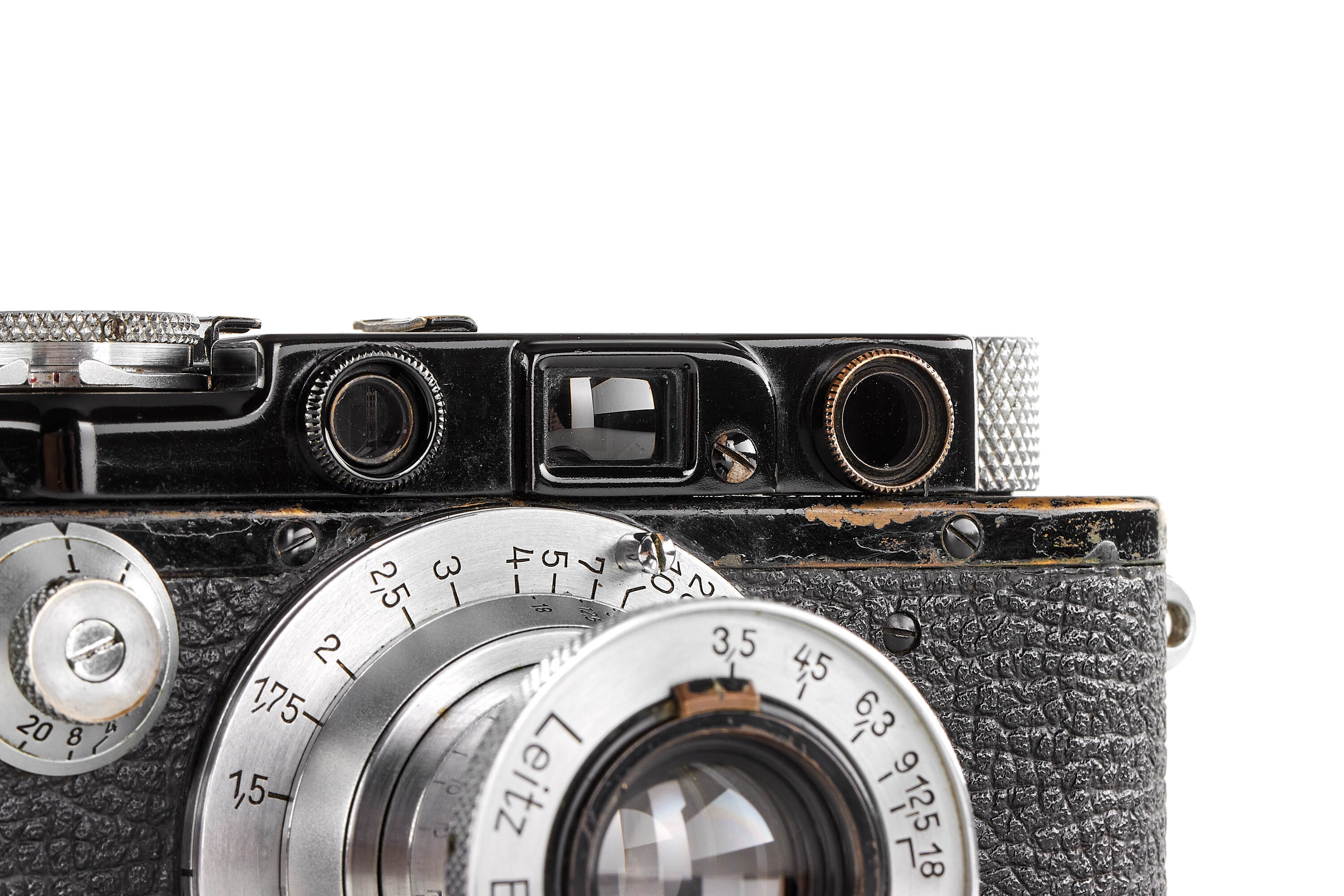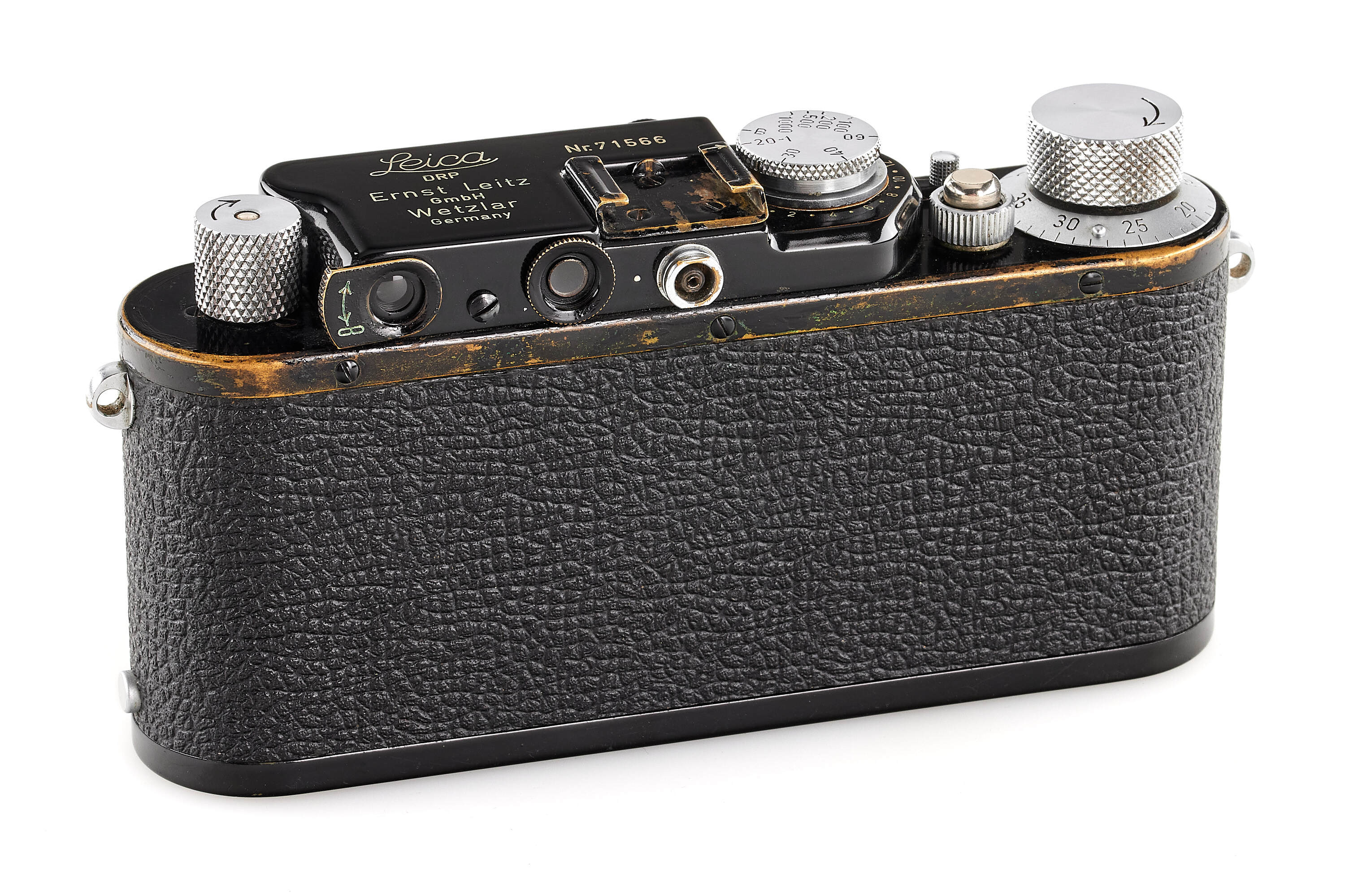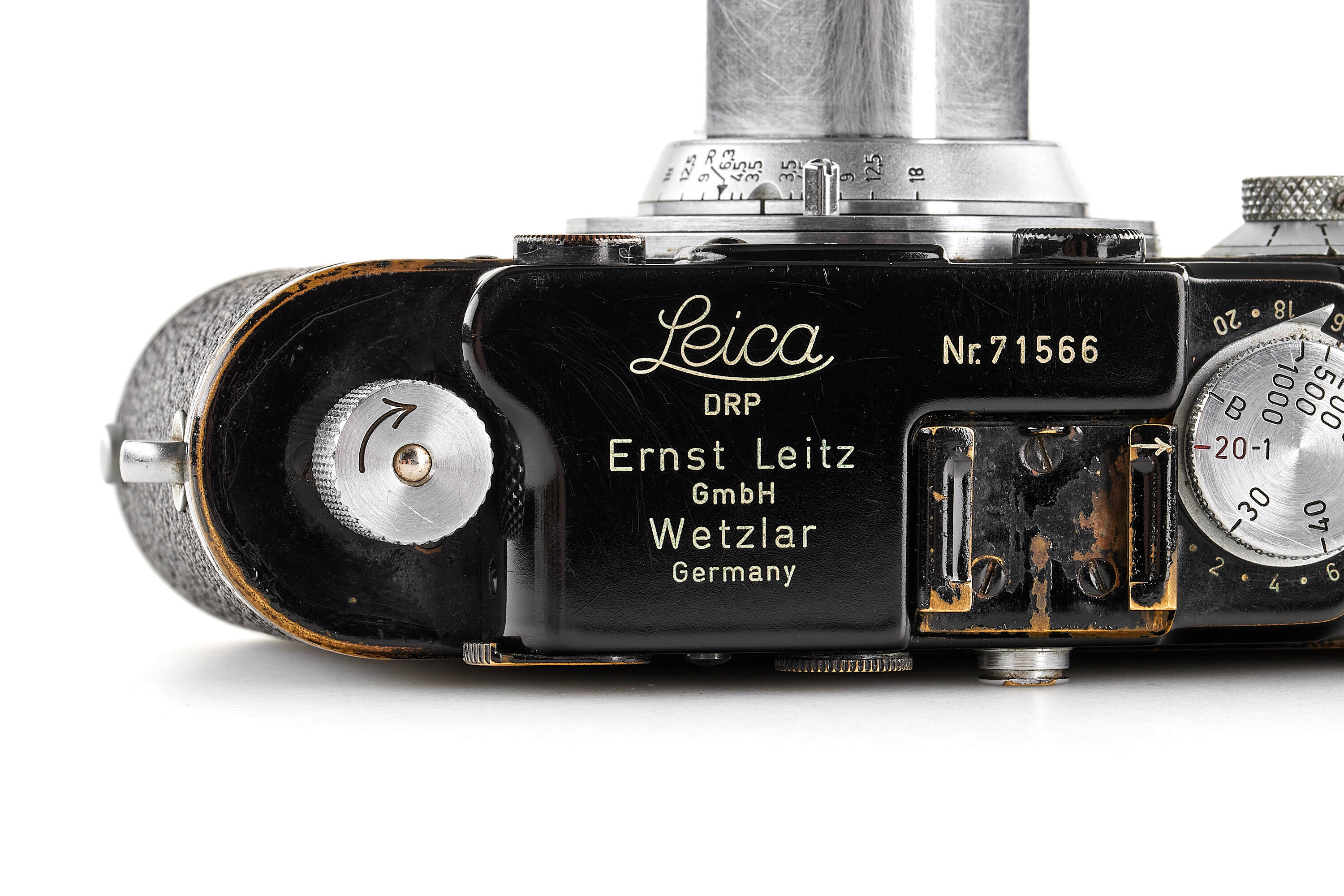 Very nice black/paint Leica with IIIf specifications, originally a very early Leica II Mod. D, upgraded in 1953 and 1954, in good condition, note the shutter release button is still in nickel finish, as well as the rewind knob axis, together with chrome Elmar 3.5/5cm no.534329 (good optics only showing a light haze), with front lens caps and leather case (cond. B).