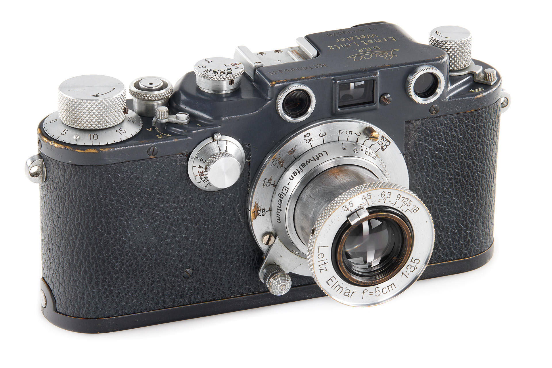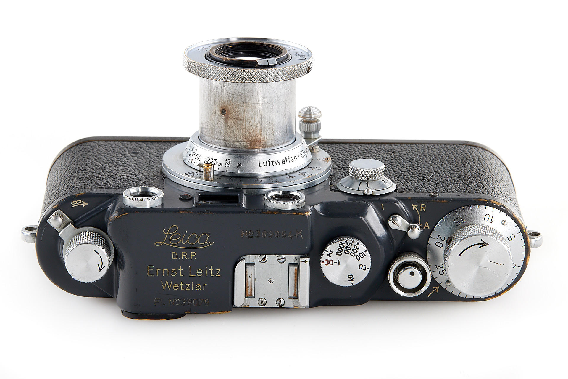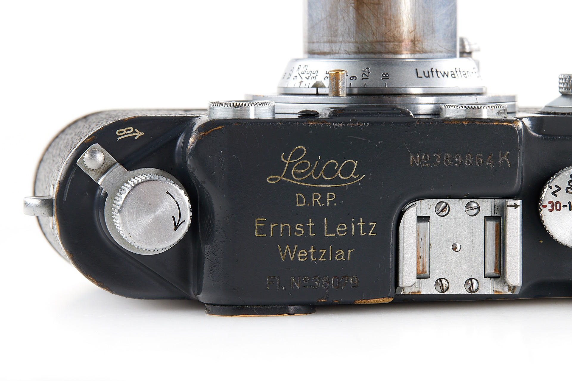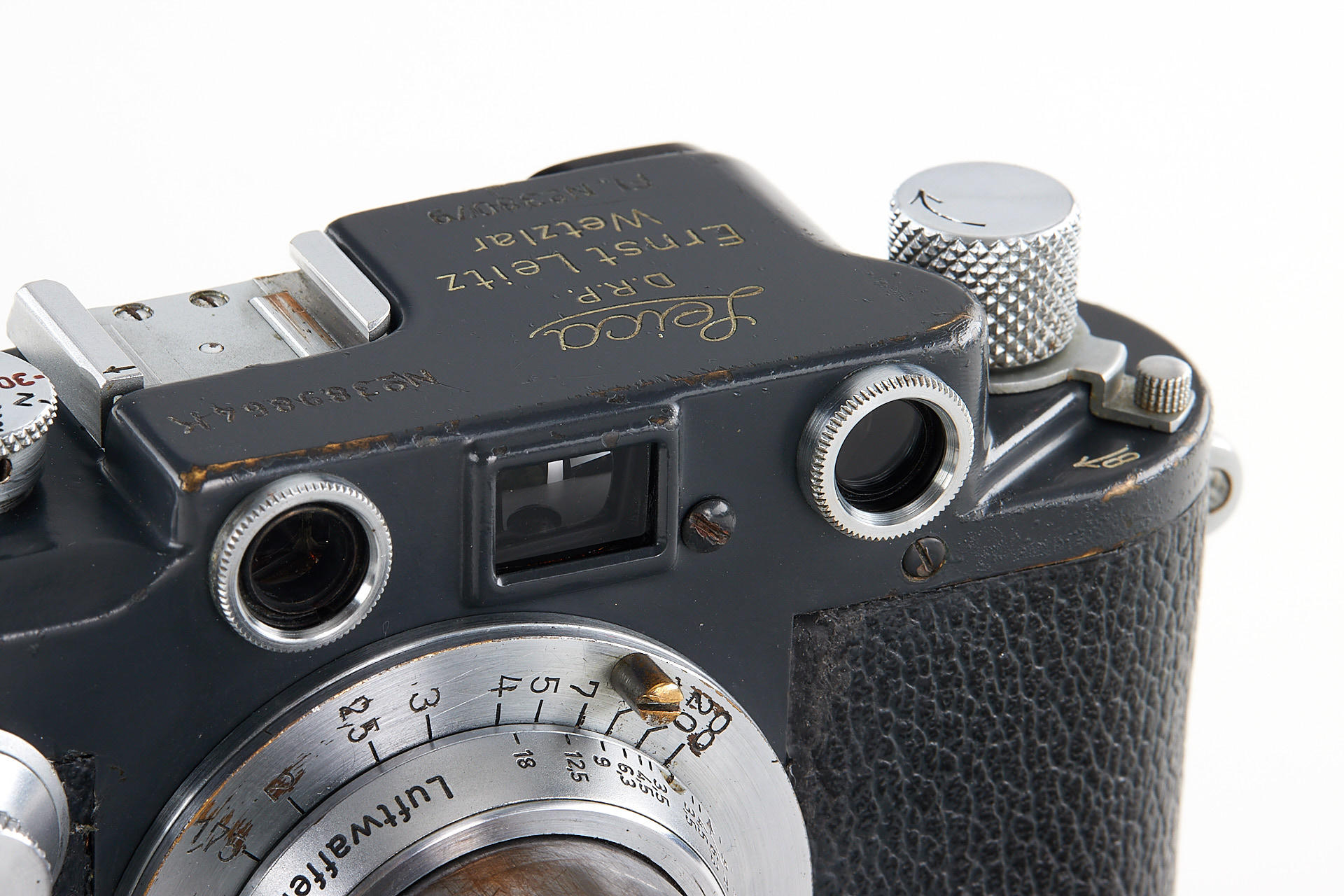 military IIIc grey in very good condition, grey leather covering, engraved with 'FL.No.38079', 'Luftwaffen-Eigentum' engraving defaced, white K on shutter blind, with Elmar 3.5/5cm no.499973 engraved 'Luftwaffen-Eigentum', lens cap - camera (LOOKX B. Luftwaffe) delivered on August 24th, 1943 to Bln 9909 (Berlin)