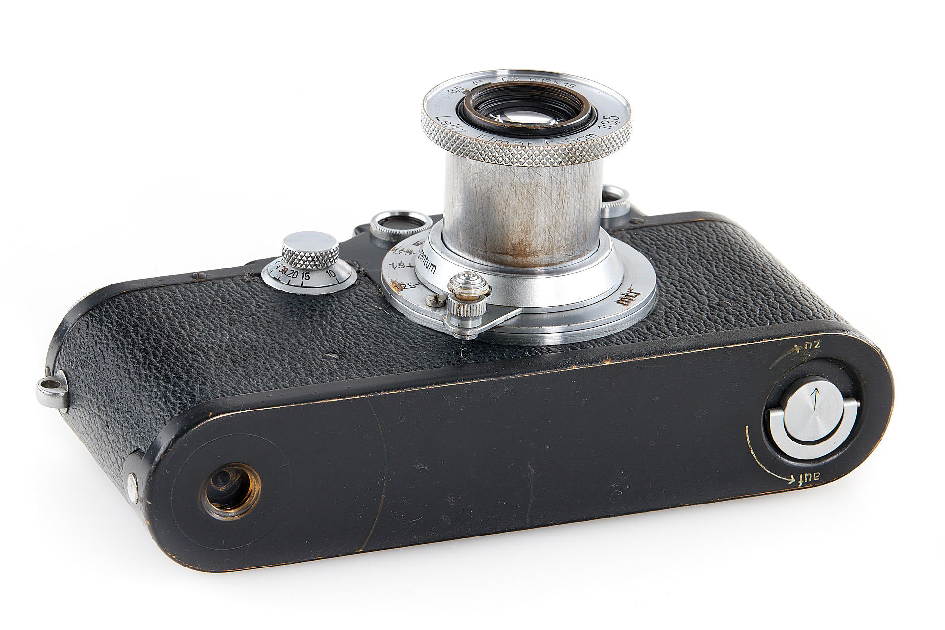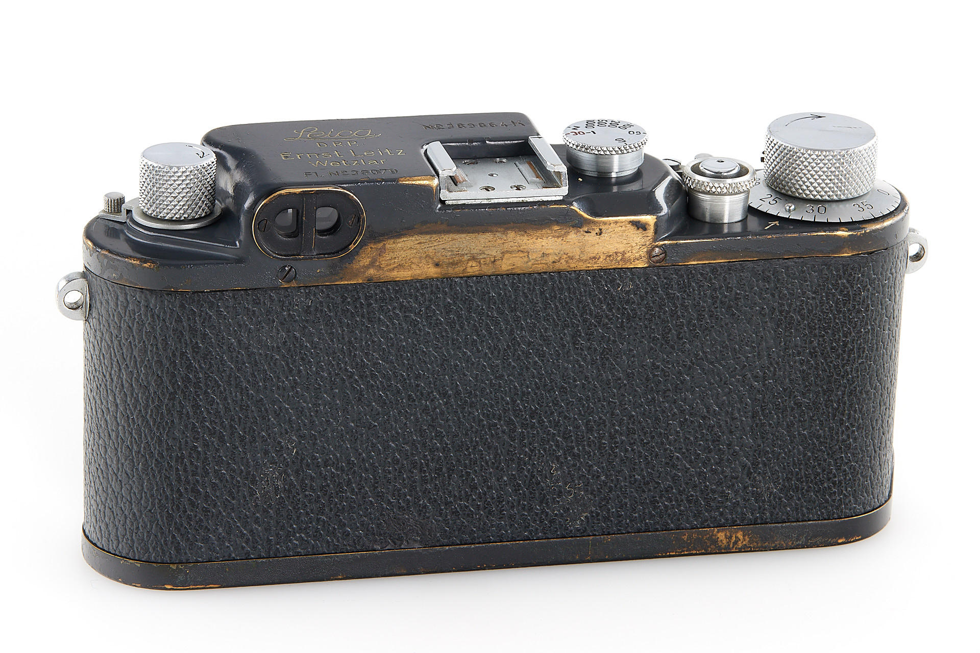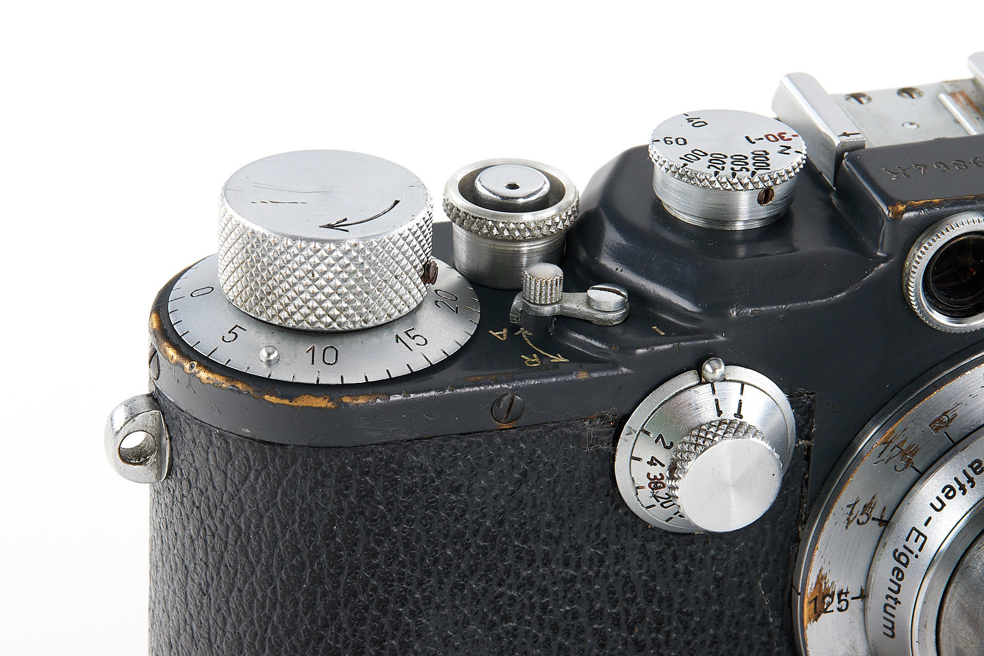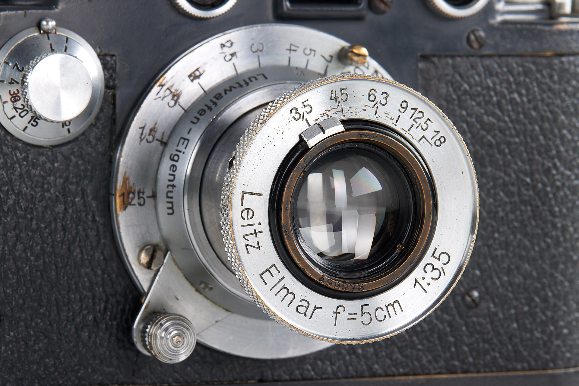 military IIIc grey in very good condition, grey leather covering, engraved with 'FL.No.38079', 'Luftwaffen-Eigentum' engraving defaced, white K on shutter blind, with Elmar 3.5/5cm no.499973 engraved 'Luftwaffen-Eigentum', lens cap - camera (LOOKX B. Luftwaffe) delivered on August 24th, 1943 to Bln 9909 (Berlin)