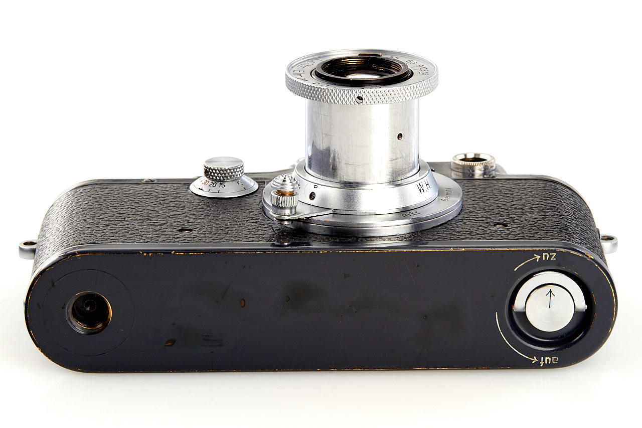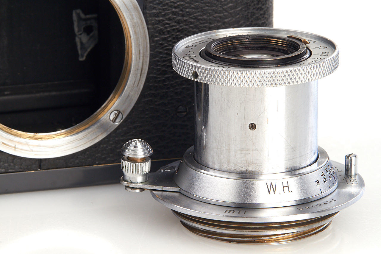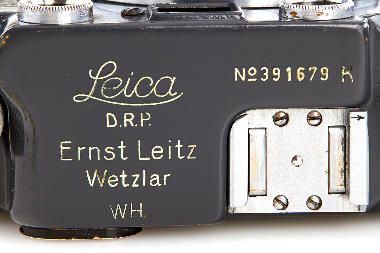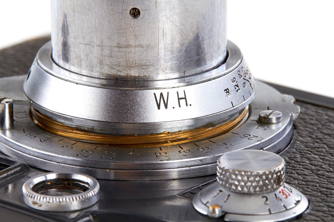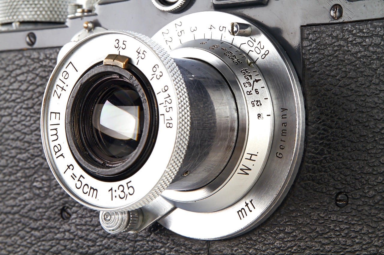 fully original and rare W.H. (Wehrmacht-Heer) camera in fantastic, near mint condition (all details original - grey leather, still with special fiducial points at film plate, white 'K' on shutter blind, grey paint), matching Elmar 3.5/5cm no.591776 (engraved 'W.H.') - it is for sure one of the best condition IIIc W.H. existing