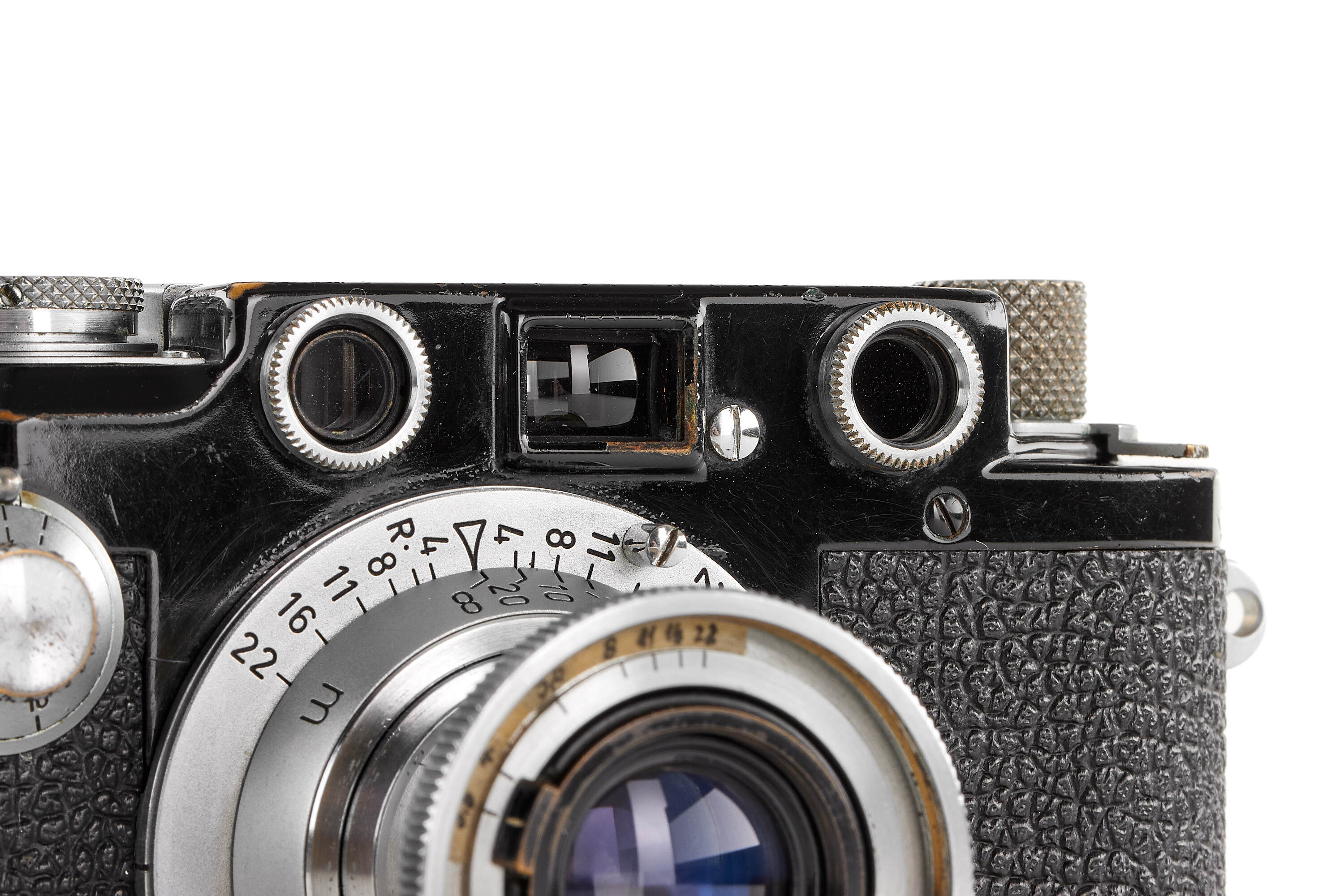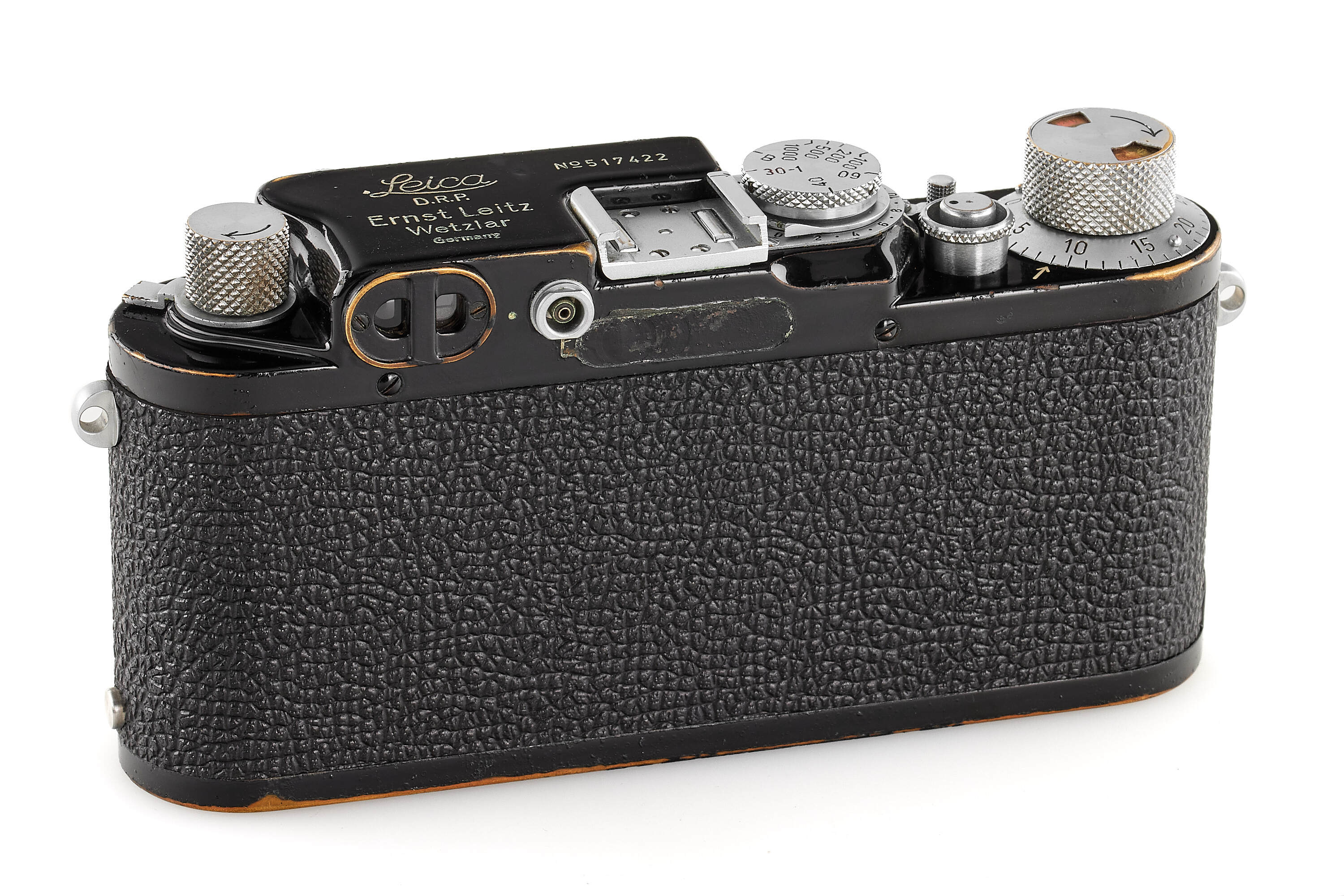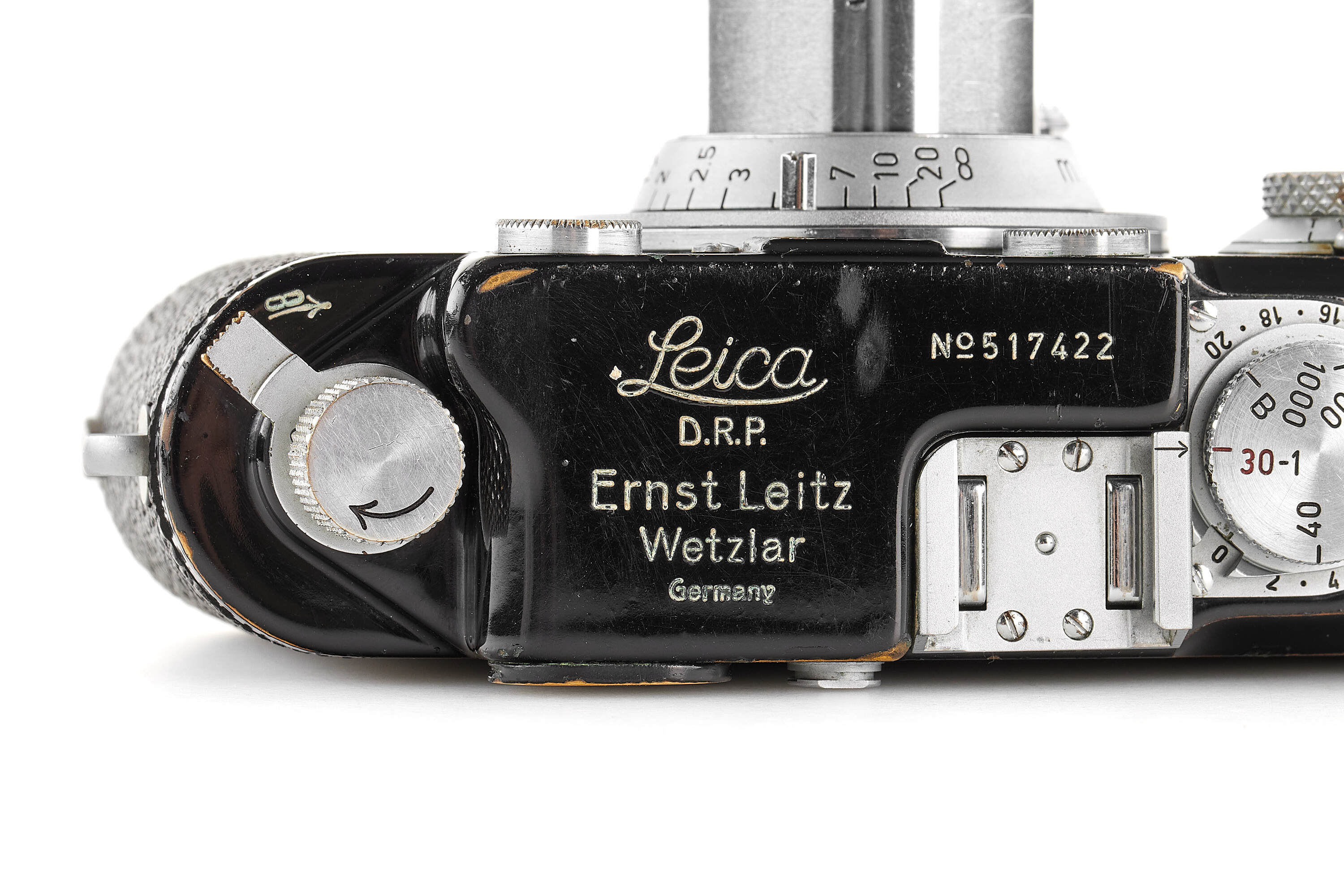 Very rare, original Leica IIIc 'Leitz Eigentum' (property of Leitz) in black paint finish. This special batch of Leica cameras (517401–517525) is noted in the Leica Control Book with the annotation: “Kameras mit Leitz-Eigentum graviert u. schwarz lackiert” (cameras with Leitz Eigentum engraving and black painted). As with most of these cameras, the offered example had its original engraving defaced at the factory and was later upgraded to IIIf specifications.