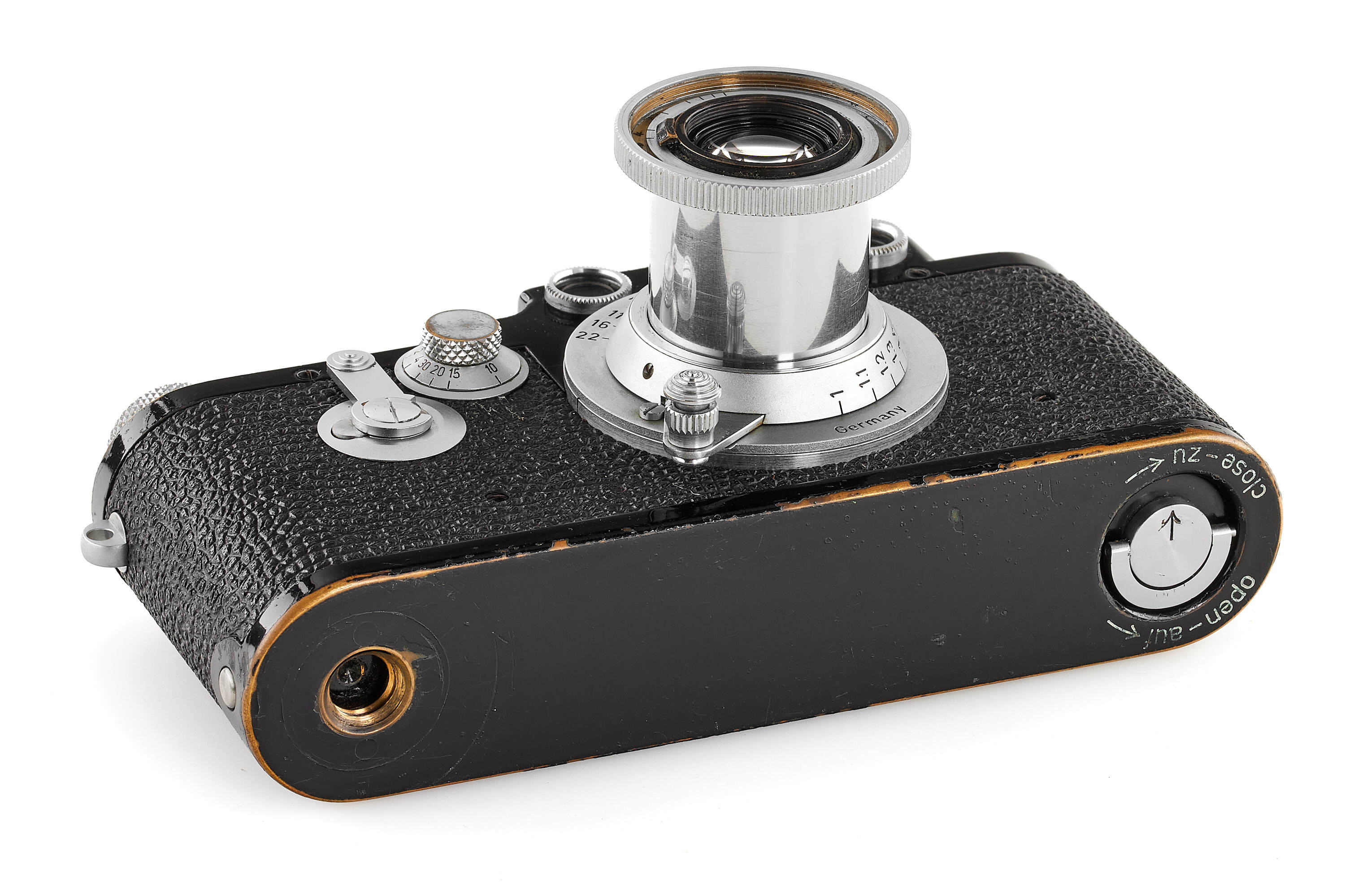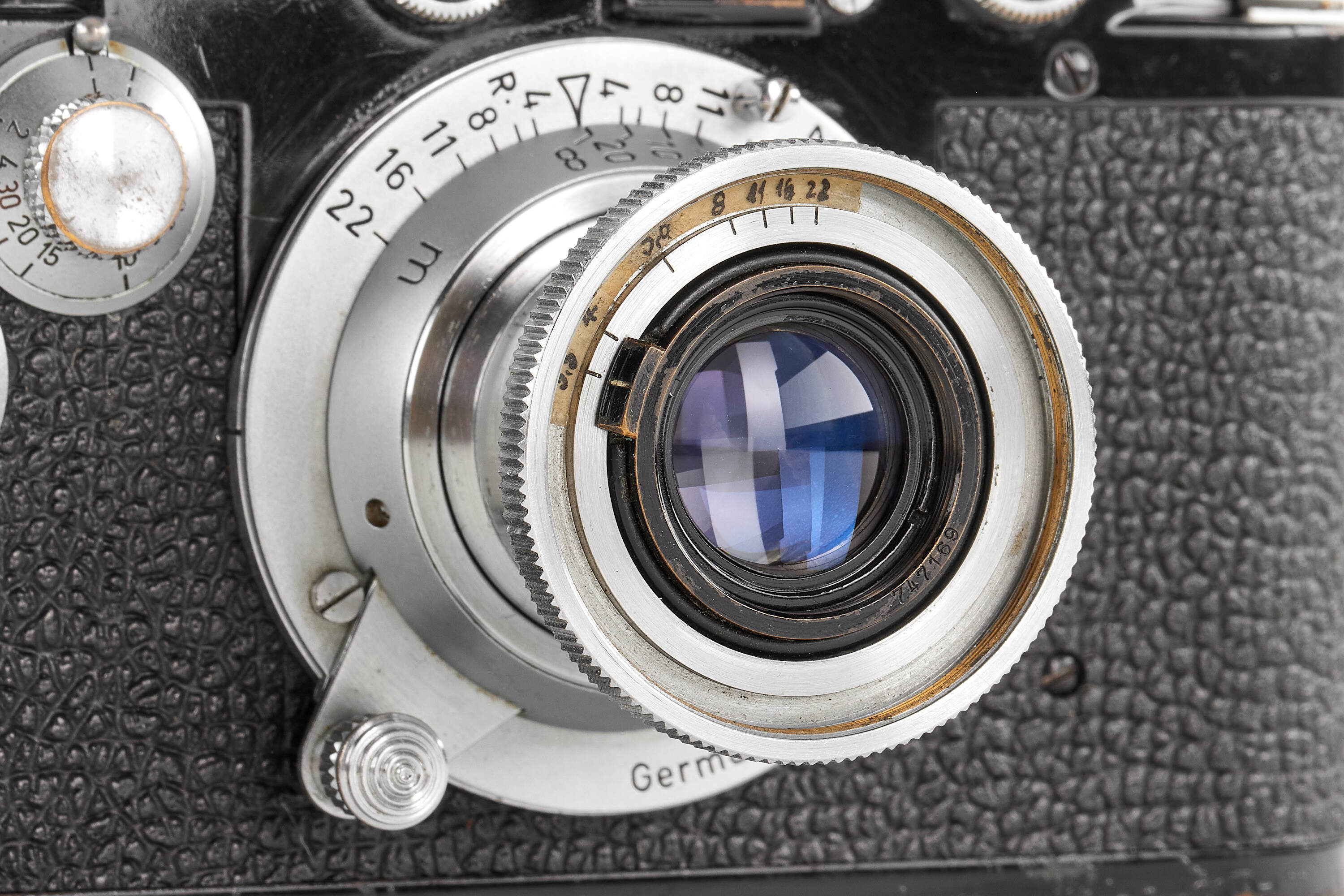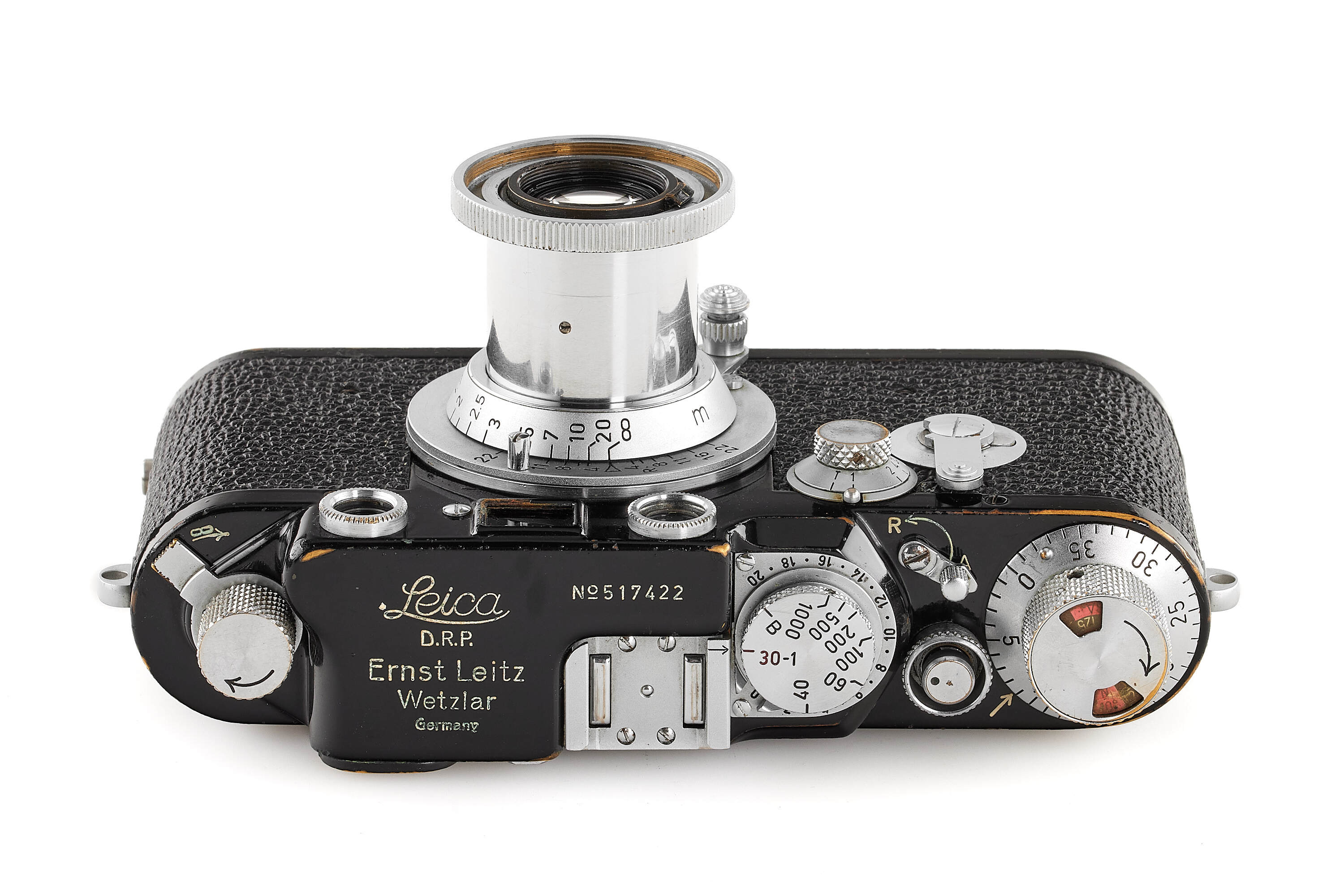 Very rare, original Leica IIIc 'Leitz Eigentum' (property of Leitz) in black paint finish. This special batch of Leica cameras (517401–517525) is noted in the Leica Control Book with the annotation: “Kameras mit Leitz-Eigentum graviert u. schwarz lackiert” (cameras with Leitz Eigentum engraving and black painted). As with most of these cameras, the offered example had its original engraving defaced at the factory and was later upgraded to IIIf specifications.