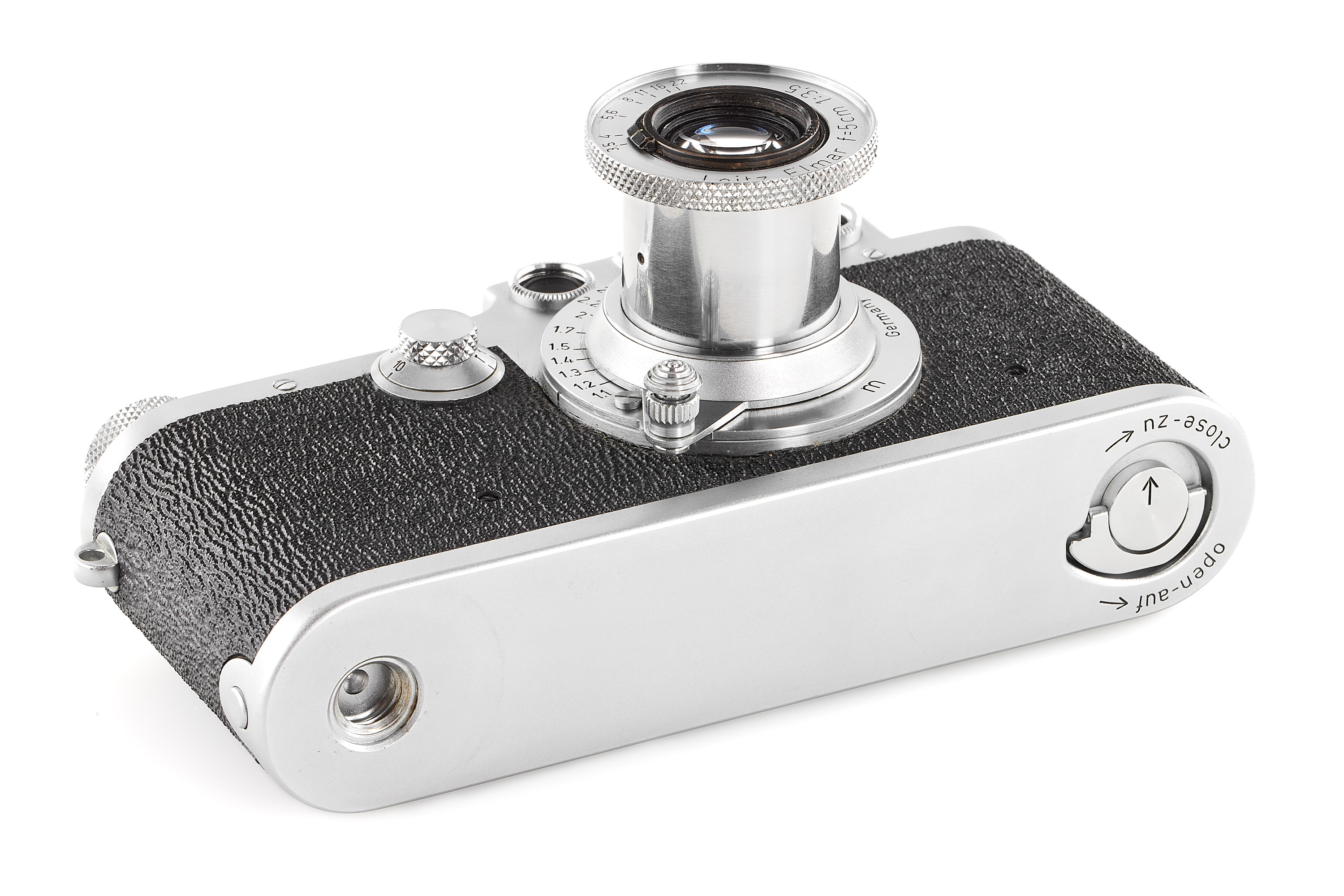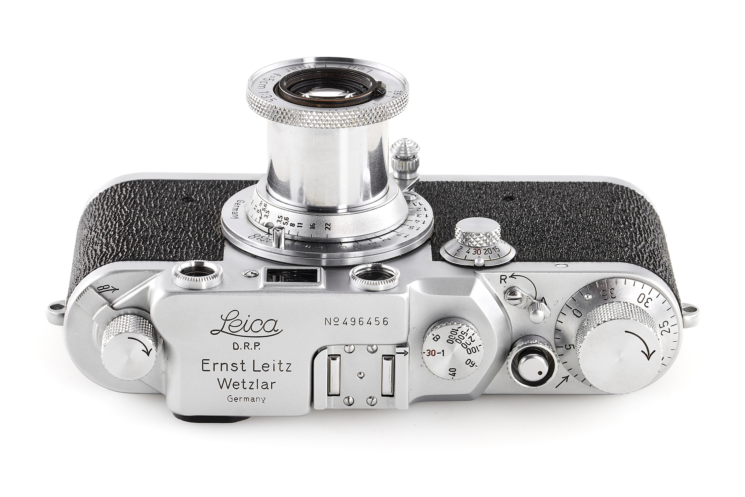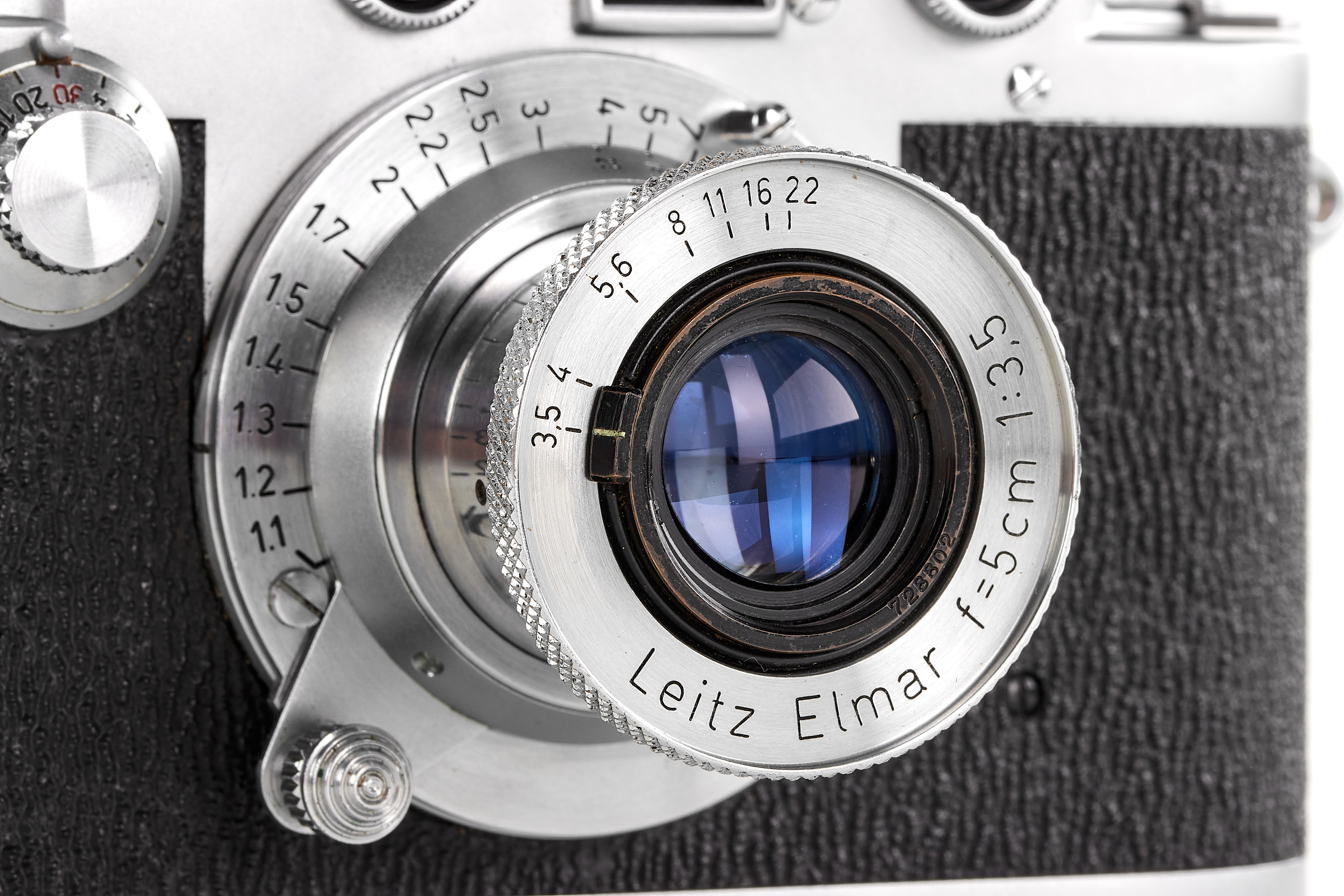 A beautiful late Leica IIIc with shark skin type vulcanite covering, in absolutely mint condition and working order, with matching meter scaled Elmar 3.5/5cm no.728802 (1949) only showing discrete cleaning marks on the front element, with front lens cap.