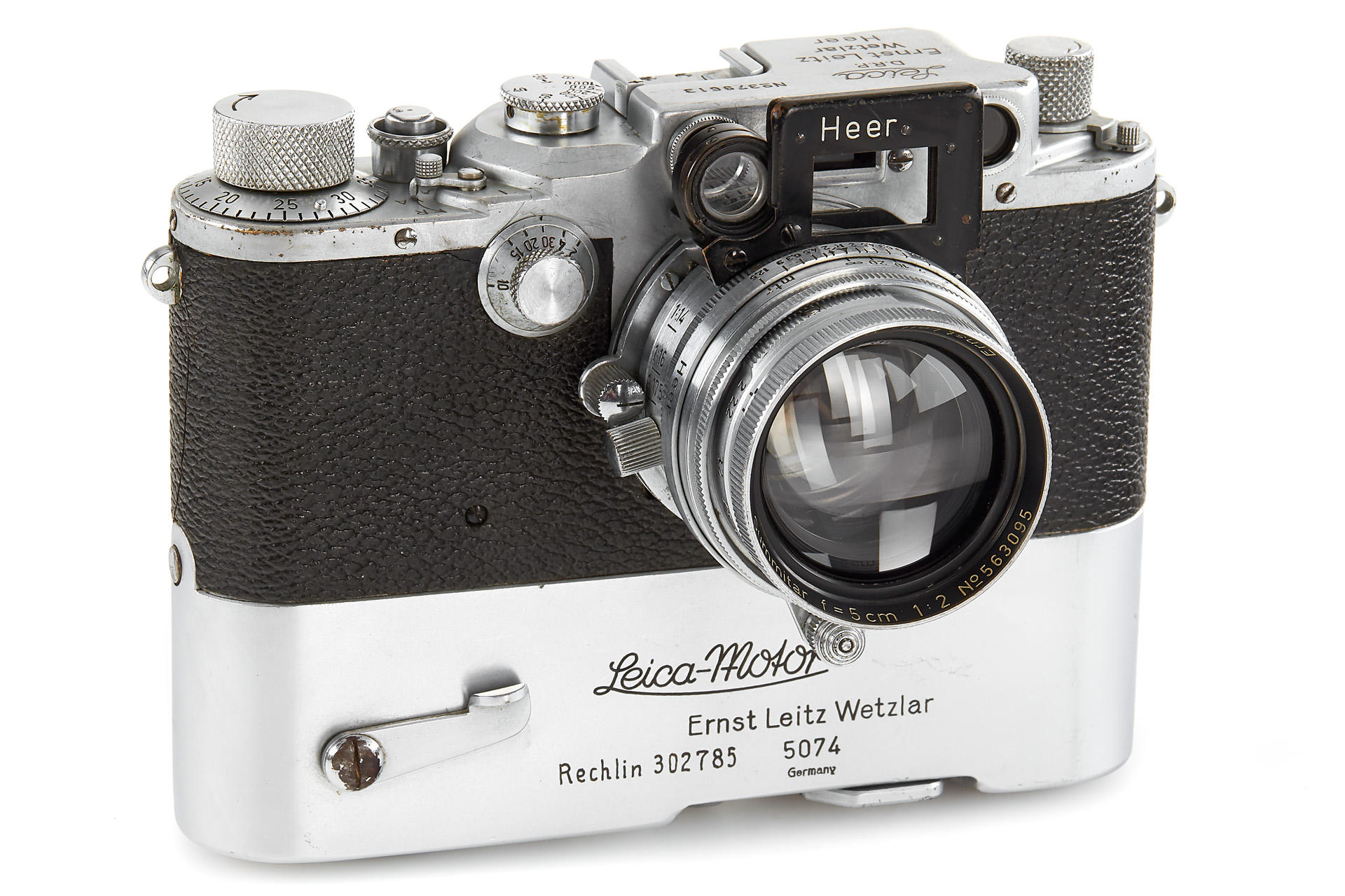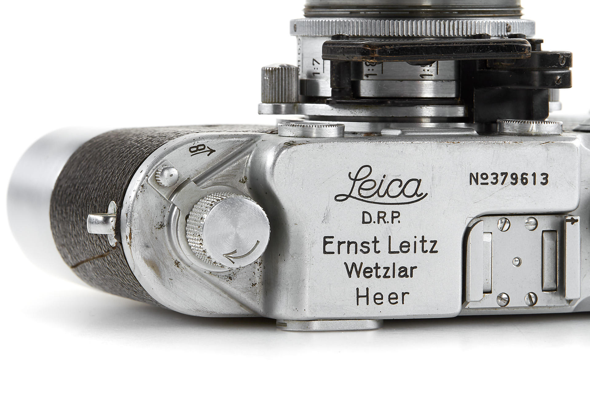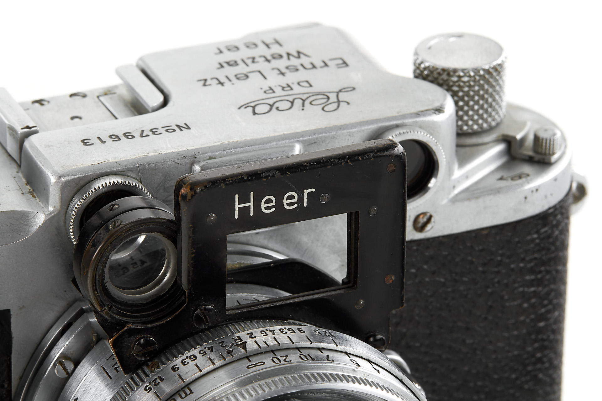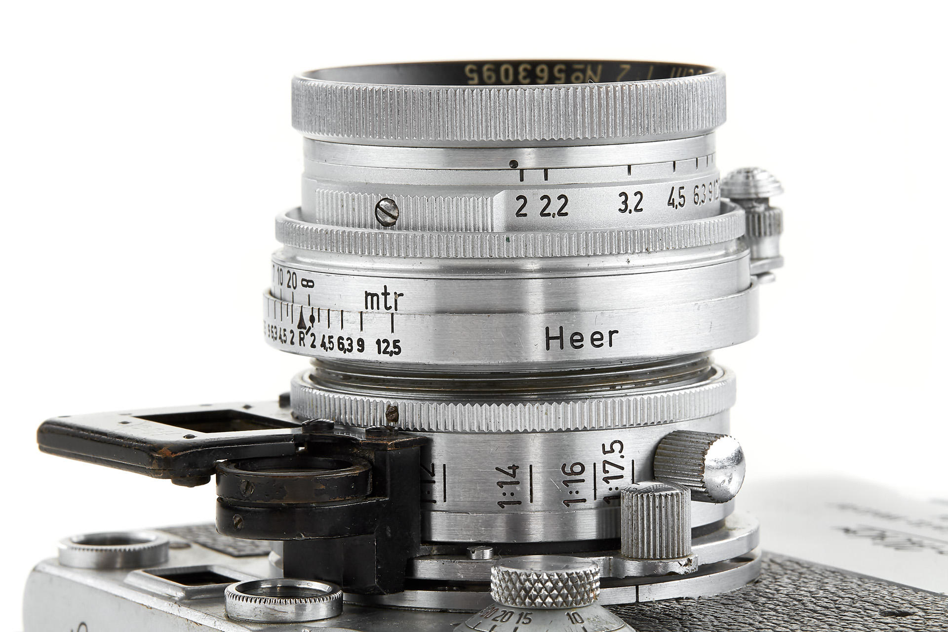 original German military Leica IIIc, engraved on the top plate with 'Heer', with matching Summitar 2/5cm no.563095 (engraved near the mount with 'Heer'), both camera and the lens delivered to Berlin on 26.09.1941 (delivery number 25993), included it this set is a NOOKY closeup device engraved with 'Heer' and MOOLY-C engraved with 'Rechlin 302785', Rechlin was an important airport for German Luftwaffe in WWII, it is one of the most complete and sophisticated military Leica outfit we have seen
