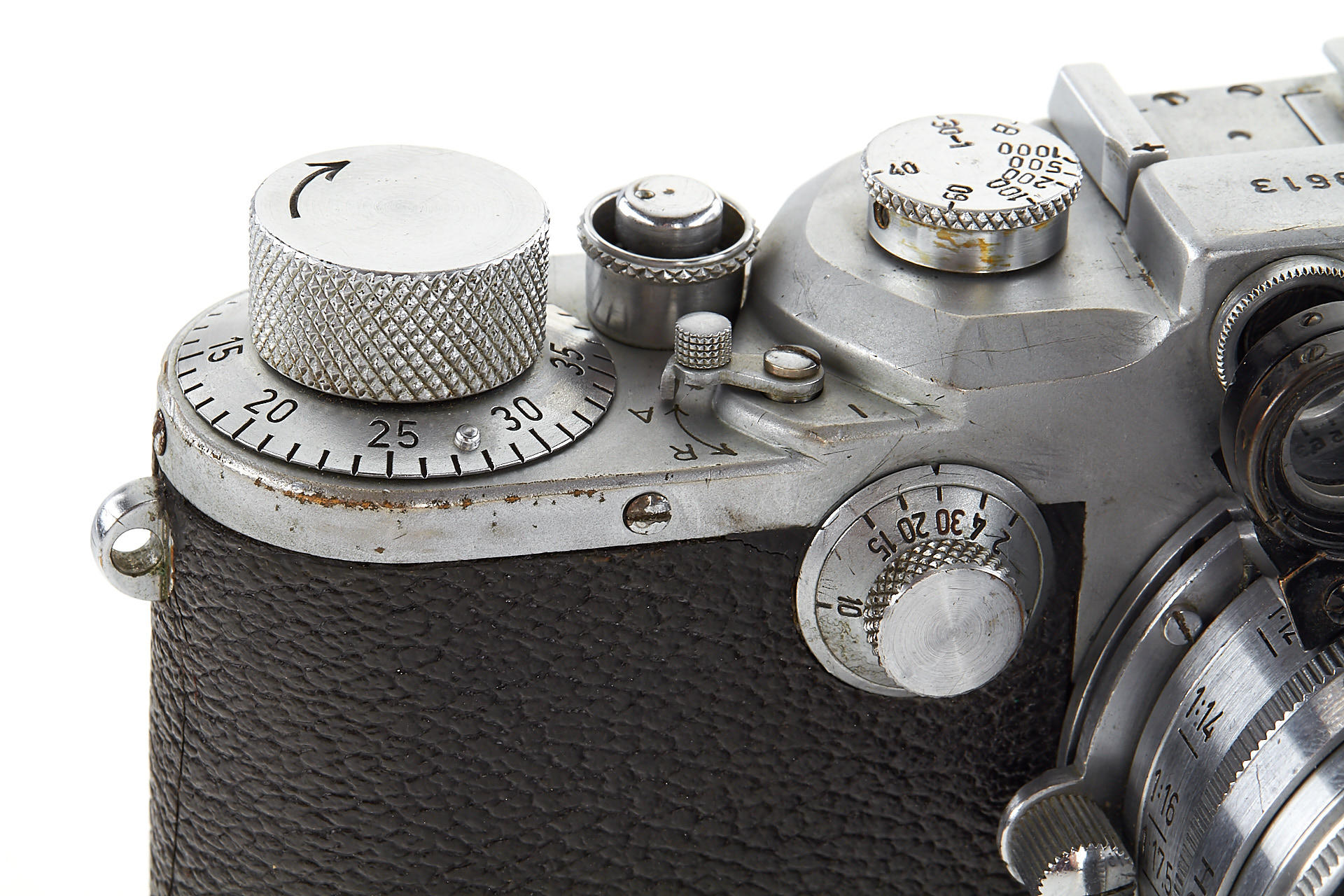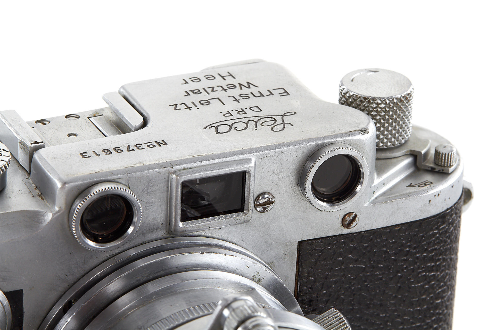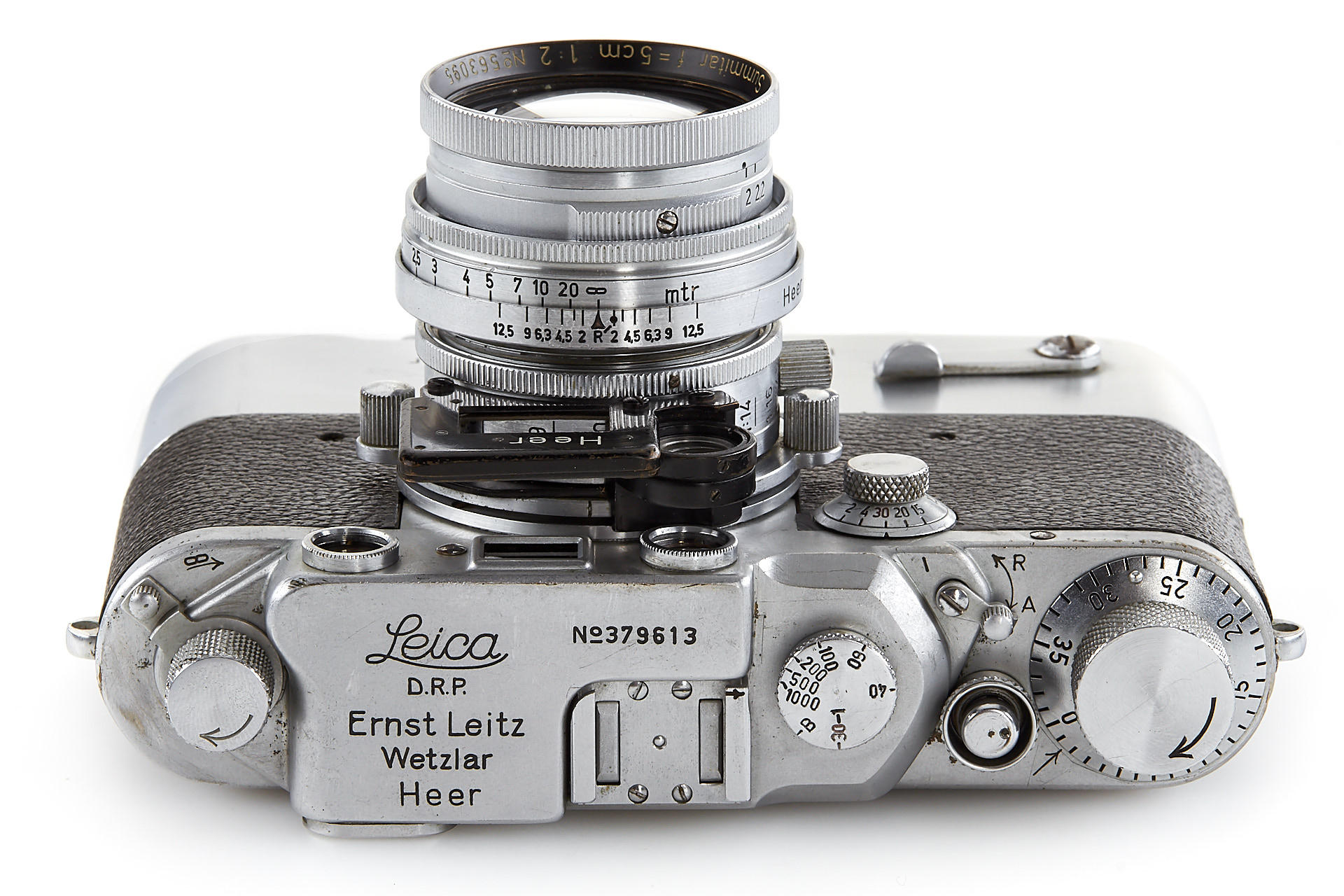 original German military Leica IIIc, engraved on the top plate with 'Heer', with matching Summitar 2/5cm no.563095 (engraved near the mount with 'Heer'), both camera and the lens delivered to Berlin on 26.09.1941 (delivery number 25993), included it this set is a NOOKY closeup device engraved with 'Heer' and MOOLY-C engraved with 'Rechlin 302785', Rechlin was an important airport for German Luftwaffe in WWII, it is one of the most complete and sophisticated military Leica outfit we have seen