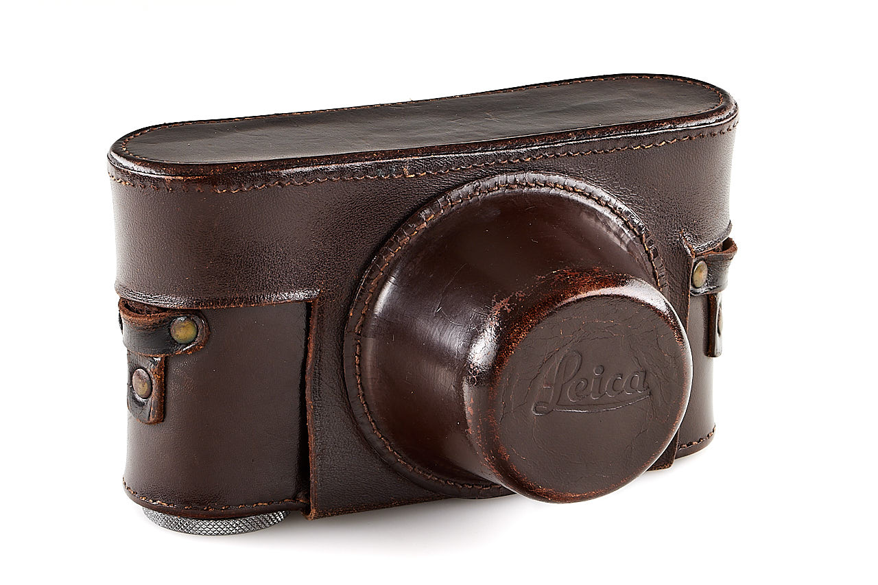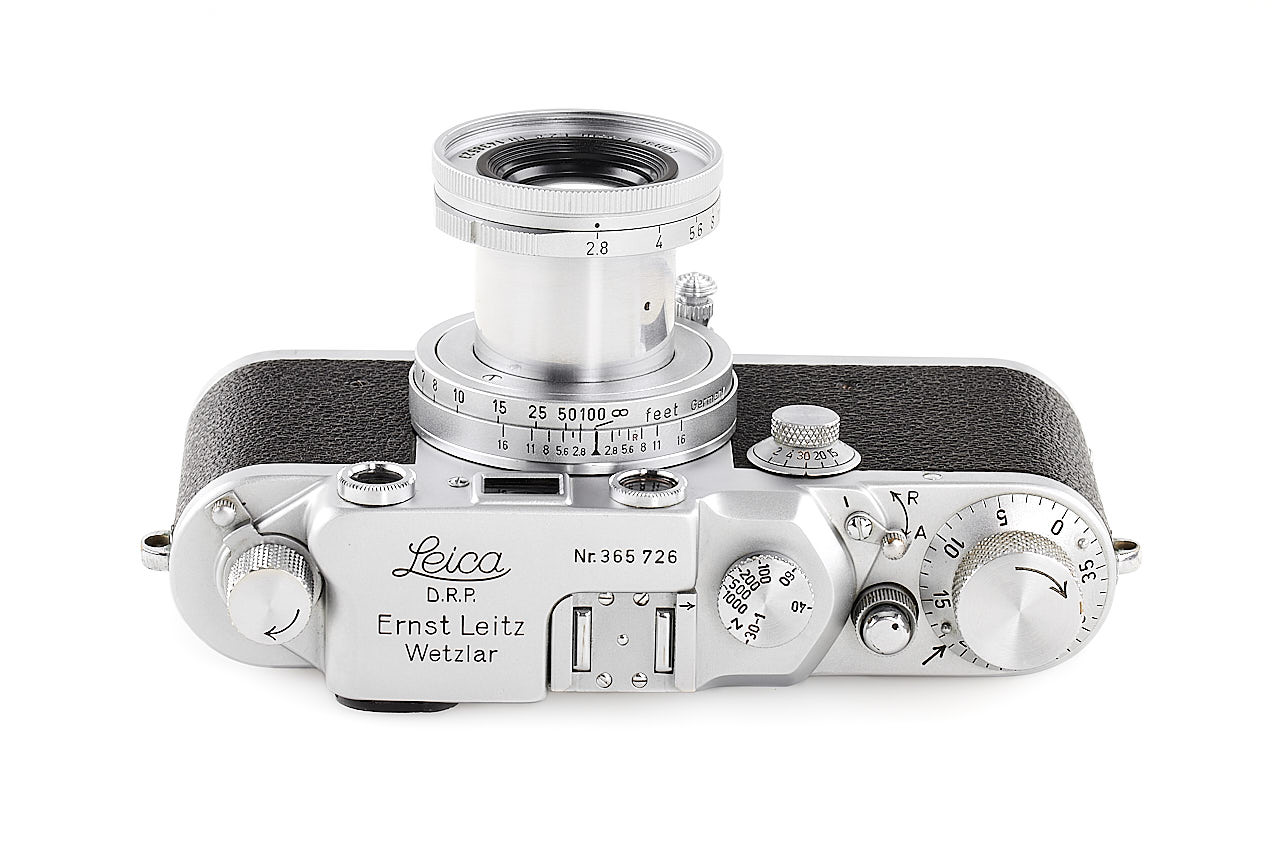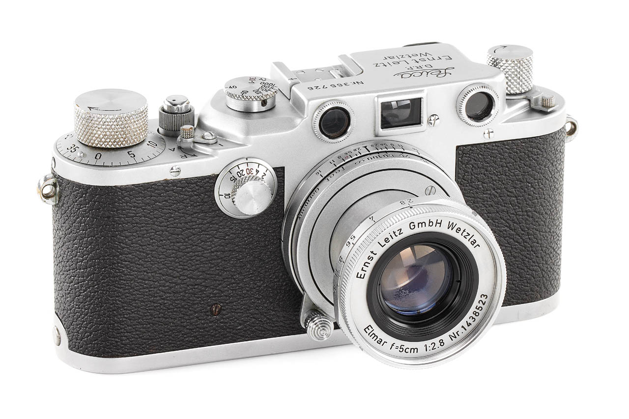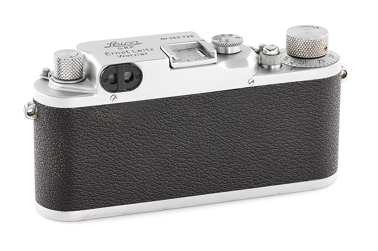 An interesting Leica IIIc from a batch of cameras delivered in 1940 to Luftwaffe Berlin, but without the proper markings, in beautiful cosmetic condition (shutter curtains need replacement), with later Elmar 2.8/5cm no.1438523 (hazy), lens cap and leather case.