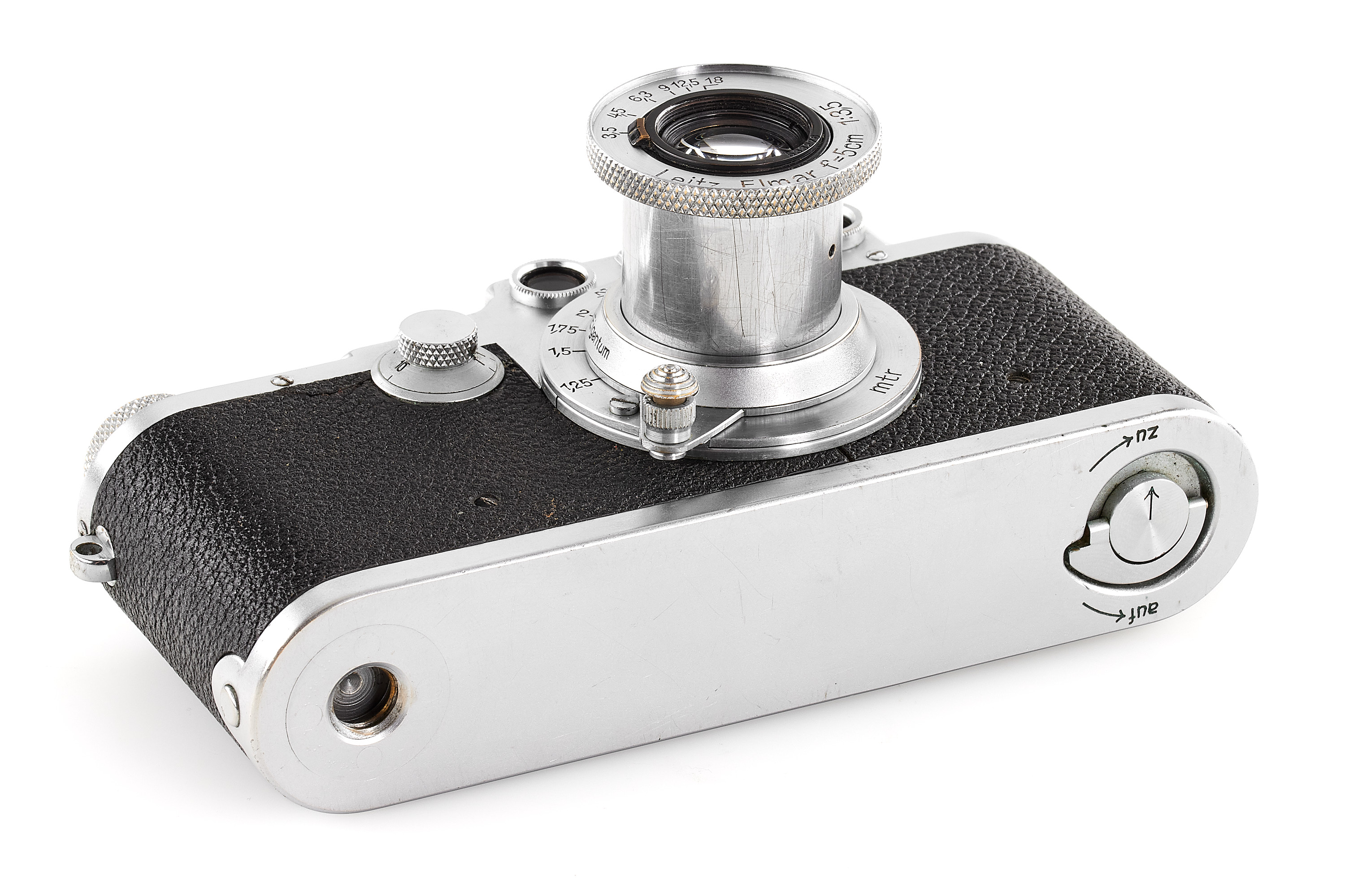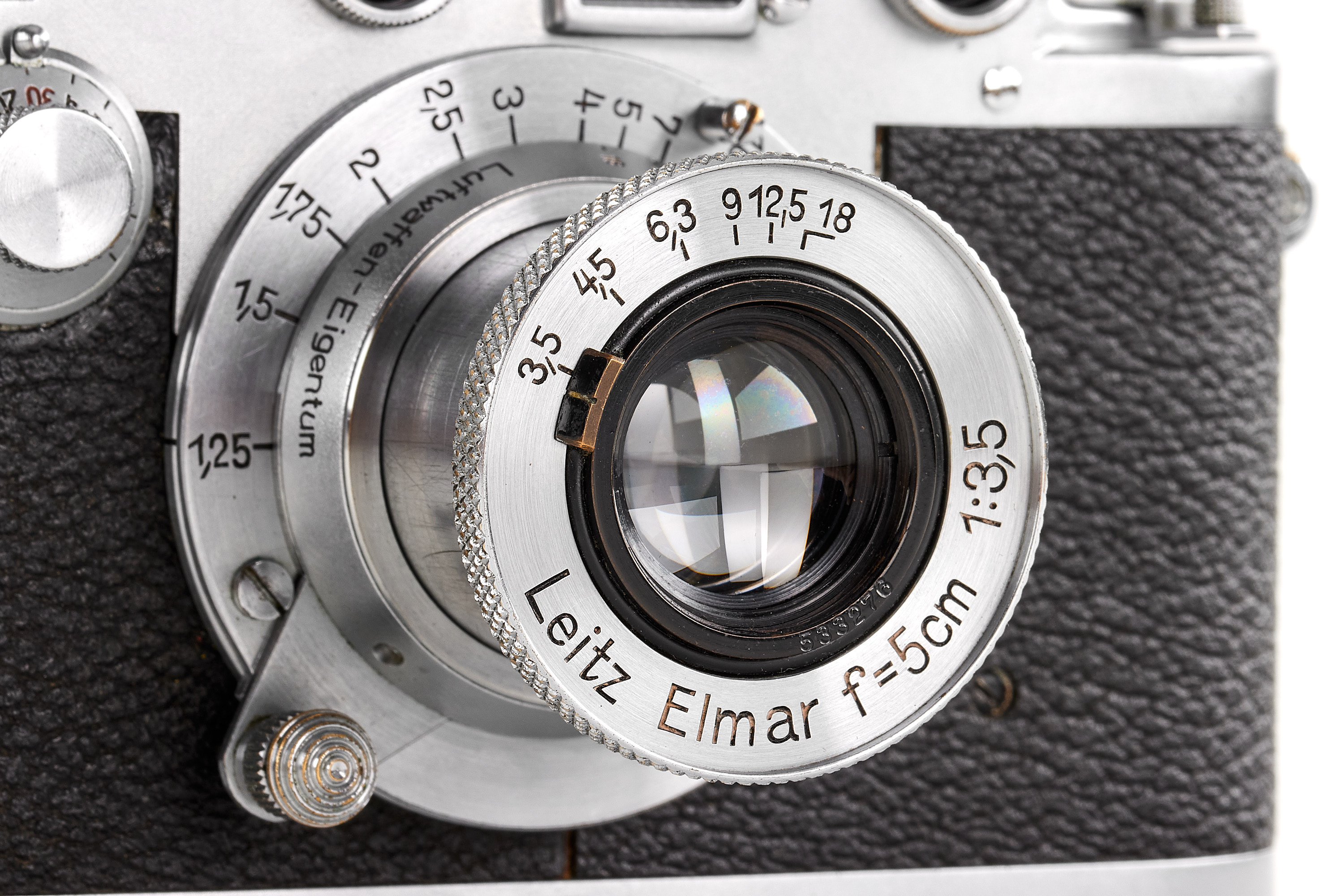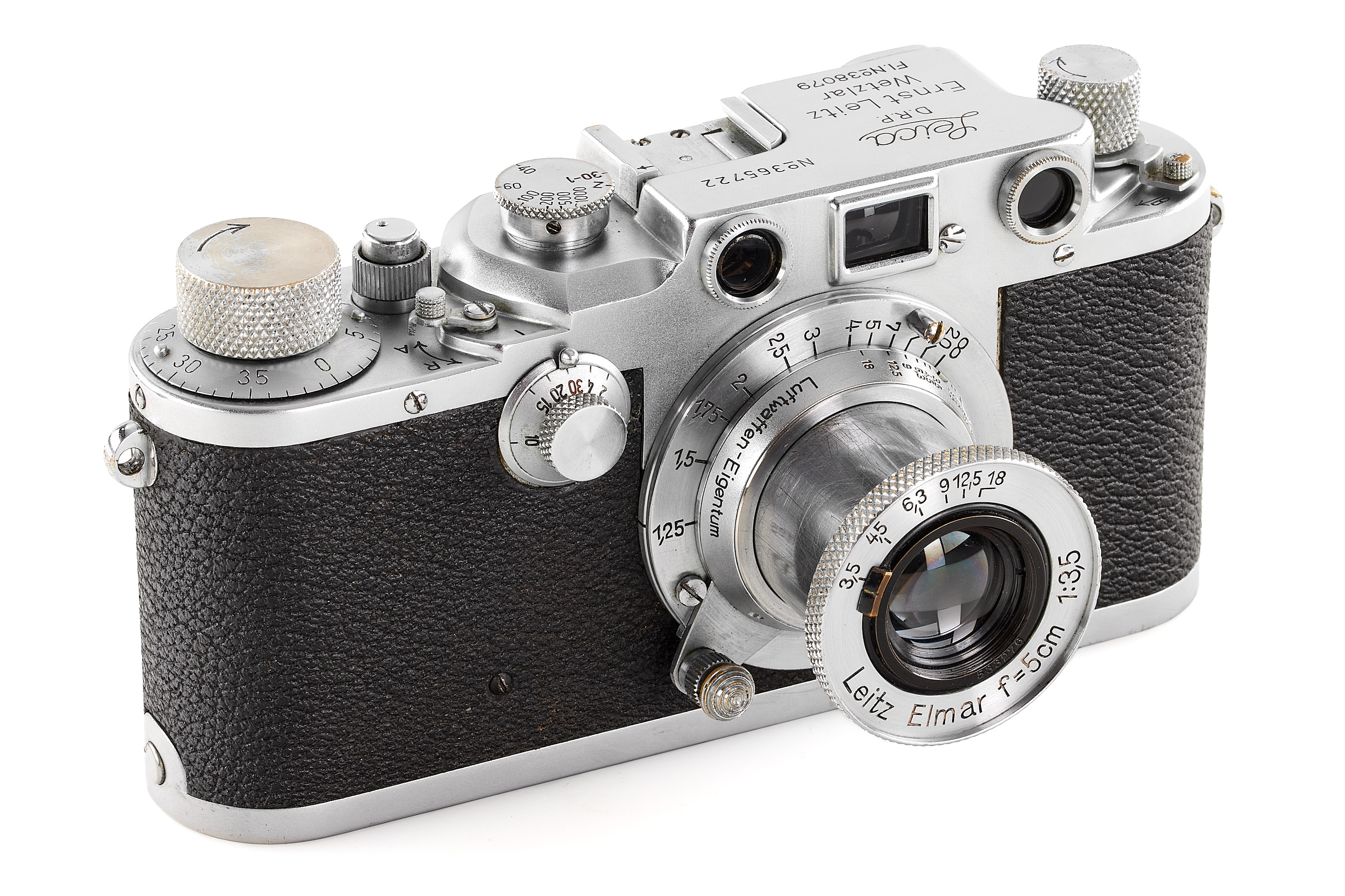 Sought-after original Leica IIIc chrome with 'Luftwaffen-Eigentum' and contract number engraved, in very good condition, the shutter needs attention, delivered to Berlin on 18.11.1940, together with a matching Elmar 3.5/5cm with