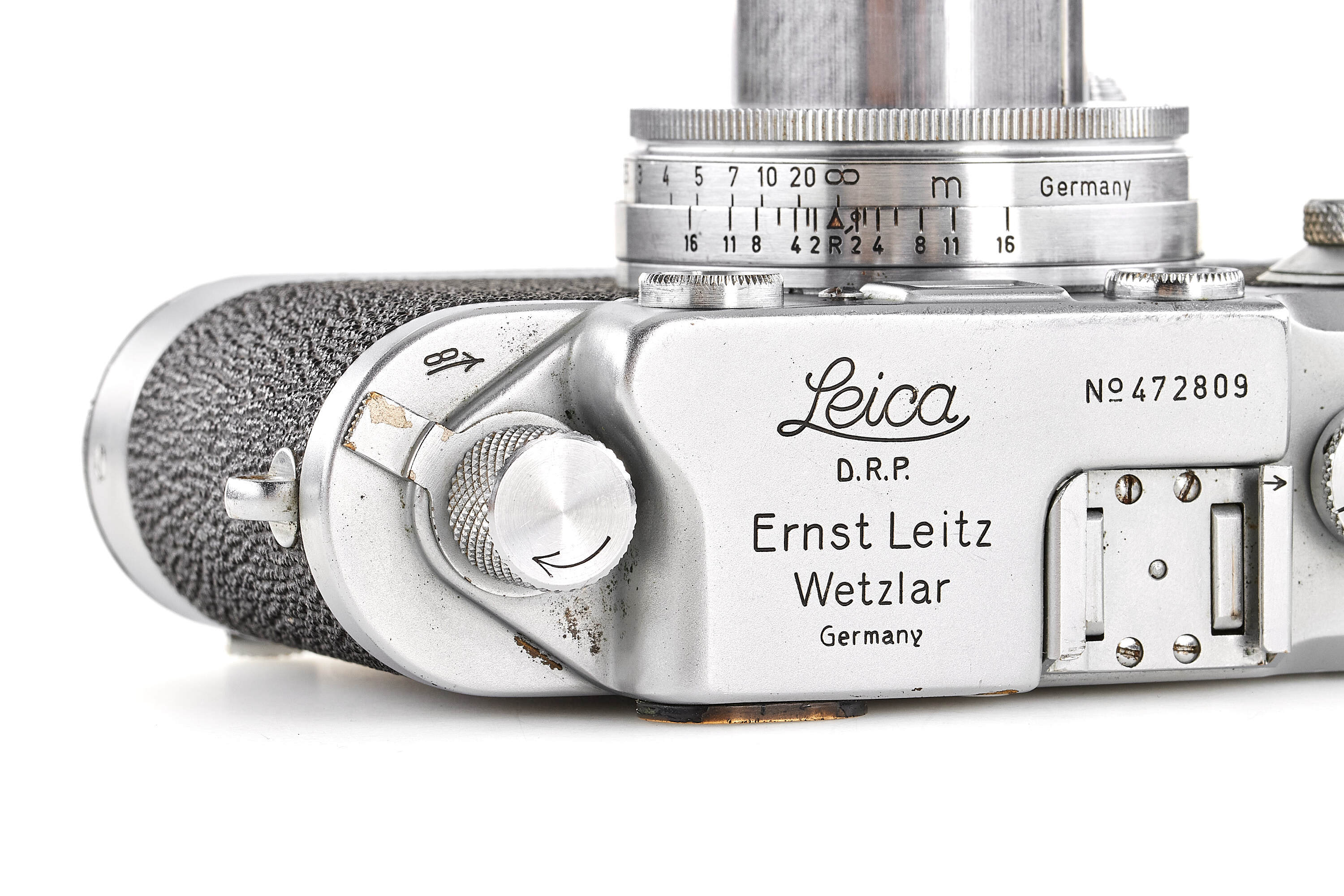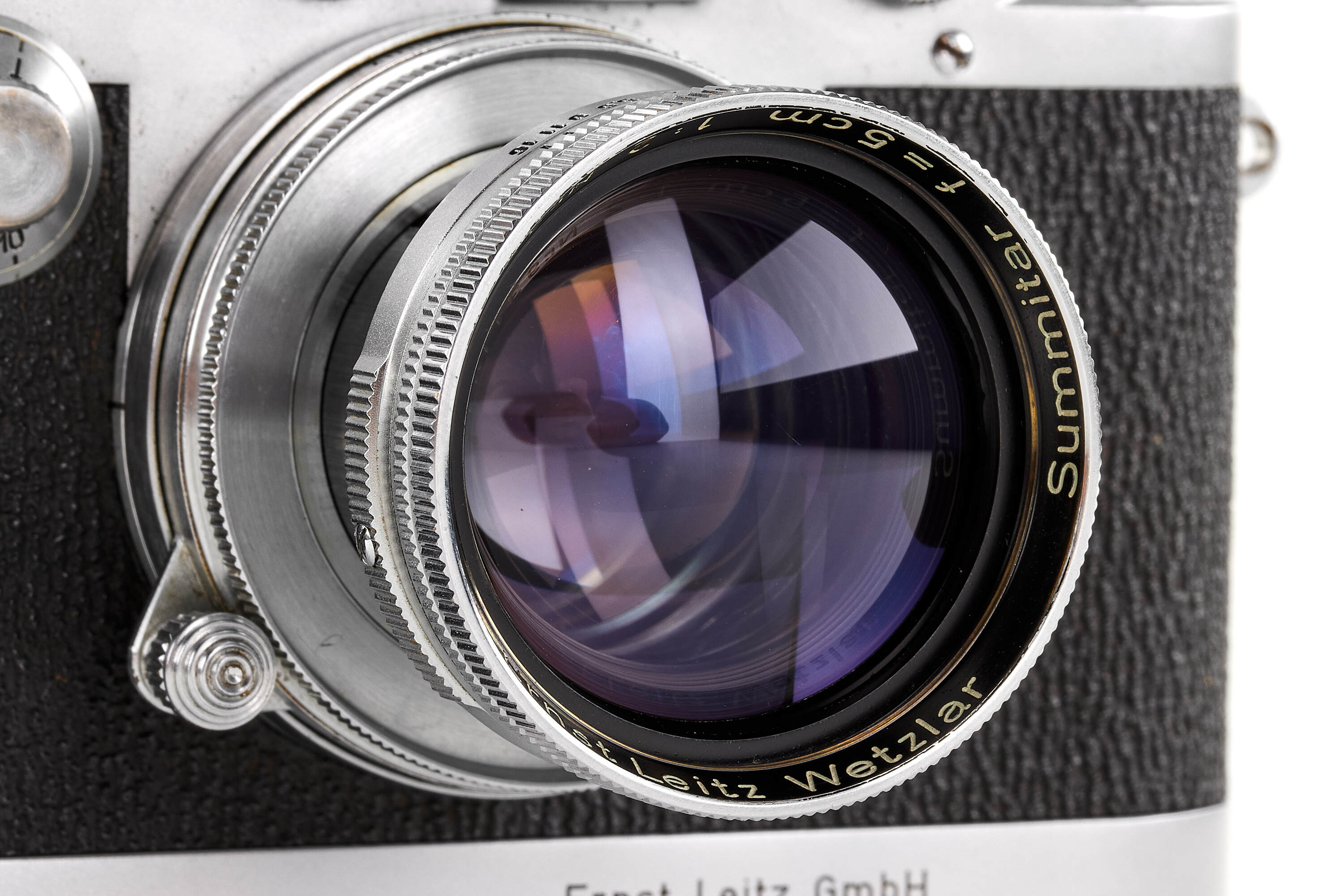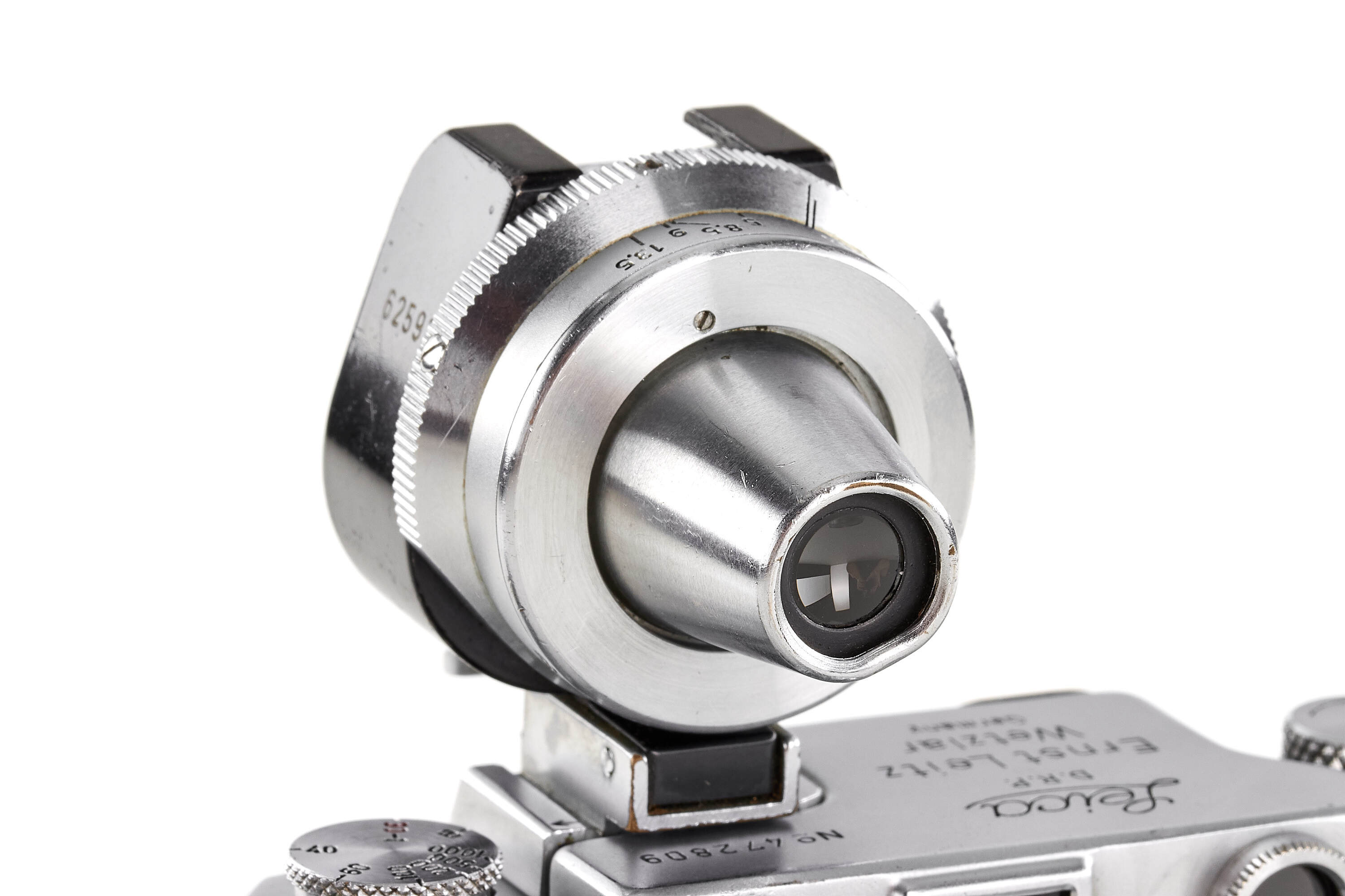 Beautiful post-war body in almost mint condition, flash contact added later, delivered to Düsseldorf on 09.05.1949, with Summitar 2/5cm no.931109, good optics only showing a few light cleaning marks, together with VIOOH universal finder no.62593 and Leicavit (SYOOM) rapid winder.