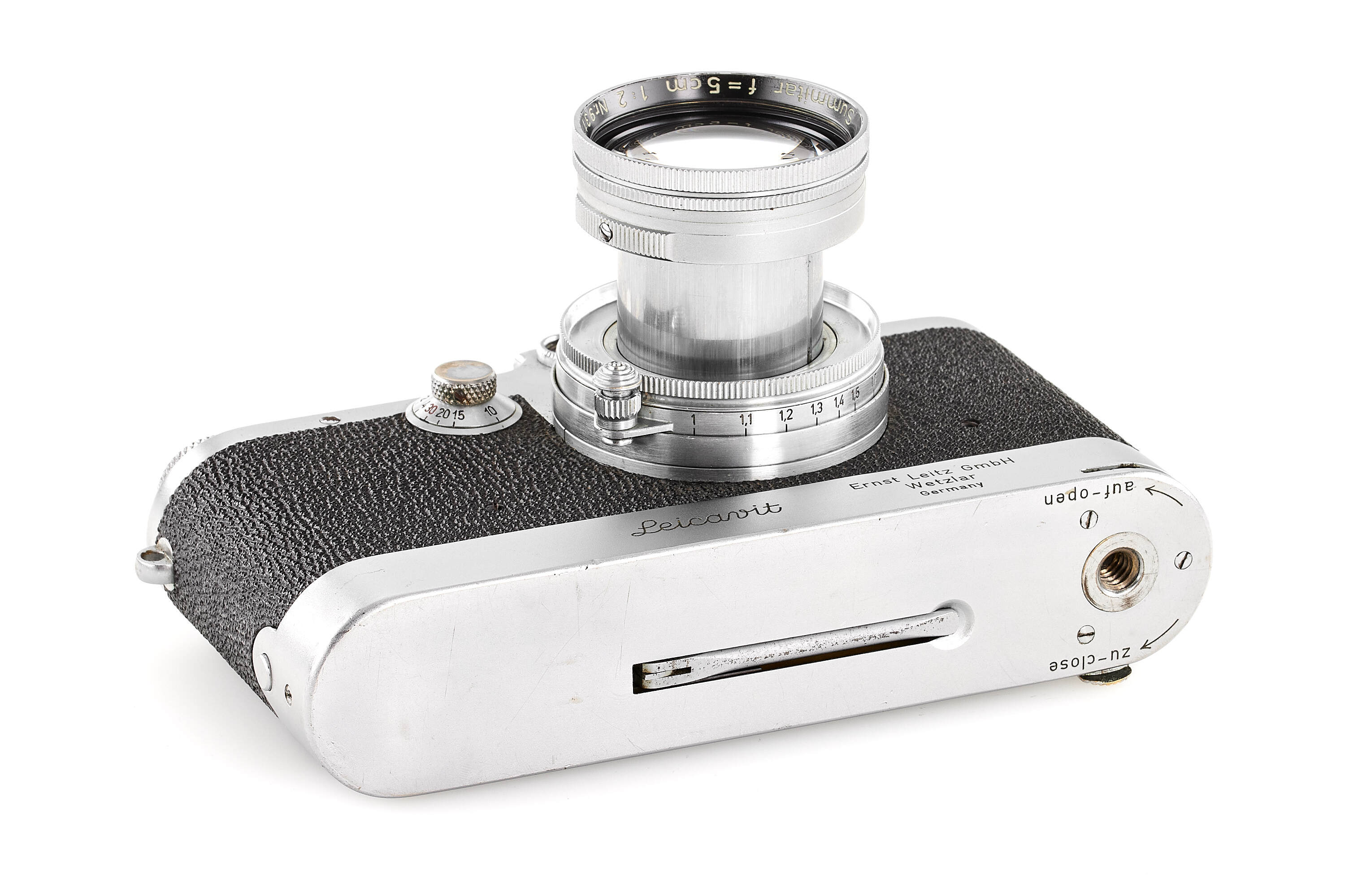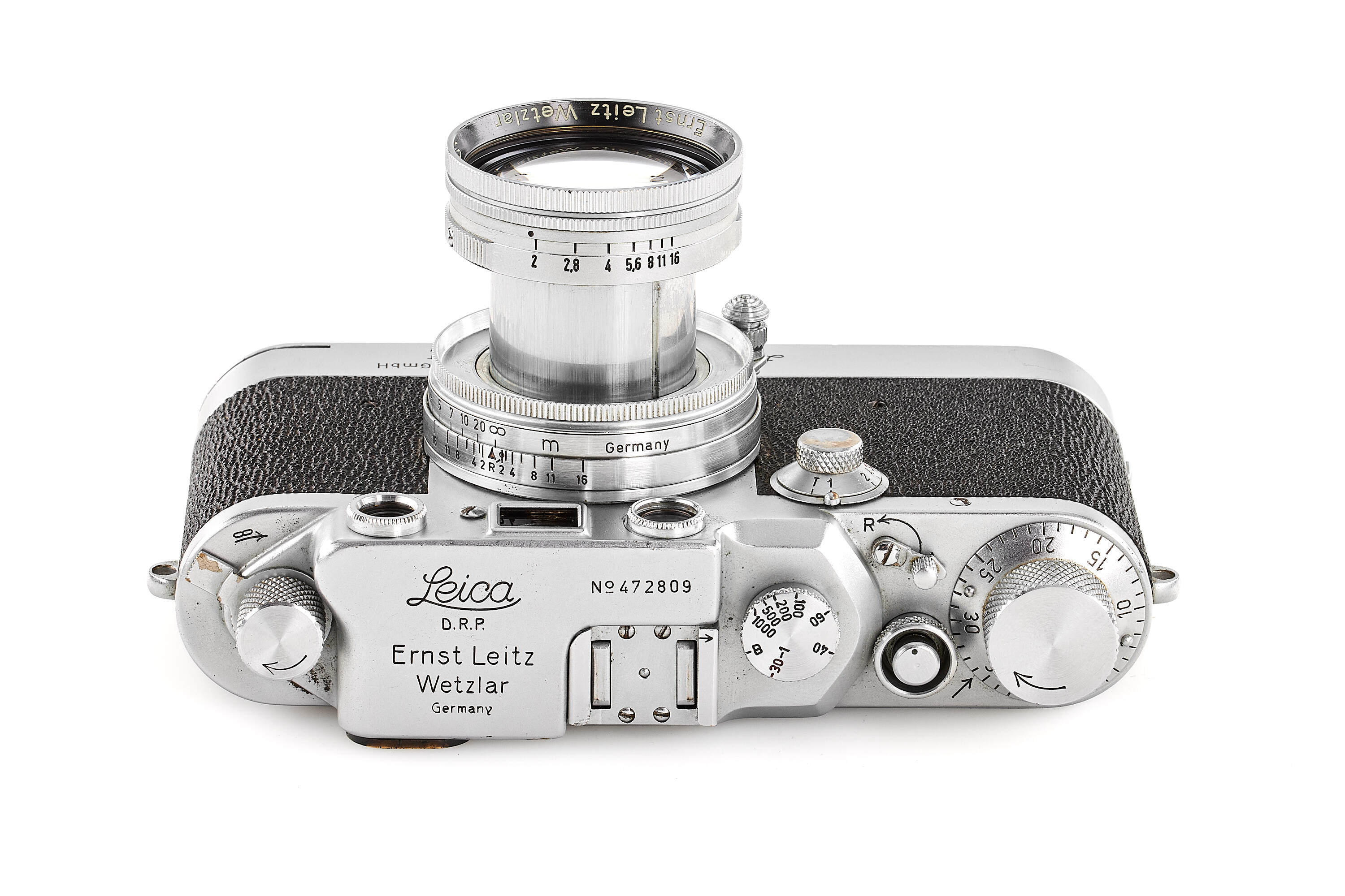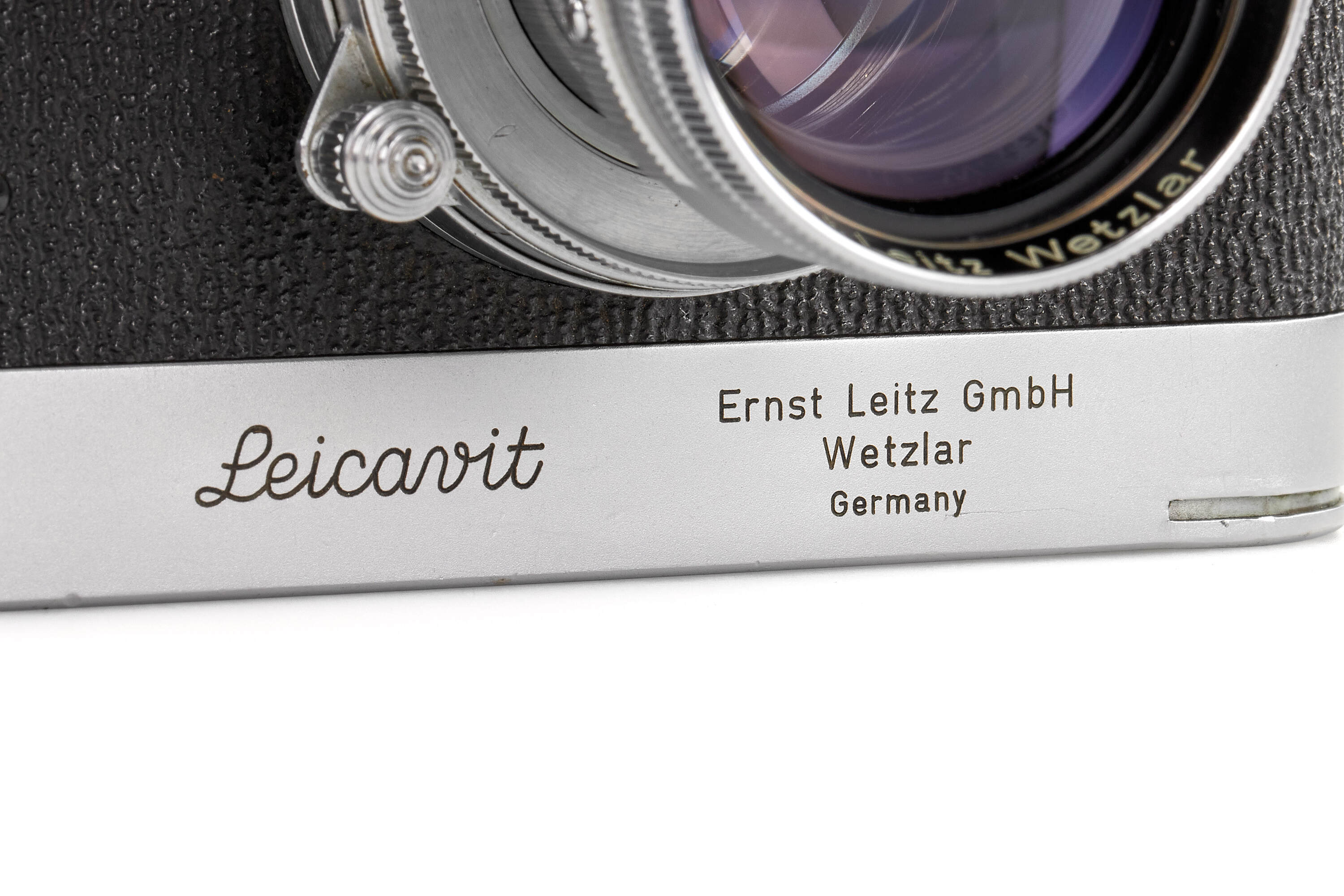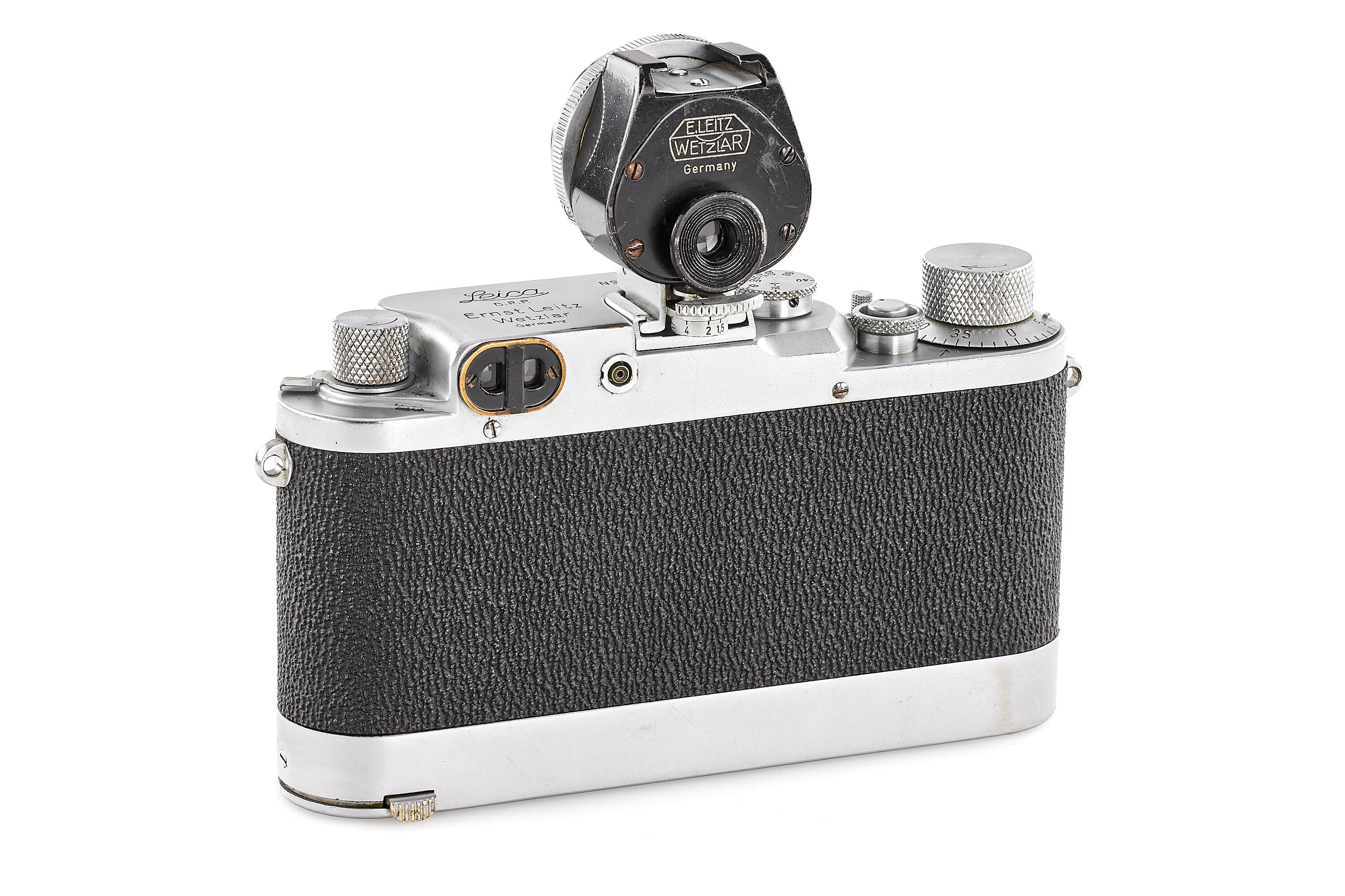 Beautiful post-war body in almost mint condition, flash contact added later, delivered to Düsseldorf on 09.05.1949, with Summitar 2/5cm no.931109, good optics only showing a few light cleaning marks, together with VIOOH universal finder no.62593 and Leicavit (SYOOM) rapid winder.