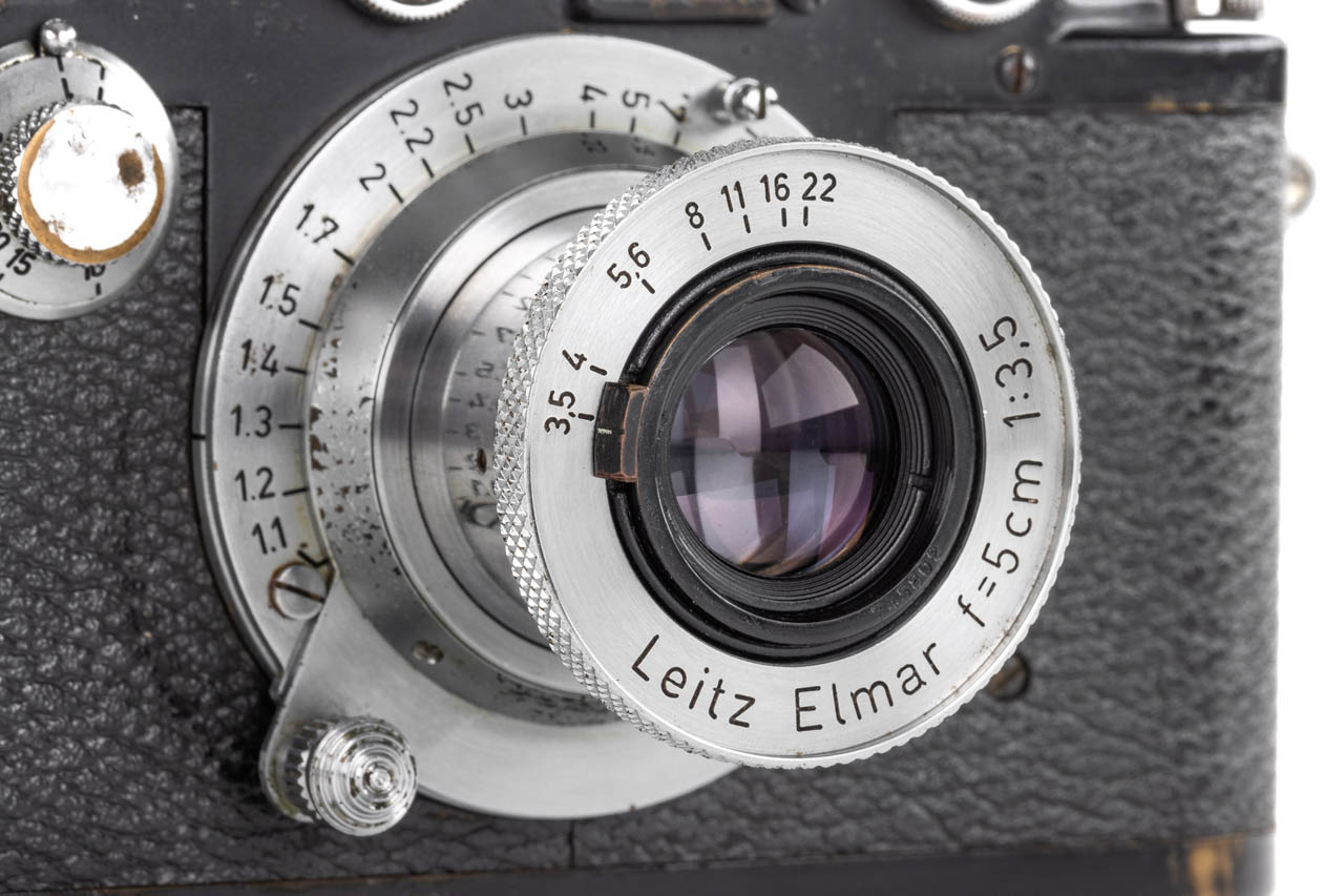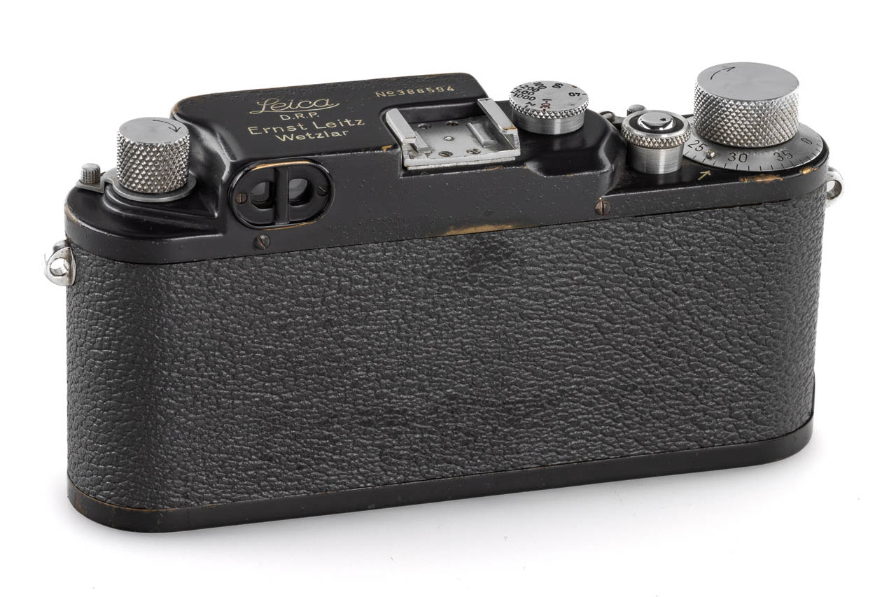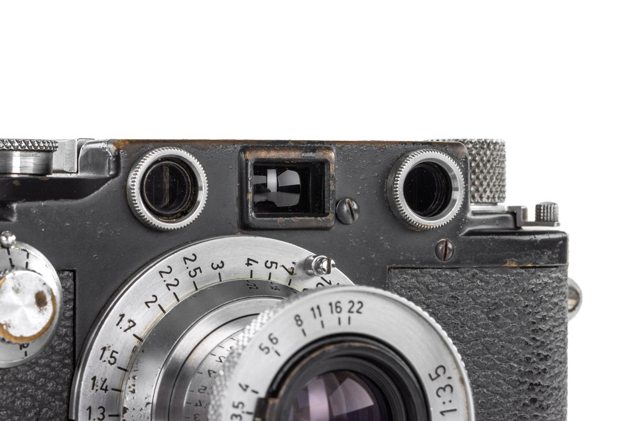 Very rare war-time grey painted body, with uncommon red curtains, first delivered to Vienna on 06.11.1942, in good, original condition and working order, rangefinder well contrasted, grey leather covering, with coated chrome Elmar 3.5/5cm no.745802 (1949) with front cap.