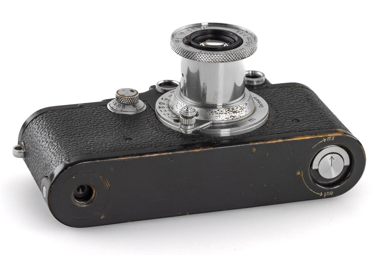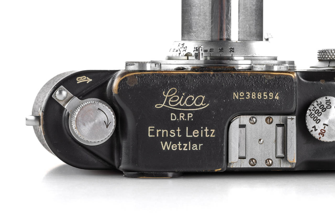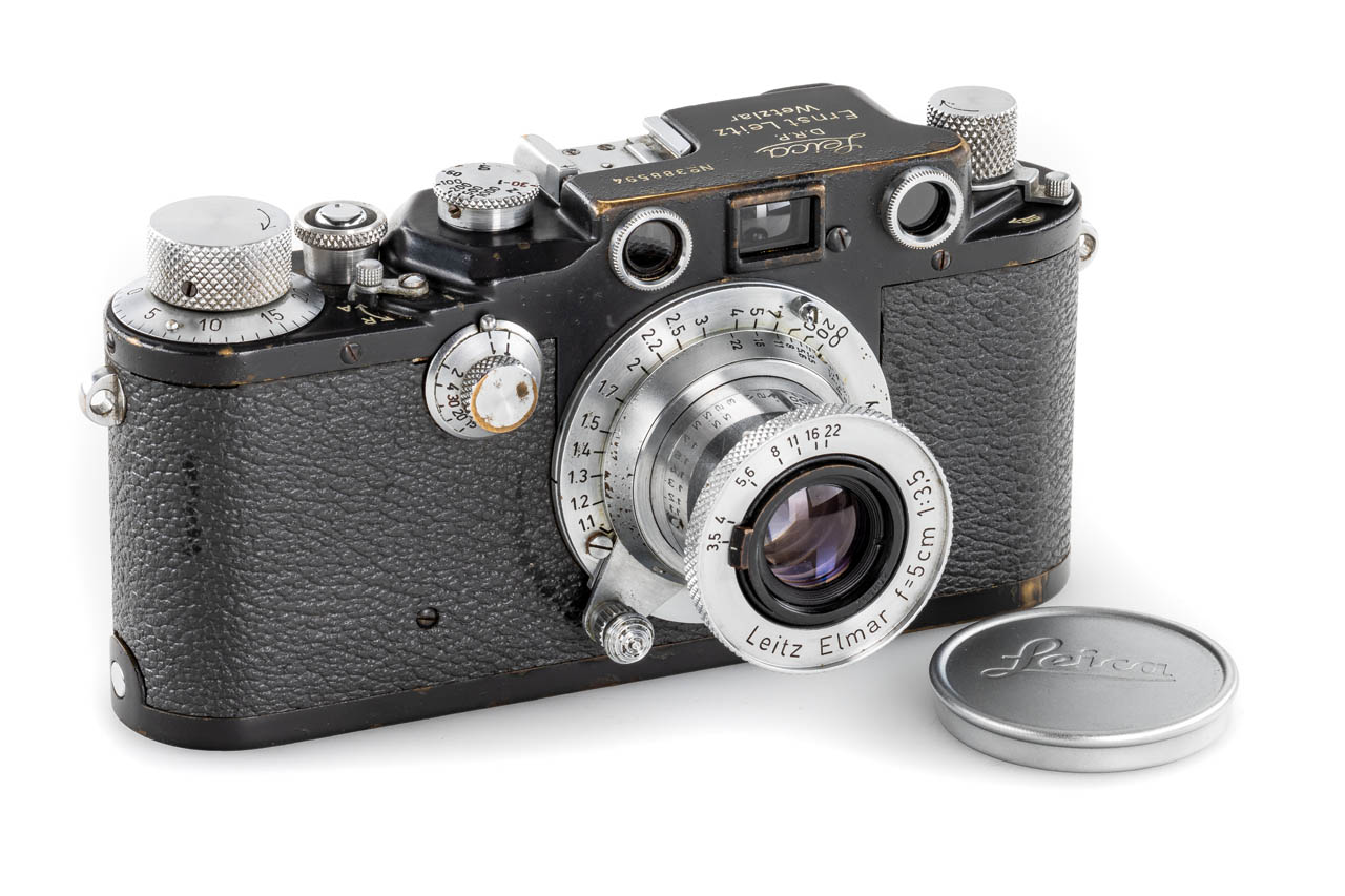 Very rare war-time grey painted body, with uncommon red curtains, first delivered to Vienna on 06.11.1942, in good, original condition and working order, rangefinder well contrasted, grey leather covering, with coated chrome Elmar 3.5/5cm no.745802 (1949) with front cap.