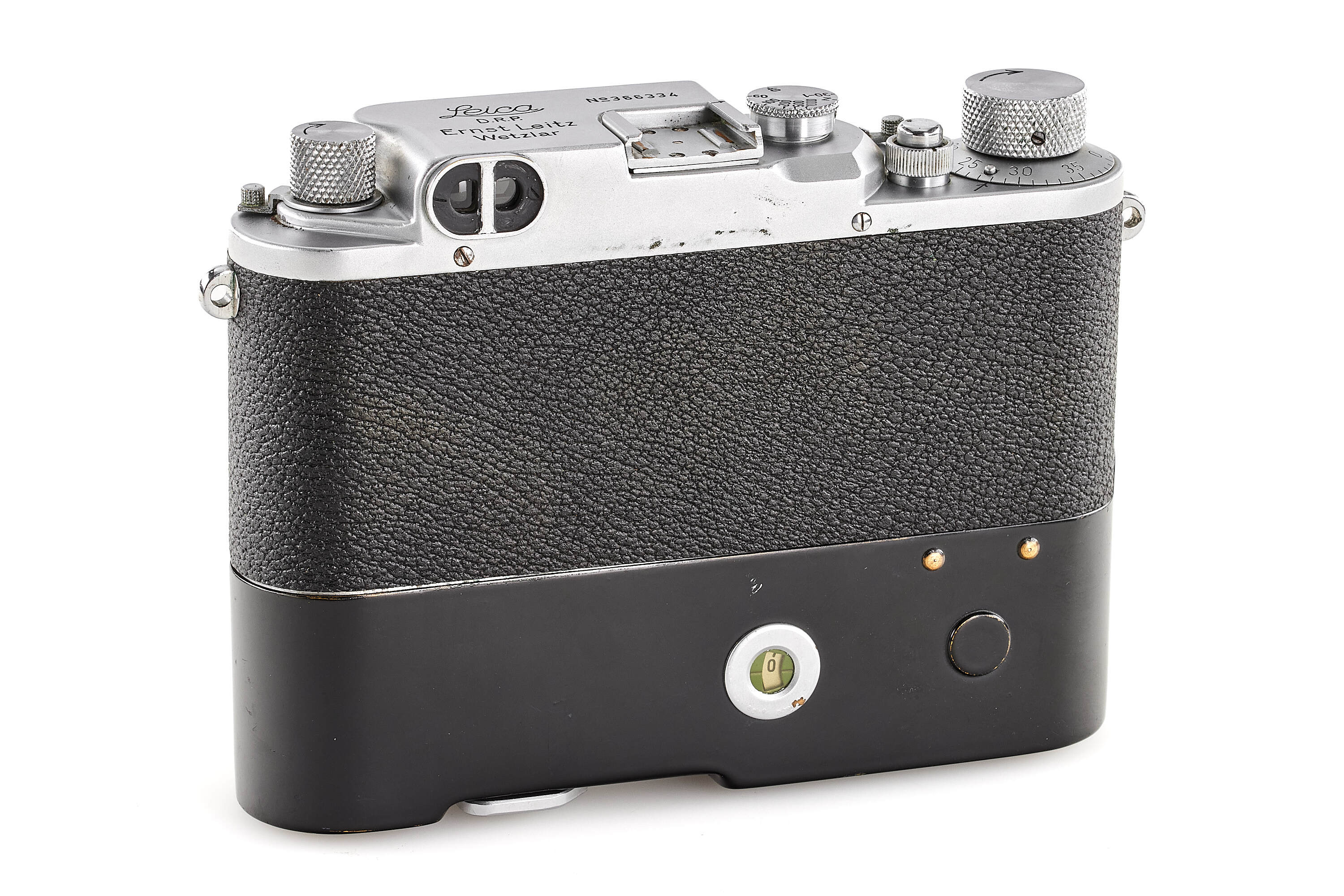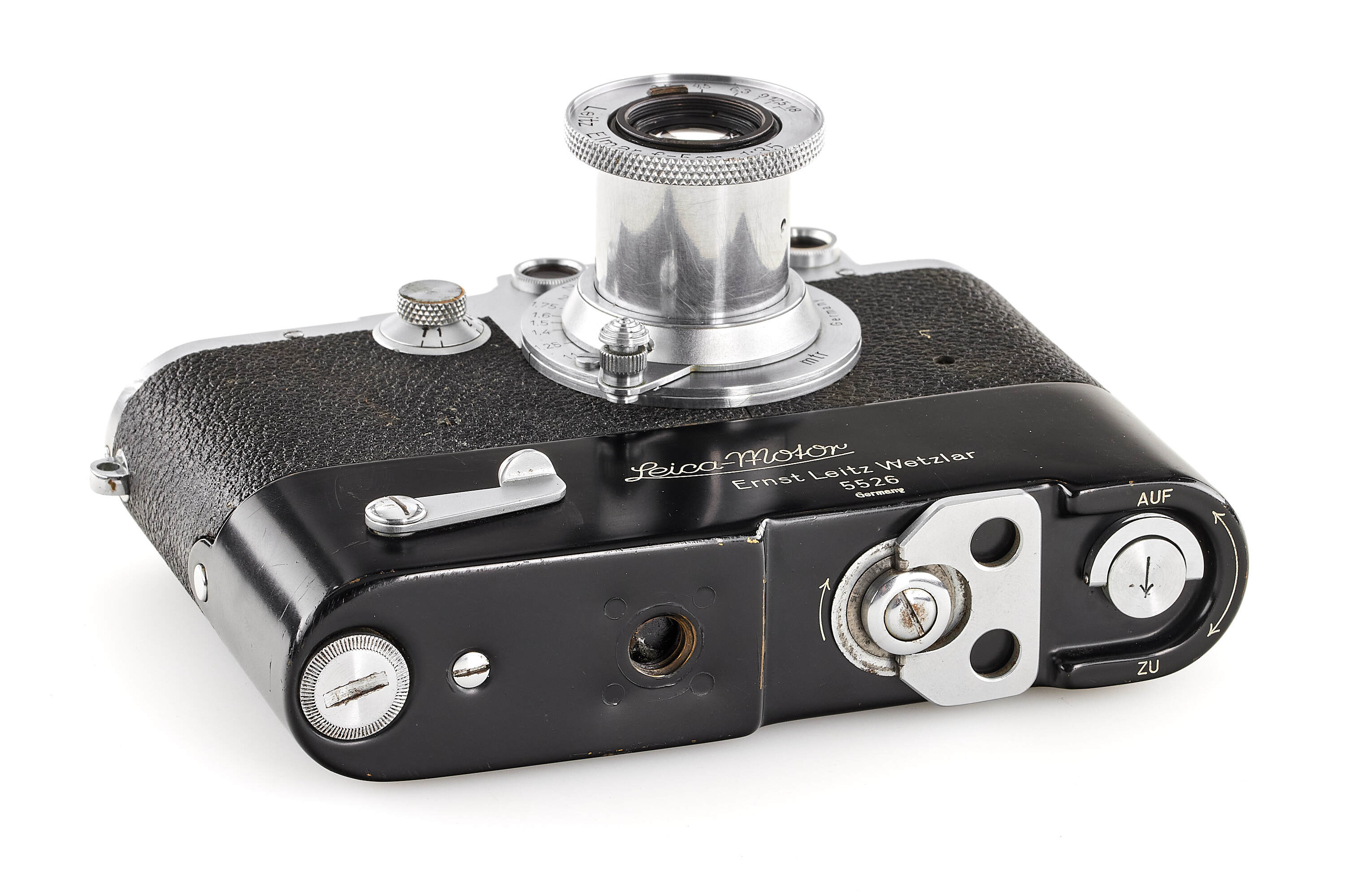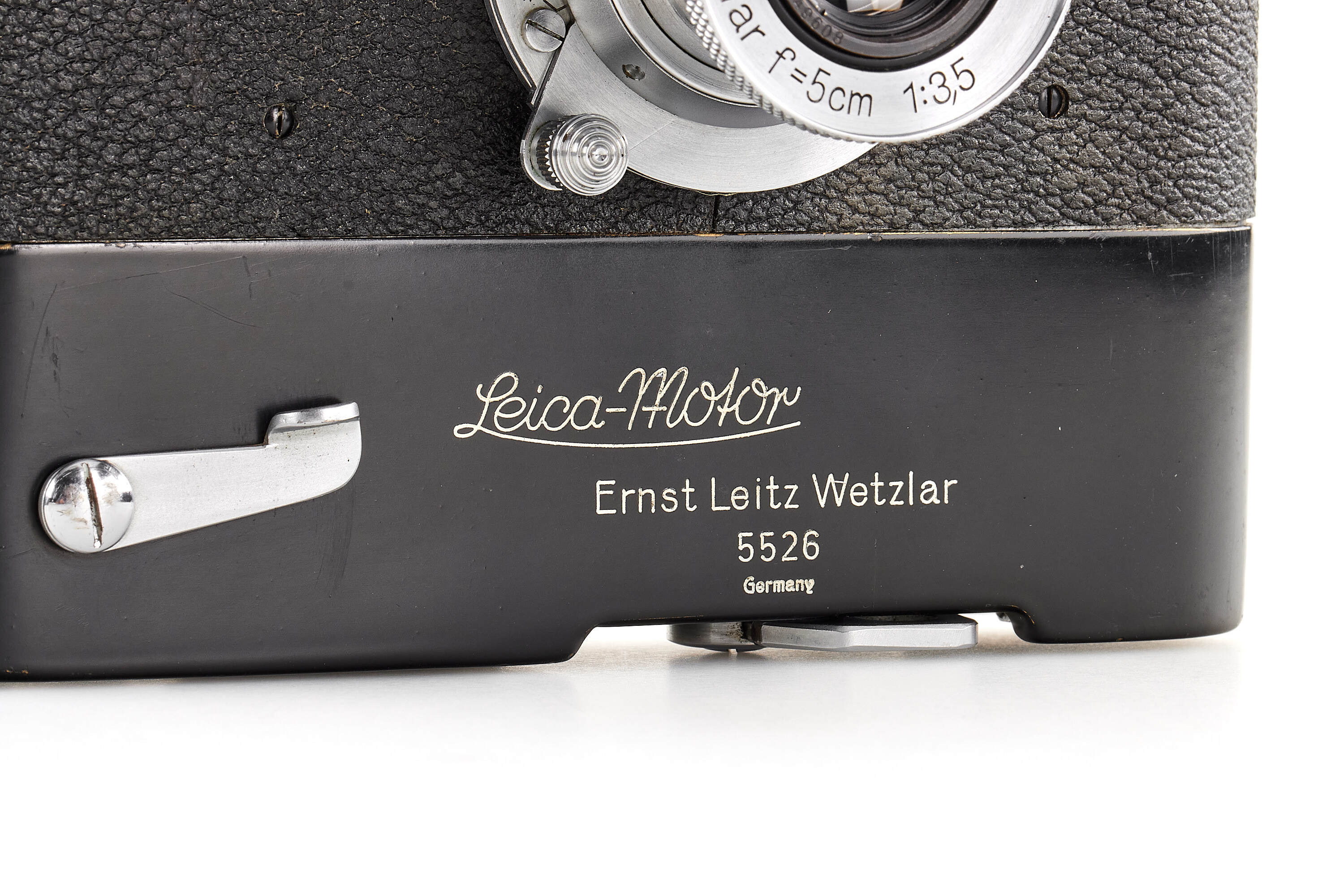 Early war-time IIIc chrome (production starts with no.360175) with red curtain, in very good condition, shutter needs service, with matching chrome Elmar 3.5/5cm no.549608 with very good optics only showing a couple of light cleaning marks (front lens cap), together with black paint MOOLY motor winder no.5526.