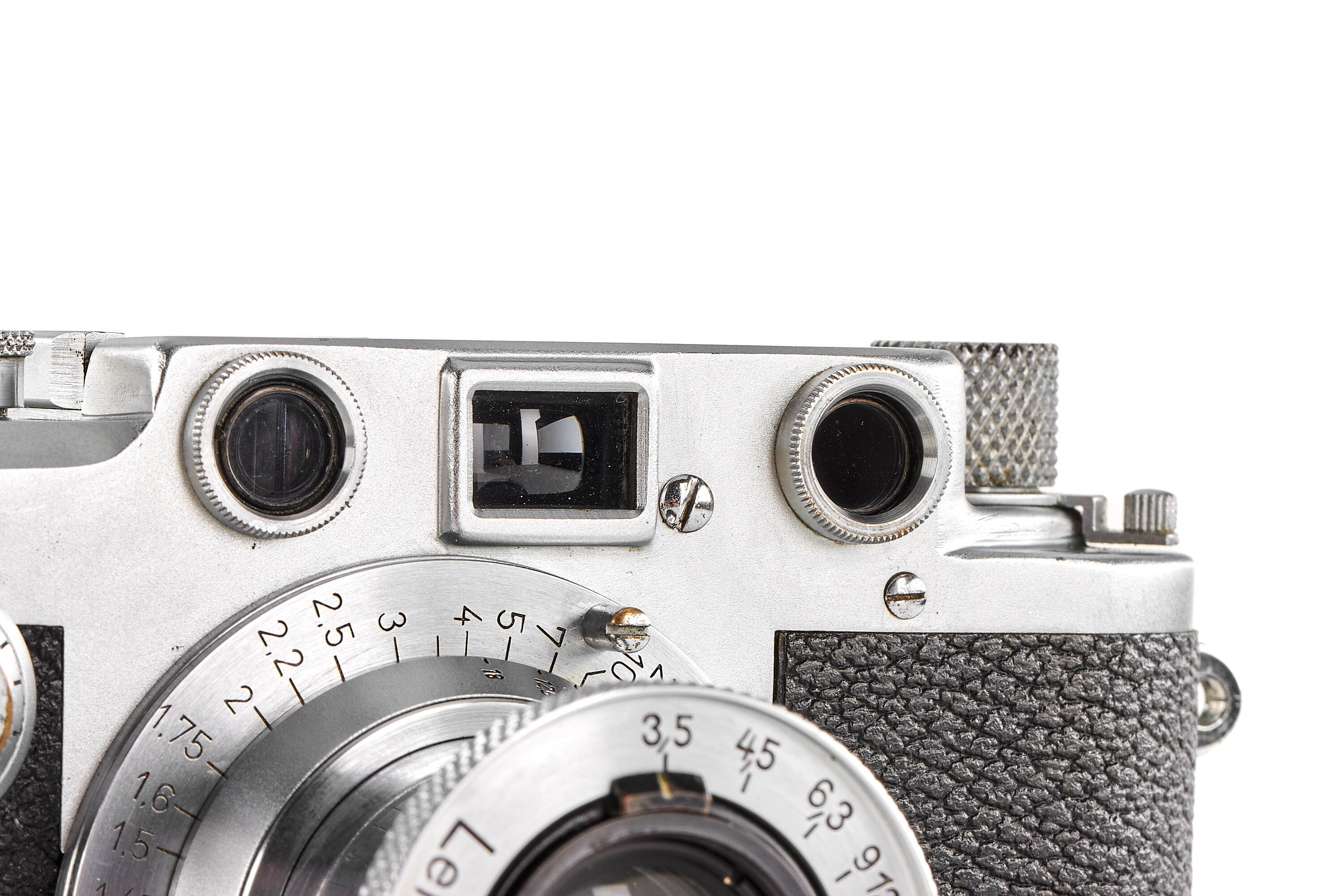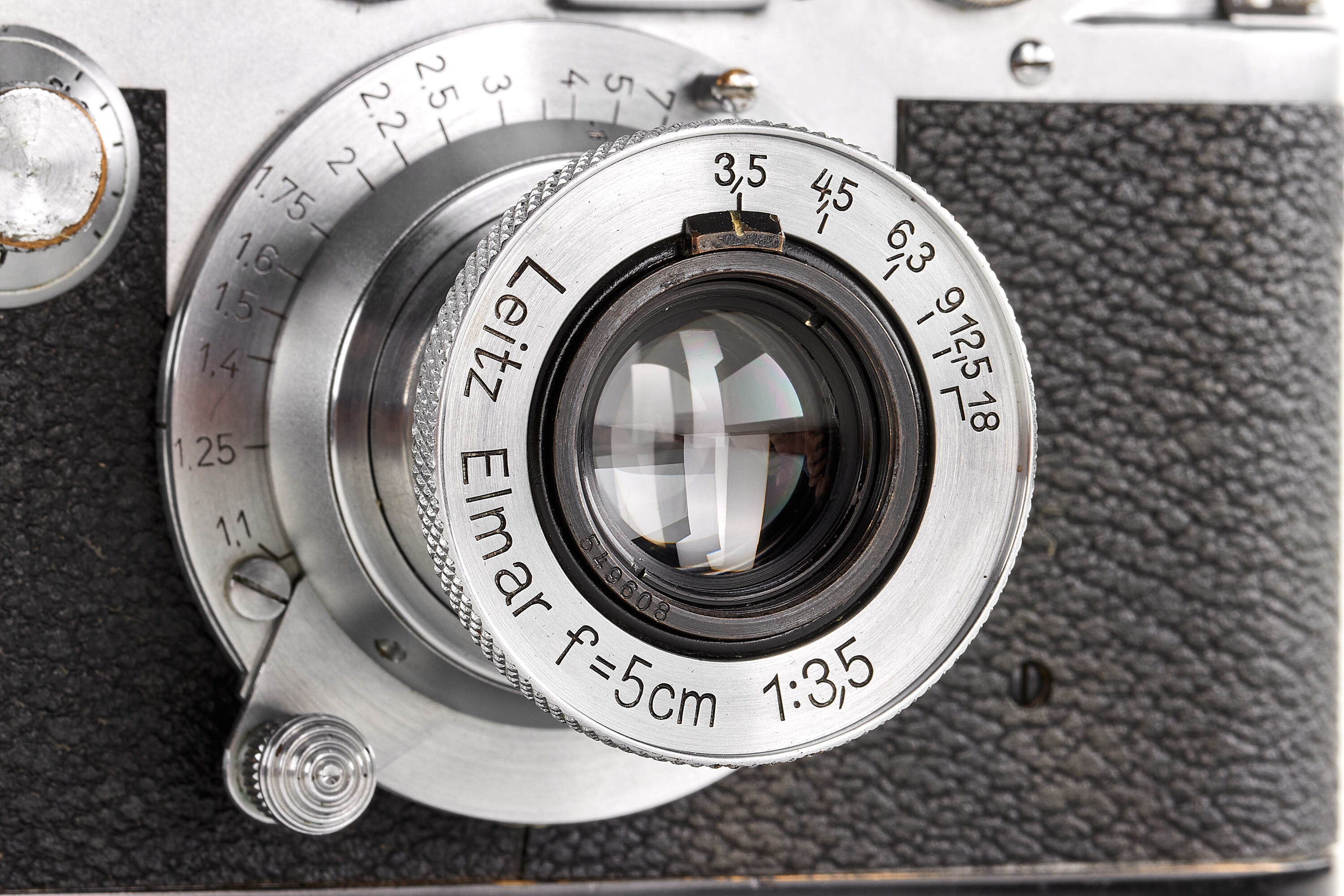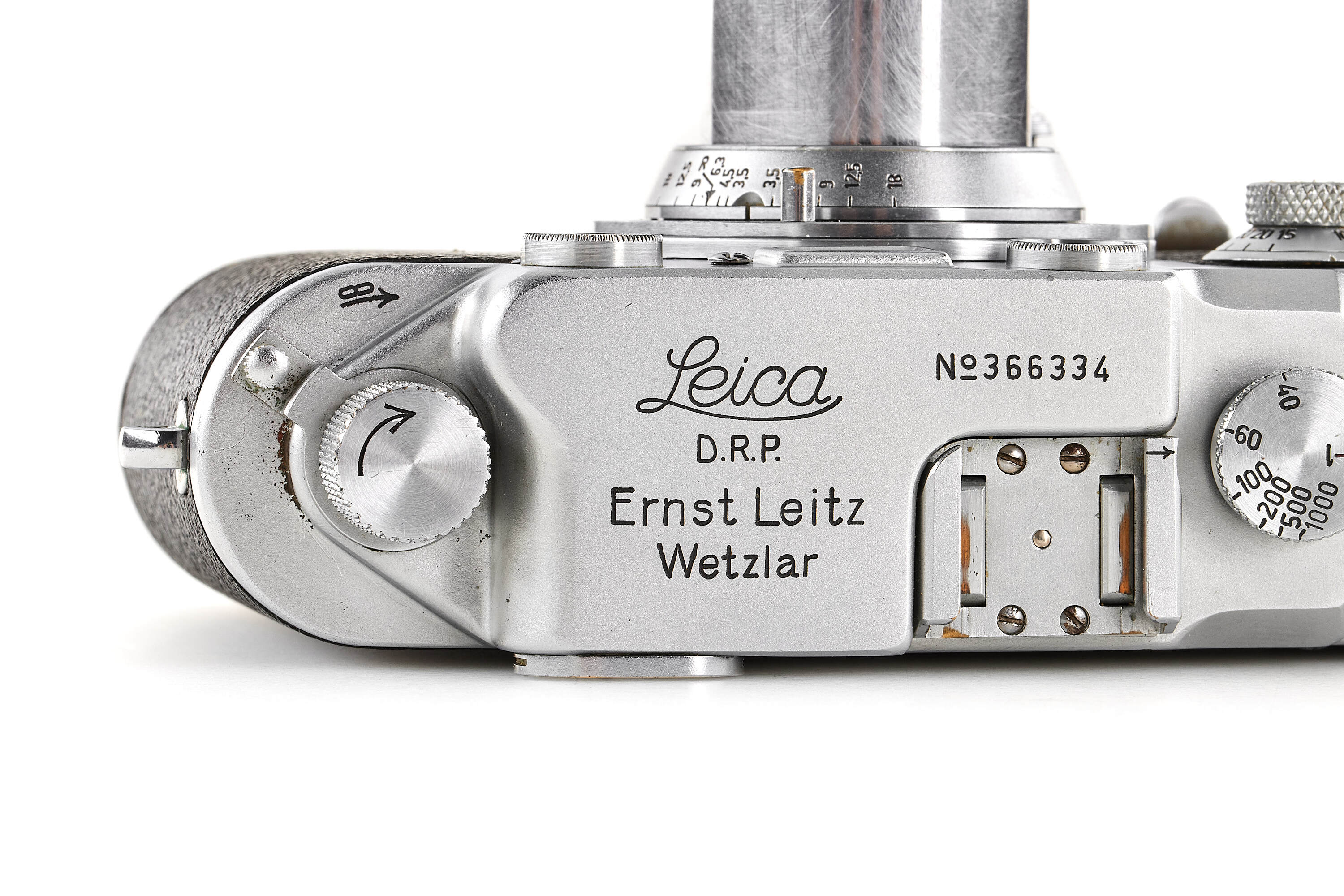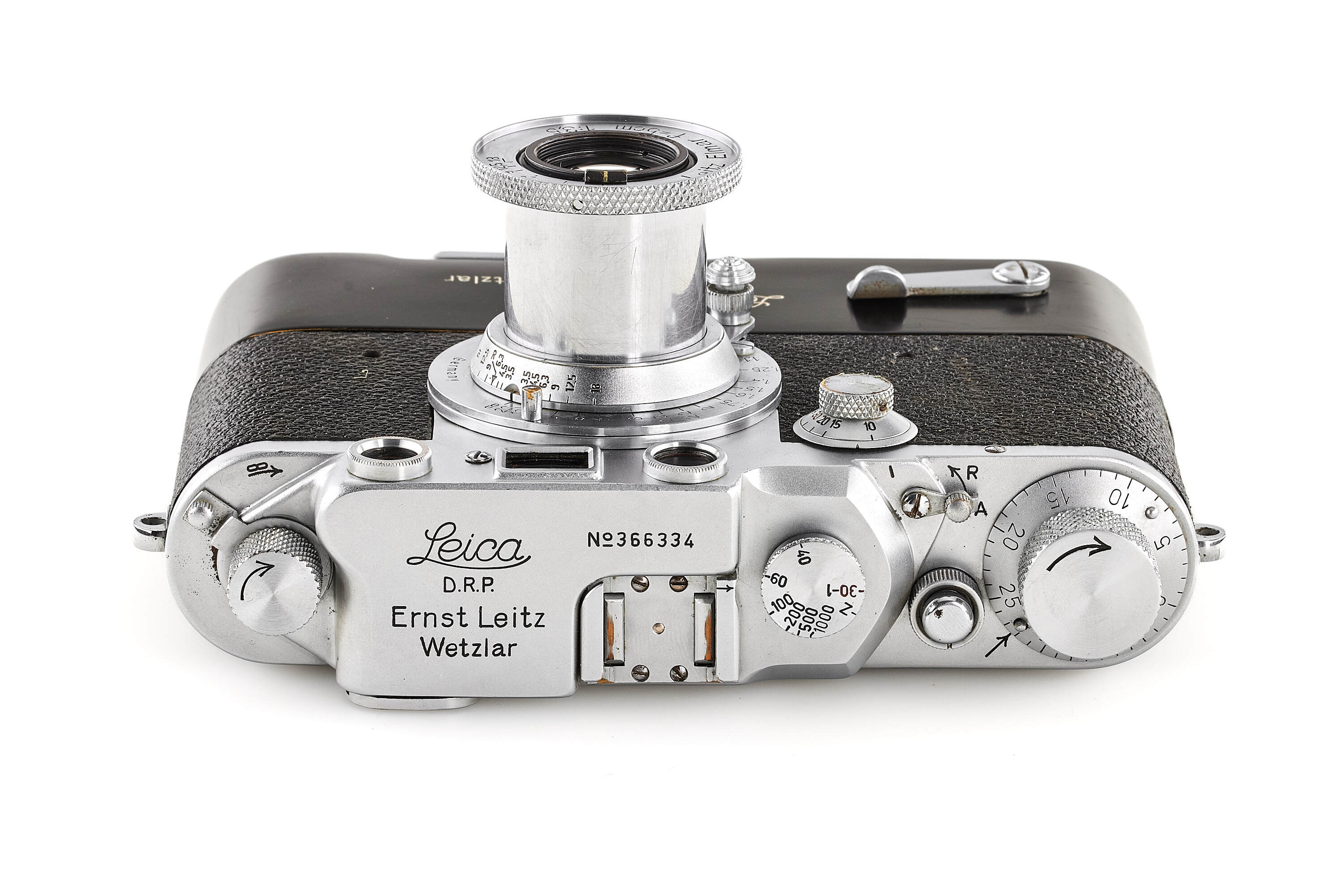 Early war-time IIIc chrome (production starts with no.360175) with red curtain, in very good condition, shutter needs service, with matching chrome Elmar 3.5/5cm no.549608 with very good optics only showing a couple of light cleaning marks (front lens cap), together with black paint MOOLY motor winder no.5526.