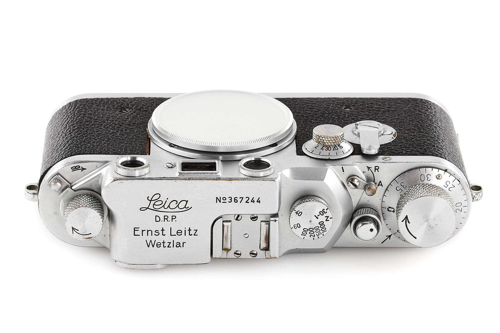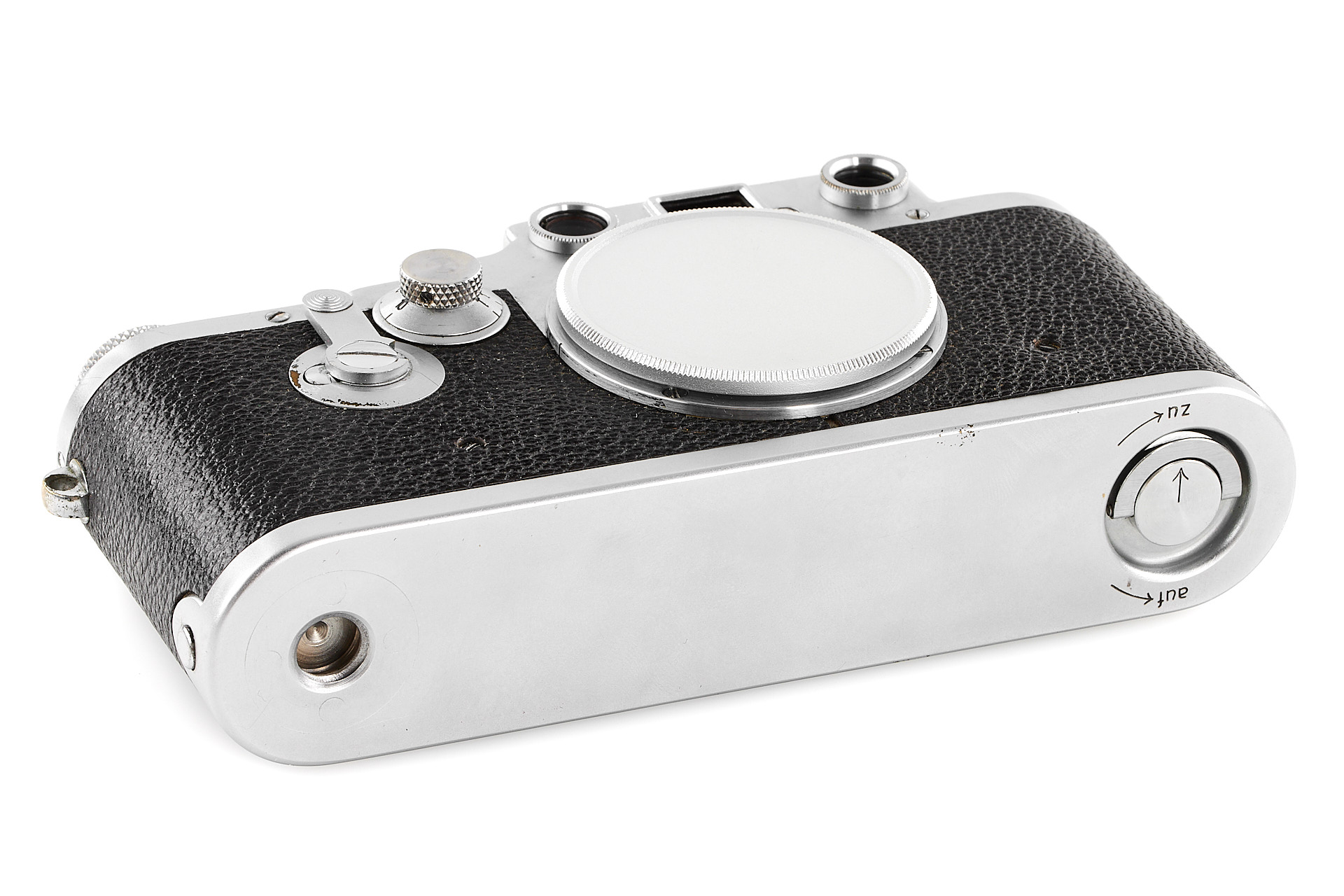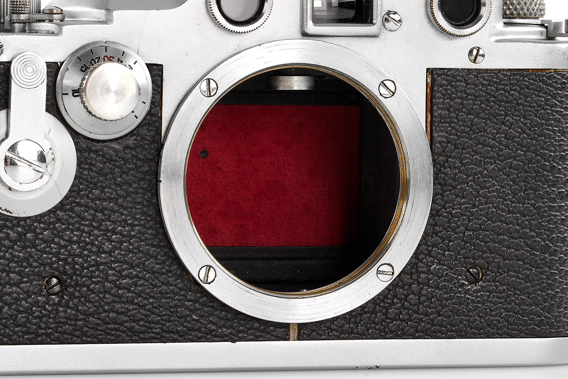 Very rare and one of the last of 427 Leica IIId ever made, it was the first Leica model with a built-in self-timer, a technical feature that would later become a standard for many models to follow. The camera offered has a red shutter curtain (not lightproof anymore) and is in good cosmetical condition, a flash contact was added later, delivered on 09.04.1945.