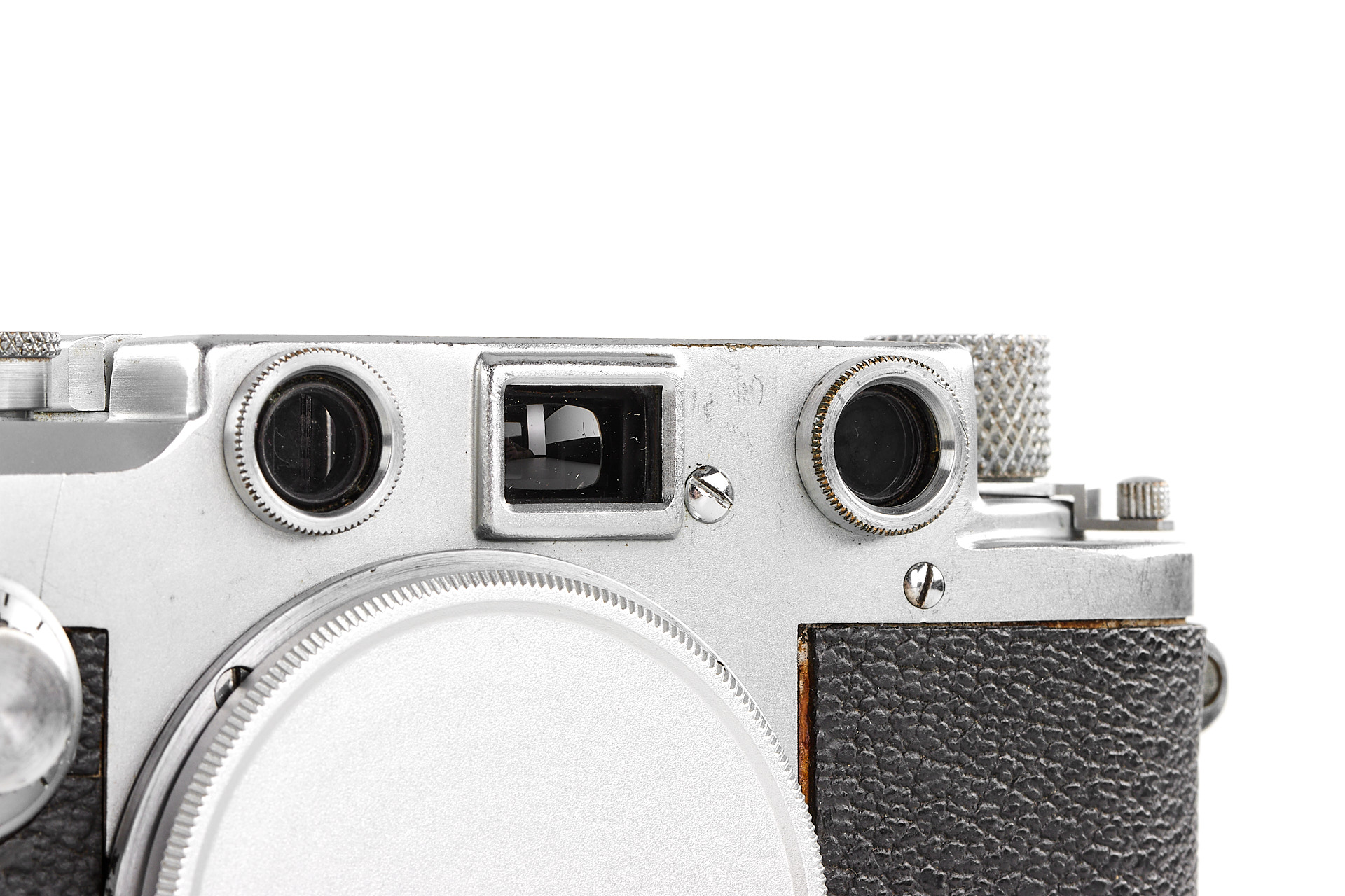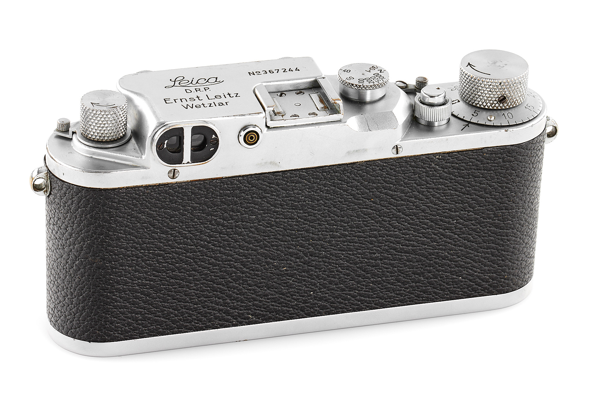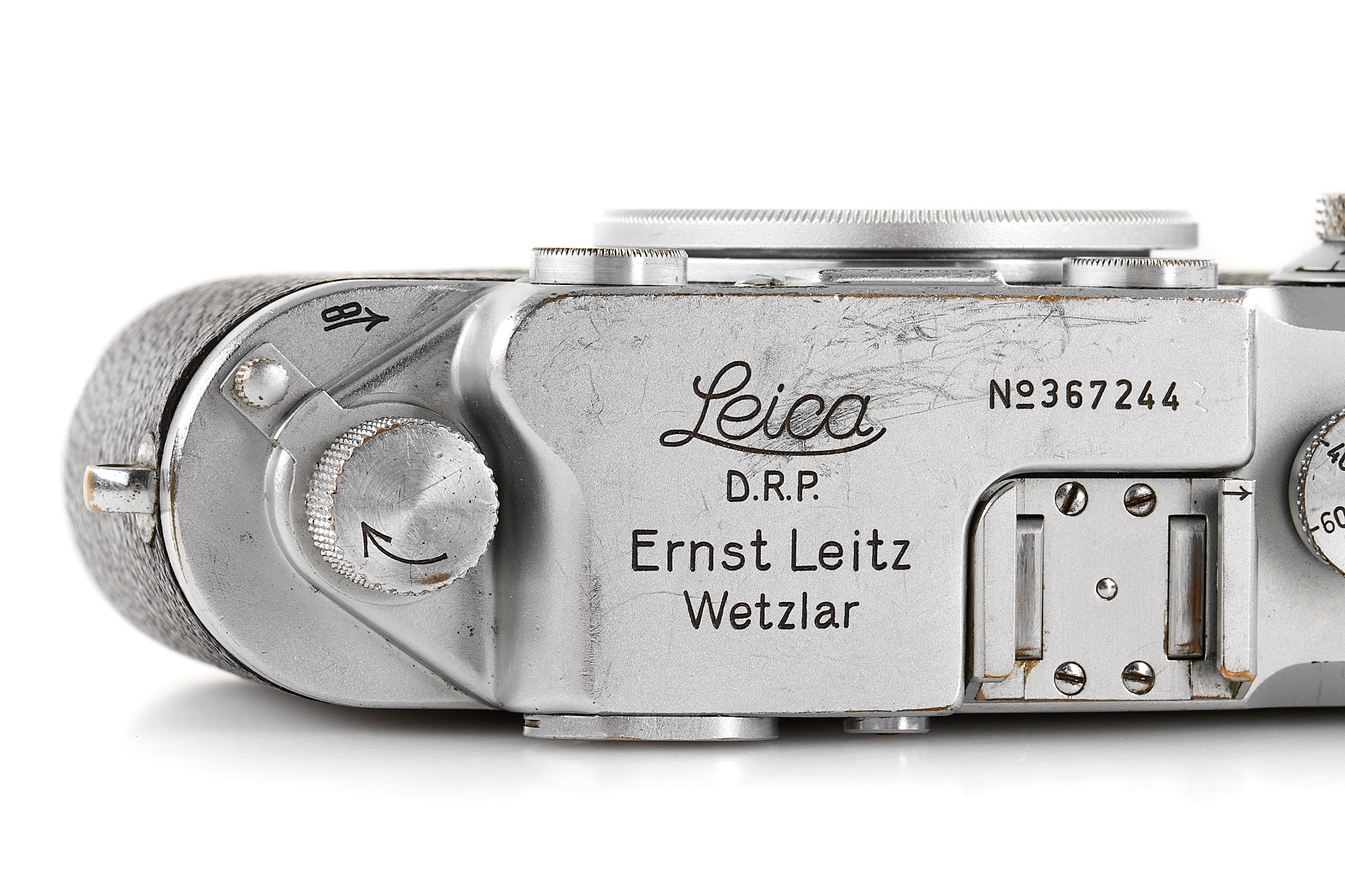 Very rare and one of the last of 427 Leica IIId ever made, it was the first Leica model with a built-in self-timer, a technical feature that would later become a standard for many models to follow. The camera offered has a red shutter curtain (not lightproof anymore) and is in good cosmetical condition, a flash contact was added later, delivered on 09.04.1945.