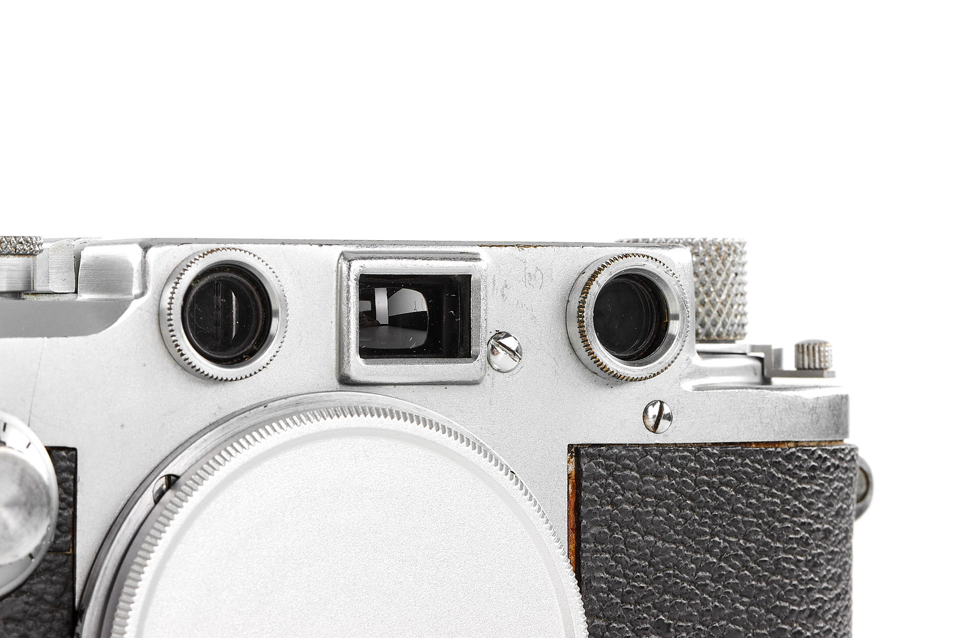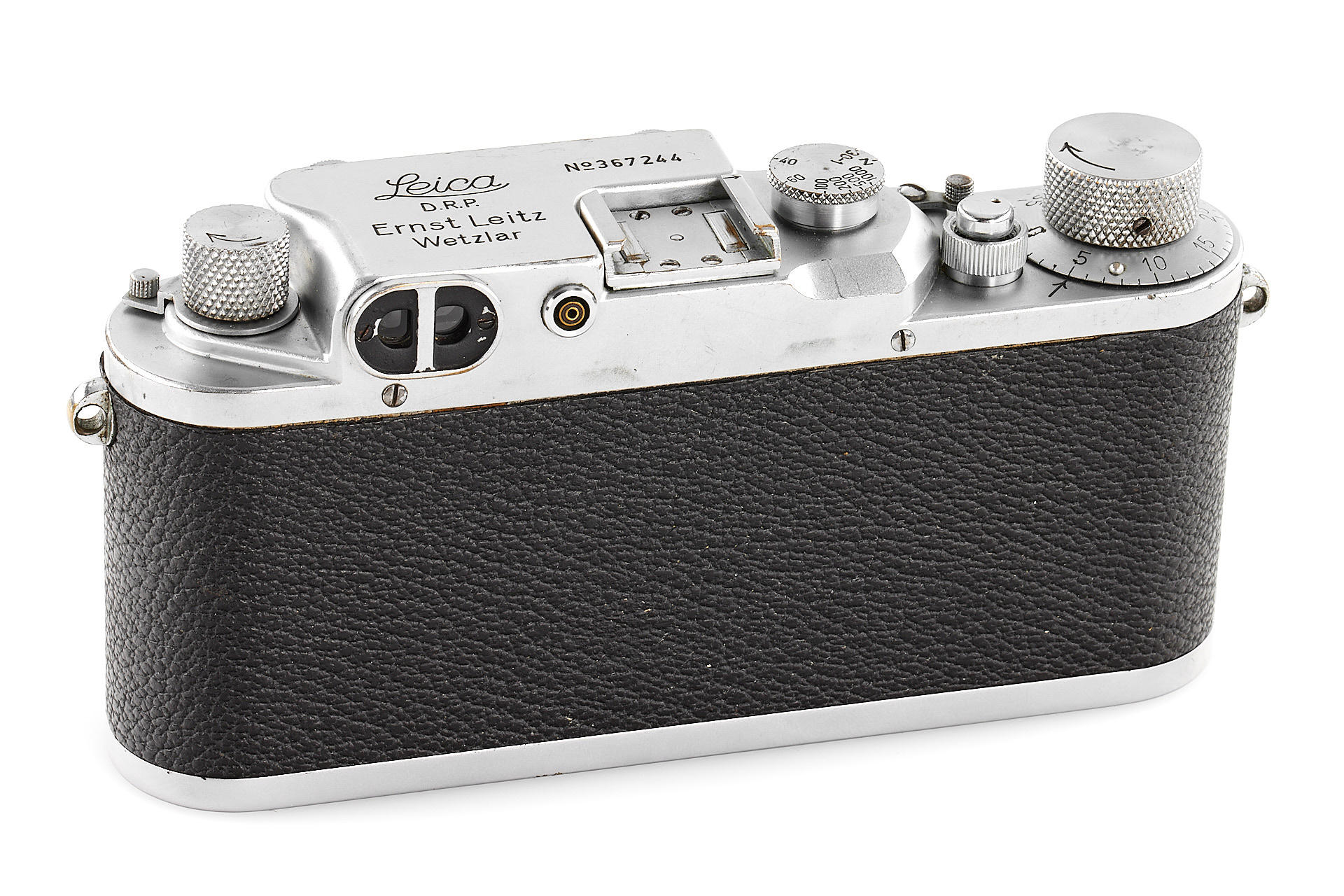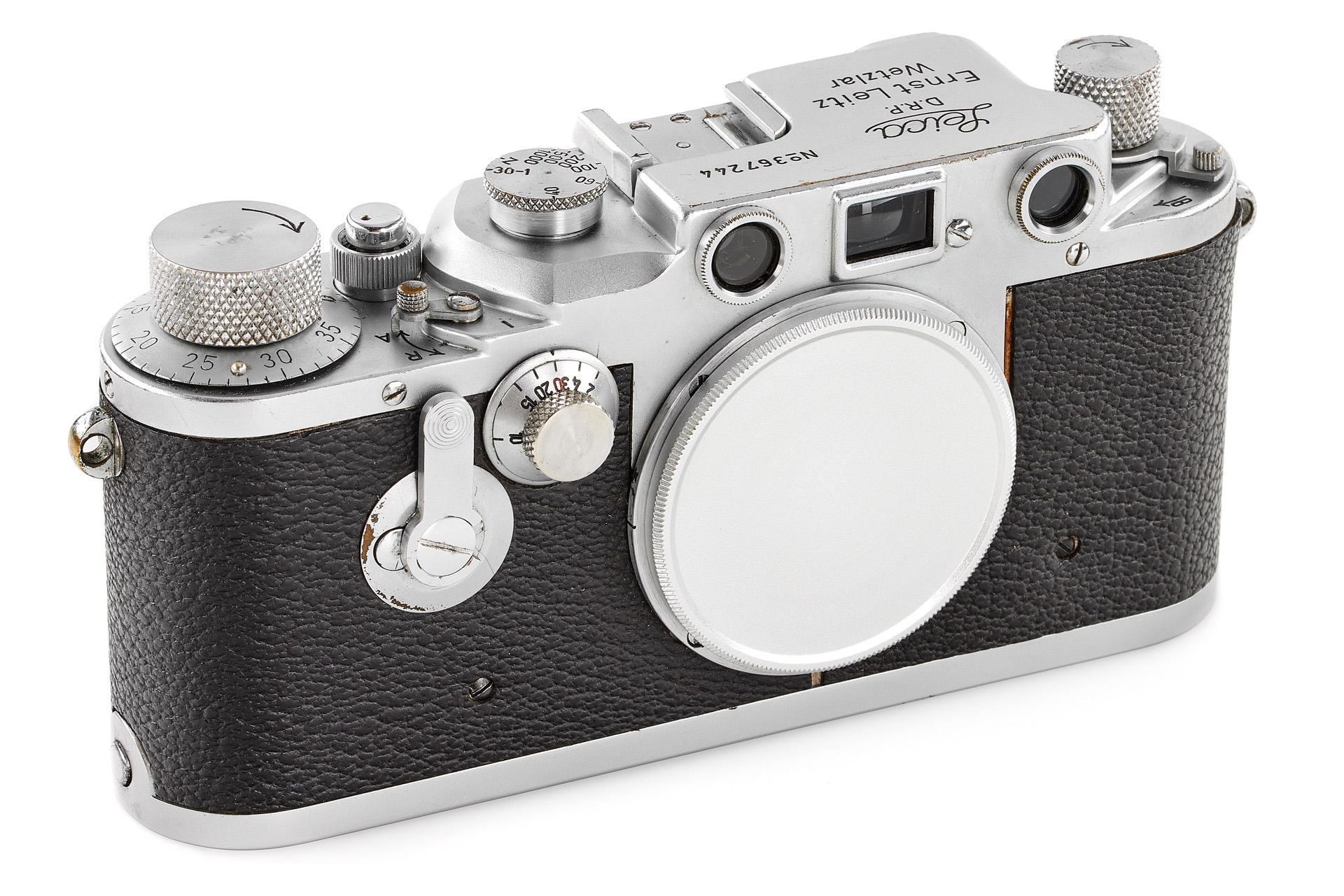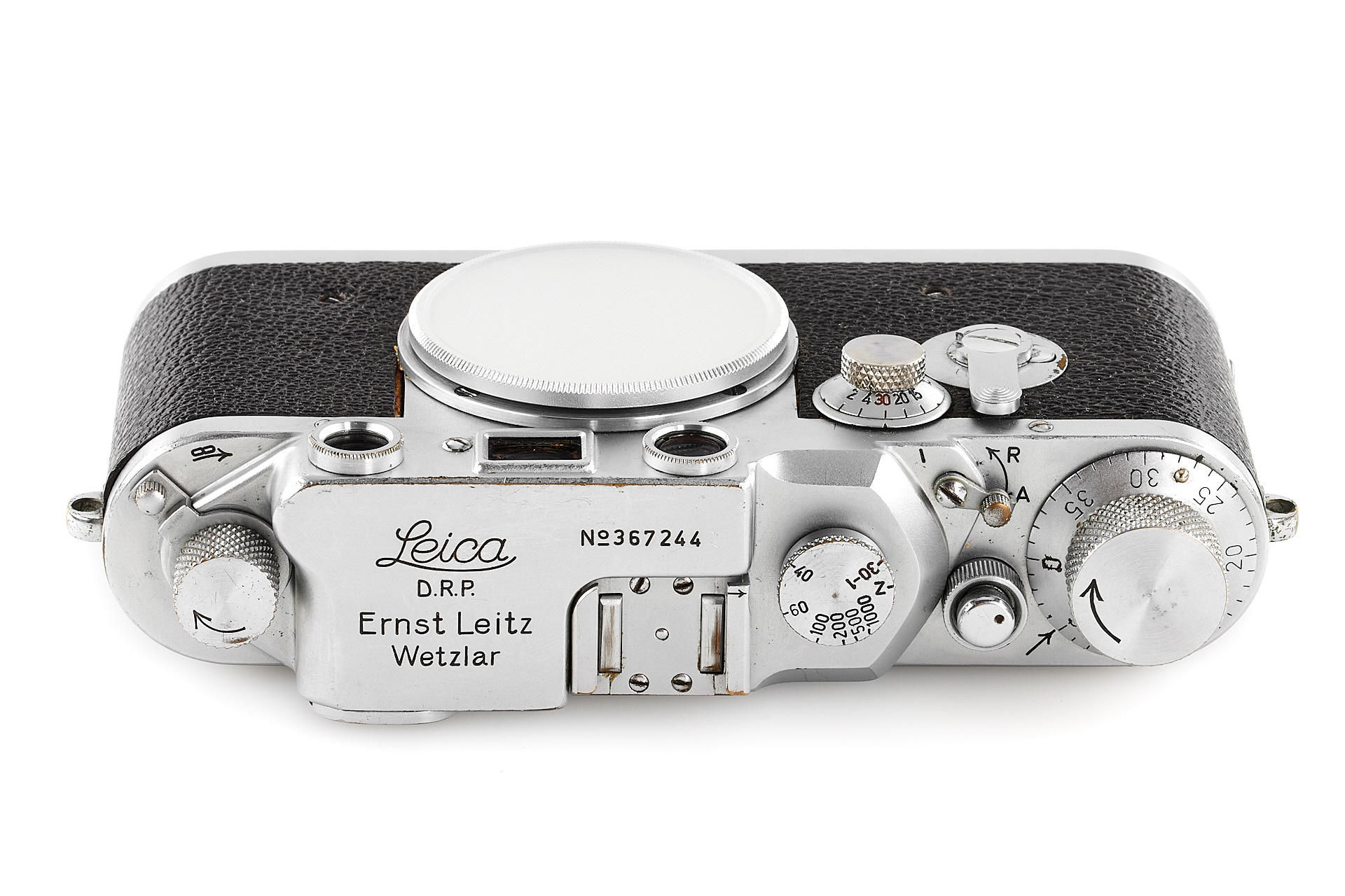 very rare and one of the last of 427 Leica IIId ever made, it was the first Leica model with built-in self-timer, a technical feature that would later become a standard for many models to follow. The camera offered has a red shutter curtain (not lightproof anymore) and is in good condition, a flash contact was added later, first delivered on 09.04.1945