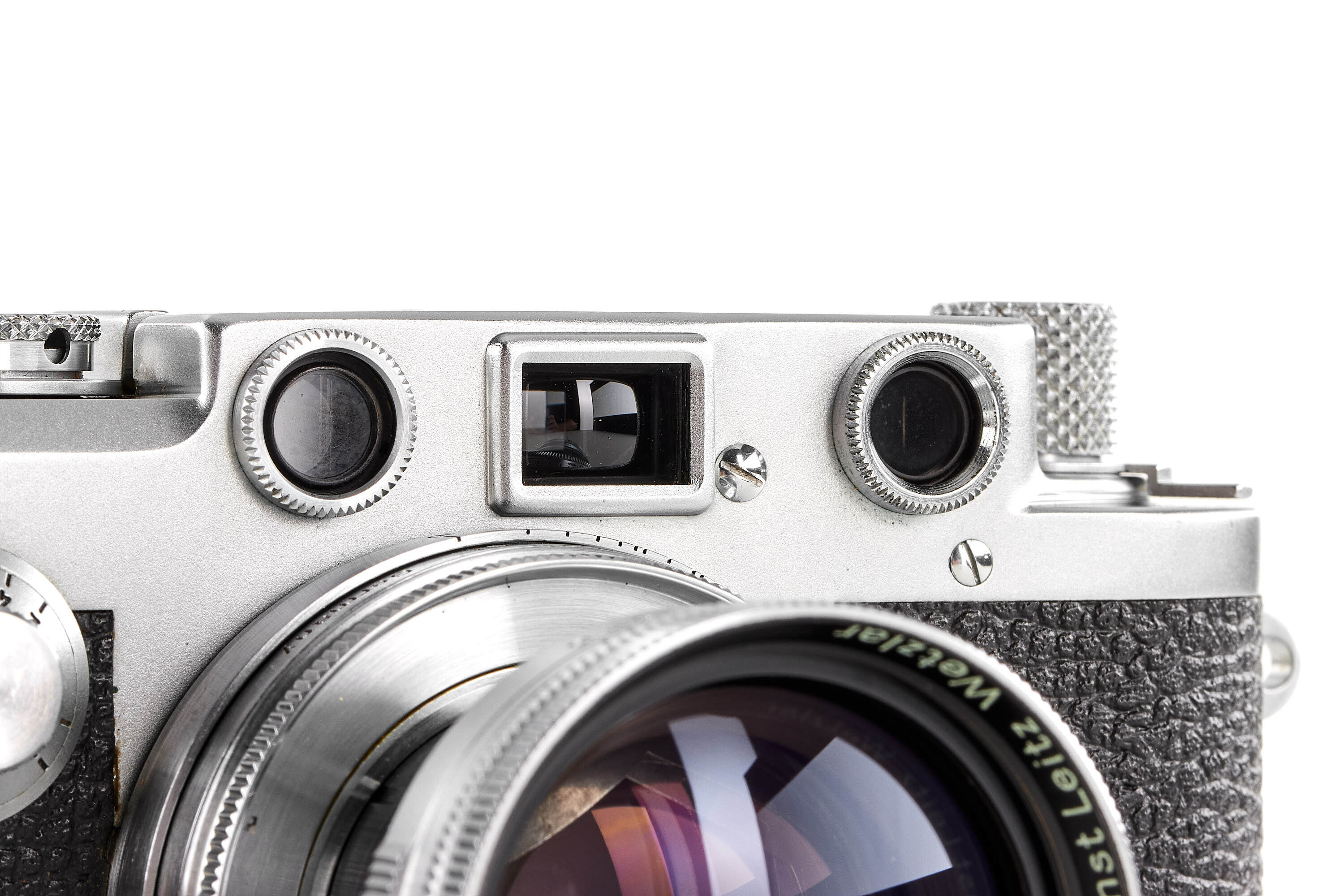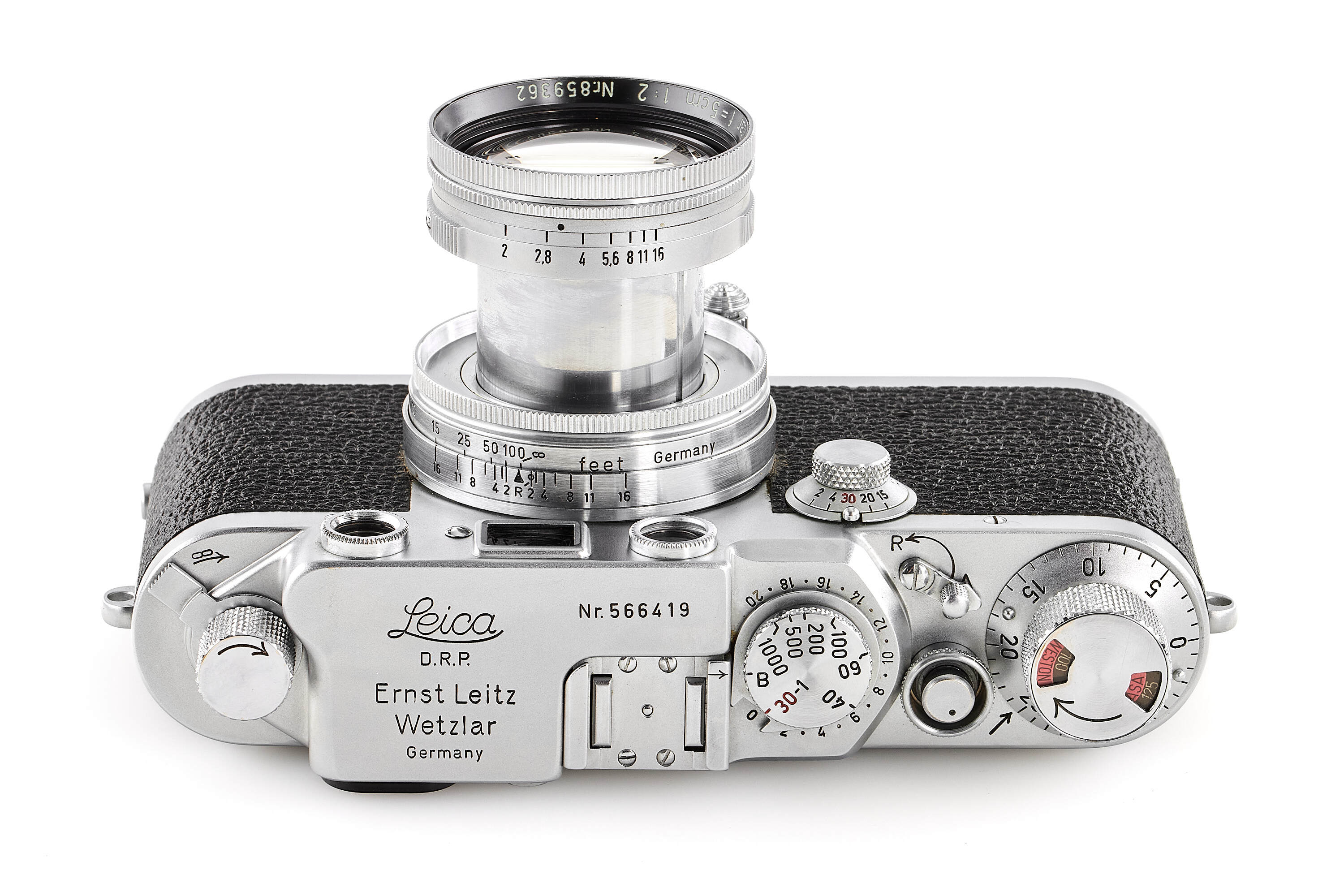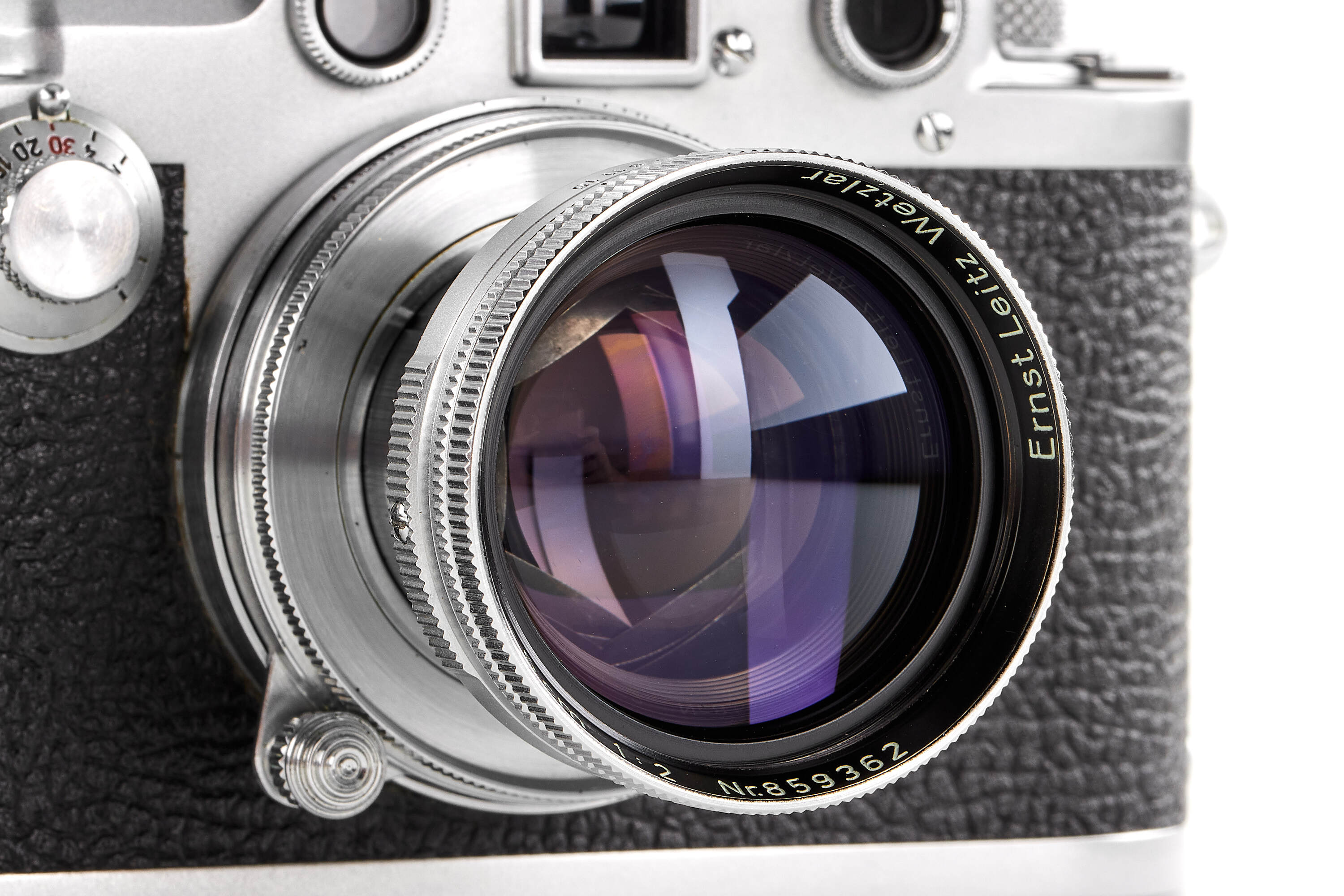 Very interesting early IIIf with black dial, in almost mint condition, shutter curtains need attention, with late Summitar 2/5cm no.859362 in feet, with good coated optics, only showing a few light cleaning marks (front lens cap), both delivered on 24.09.1951 to Trieste, Italy, Leica records mention 'Headquarters' shows it was delivered to the "TRUST" (Trieste United States Troops), American infantry division which served as a front line in the Cold War from 1947 to 1954.