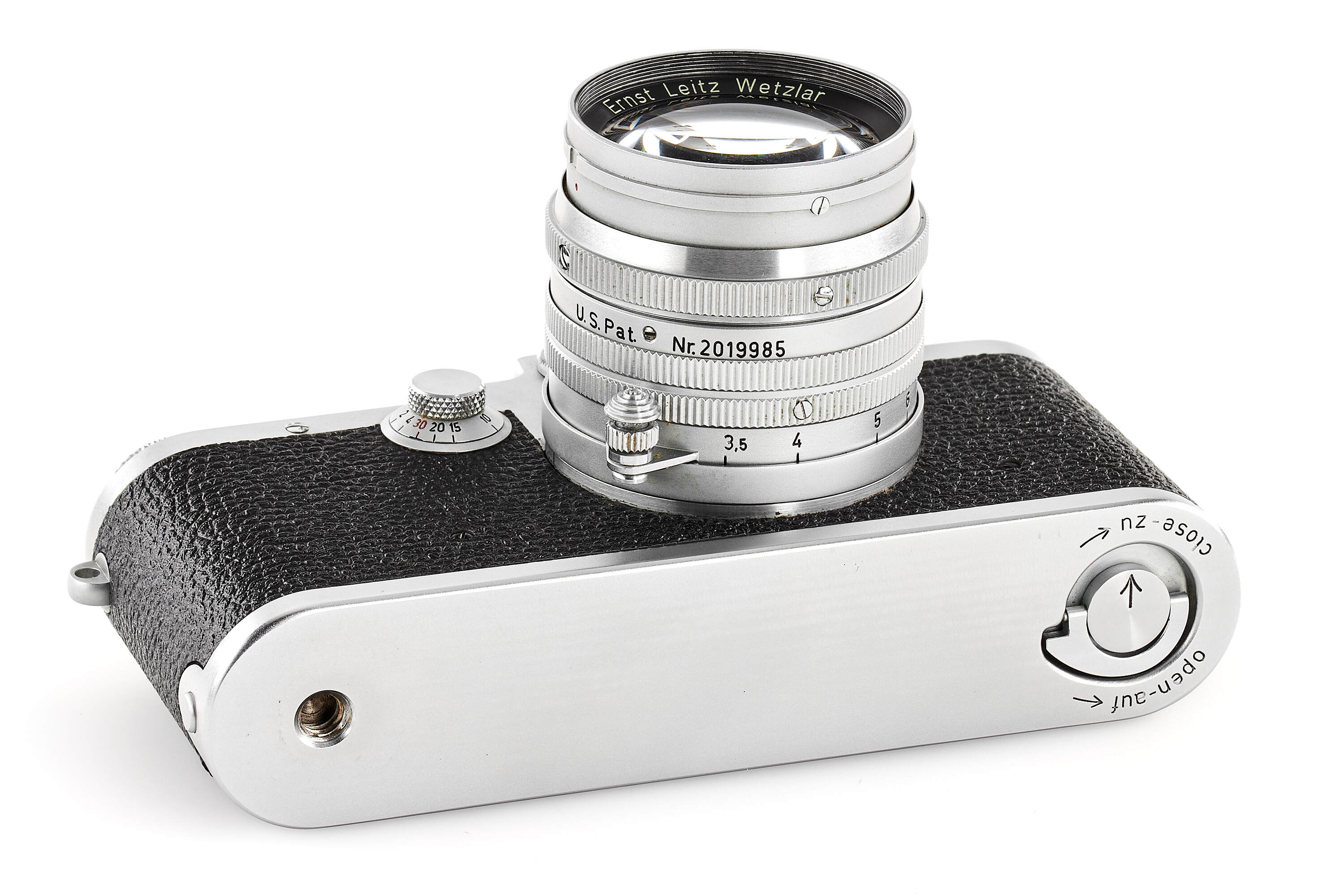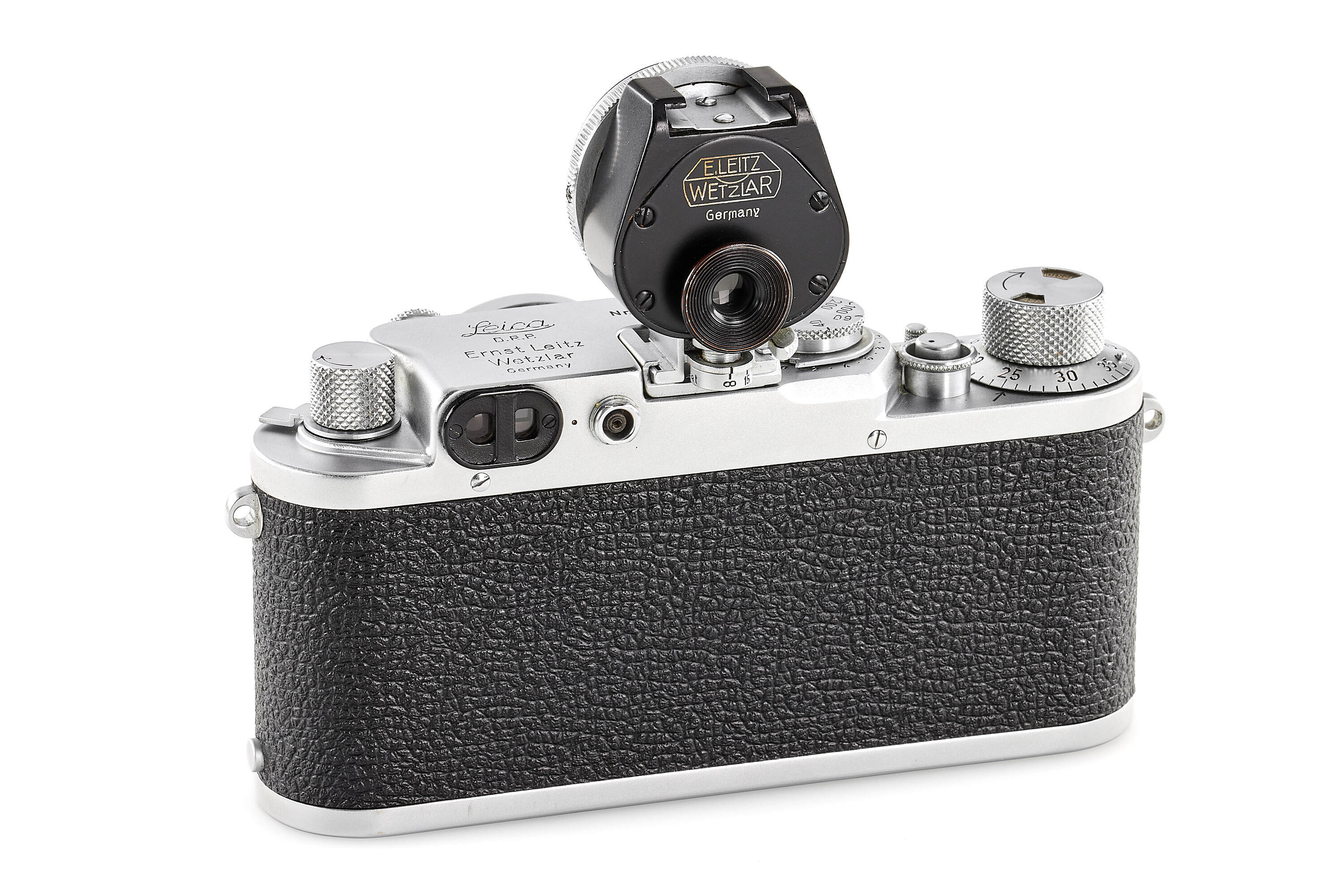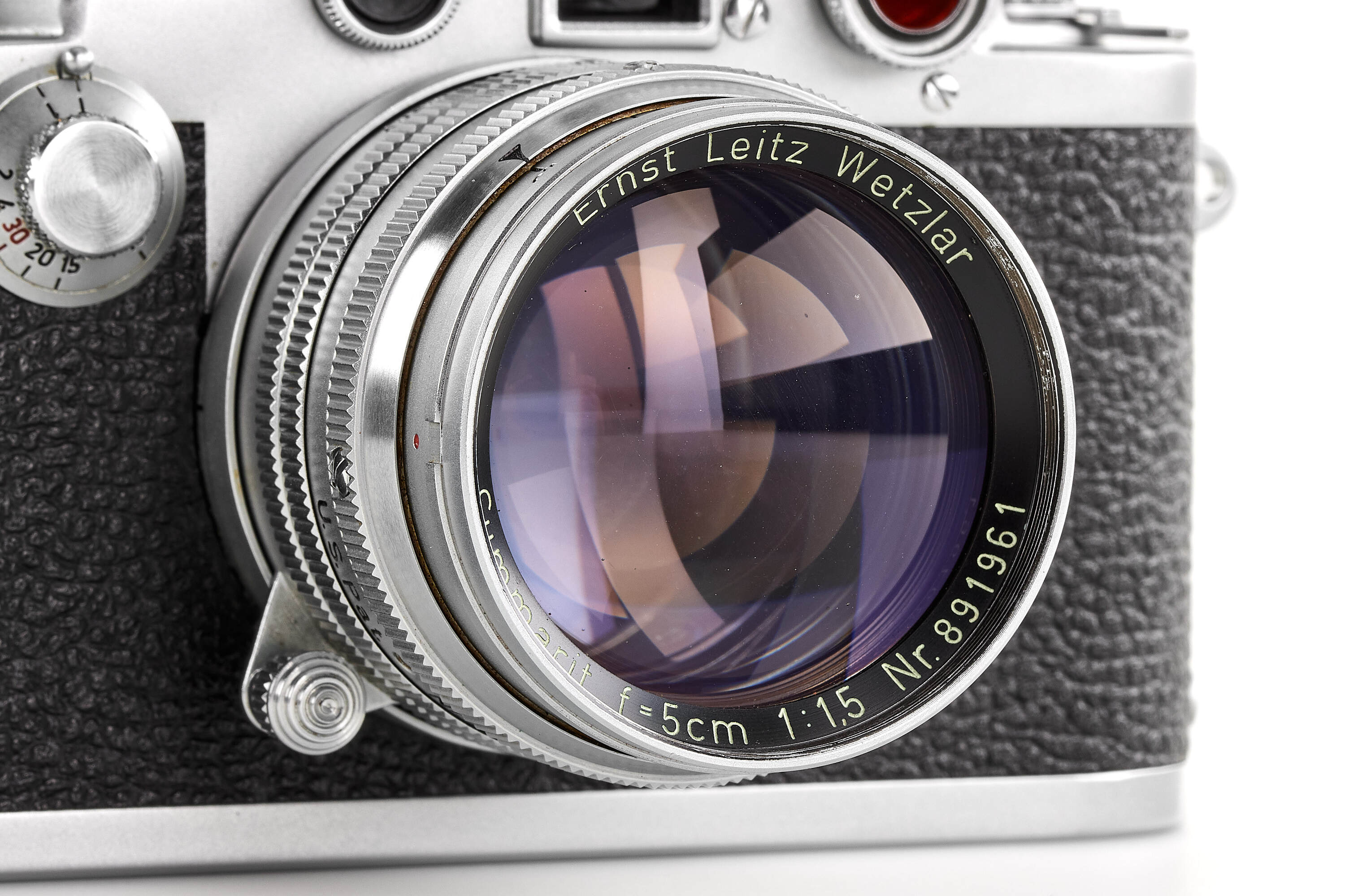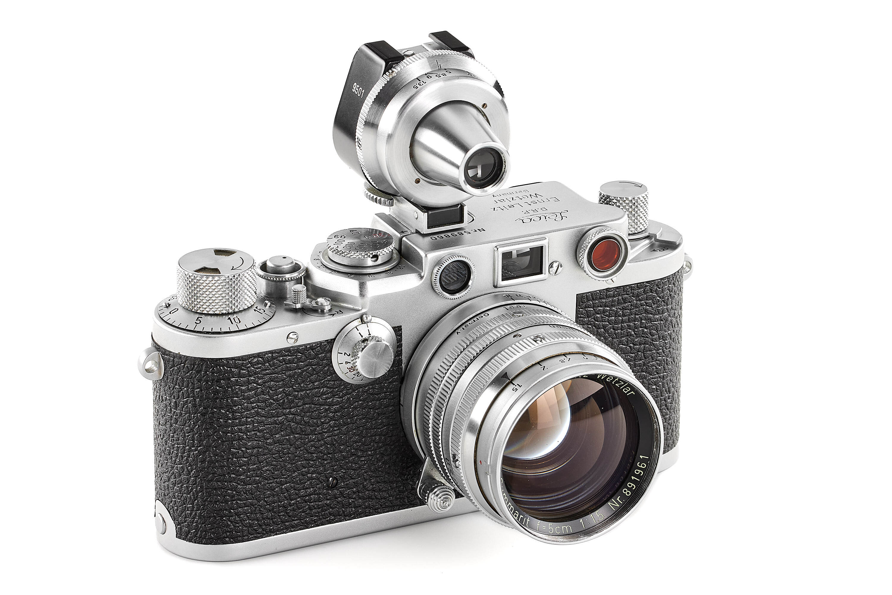 Very nice quite early IIIf with black flash sync. scale, export version with Weston film index, in almost mint condition, delivered to Leitz New York on 13.03.1952, together with matching Summarit 1.5/5cm no.891961 in feet scale with 'Tailor & Hobson' engravings, good optics only showing a few light cleaning marks on the front element, with VIOOH universal finder no.9501 in feet scale, rare OKARO chrome orange filter for the rangefinder, unusual leather eveready case allowing the finder to remain mounted, original customs papers, brochures and instructions.