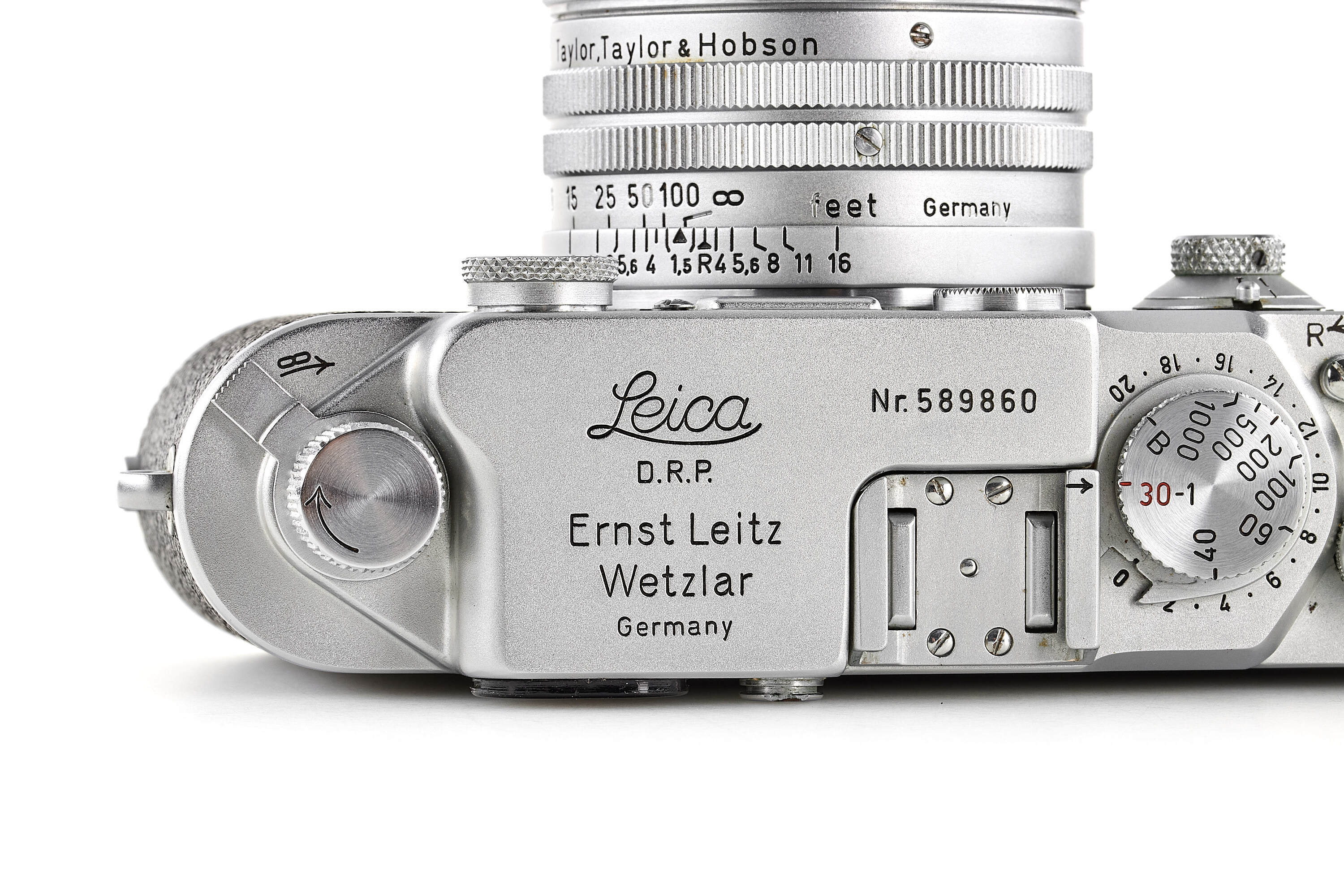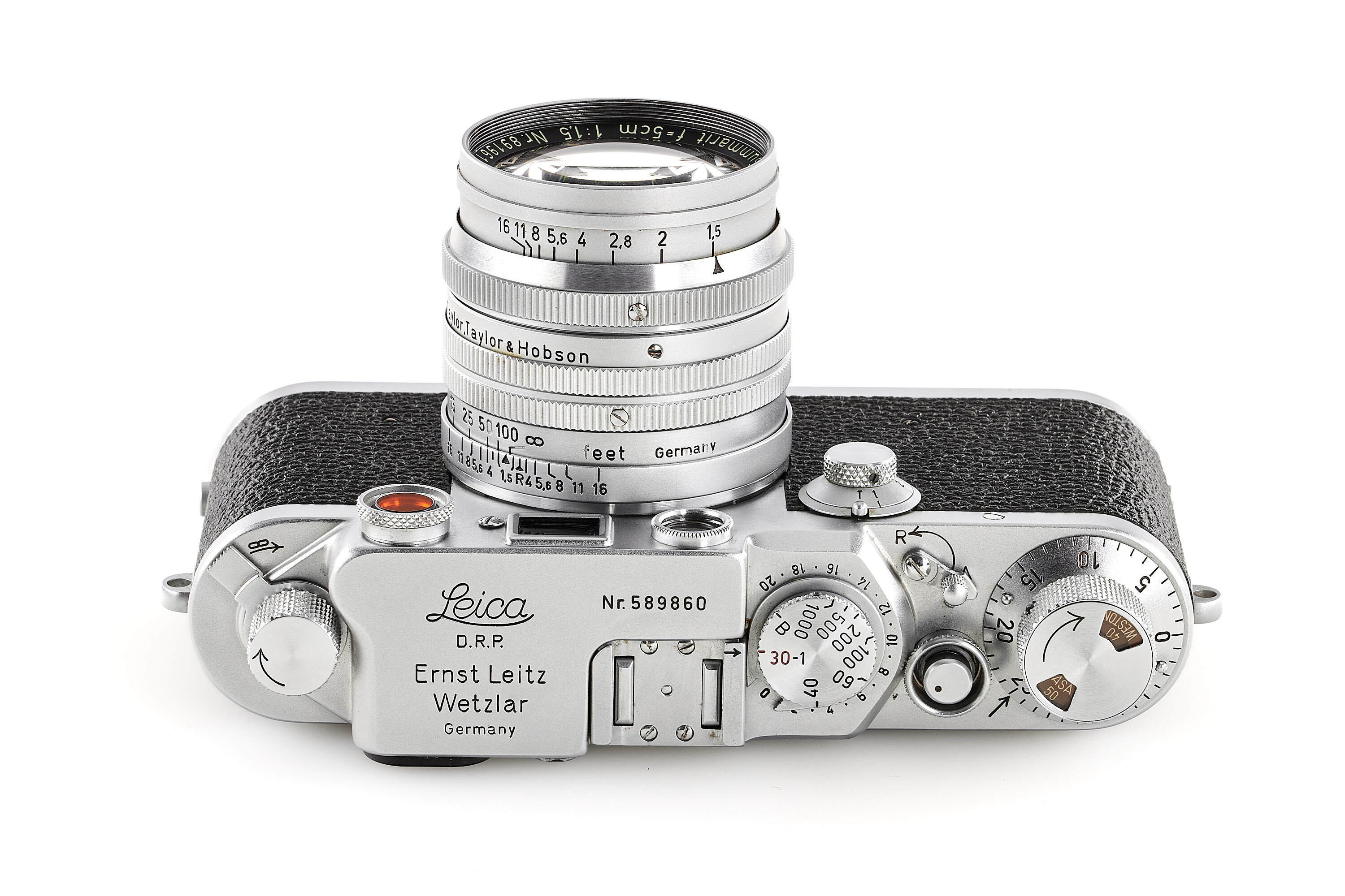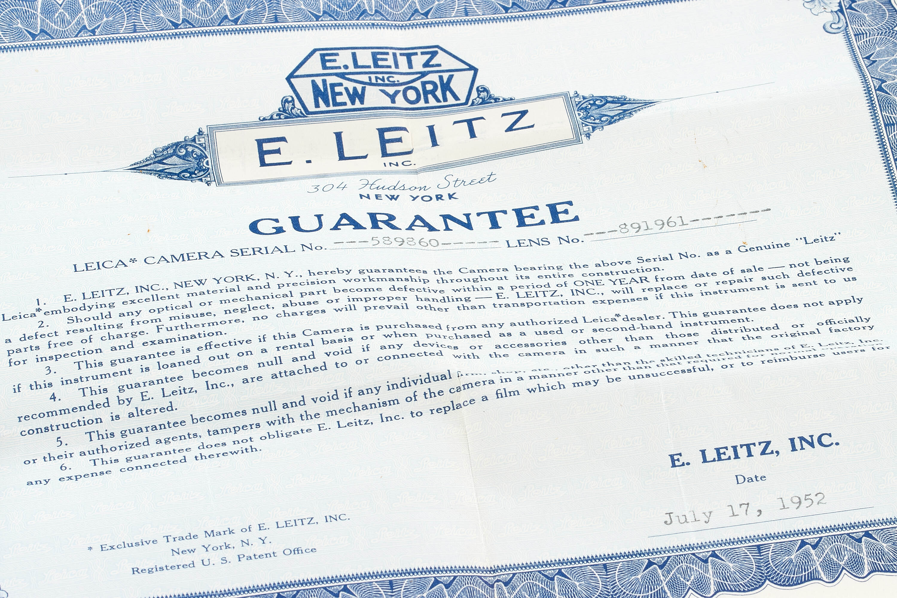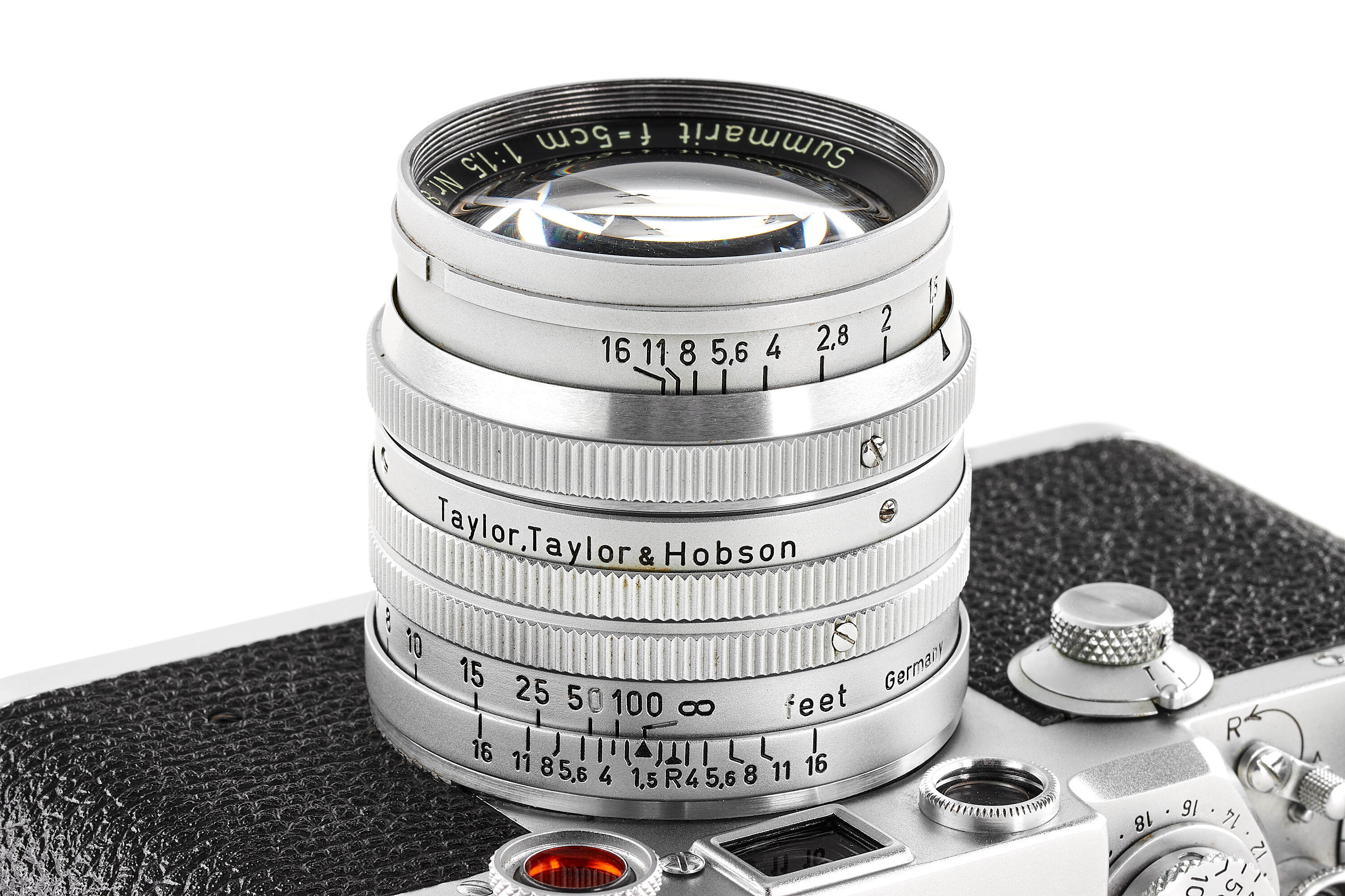 Very nice quite early IIIf with black flash sync. scale, export version with Weston film index, in almost mint condition, delivered to Leitz New York on 13.03.1952, together with matching Summarit 1.5/5cm no.891961 in feet scale with 'Tailor & Hobson' engravings, good optics only showing a few light cleaning marks on the front element, with VIOOH universal finder no.9501 in feet scale, rare OKARO chrome orange filter for the rangefinder, unusual leather eveready case allowing the finder to remain mounted, original customs papers, brochures and instructions.