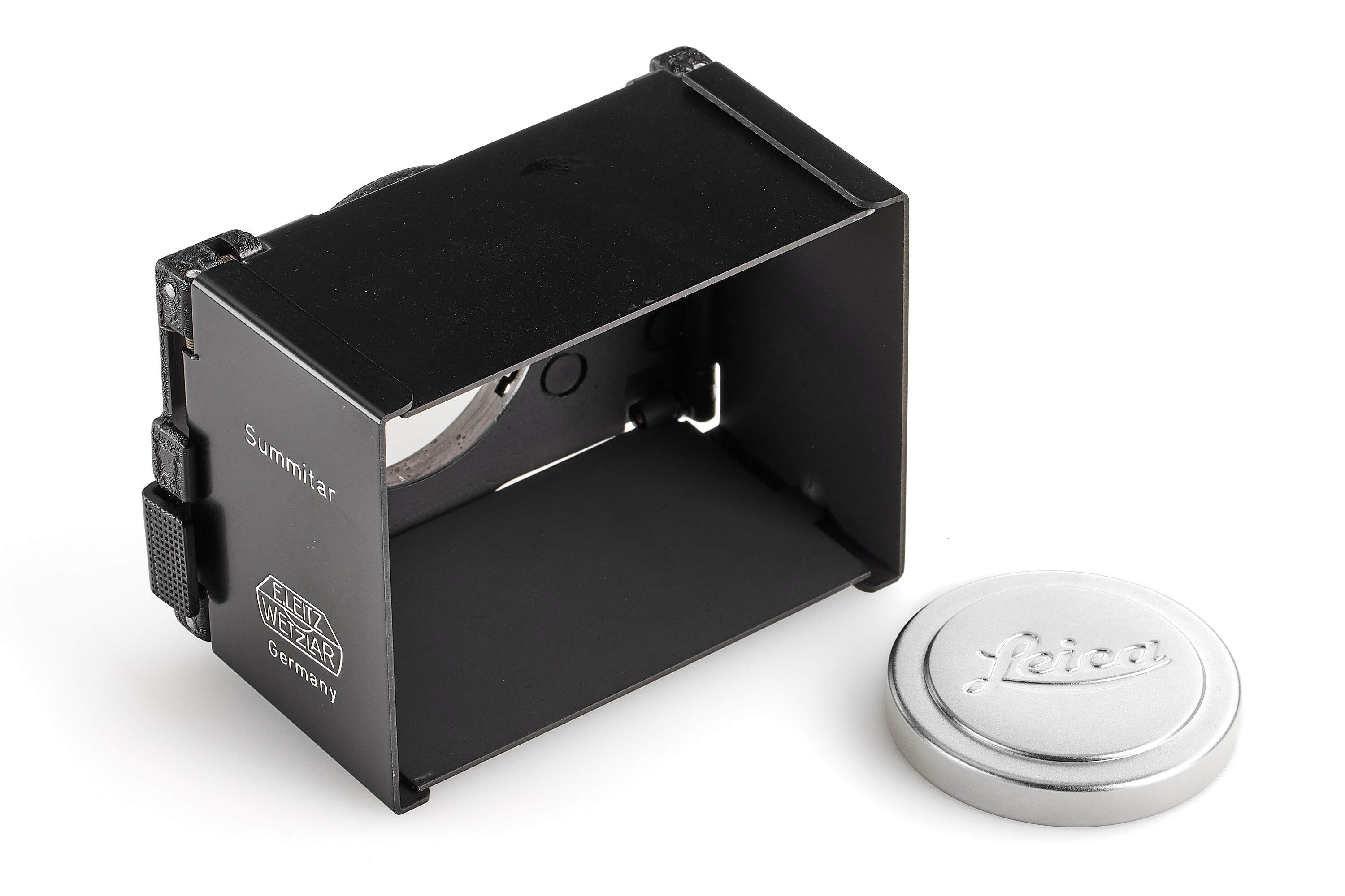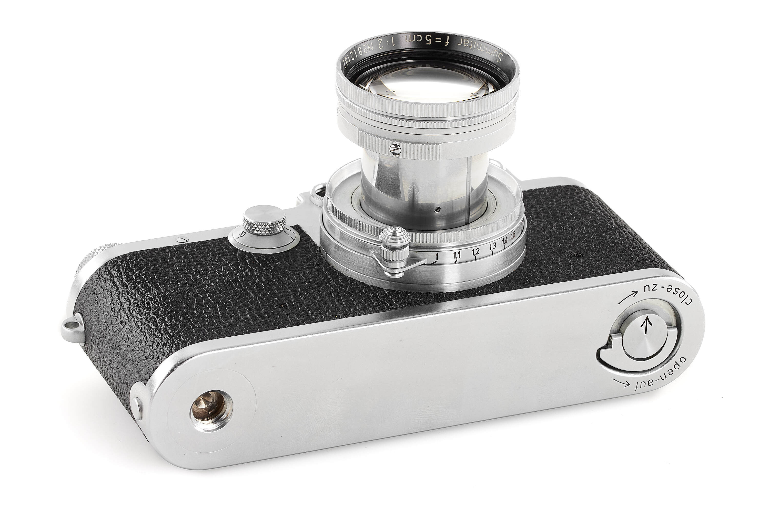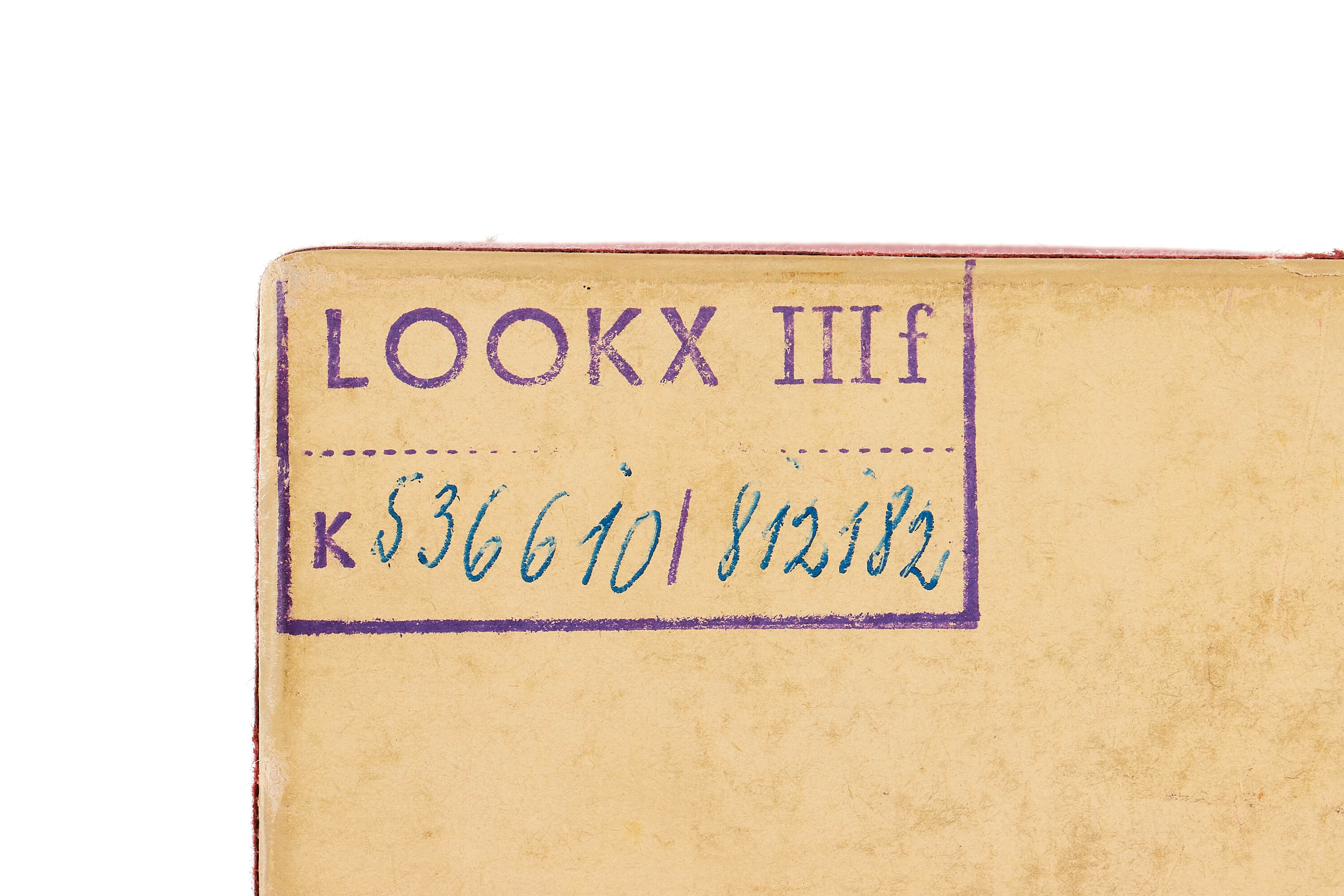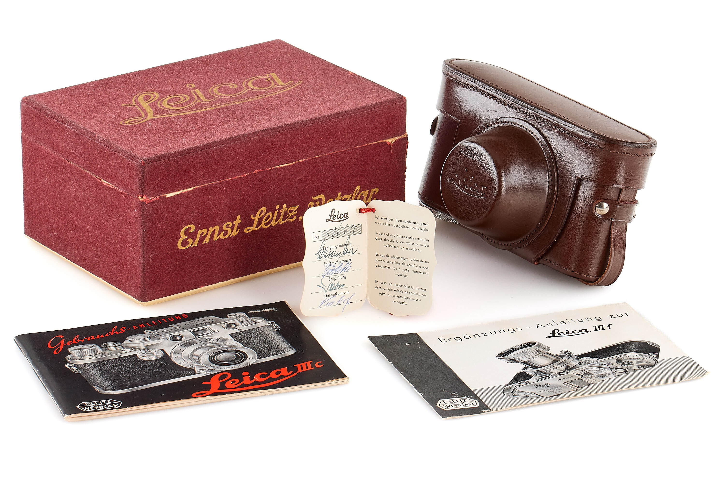 Very nice quite early IIIf with black flash sync. scale, in unused condition, with matching Summitar 2/5cm no.812182, clean and clear optics, with front lens cap, delivered as an original set to retailer Süß, Munich on 22.01.1951, with SOOPD collapsible hood, eveready case, original control tag and red maker's box with matching serial numbers, with German instructions wearing the commercial 'Conrad Barnack' (son of Mr Oskar Barnack!) stamp on the rear.