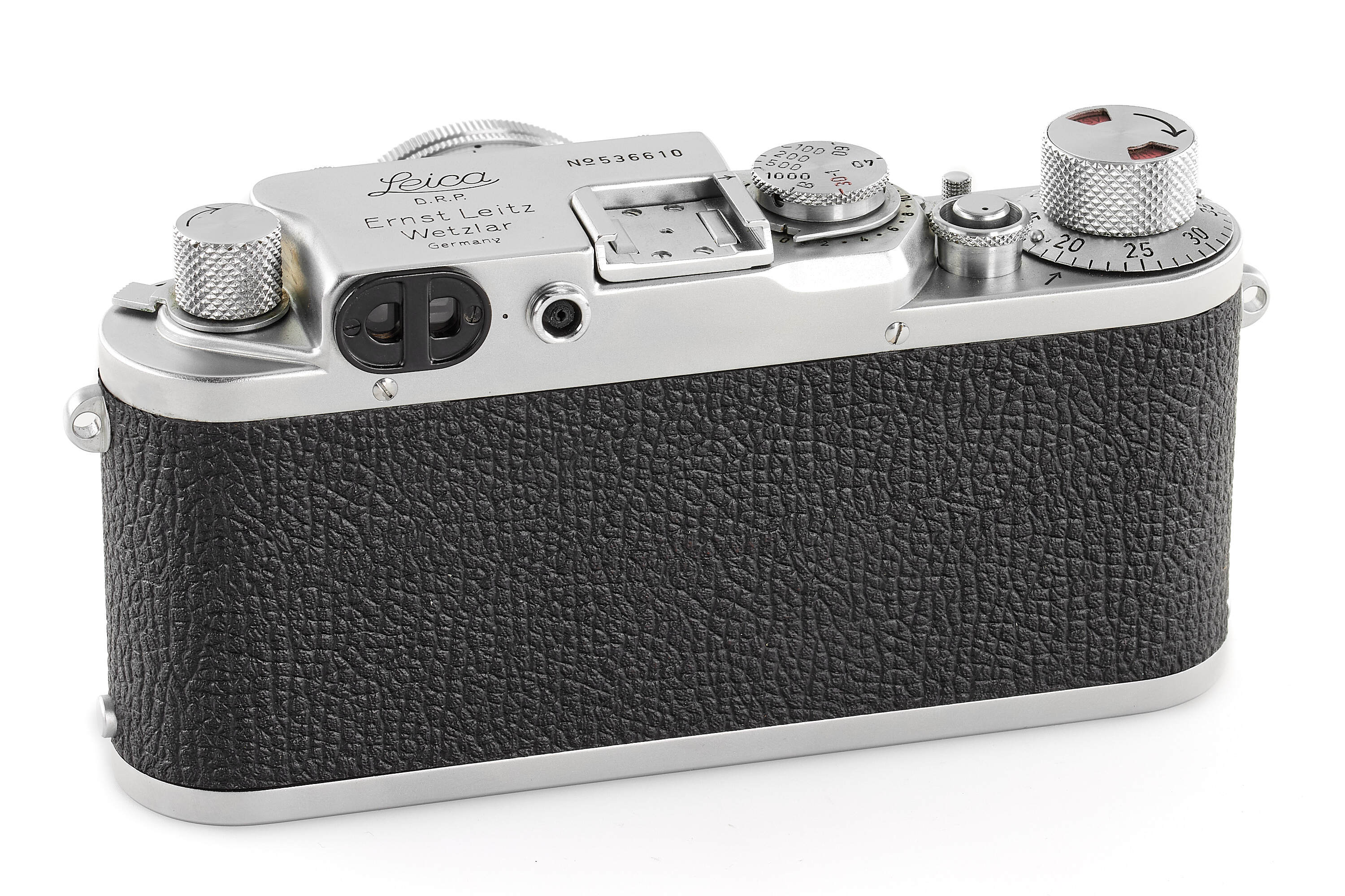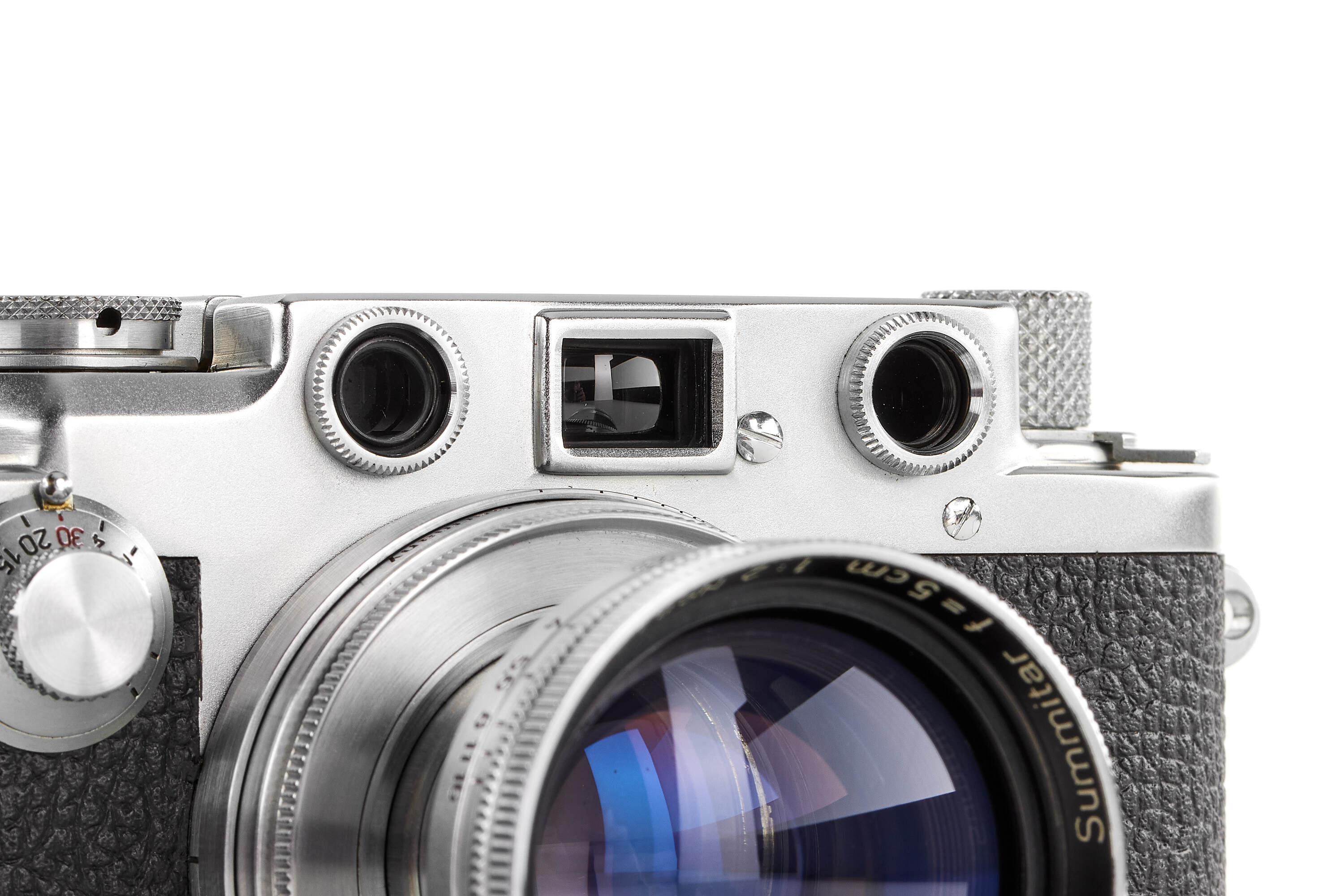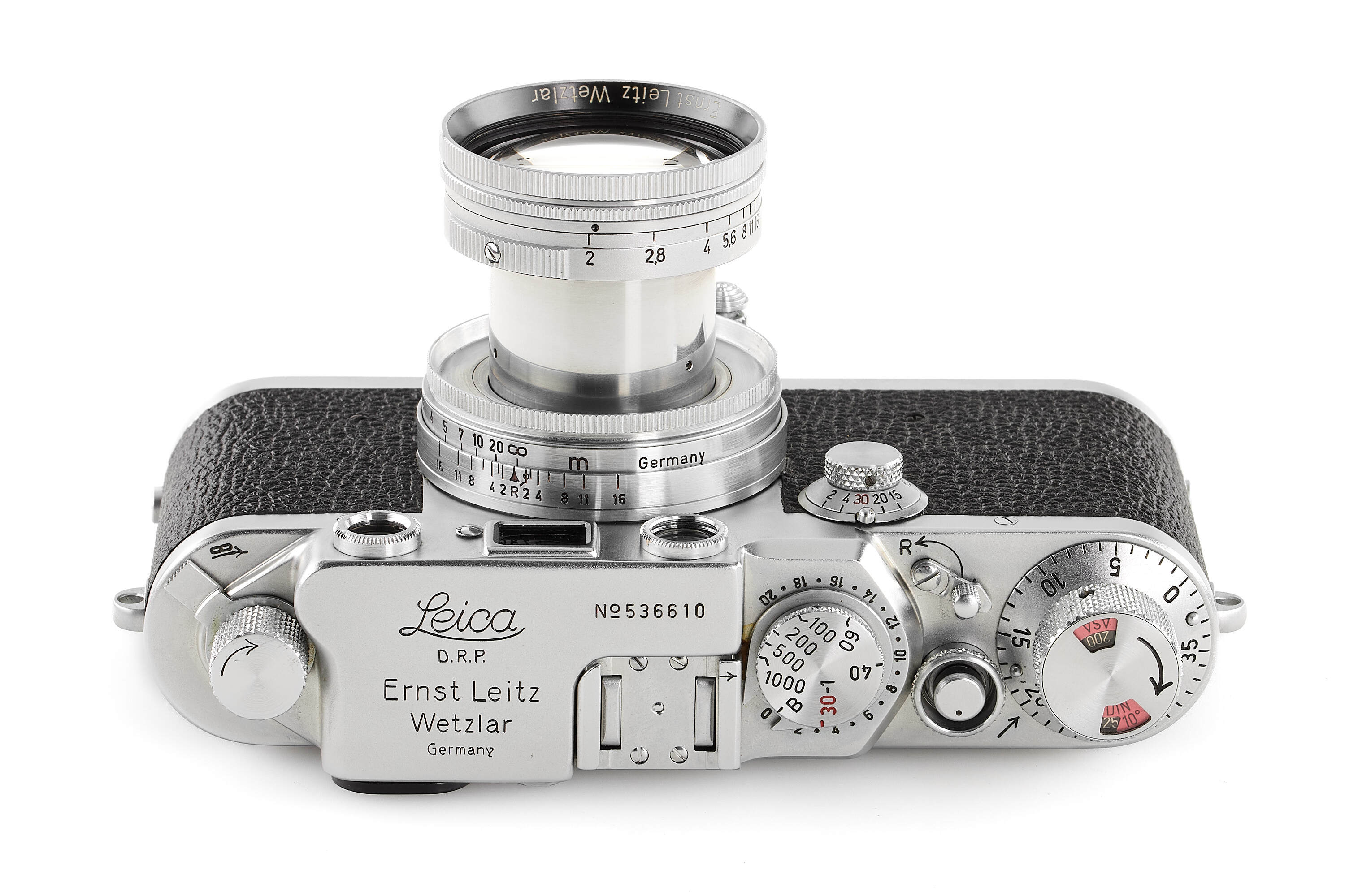 Very nice quite early IIIf with black flash sync. scale, in unused condition, with matching Summitar 2/5cm no.812182, clean and clear optics, with front lens cap, delivered as an original set to retailer Süß, Munich on 22.01.1951, with SOOPD collapsible hood, eveready case, original control tag and red maker's box with matching serial numbers, with German instructions wearing the commercial 'Conrad Barnack' (son of Mr Oskar Barnack!) stamp on the rear.