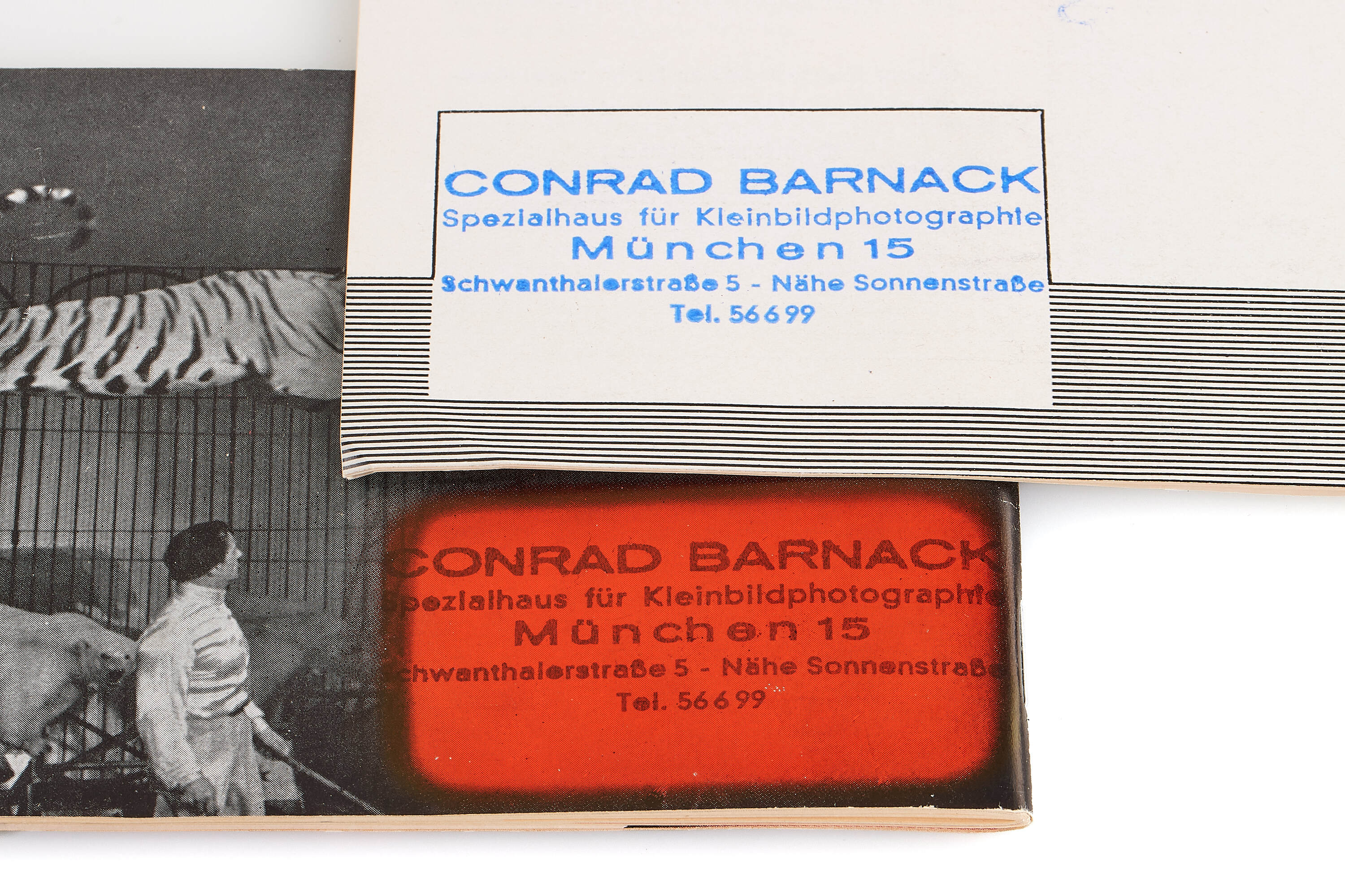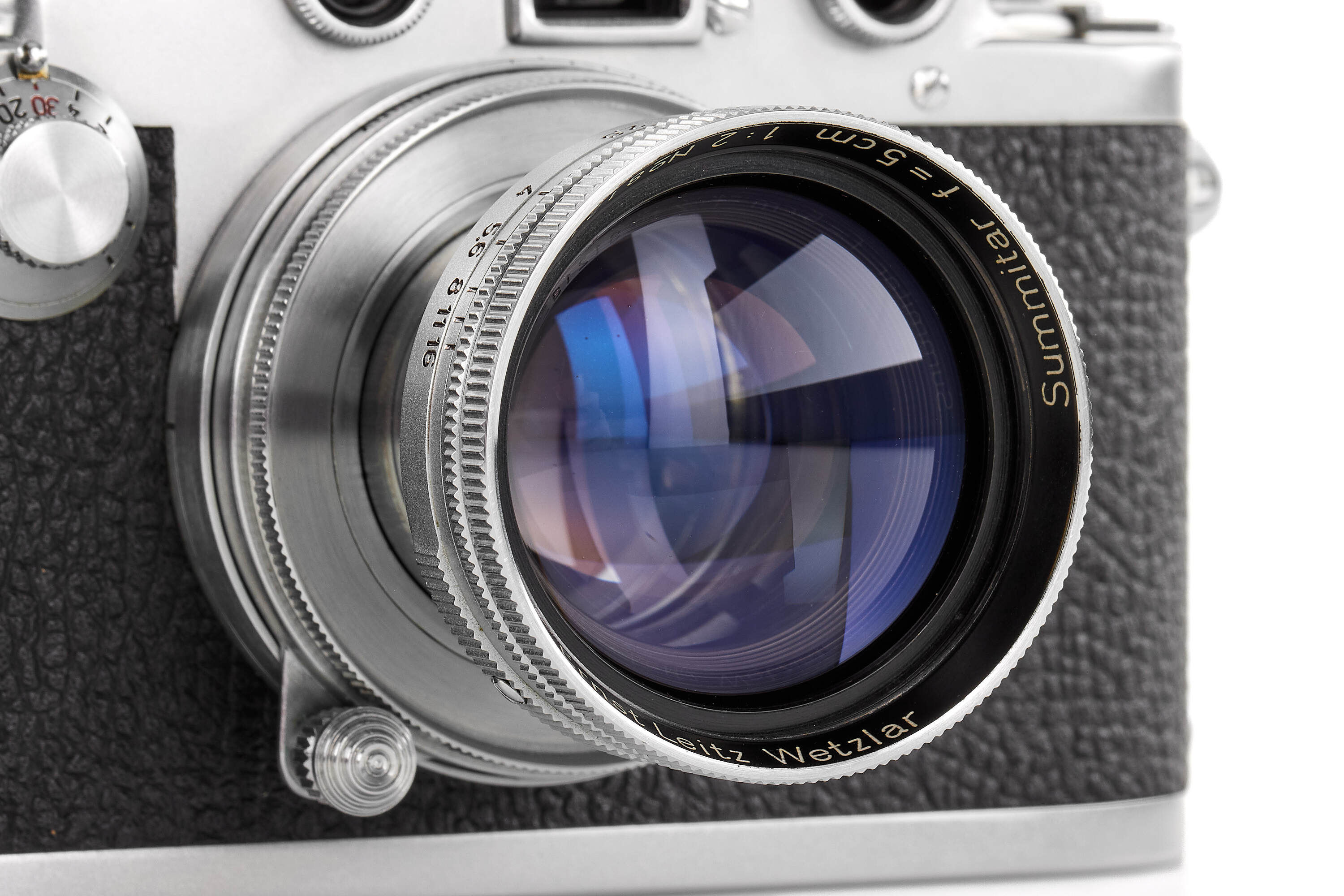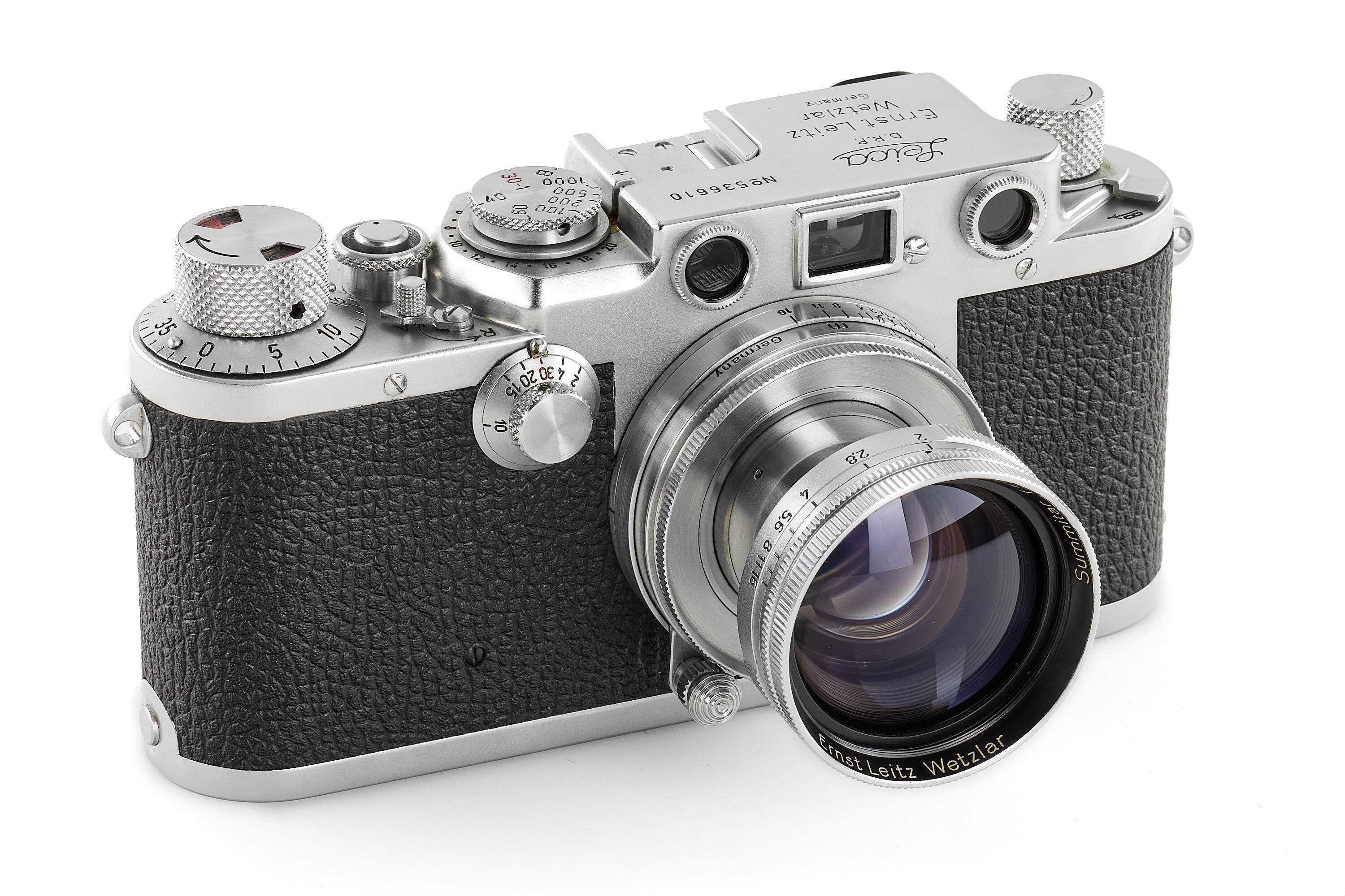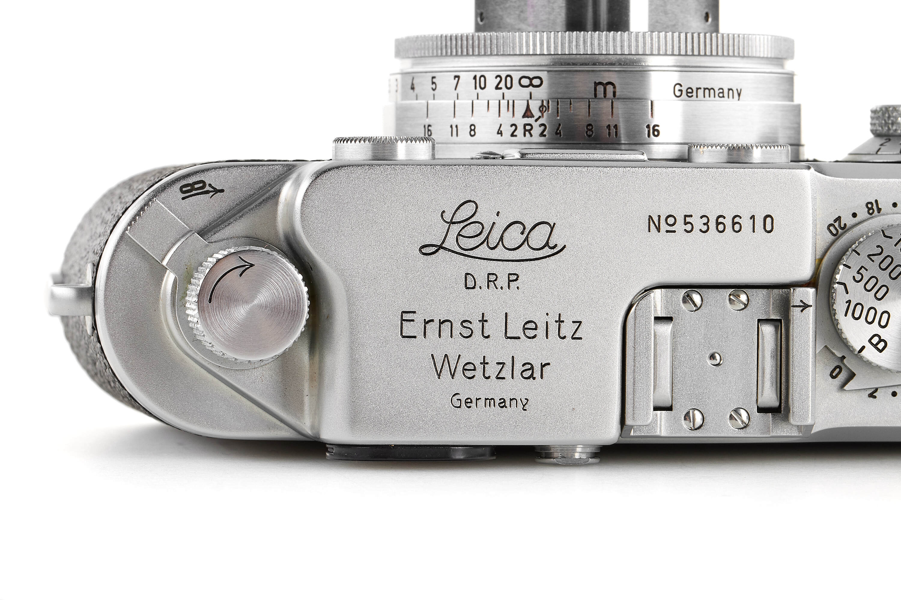 Very nice quite early IIIf with black flash sync. scale, in unused condition, with matching Summitar 2/5cm no.812182, clean and clear optics, with front lens cap, delivered as an original set to retailer Süß, Munich on 22.01.1951, with SOOPD collapsible hood, eveready case, original control tag and red maker's box with matching serial numbers, with German instructions wearing the commercial 'Conrad Barnack' (son of Mr Oskar Barnack!) stamp on the rear.