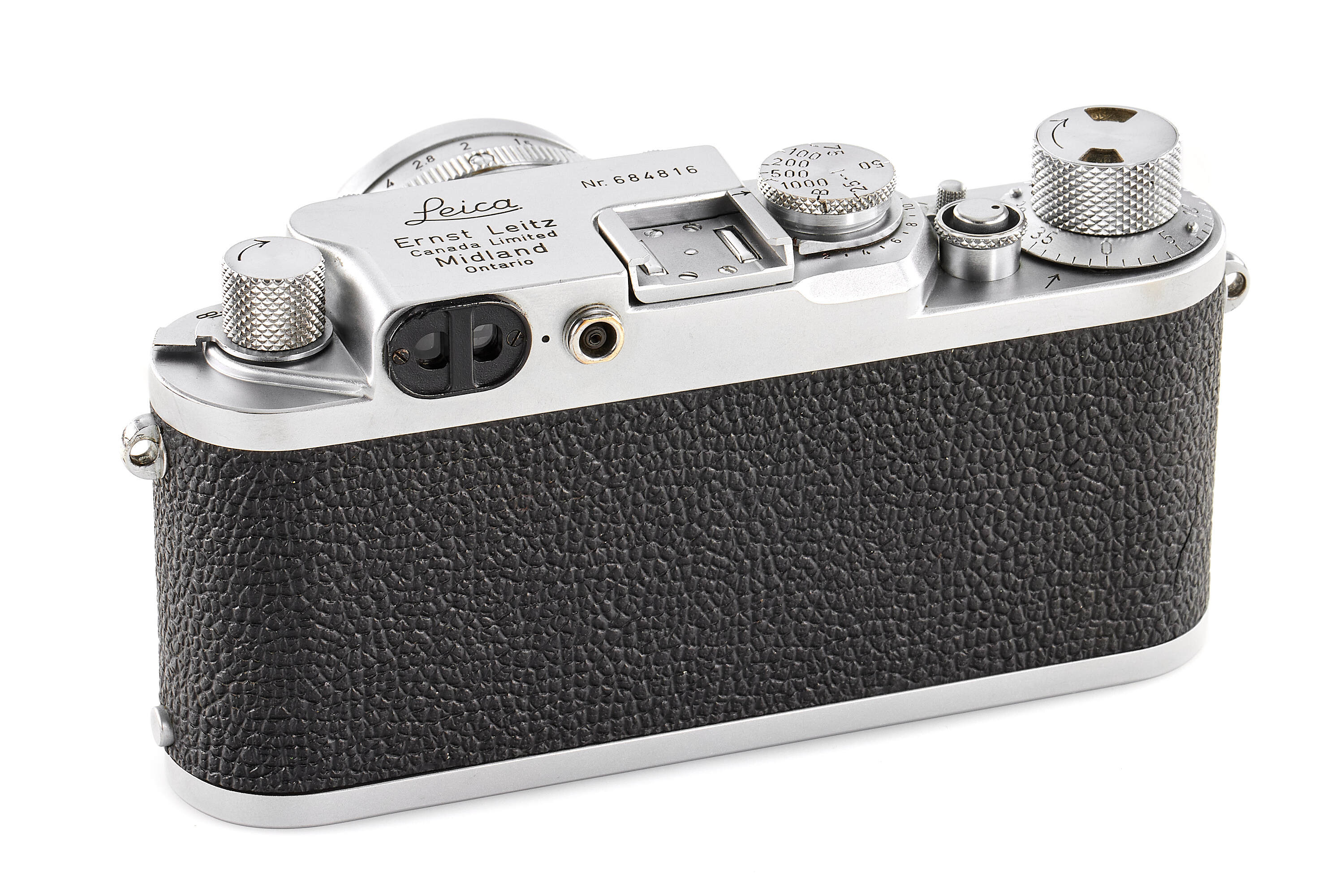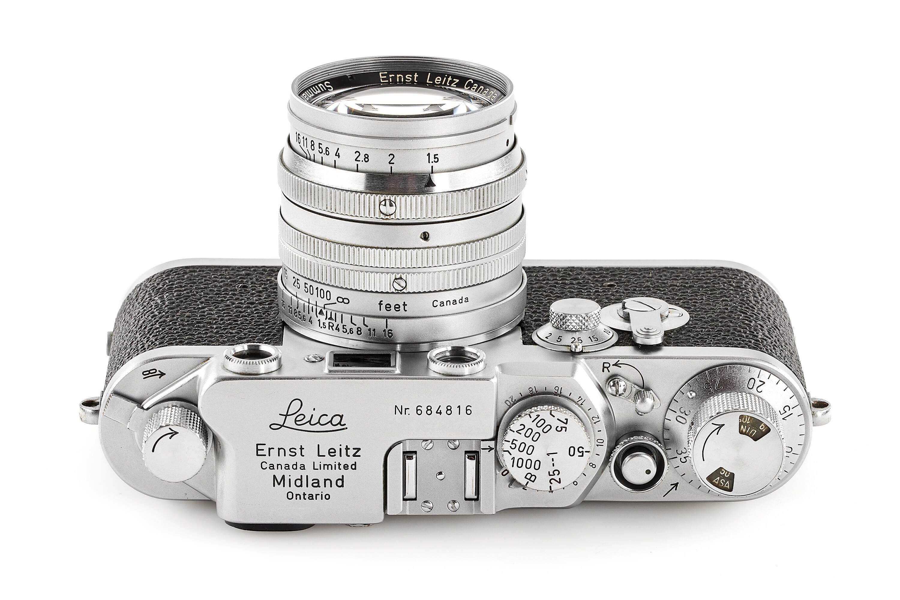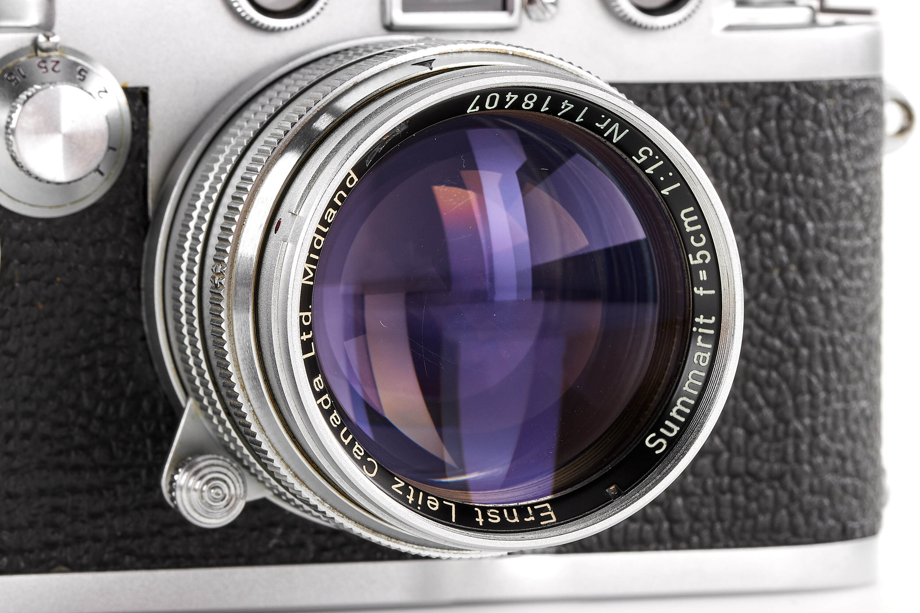 Very rare and beautiful Leica IIIf body in almost mint condition, the top plate is engraved 'Ernst Leitz Canada Limited Midland Ontario', together with a matching Midland Summarit 1.5/5 cm no.1418407, optics only showing a few cleaning marks on the front element, with front lens cap. More than 5.000 units of the Leica IIIf were produced by ELCAN, but only about 200 specimens did carry the Canadian engraving, very hard to find in this nice condition.