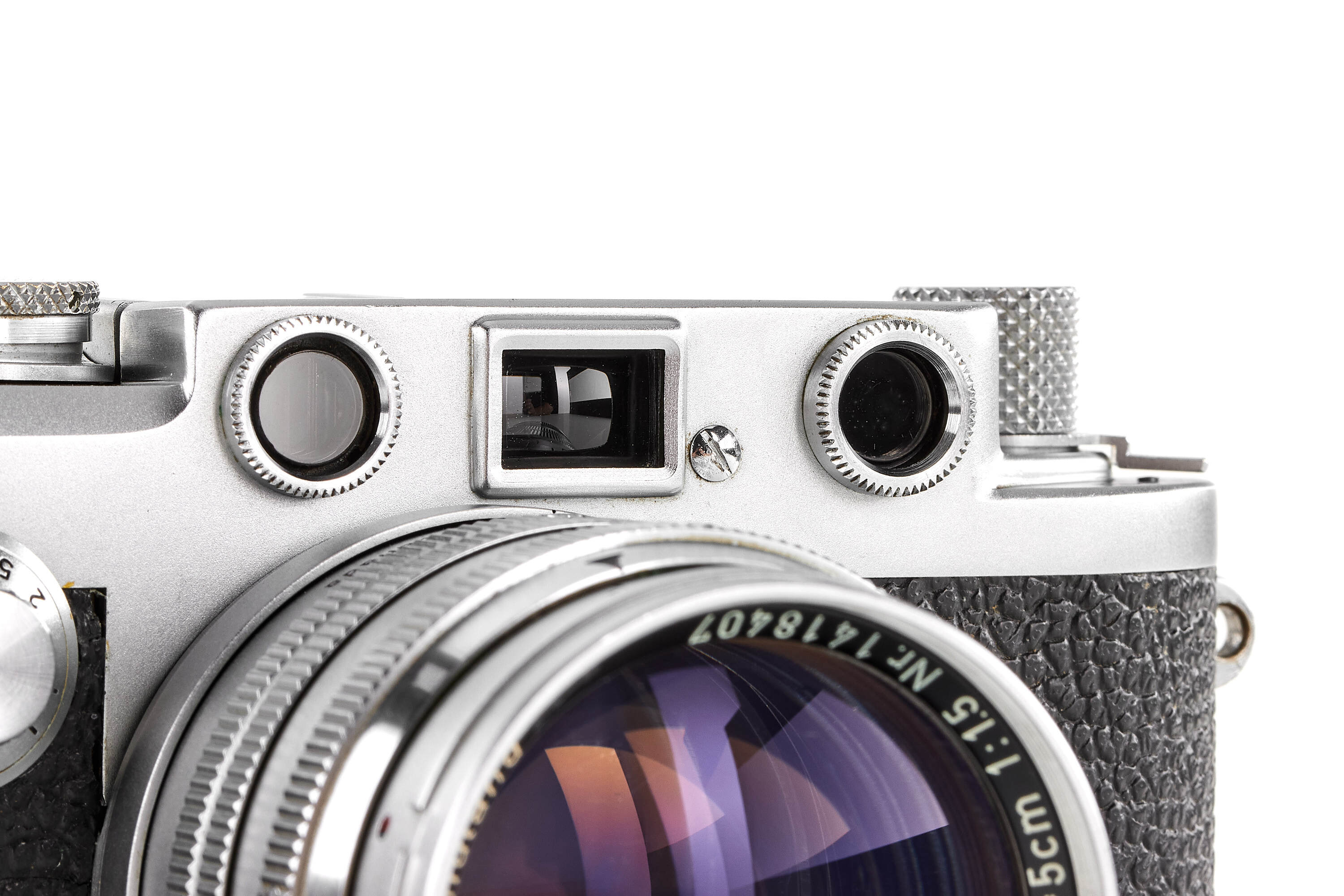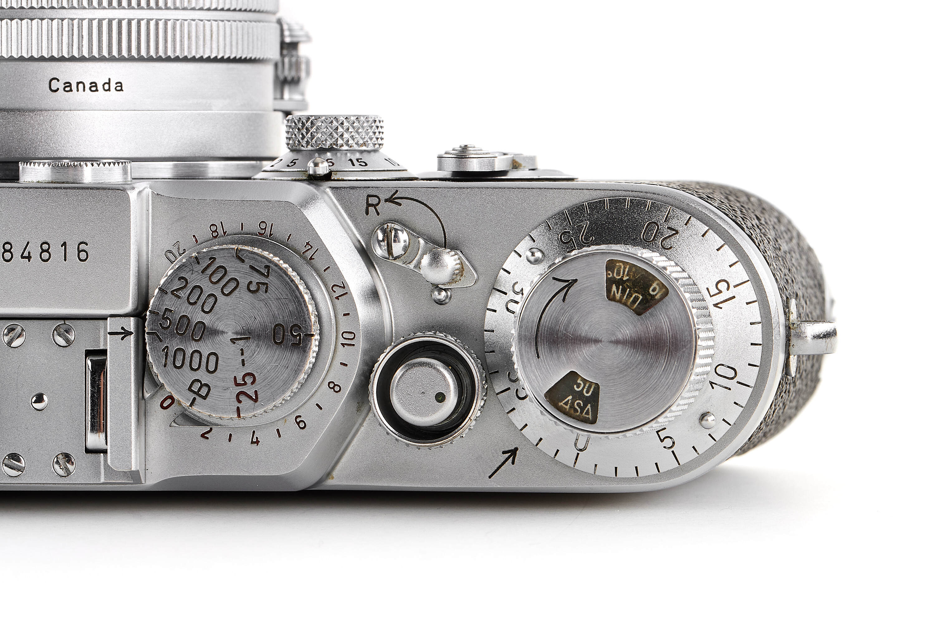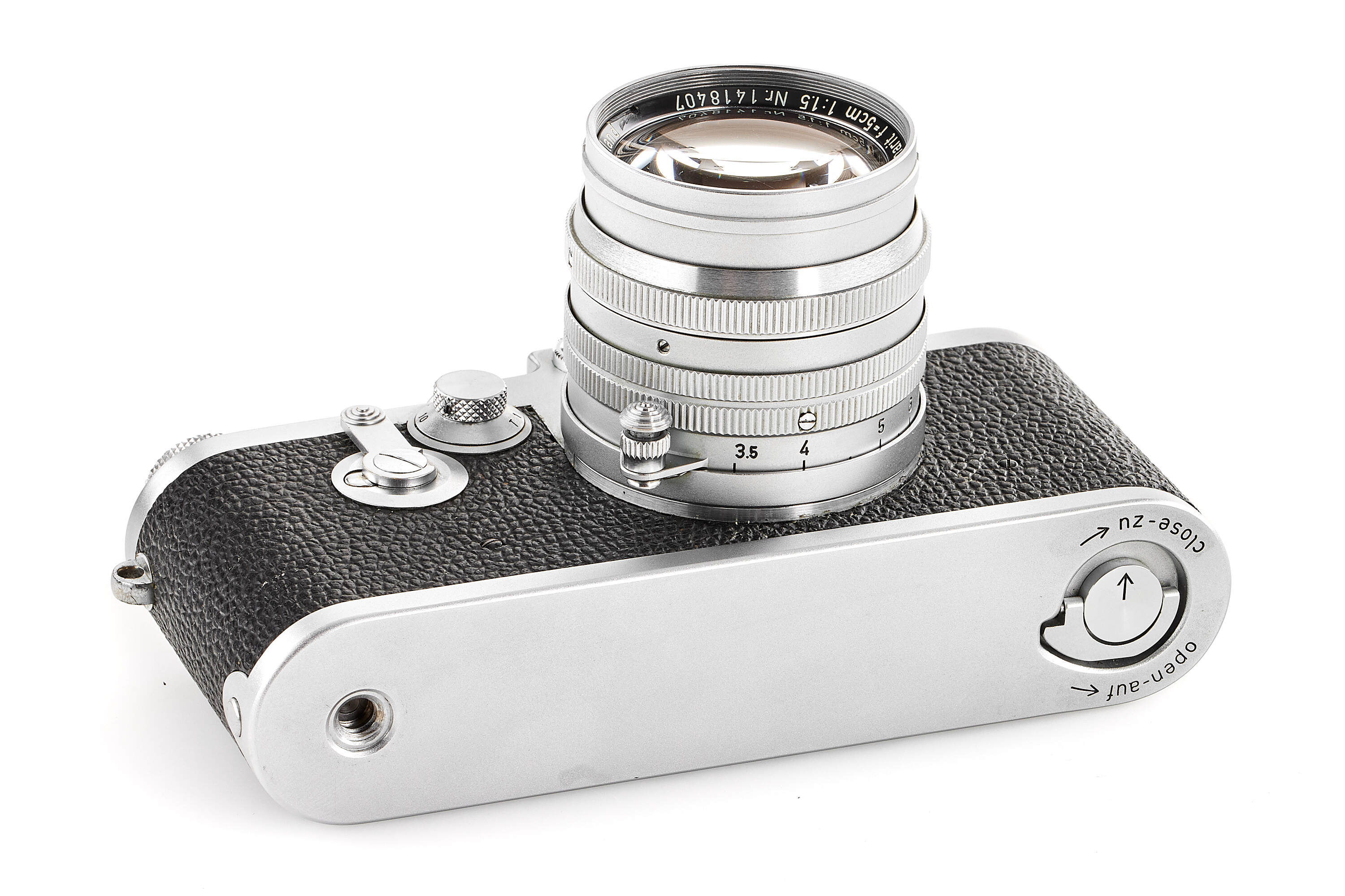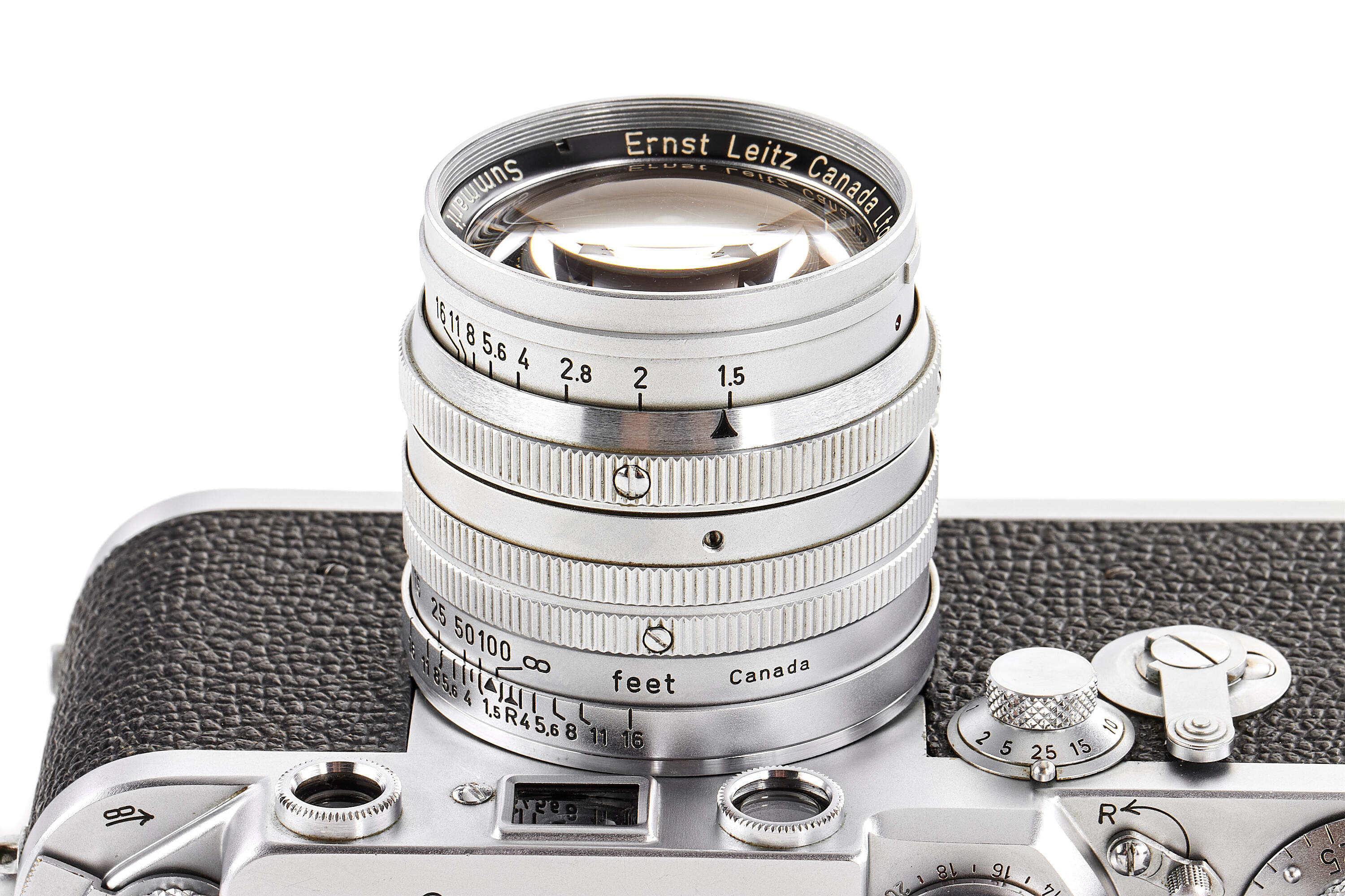 Very rare and beautiful Leica IIIf body in almost mint condition, the top plate is engraved 'Ernst Leitz Canada Limited Midland Ontario', together with a matching Midland Summarit 1.5/5 cm no.1418407, optics only showing a few cleaning marks on the front element, with front lens cap. More than 5.000 units of the Leica IIIf were produced by ELCAN, but only about 200 specimens did carry the Canadian engraving, very hard to find in this nice condition.