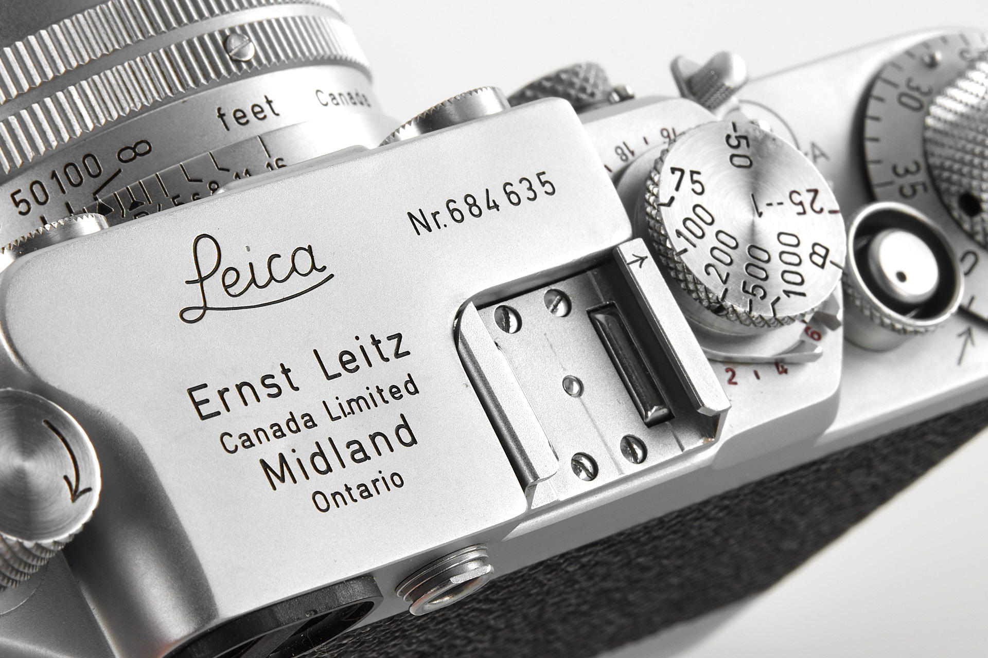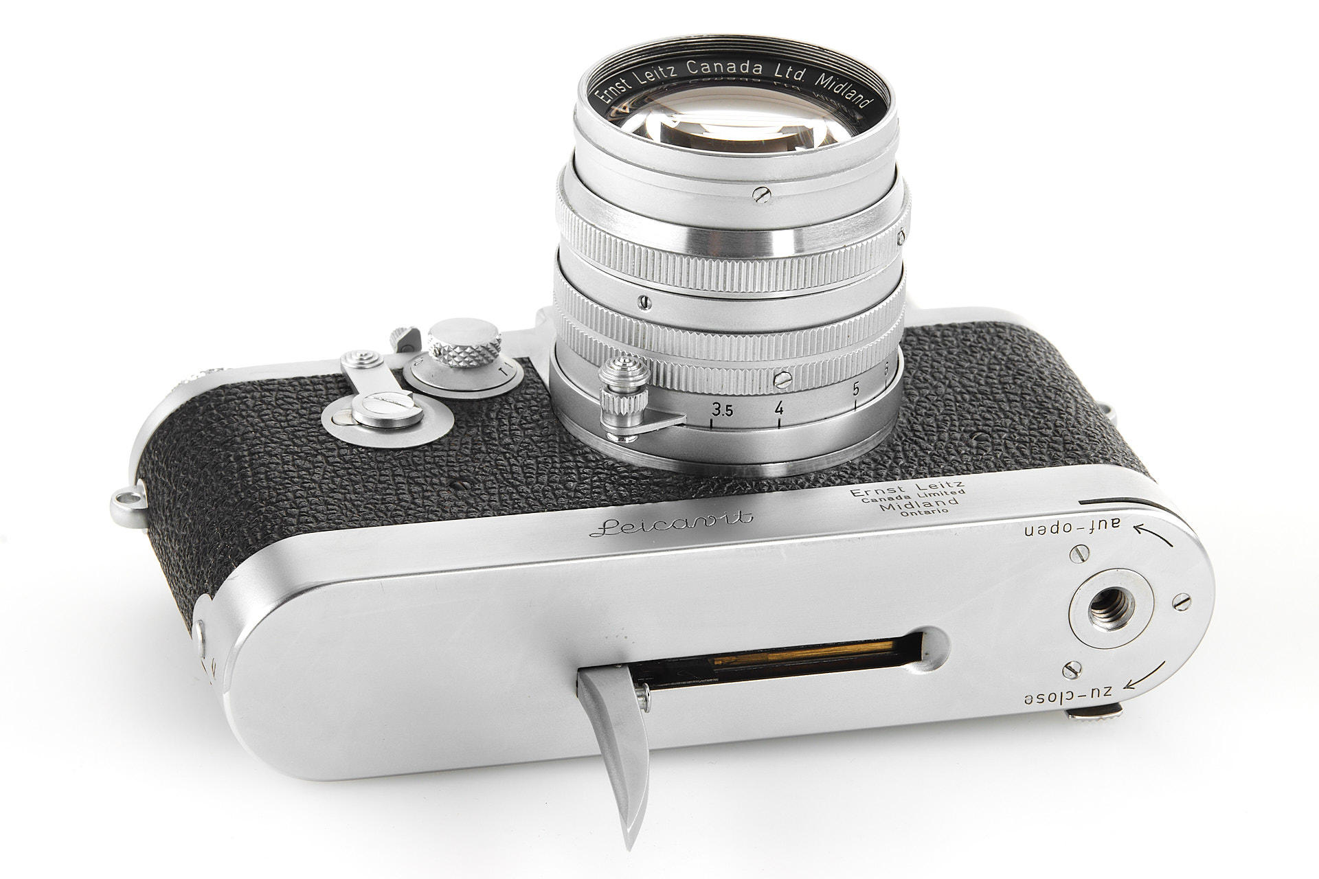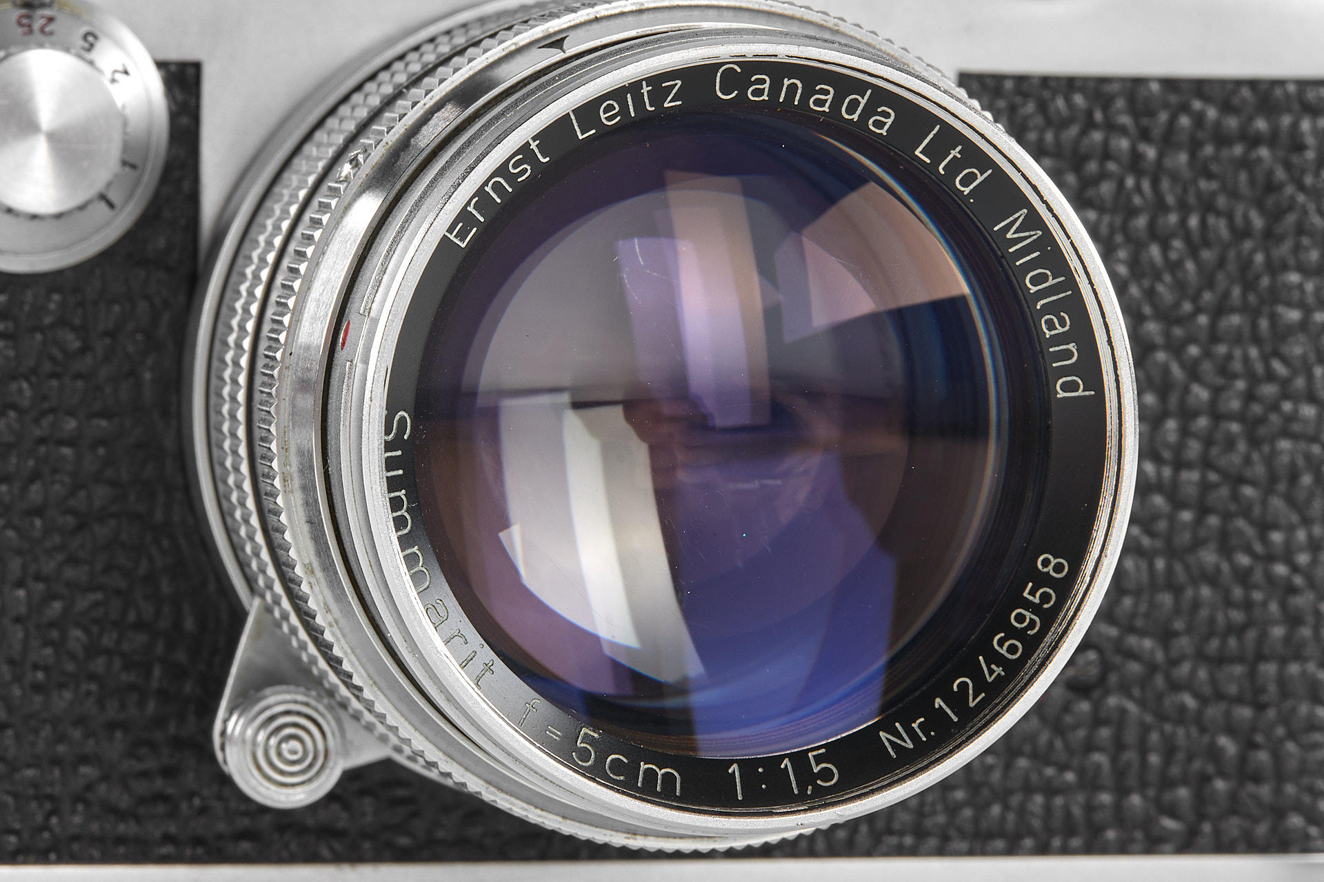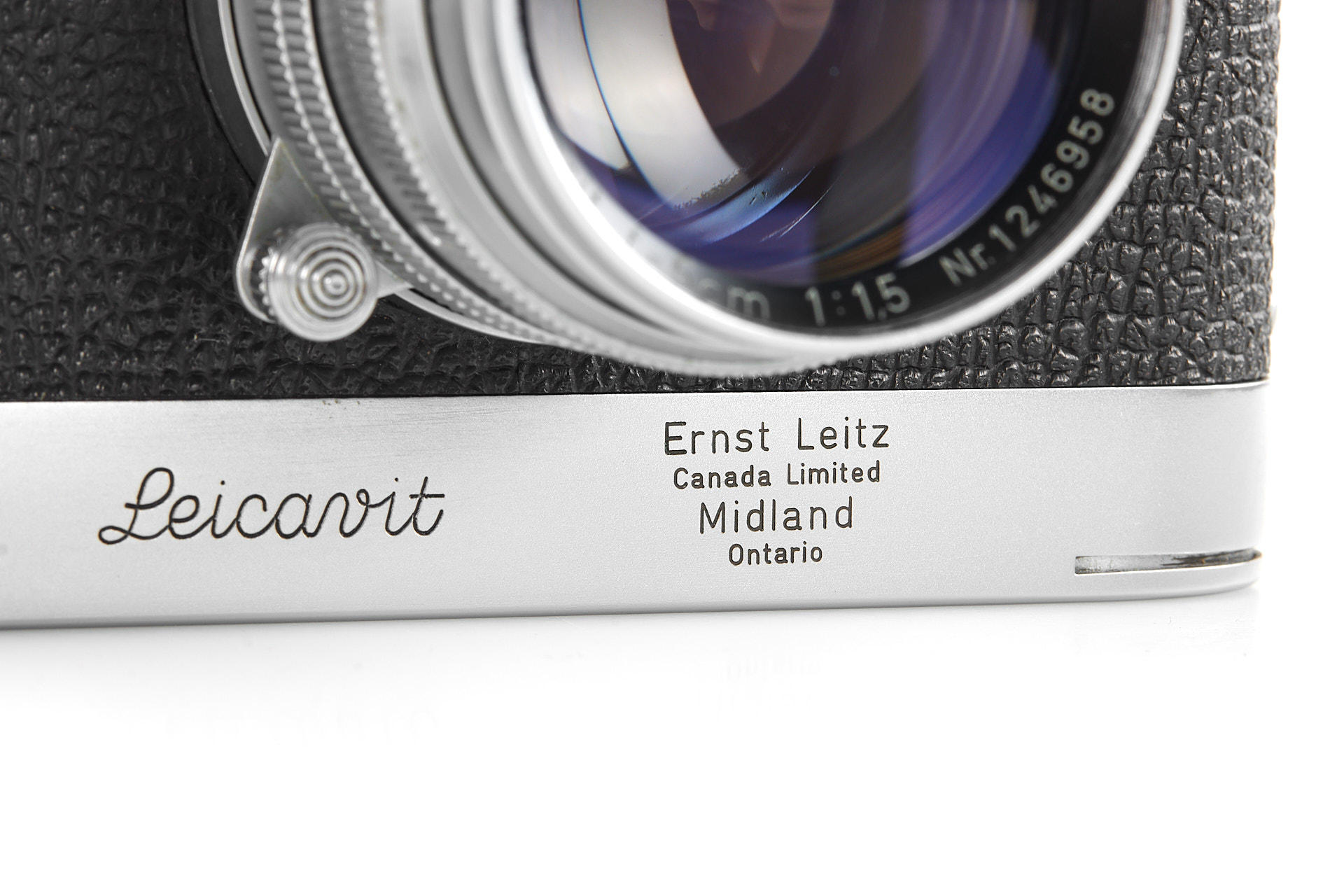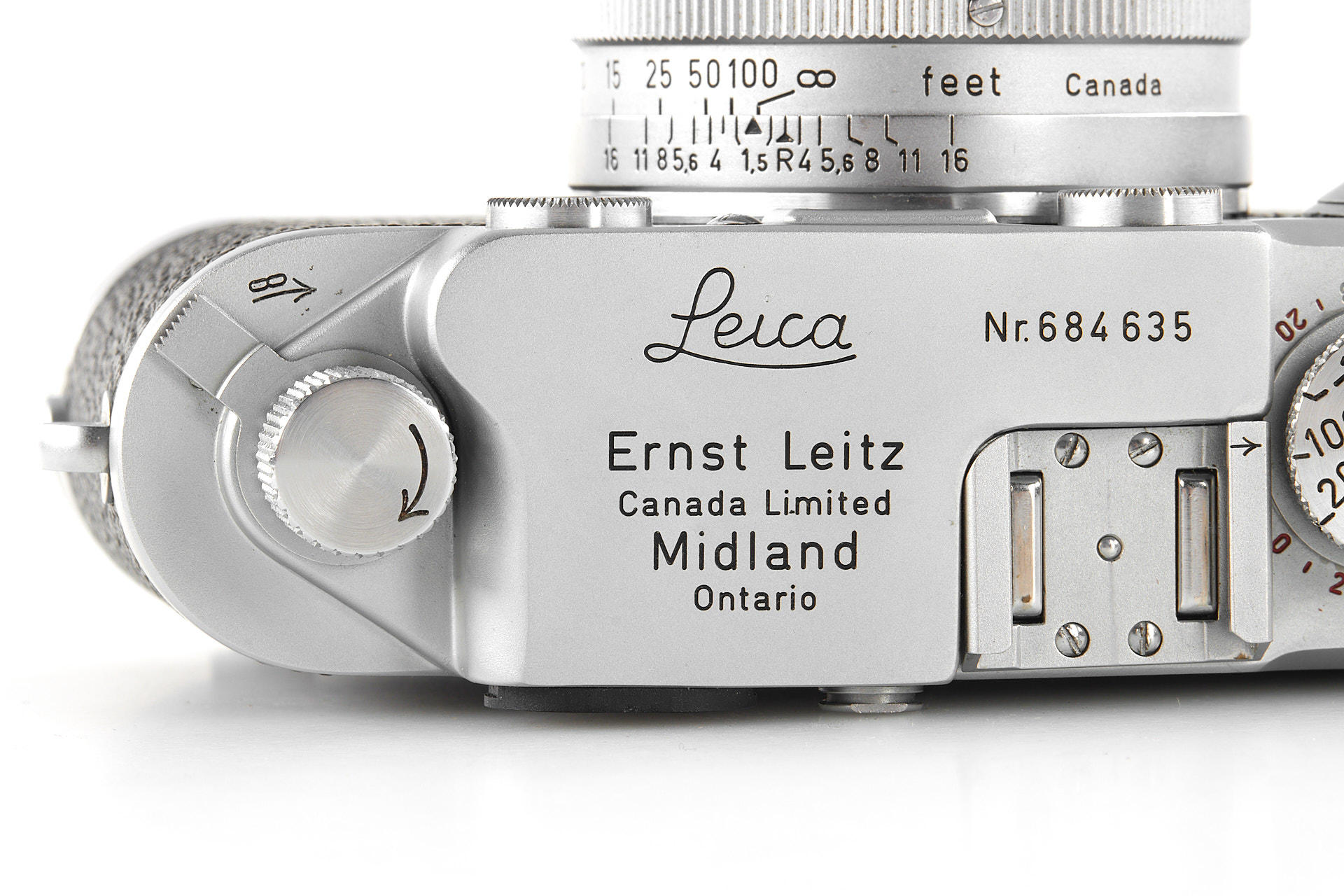Very rare Leica IIIf body in near-mint, original condition, top plate engraved “Ernst Leitz Canada Limited Midland Ontario“, with Midland Summarit 1.5/5 cm no. 1246958 (minimal cleaning marks, cap). Including matching, very rare Midland Leicavit (also in near-mint condition). In total, at the Canadian plant, more than 5.000 units of the Leica IIIf were produced, but only about 200 specimens carry the “Canada“ engraving. Finding a complete set in this beautiful condition is extremely difficult.