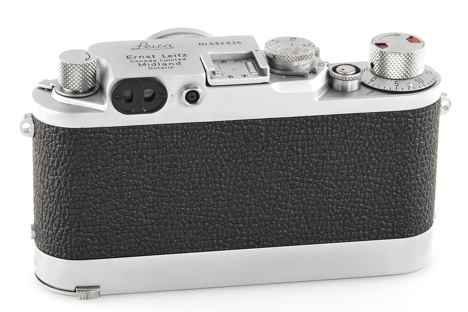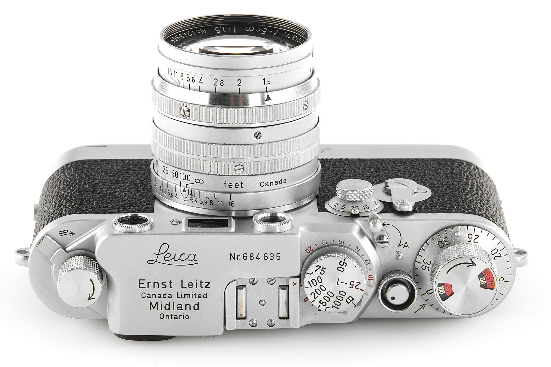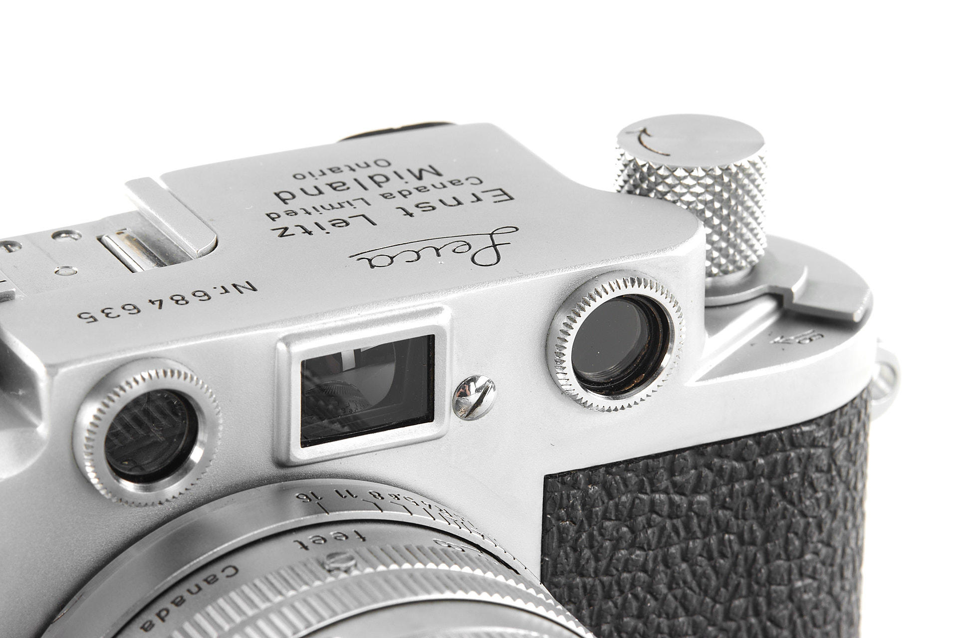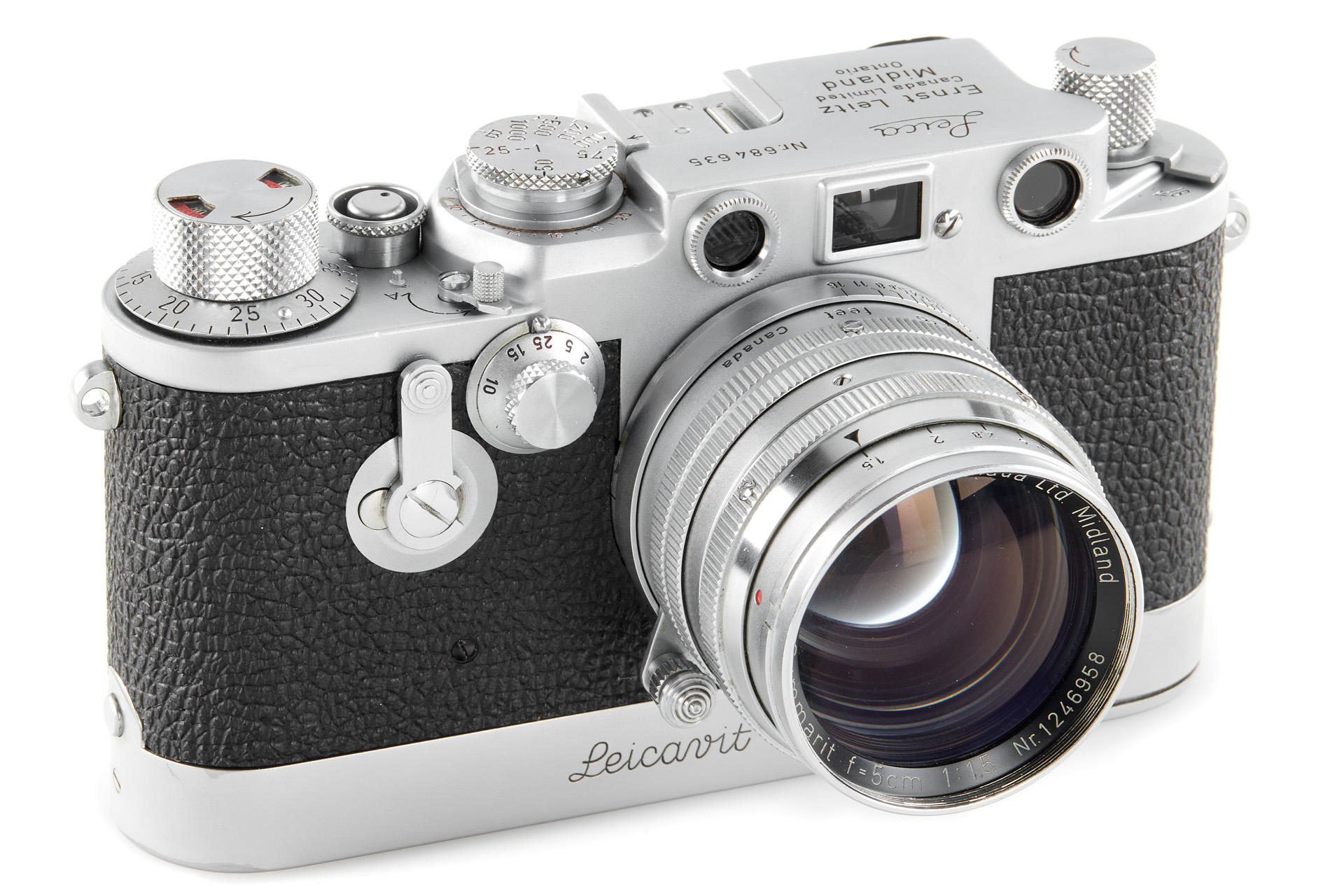 Very rare Leica IIIf body in near-mint, original condition, top plate engraved “Ernst Leitz Canada Limited Midland Ontario“, with Midland Summarit 1.5/5 cm no. 1246958 (minimal cleaning marks, cap). Including matching, very rare Midland Leicavit (also in near-mint condition). In total, at the Canadian plant, more than 5.000 units of the Leica IIIf were produced, but only about 200 specimens carry the “Canada“ engraving. Finding a complete set in this beautiful condition is extremely difficult.