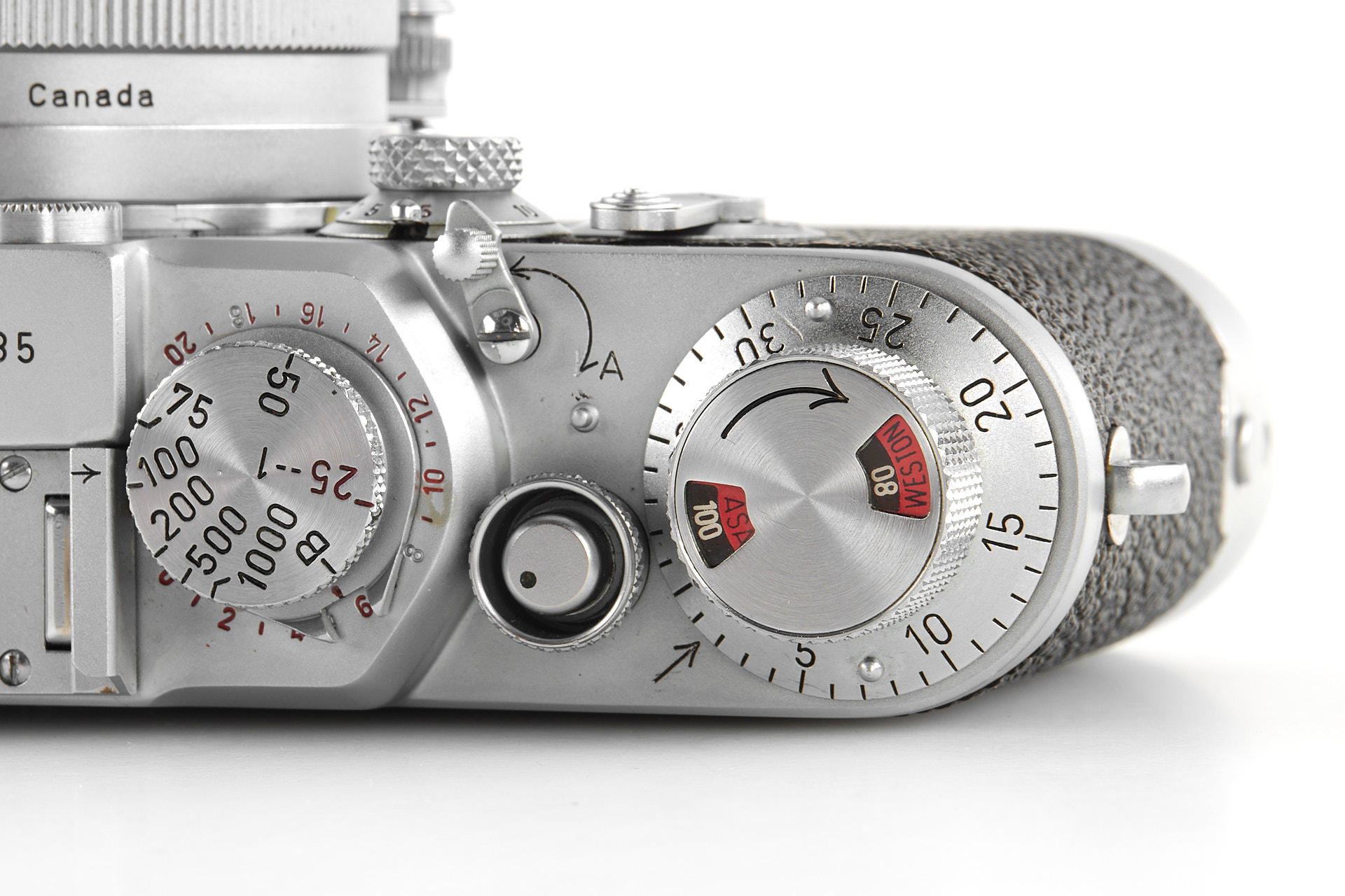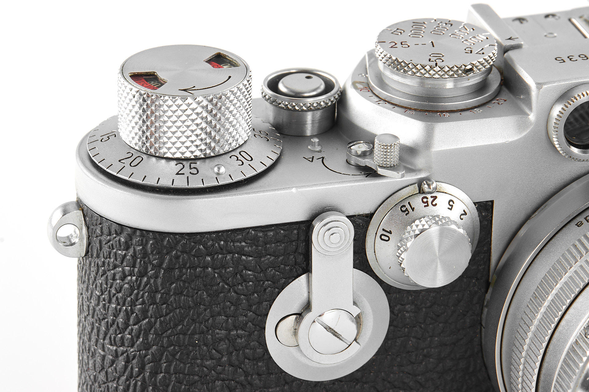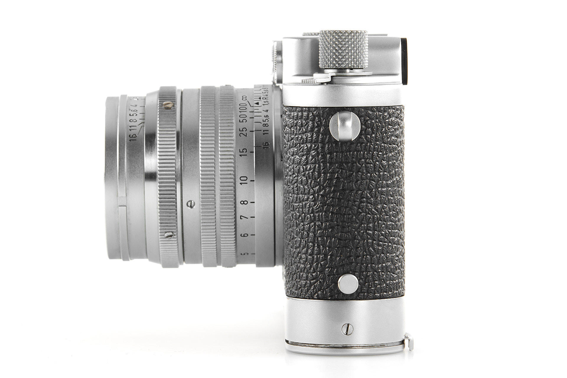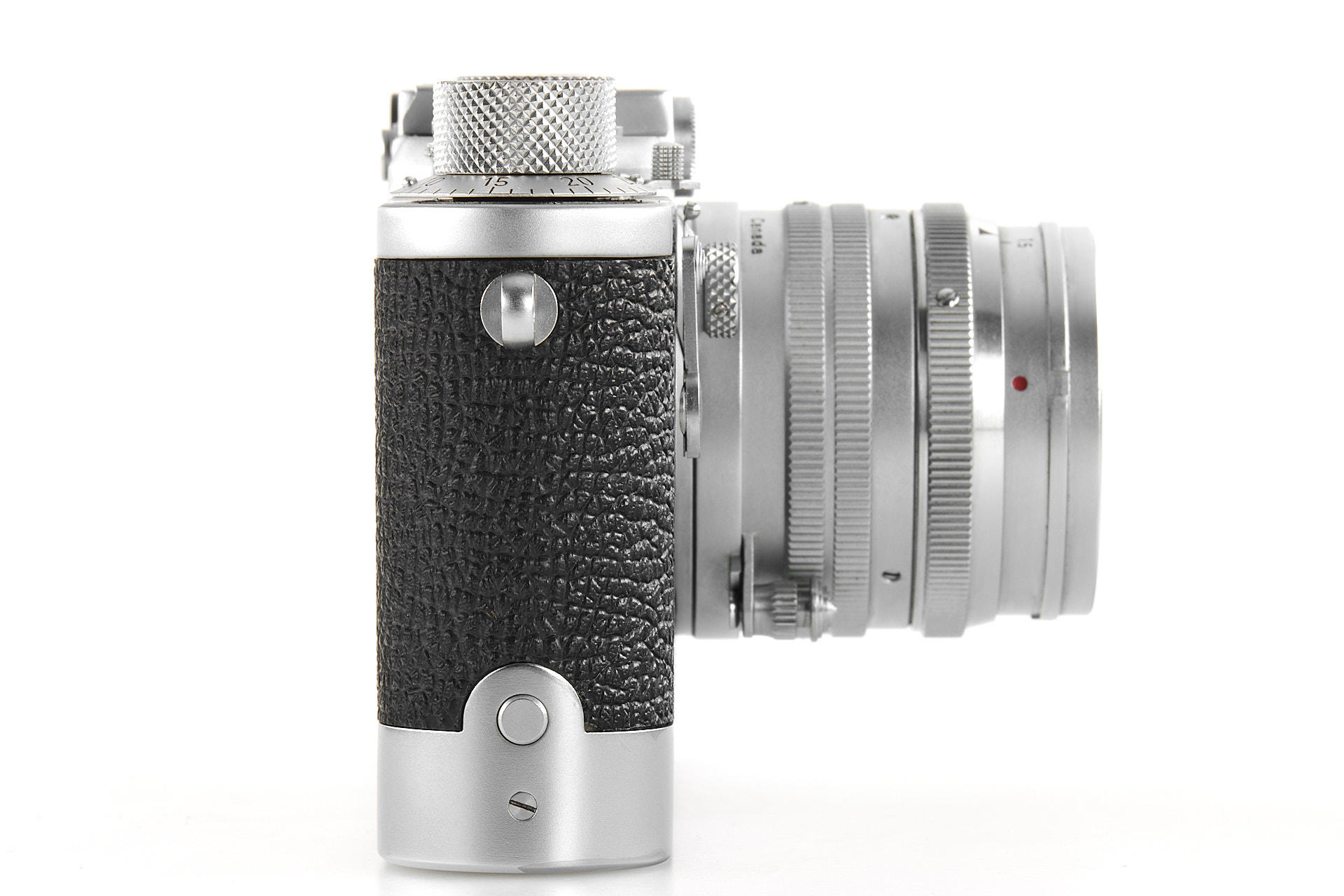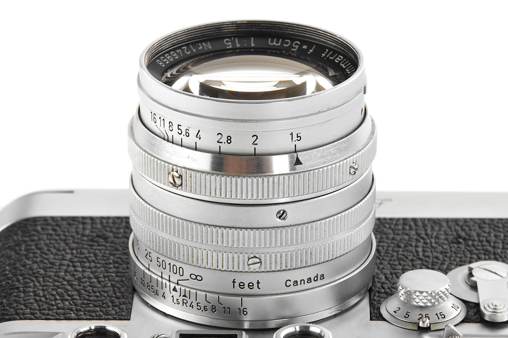 Very rare Leica IIIf body in near-mint, original condition, top plate engraved “Ernst Leitz Canada Limited Midland Ontario“, with Midland Summarit 1.5/5 cm no. 1246958 (minimal cleaning marks, cap). Including matching, very rare Midland Leicavit (also in near-mint condition). In total, at the Canadian plant, more than 5.000 units of the Leica IIIf were produced, but only about 200 specimens carry the “Canada“ engraving. Finding a complete set in this beautiful condition is extremely difficult.
