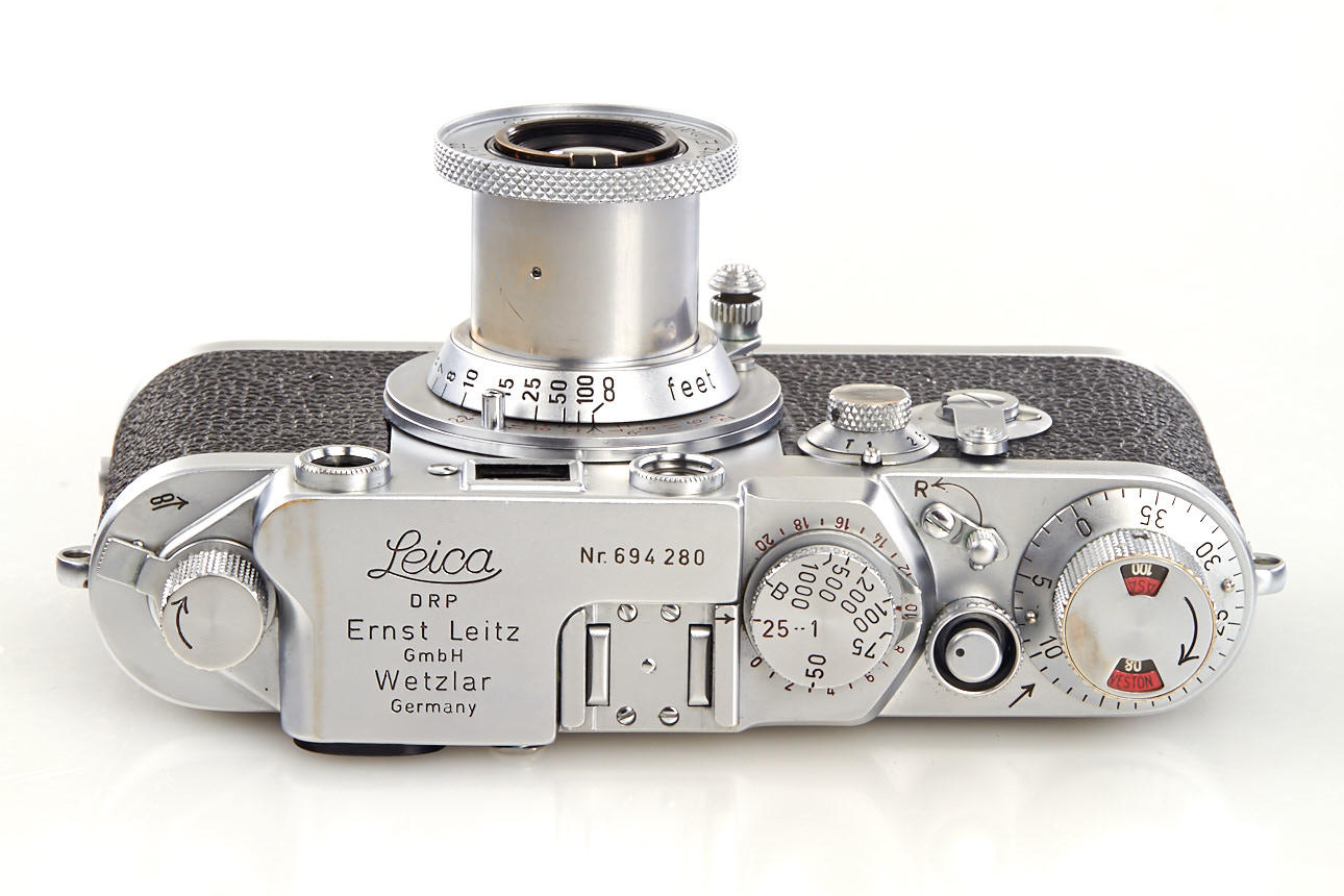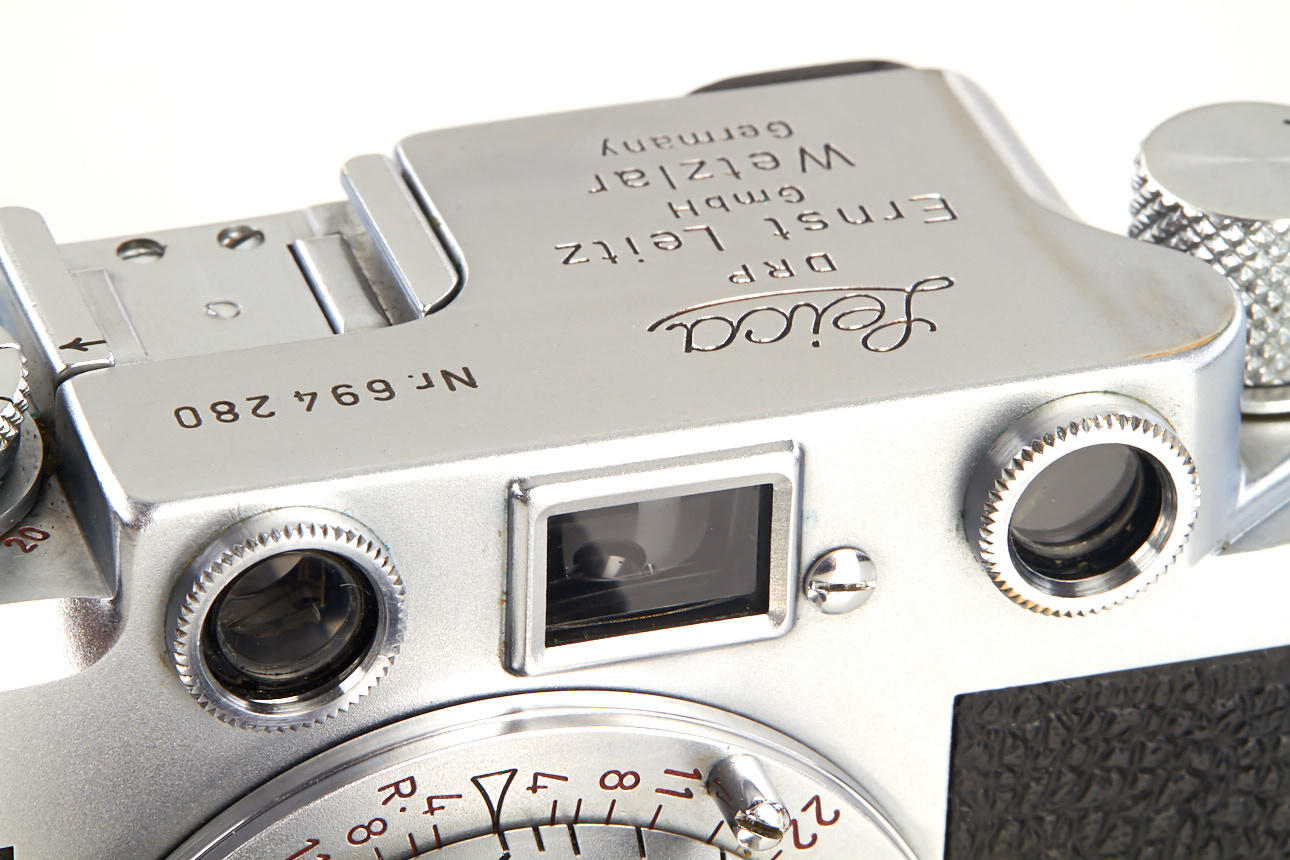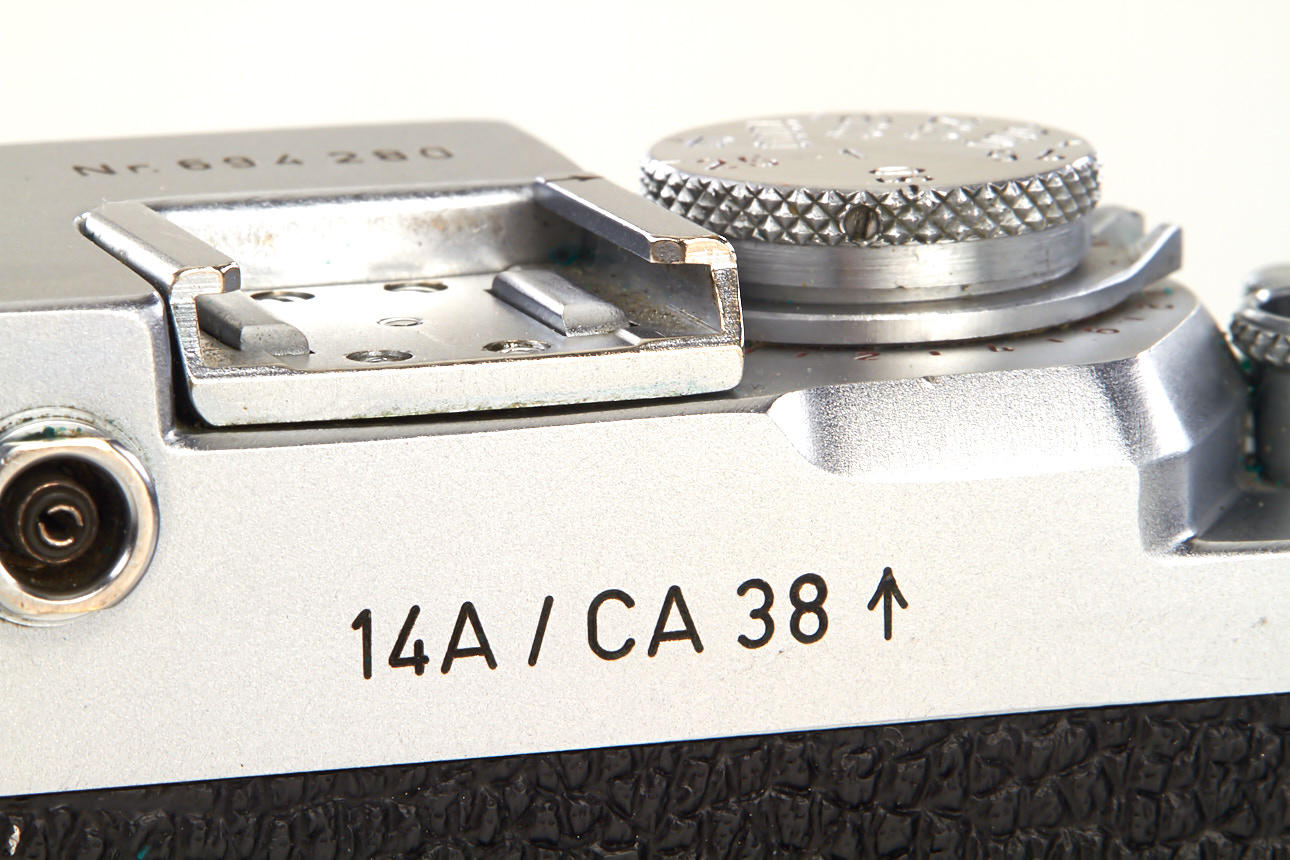 very rare IIIf with military engravings of UK Royal Air Force, special number '14A/CA 38' and arrow mark engraved on top plate, with Elmar 942601 (feet scale) and everready case stamped on top '14A/CA39'