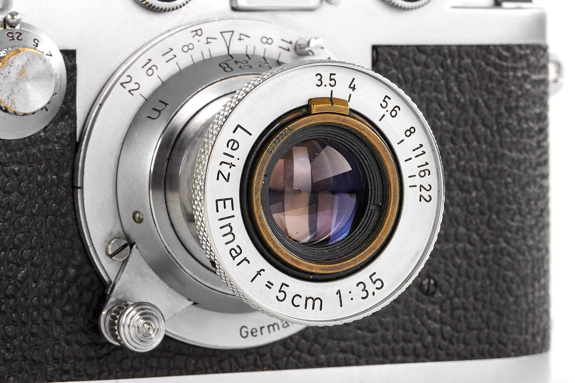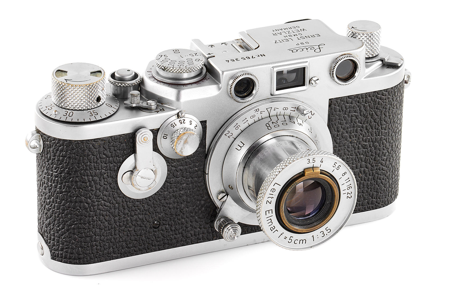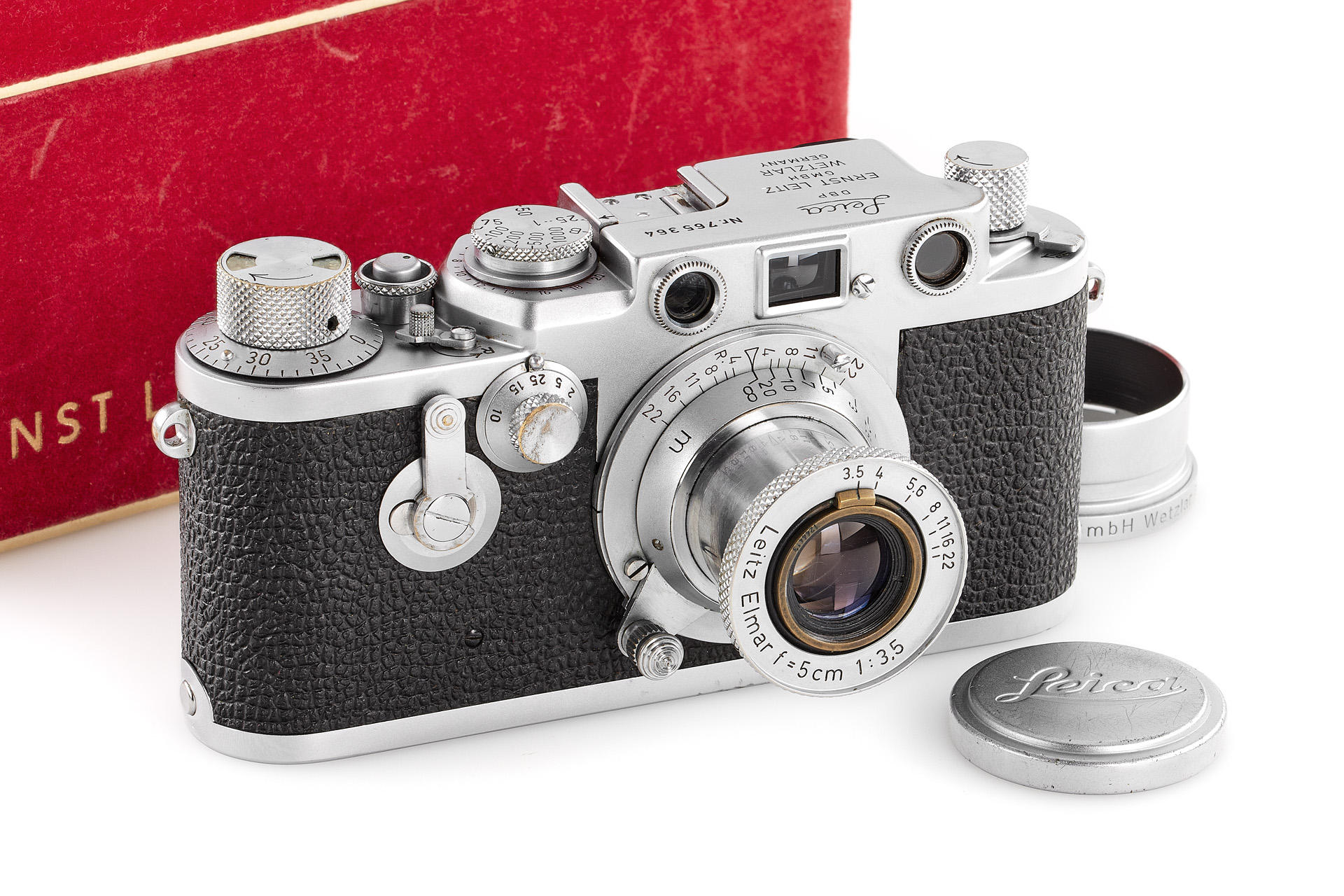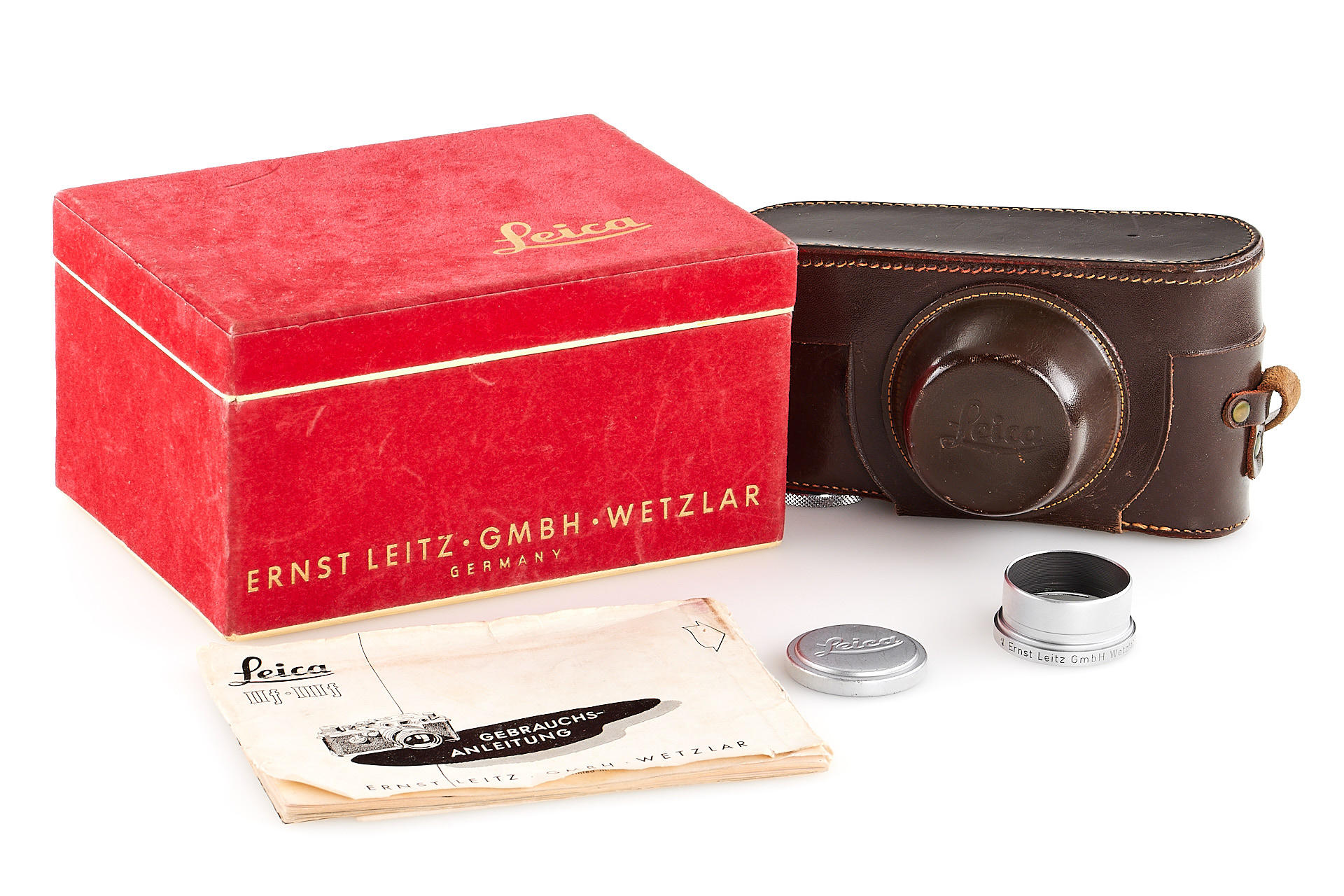 a quite late IIIf in very good condition and working order, with matching Elmar 3.5/5cm no.1244413, optics showing minimal cleaning marks on the front element, with front cap, FISON hood, leather case, German instructions and matching (both serial numbers!) red maker's box, first delivered to Vienna on 14.09.1955