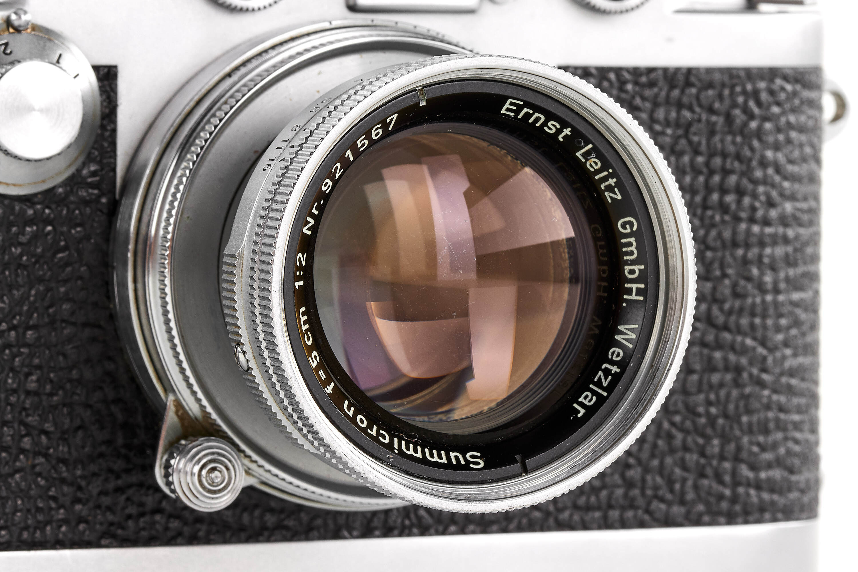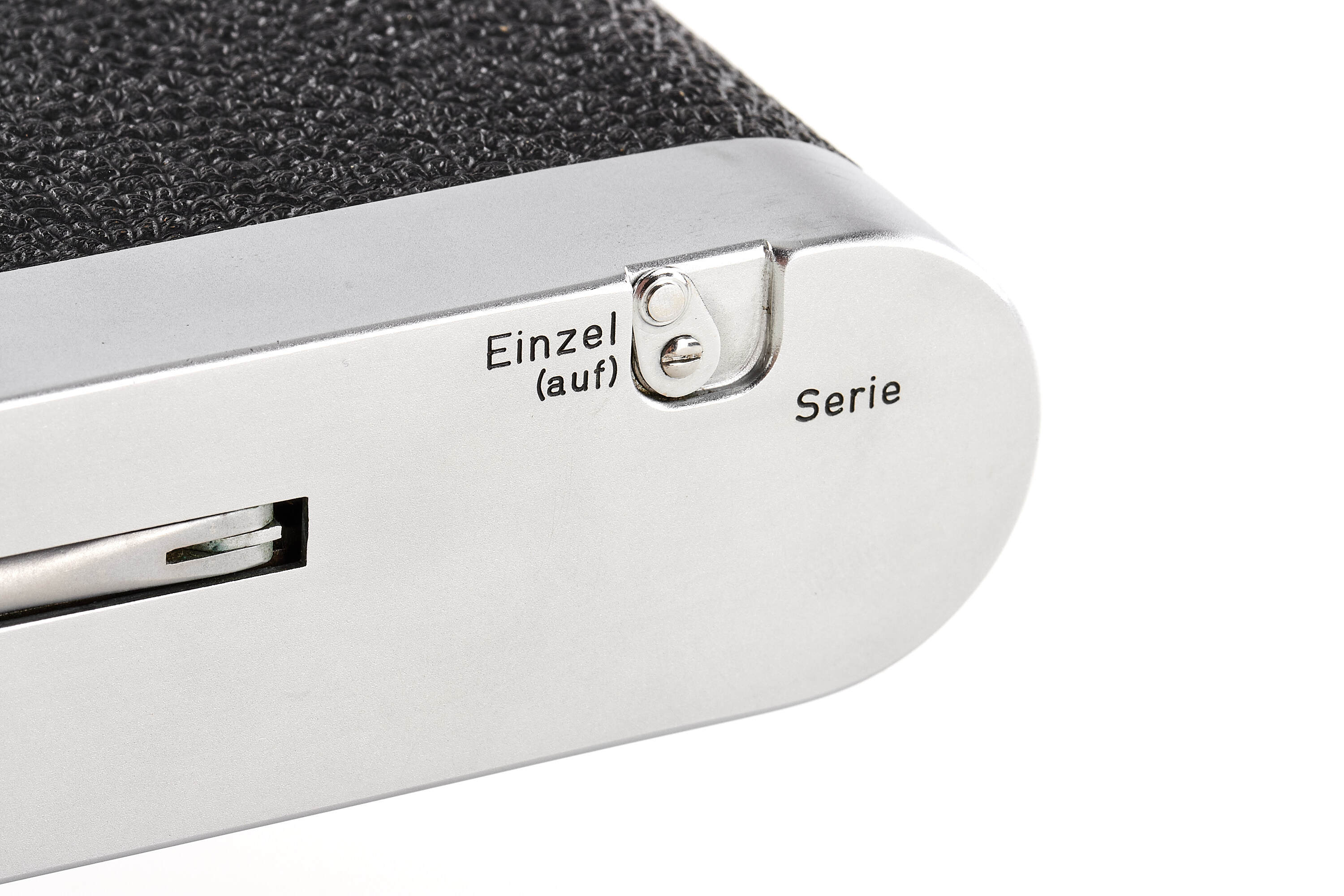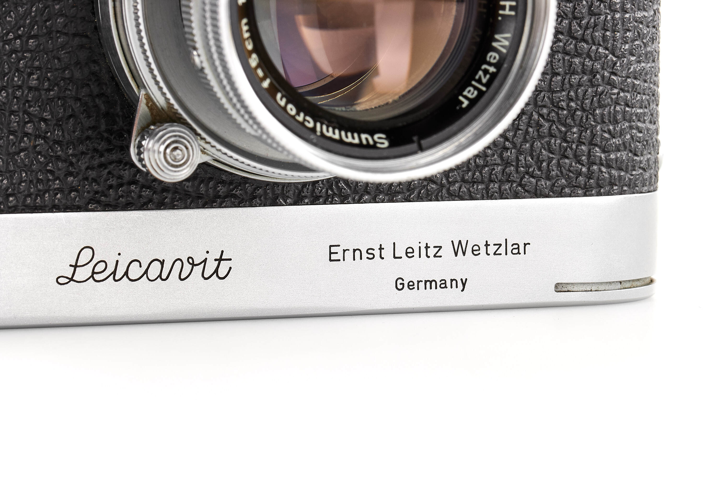Beautiful body in near-mint condition, shutter needs attention, with very rare first version Leicavit for IIIf with switch for 'Einzel/Serie' (single/continuous), only a few of these were produced for testing, together with very early Summicron 2/5cm no.921567, sought-after version with Thorium glass element and typical yellowish coating, good optics only showing a few cleaning marks, with front lens cap.