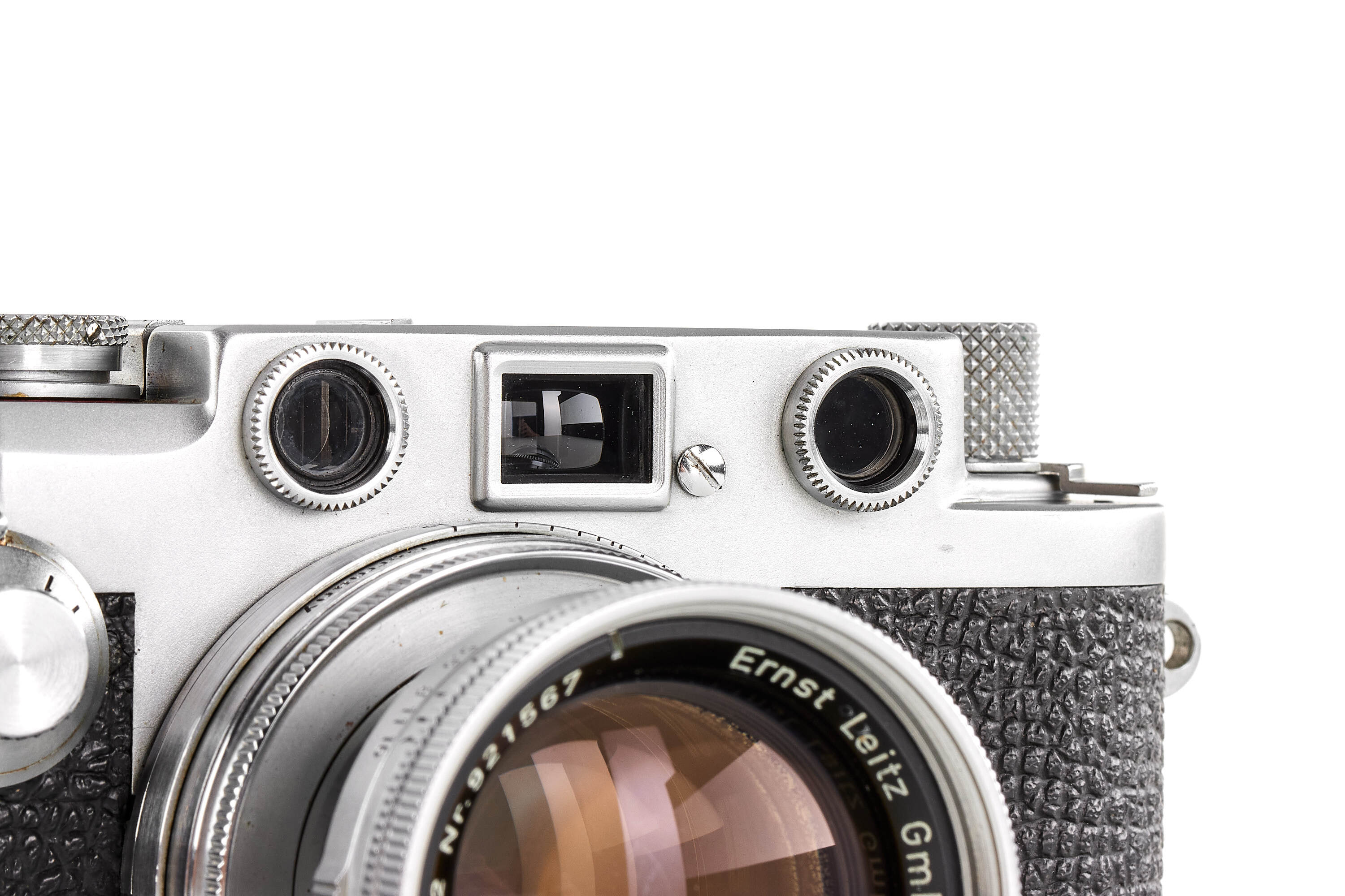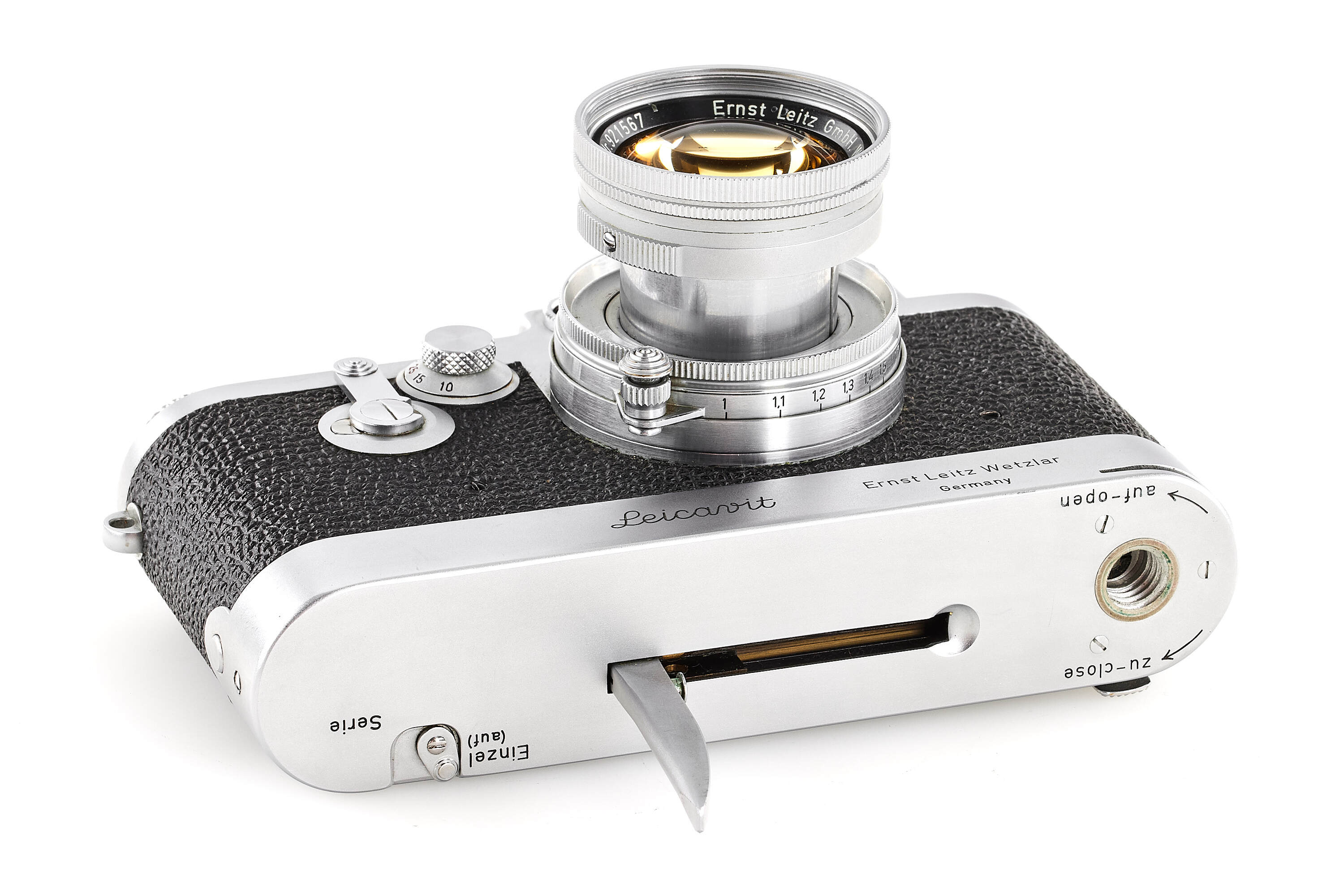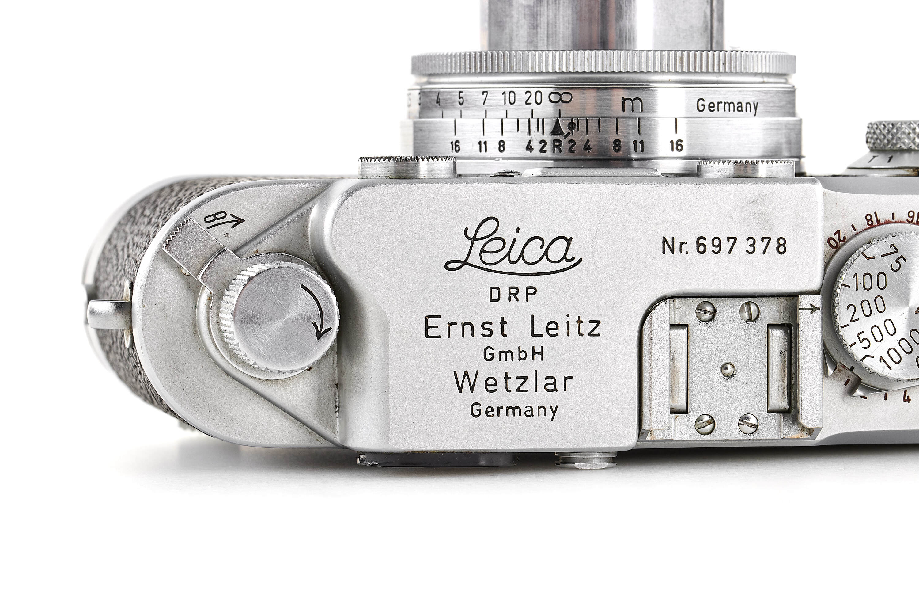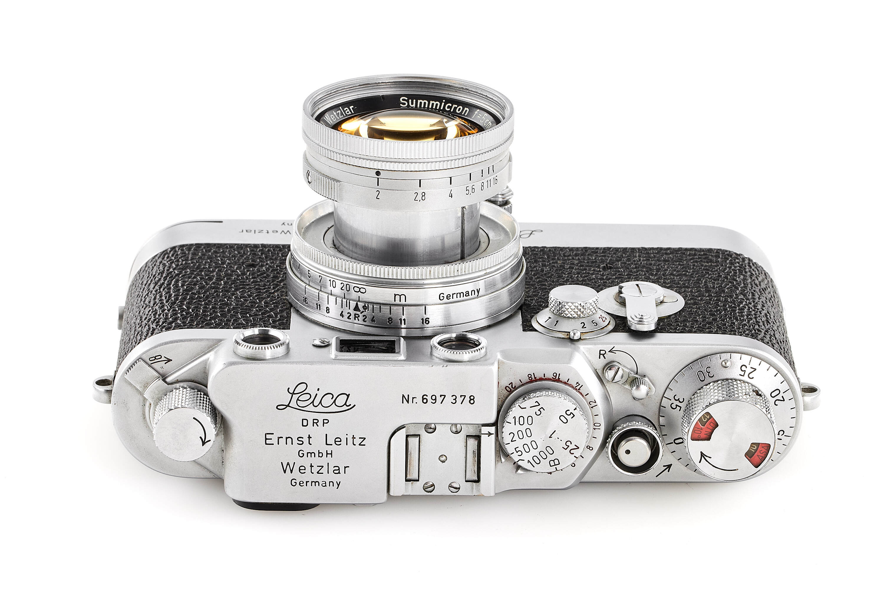 Beautiful body in near-mint condition, shutter needs attention, with very rare first version Leicavit for IIIf with switch for 'Einzel/Serie' (single/continuous), only a few of these were produced for testing, together with very early Summicron 2/5cm no.921567, sought-after version with Thorium glass element and typical yellowish coating, good optics only showing a few cleaning marks, with front lens cap.