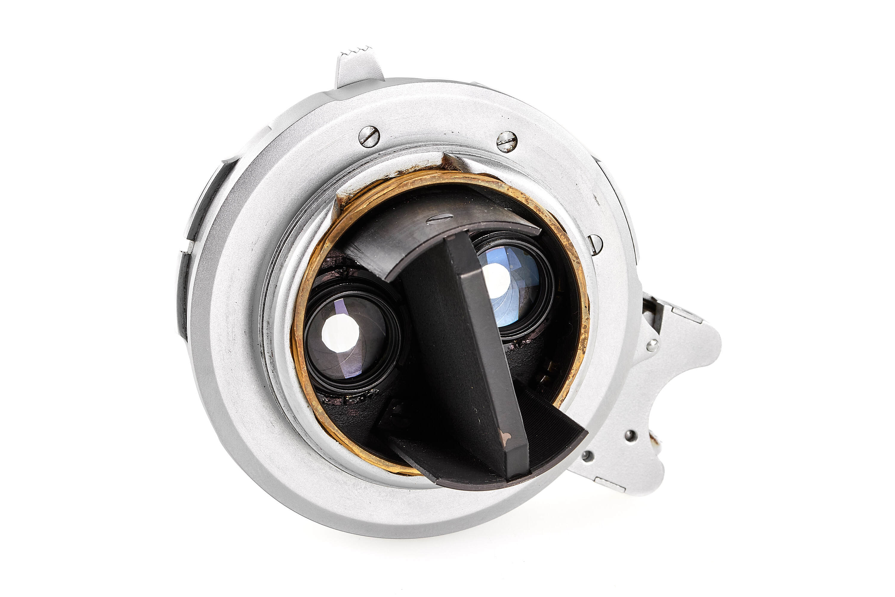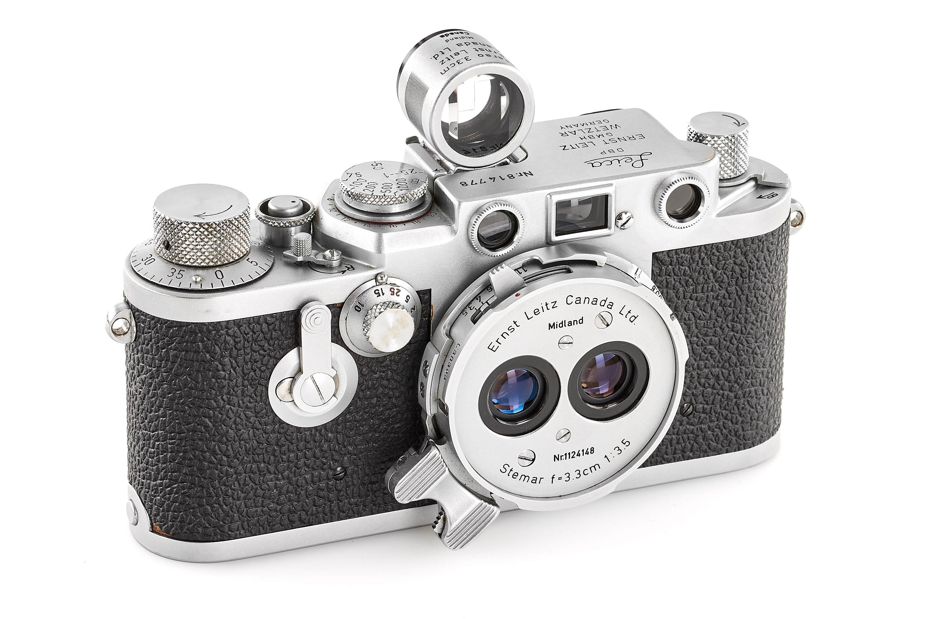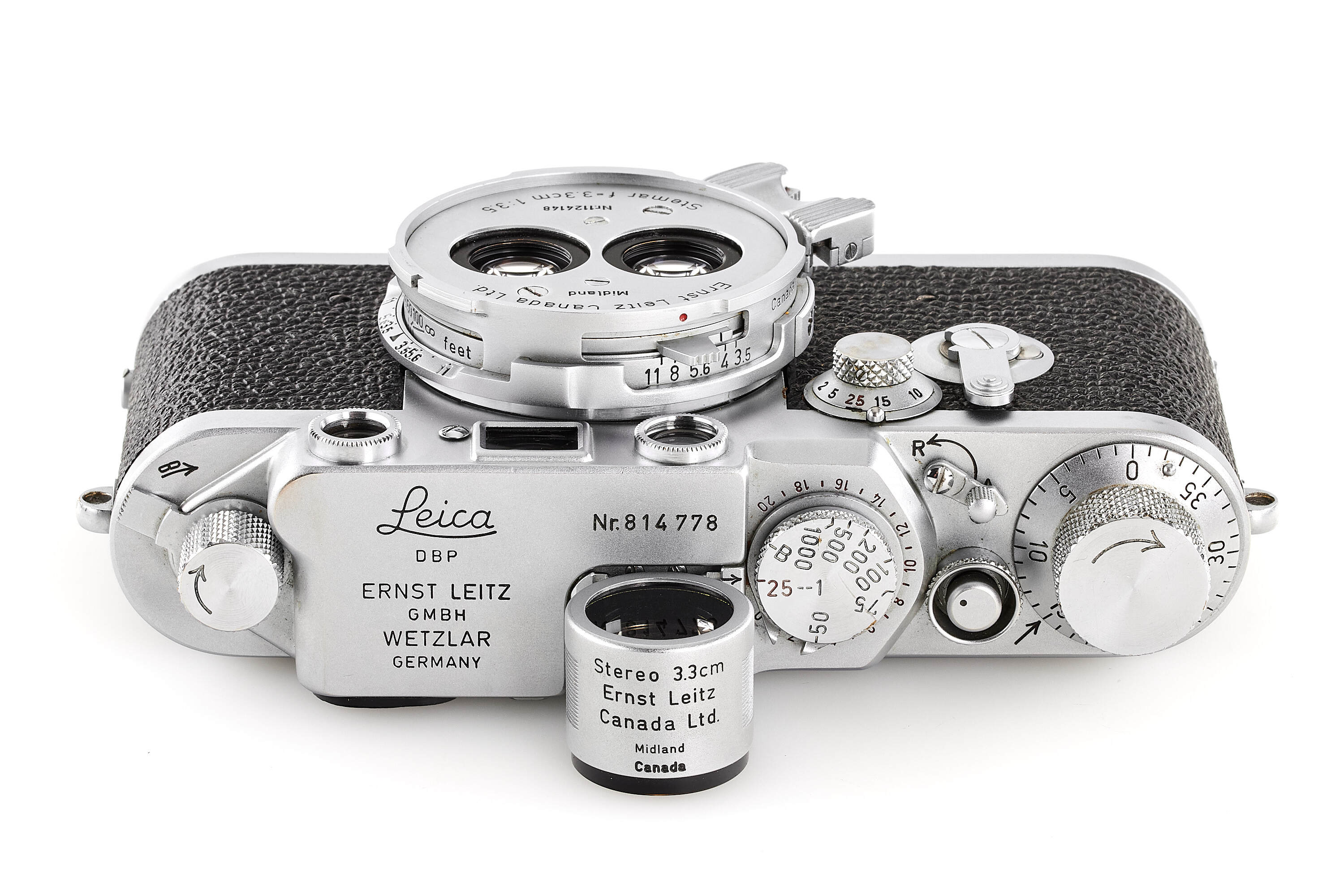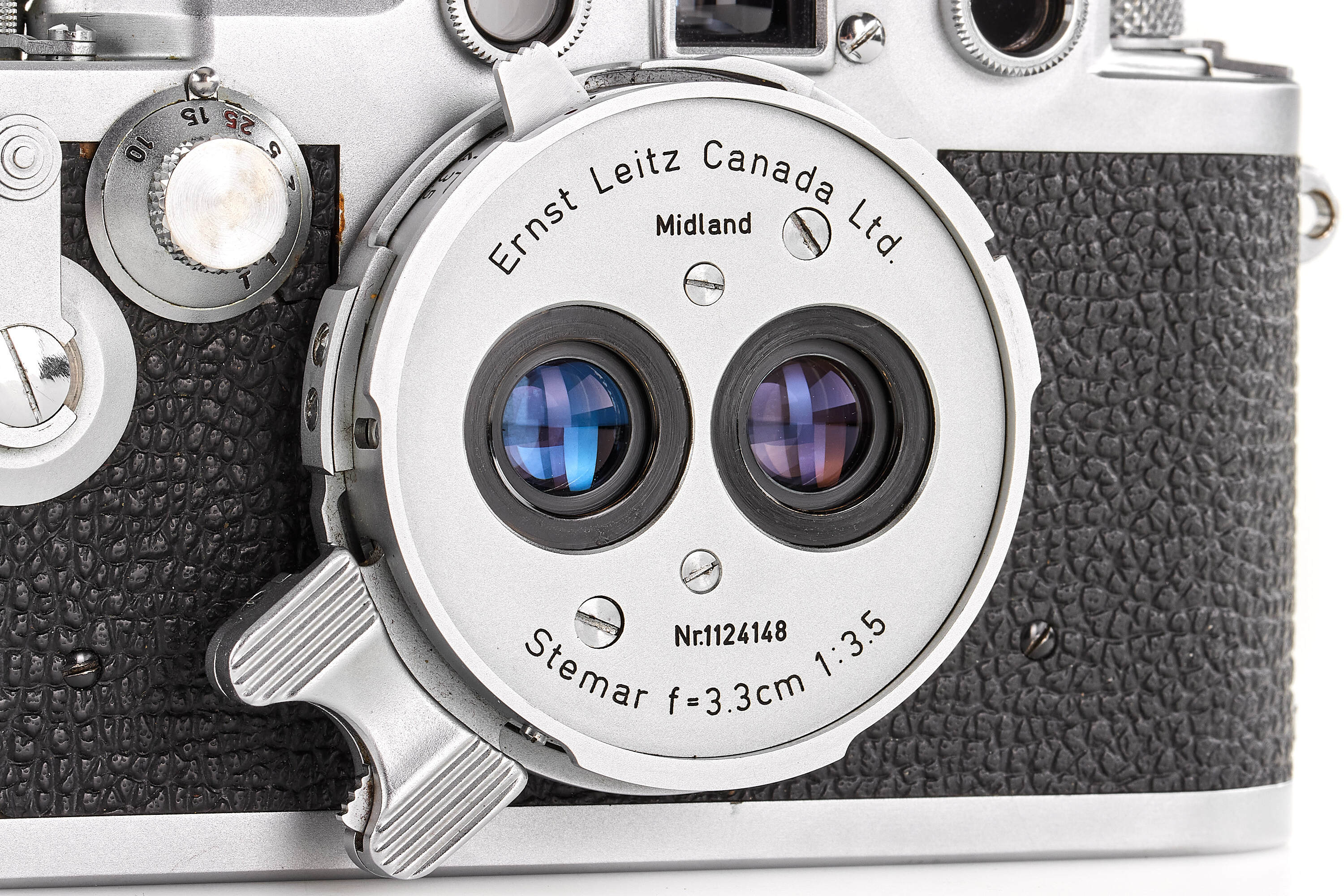 Nice very late Leica IIIf chrome no.814778 in near-mint condition with very rare stereo equipment OIRZO-S including Stemar 3.5/3.3mm made in Canada no.1124148 in beautiful, almost mint condition, good optics, with OIGEO hood, OIMPO beam splitter no.1279 (rear cap) and OIDYO finder, interesting to note the lenses have 6 aperture blades on one side and 12 on the other!