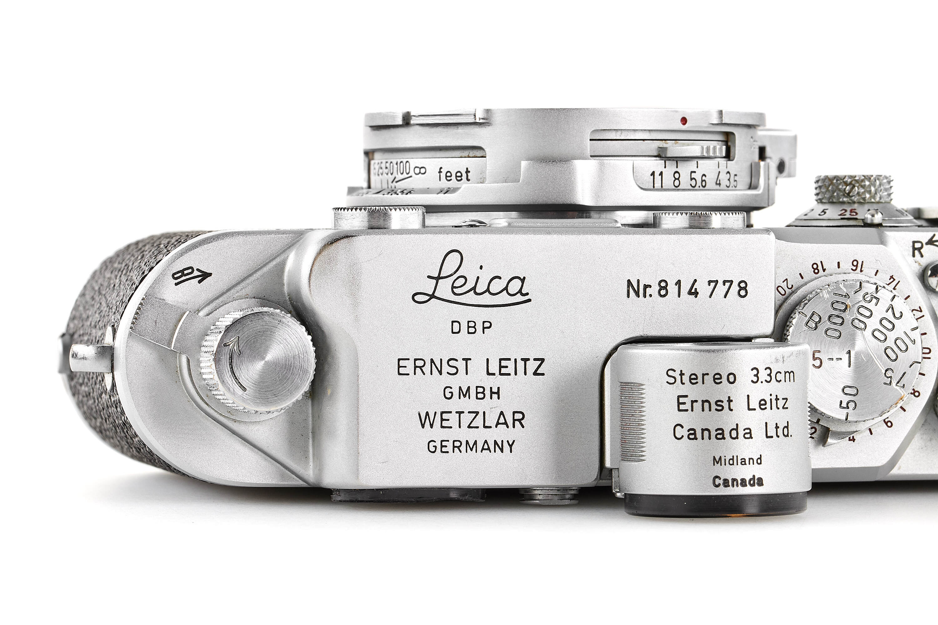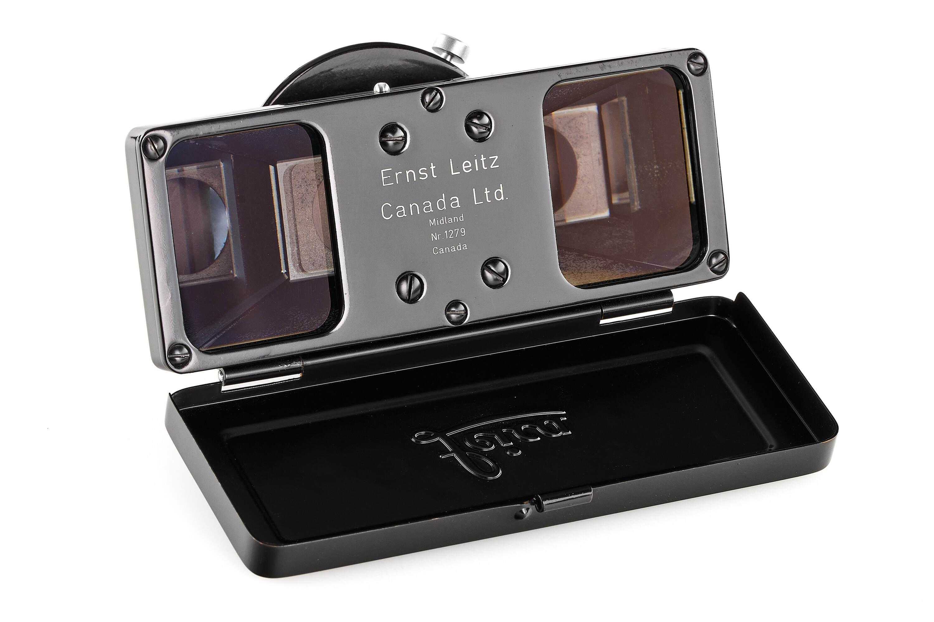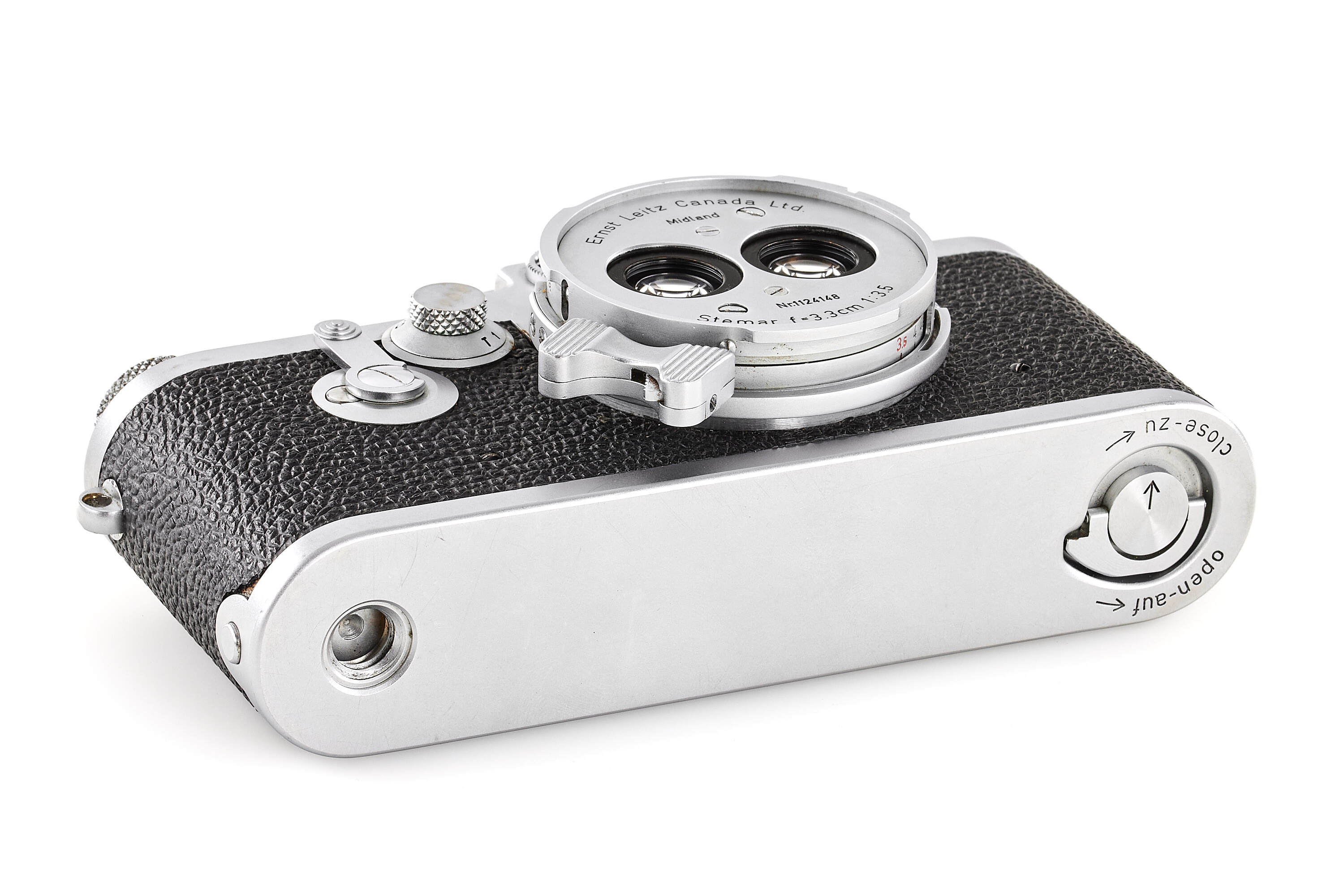 Nice very late Leica IIIf chrome no.814778 in near-mint condition with very rare stereo equipment OIRZO-S including Stemar 3.5/3.3mm made in Canada no.1124148 in beautiful, almost mint condition, good optics, with OIGEO hood, OIMPO beam splitter no.1279 (rear cap) and OIDYO finder, interesting to note the lenses have 6 aperture blades on one side and 12 on the other!