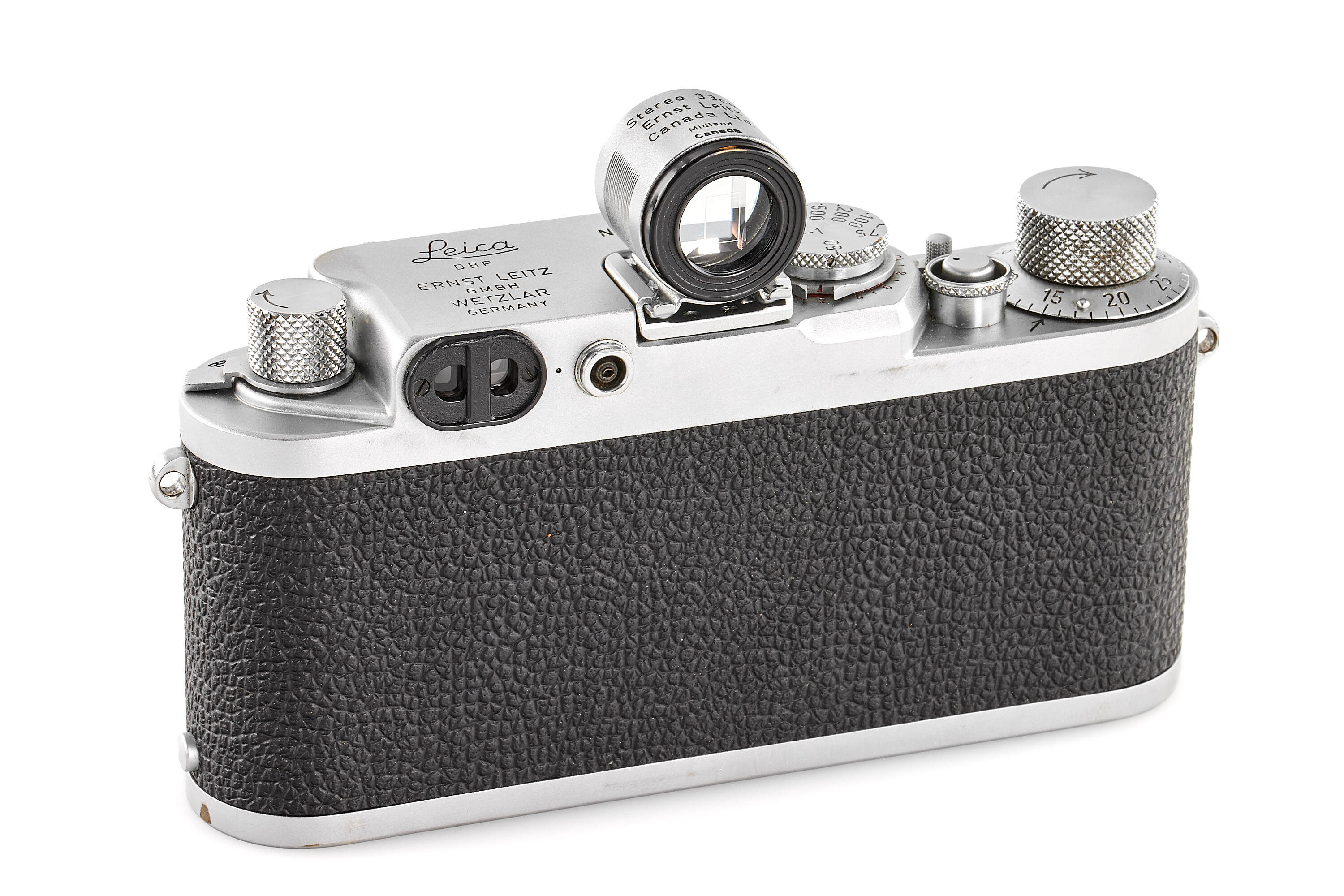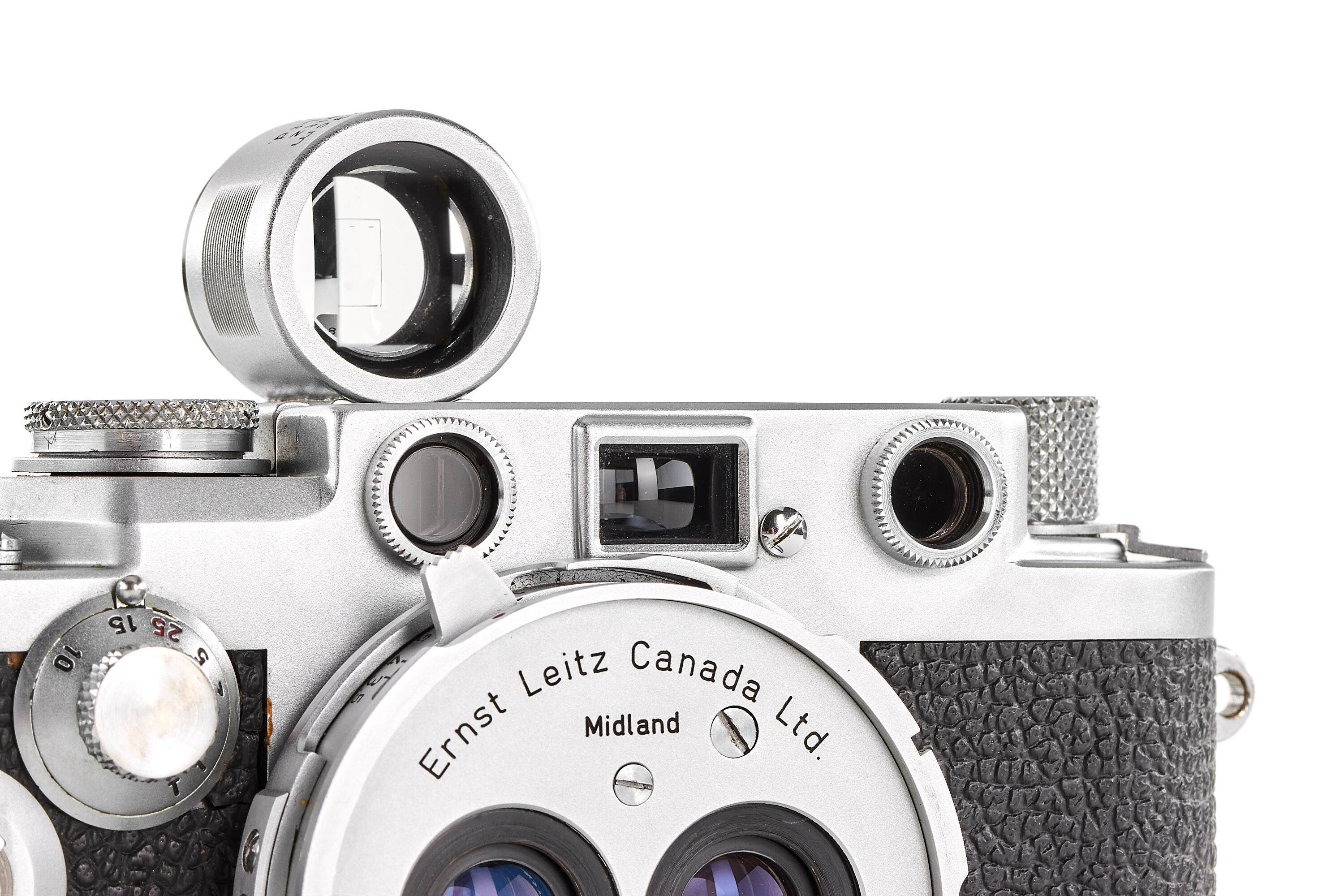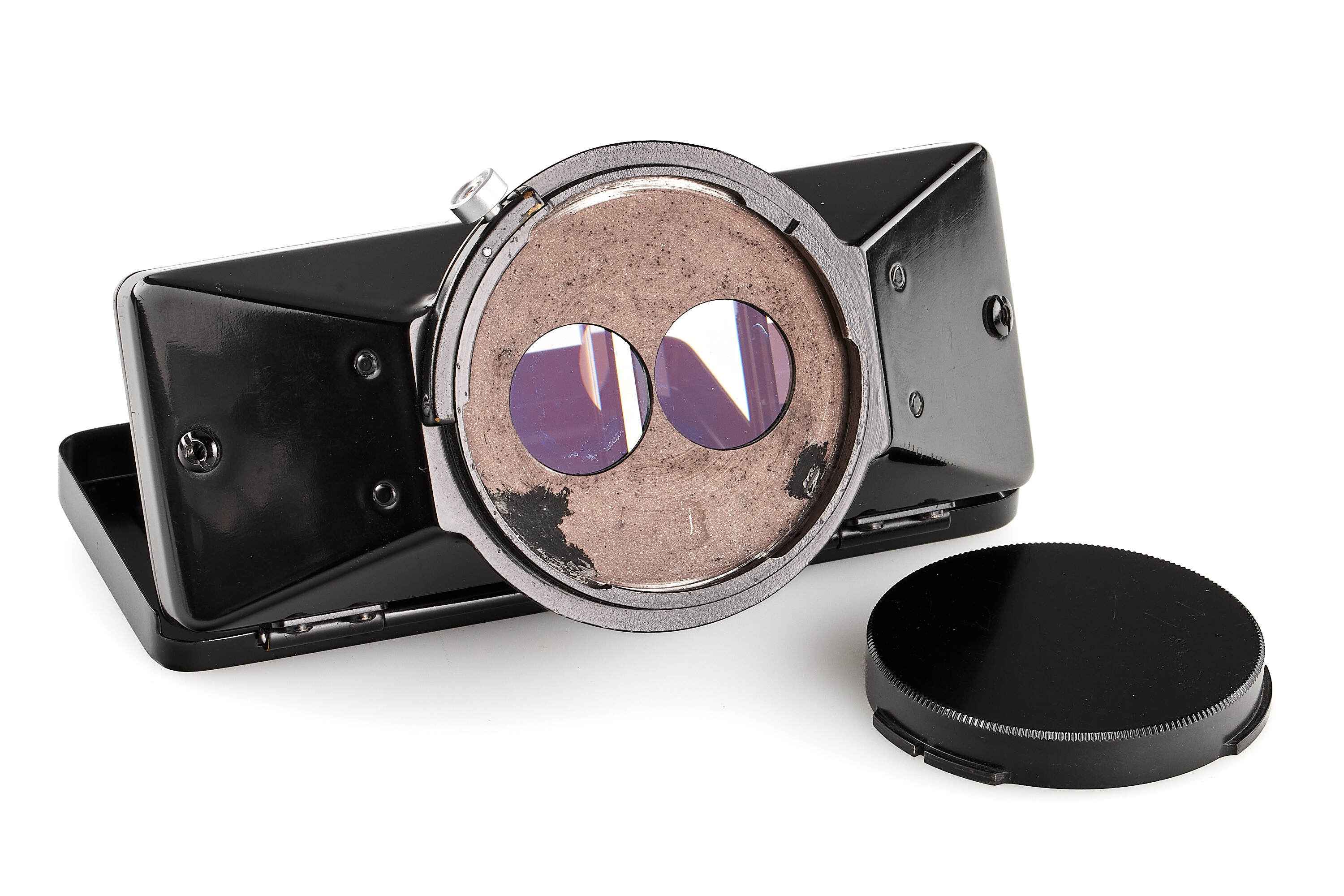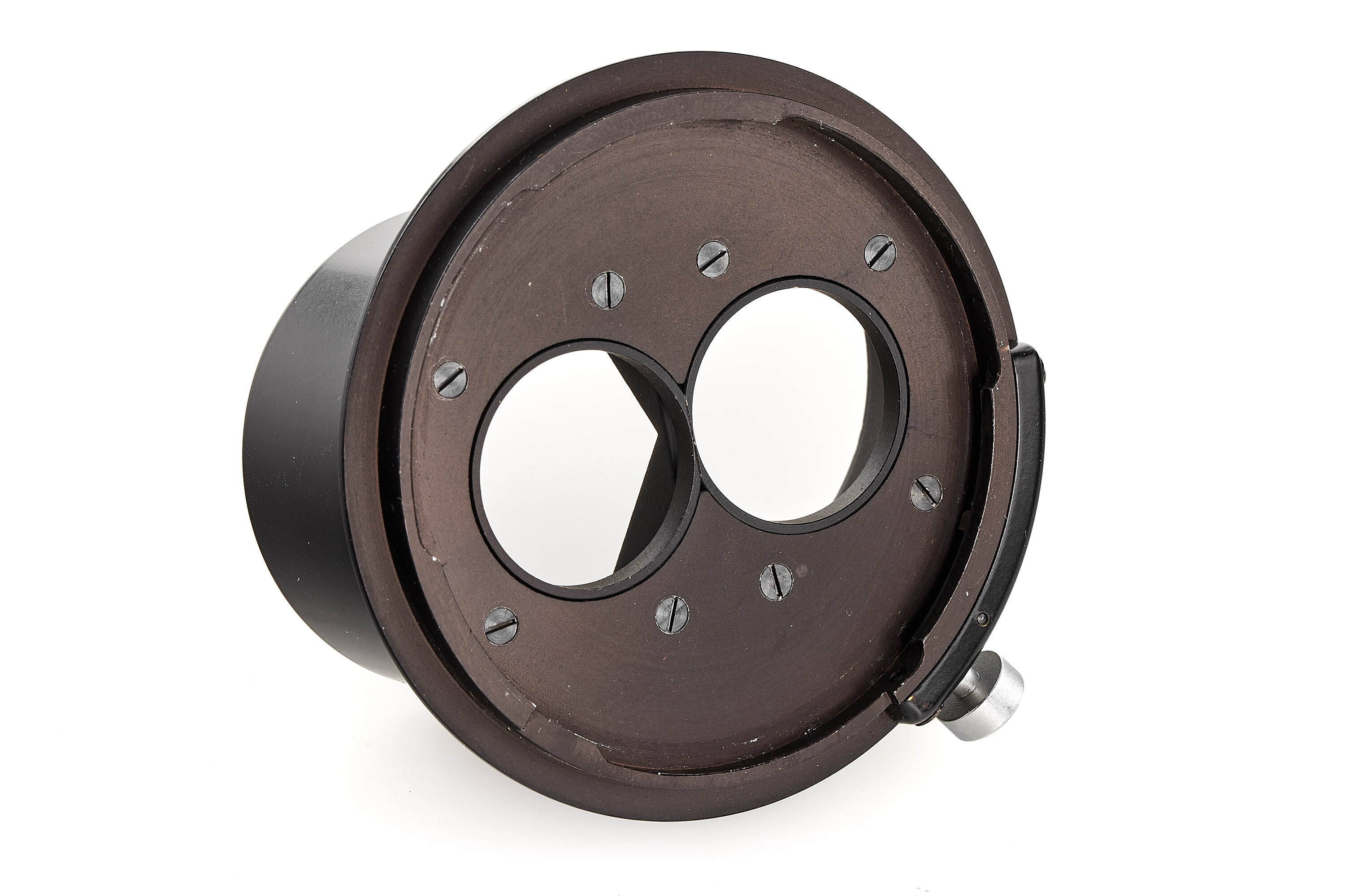 Nice very late Leica IIIf chrome no.814778 in near-mint condition with very rare stereo equipment OIRZO-S including Stemar 3.5/3.3mm made in Canada no.1124148 in beautiful, almost mint condition, good optics, with OIGEO hood, OIMPO beam splitter no.1279 (rear cap) and OIDYO finder, interesting to note the lenses have 6 aperture blades on one side and 12 on the other!
