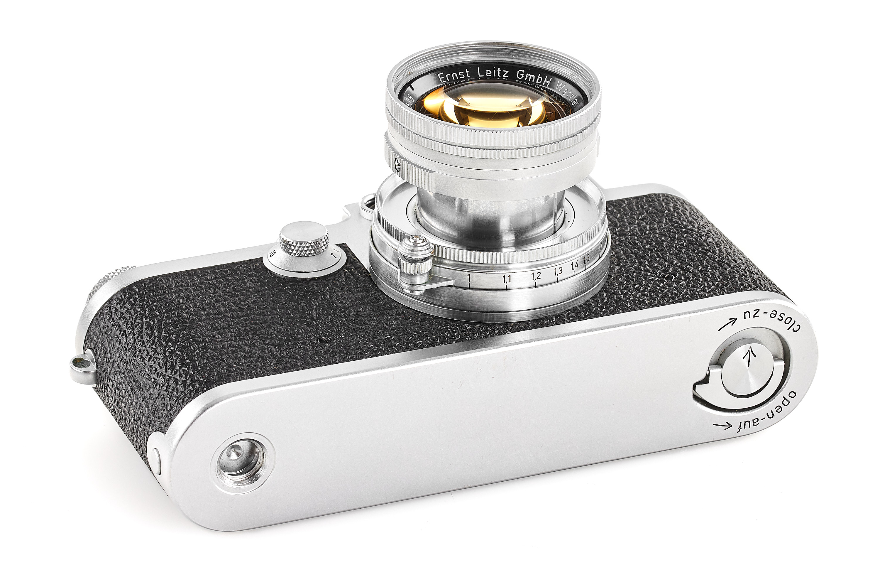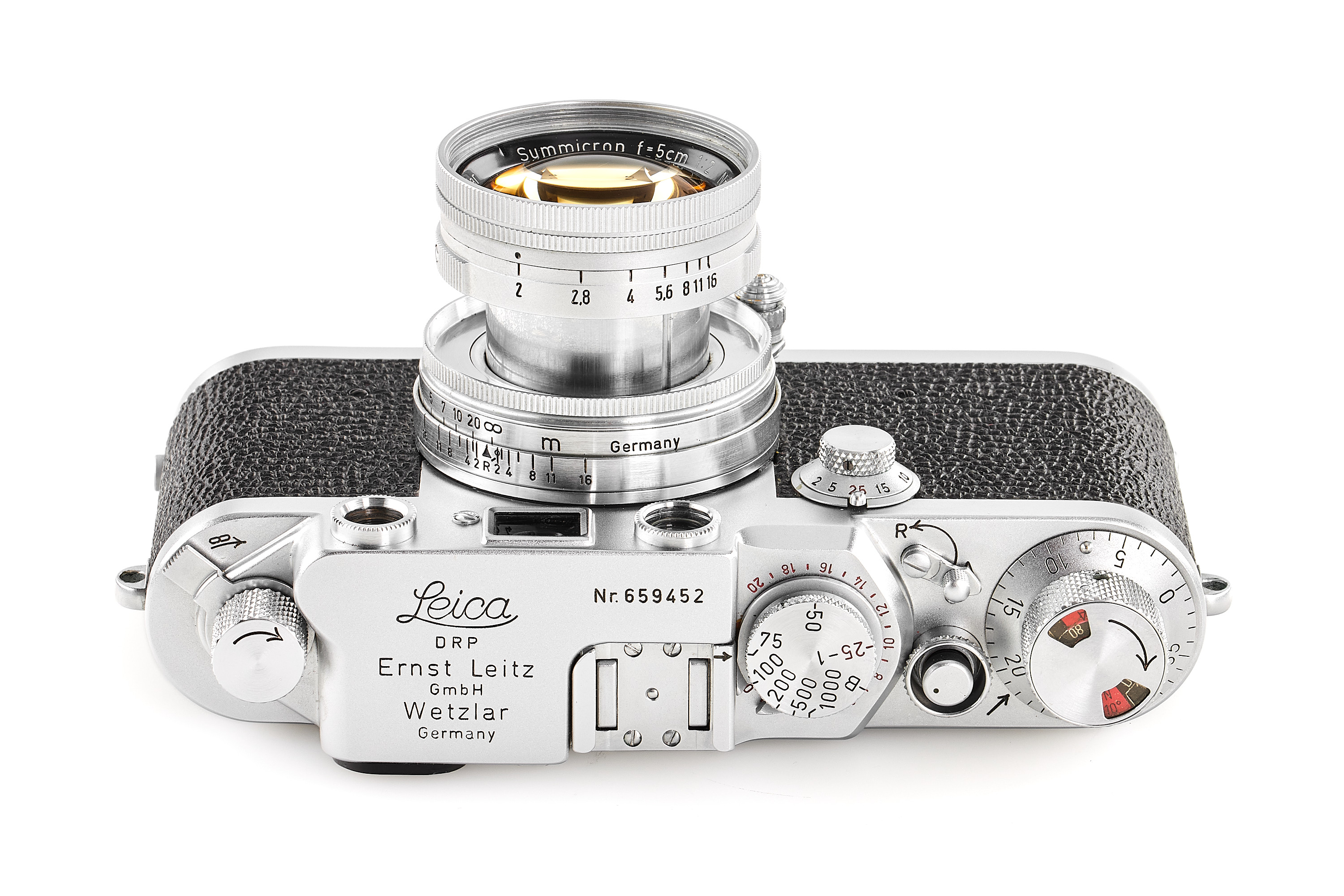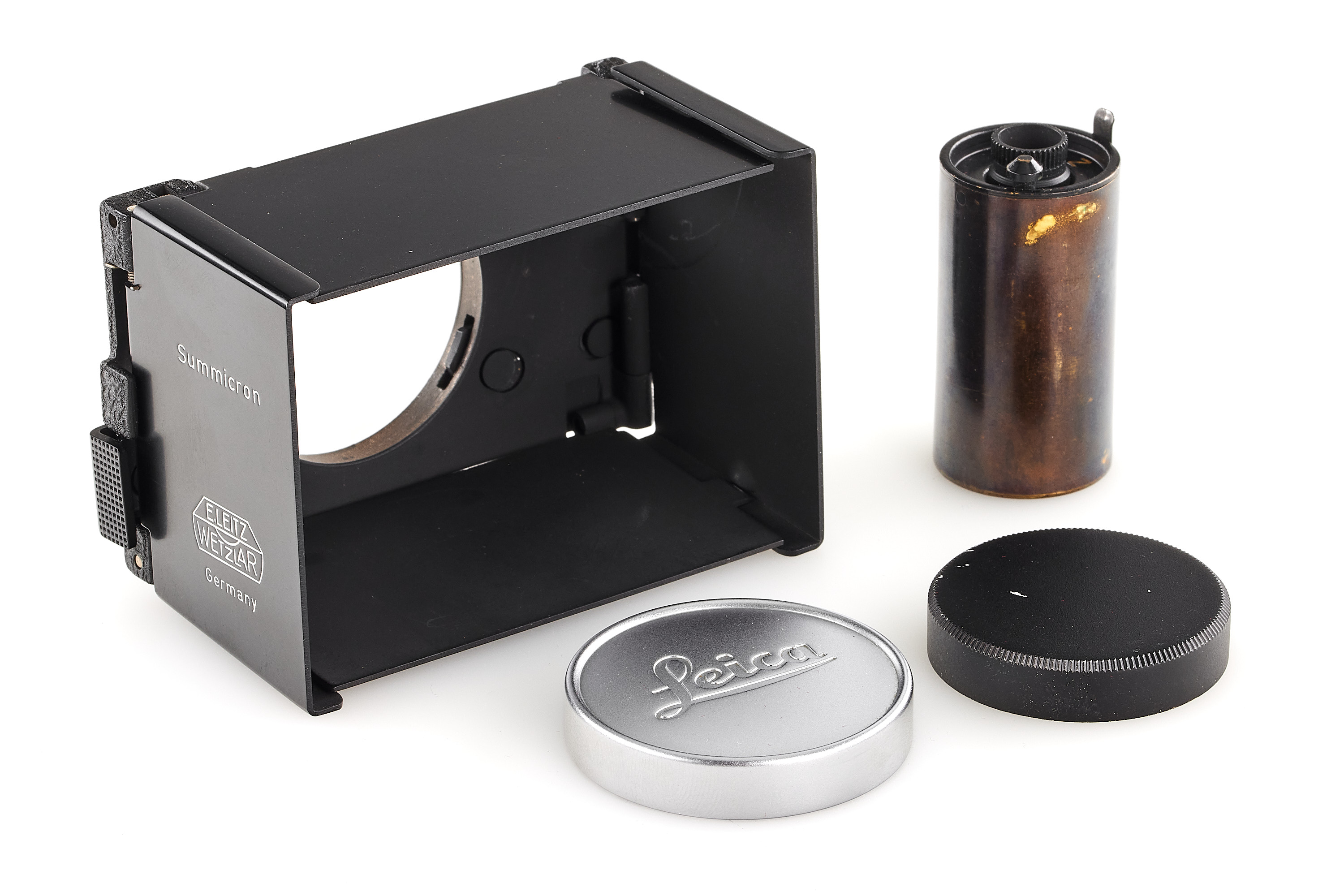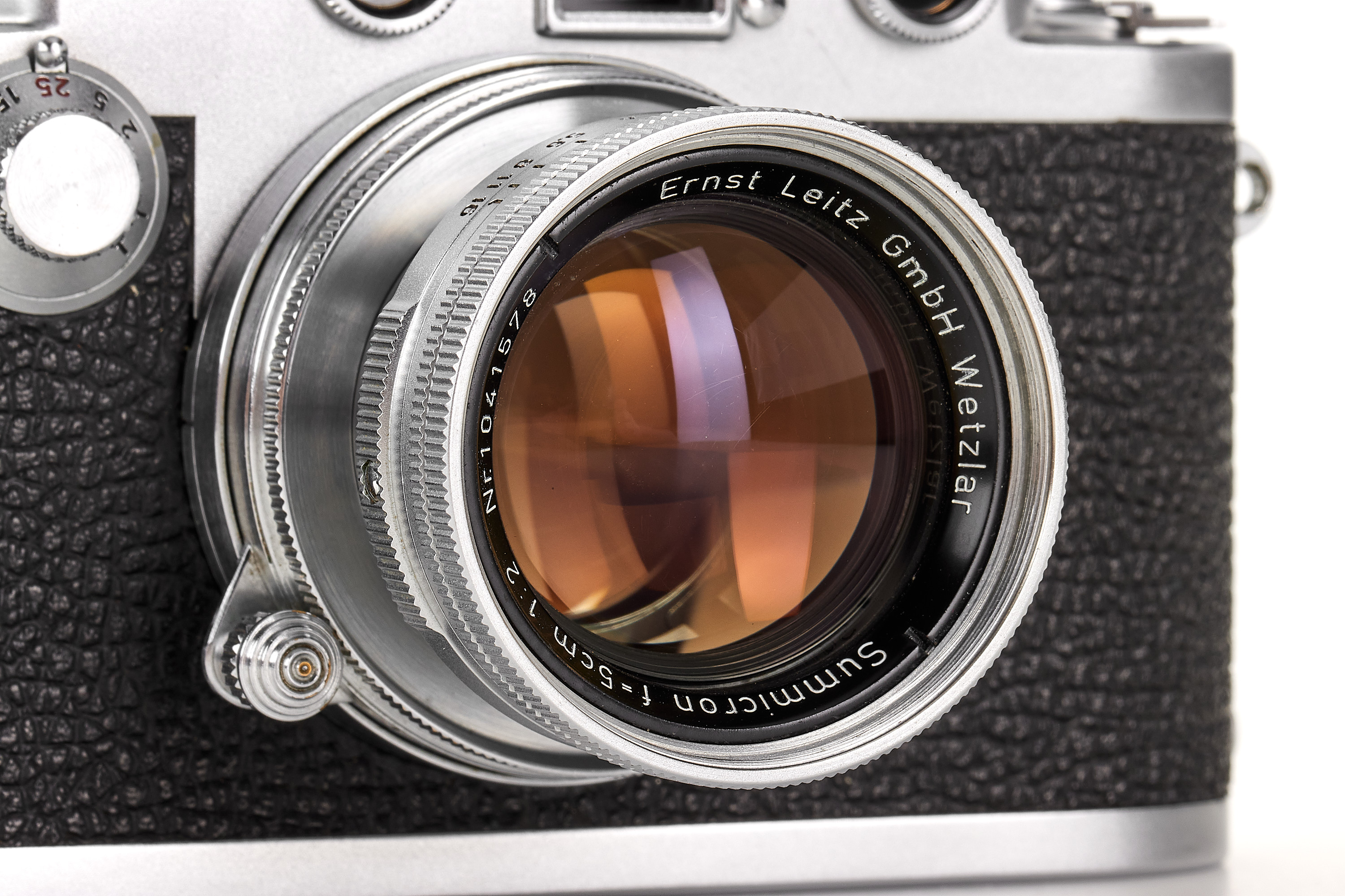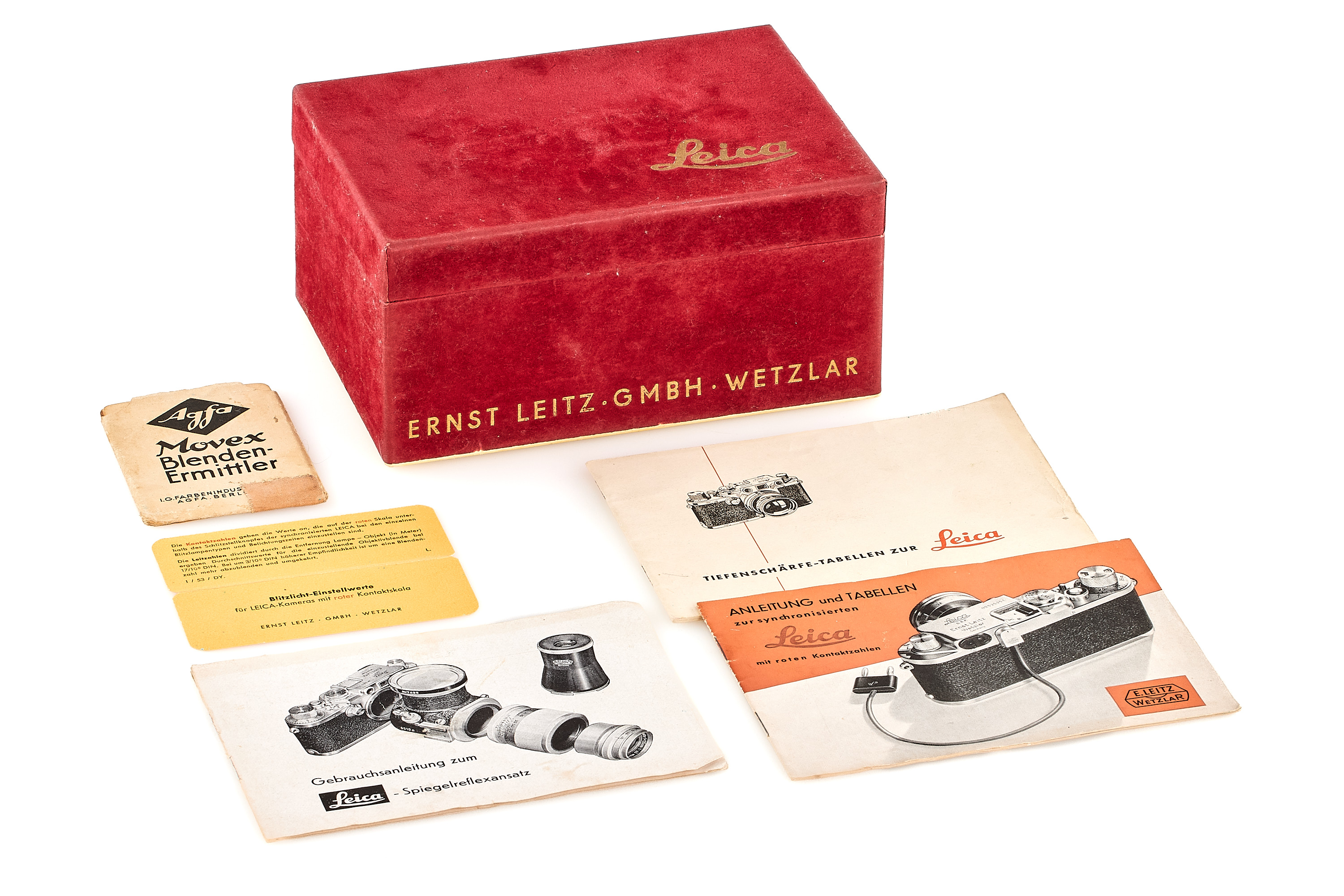 Beautiful IIIf in absolutely mint condition, with matching sought-after Summicron 2/5cm no.1041578 with Thorium lenses, optics only show a few cleaning marks, both delivered the same day to Bauer, Dusseldorf on 03.08.1953, with front lens cap, SOOFM hood for Summicron 5cm, rear lens cap, film spool, papers leather case and original maker's box with both serial numbers.