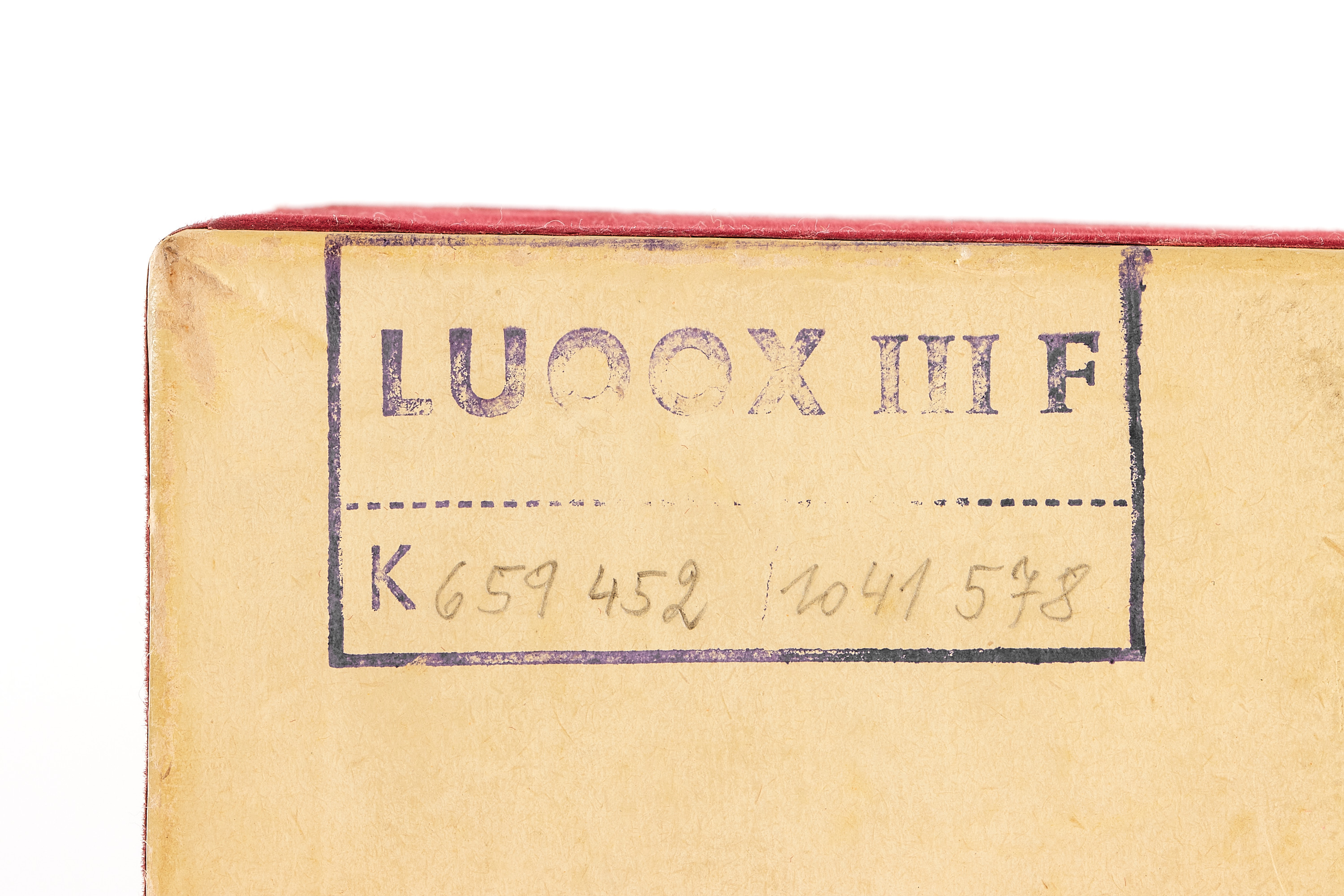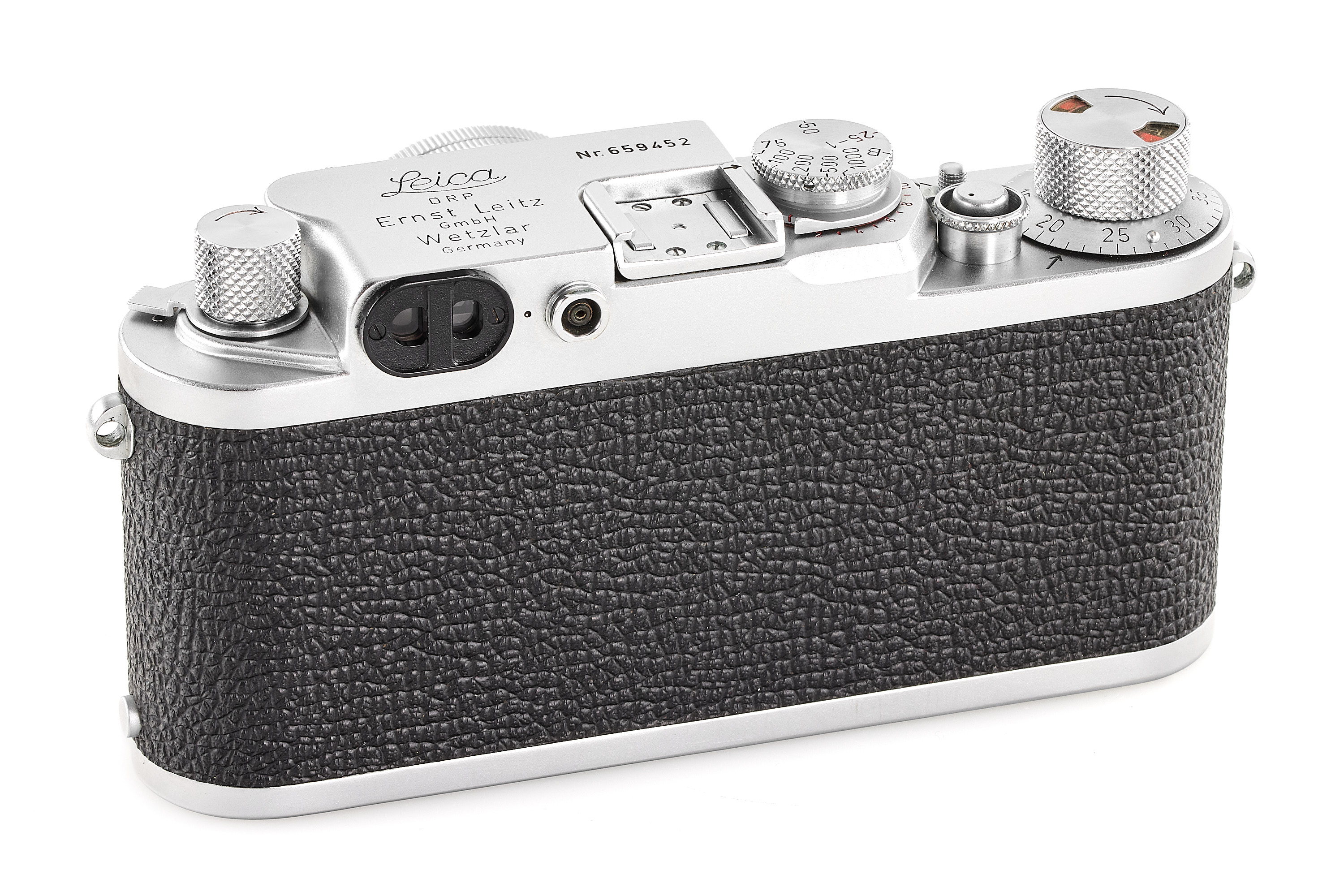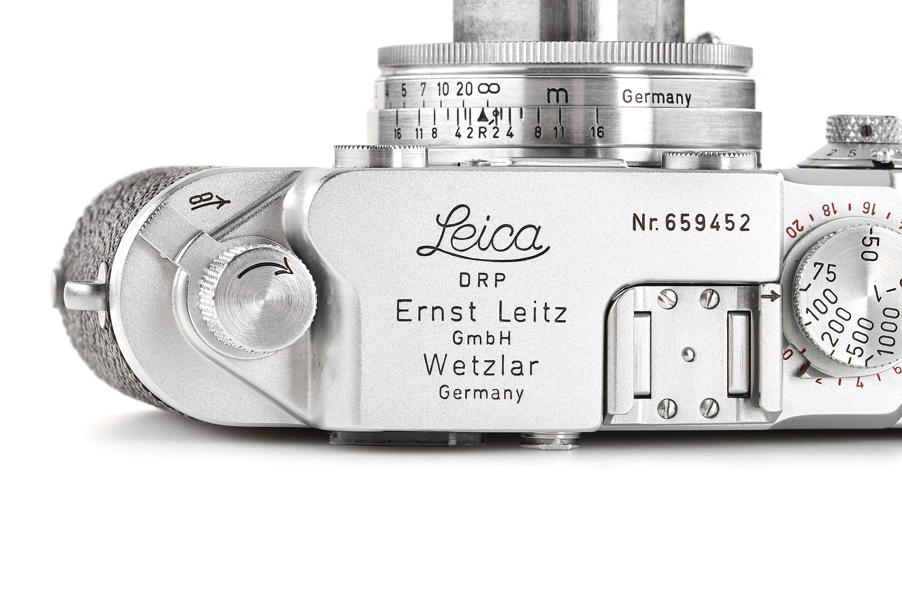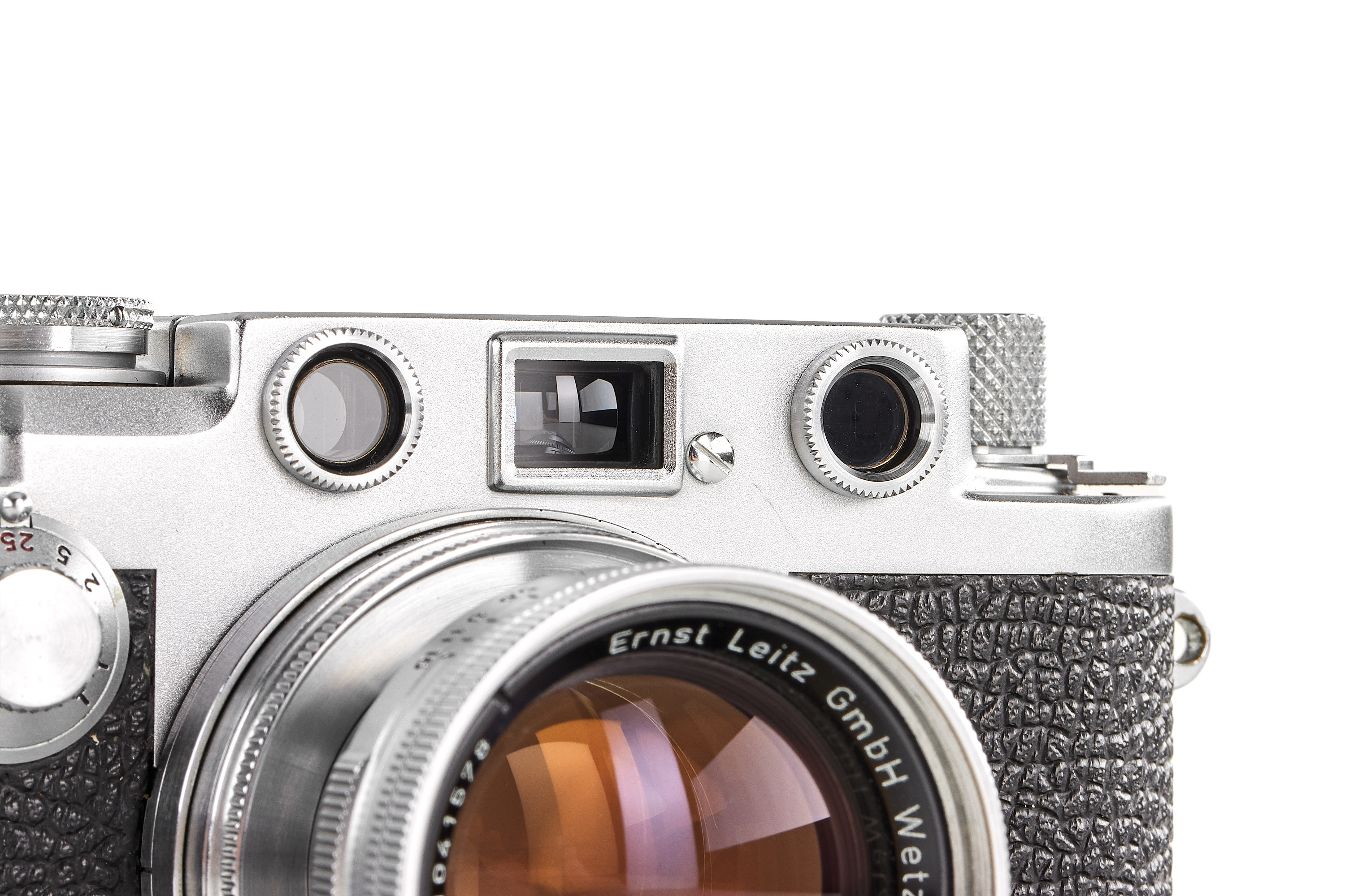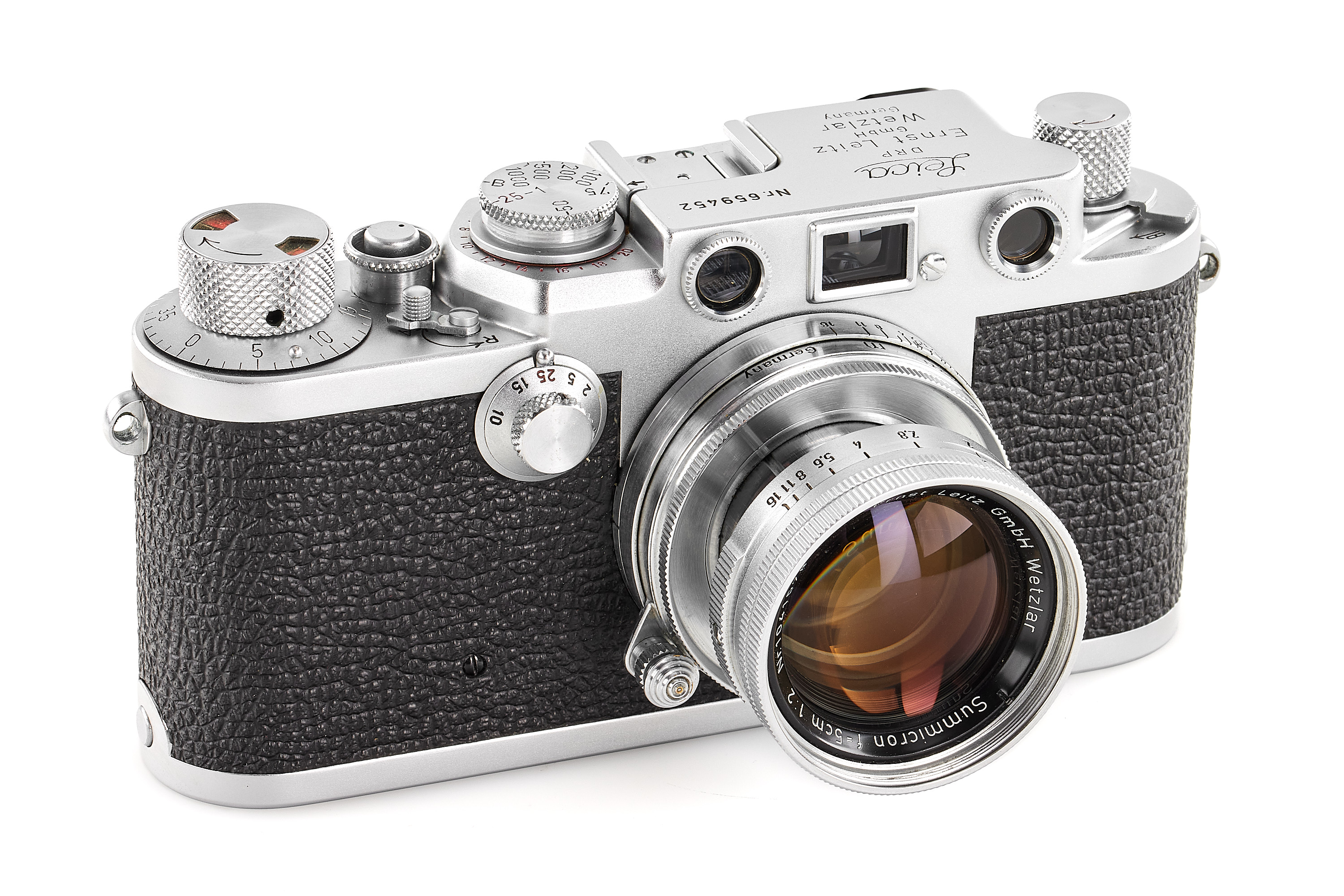 Beautiful IIIf in absolutely mint condition, with matching sought-after Summicron 2/5cm no.1041578 with Thorium lenses, optics only show a few cleaning marks, both delivered the same day to Bauer, Dusseldorf on 03.08.1953, with front lens cap, SOOFM hood for Summicron 5cm, rear lens cap, film spool, papers leather case and original maker's box with both serial numbers.