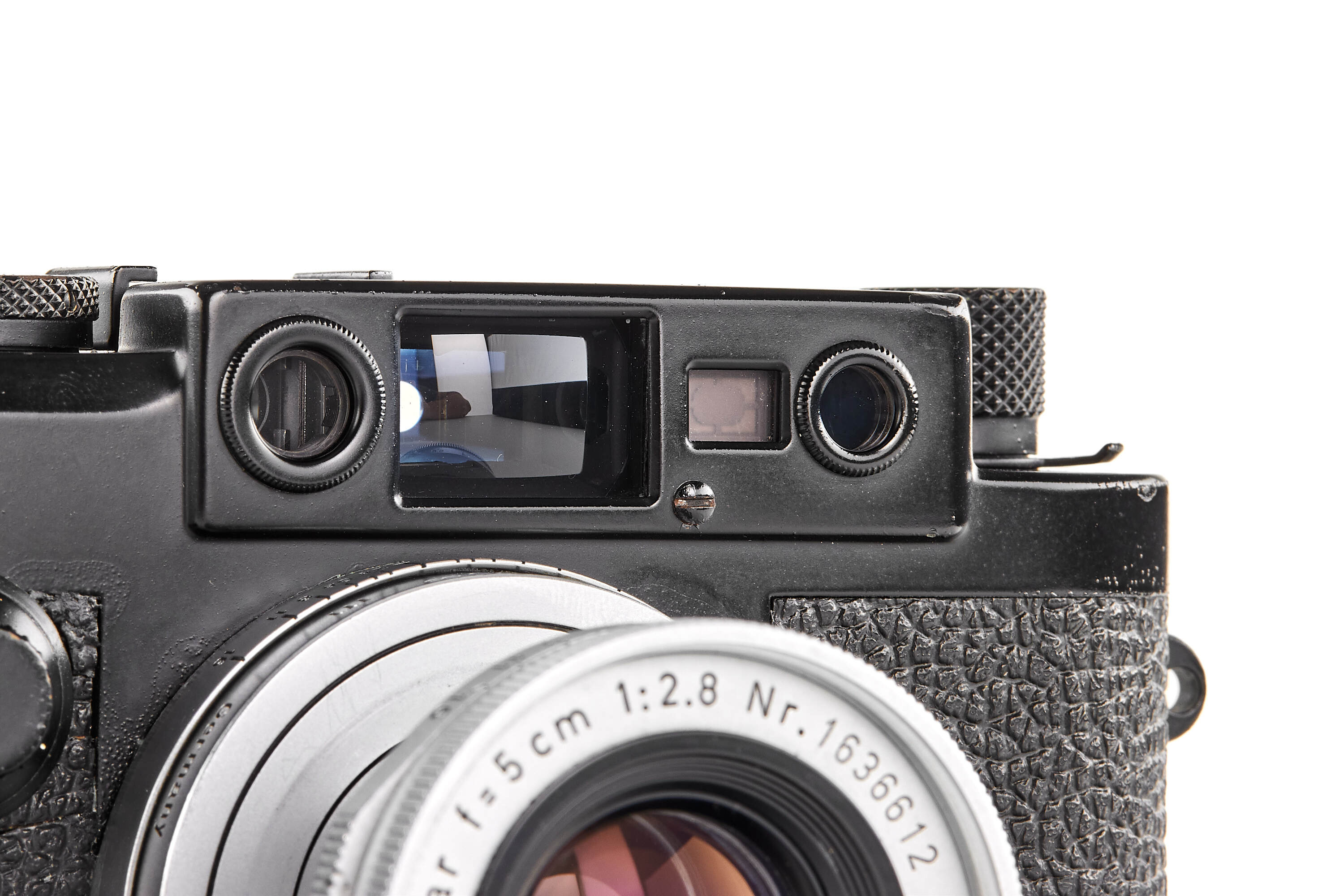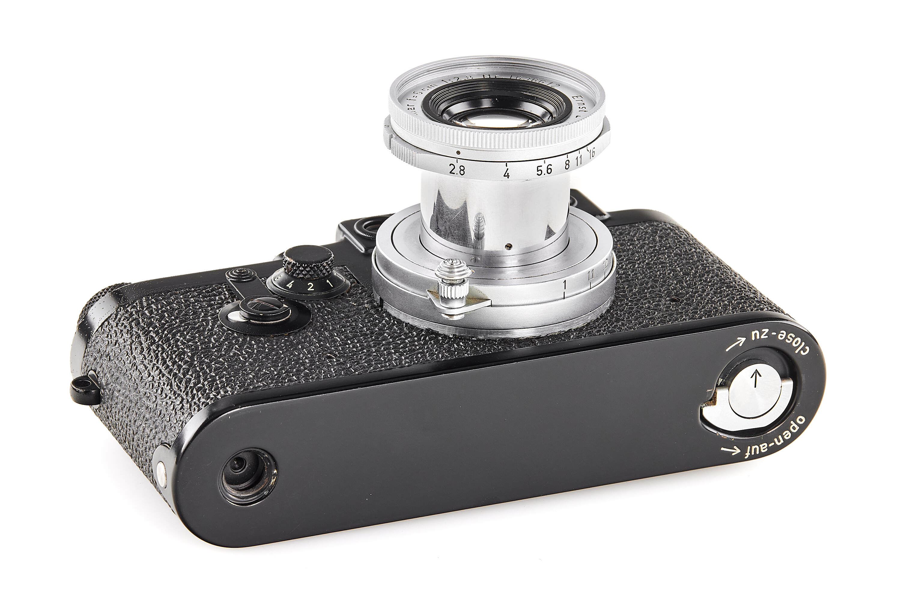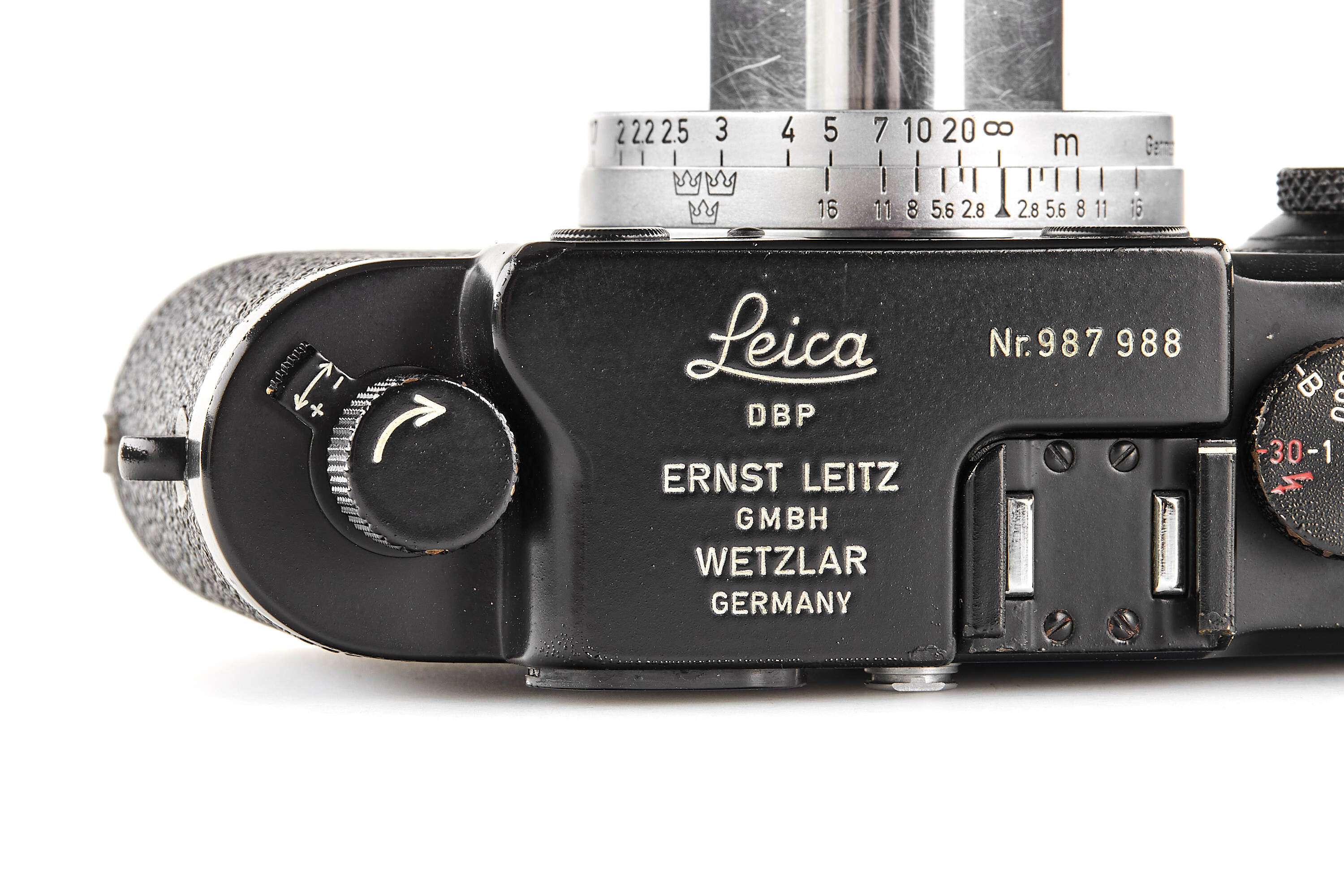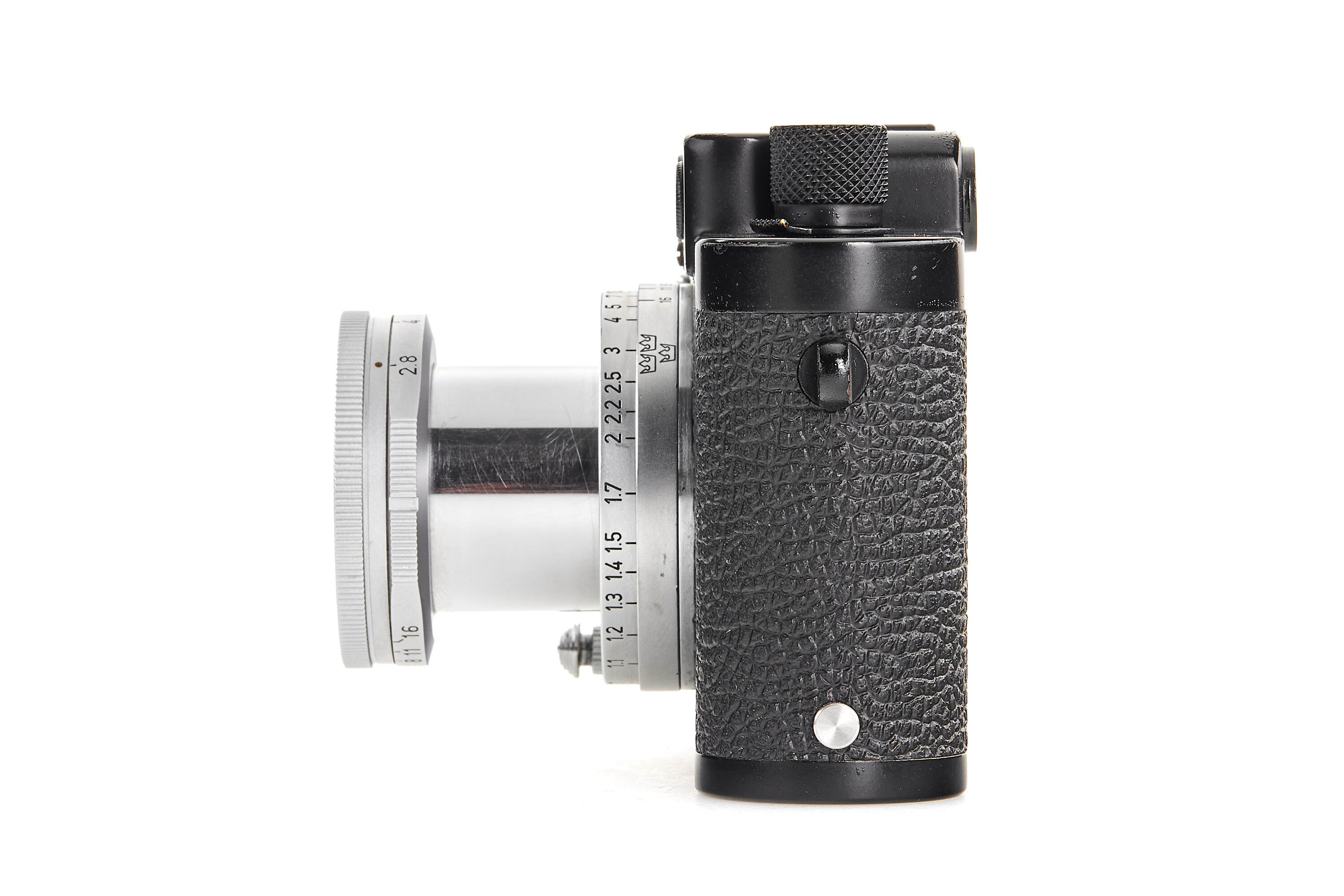 The present example is preserved in almost New Old Stock condition — an extraordinary state for a military-issued camera. The black paint finish remains beautifully intact, with minimal handling traces and small bubbles appearing in the paint. Swedish Army IIIg cameras were generally issued and used; examples surviving in such remarkable preservation are exceedingly rare, making this a true condition-rarity.