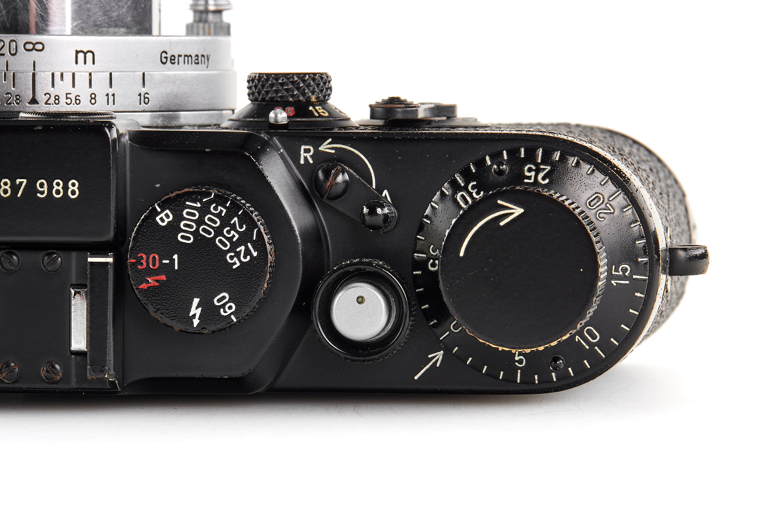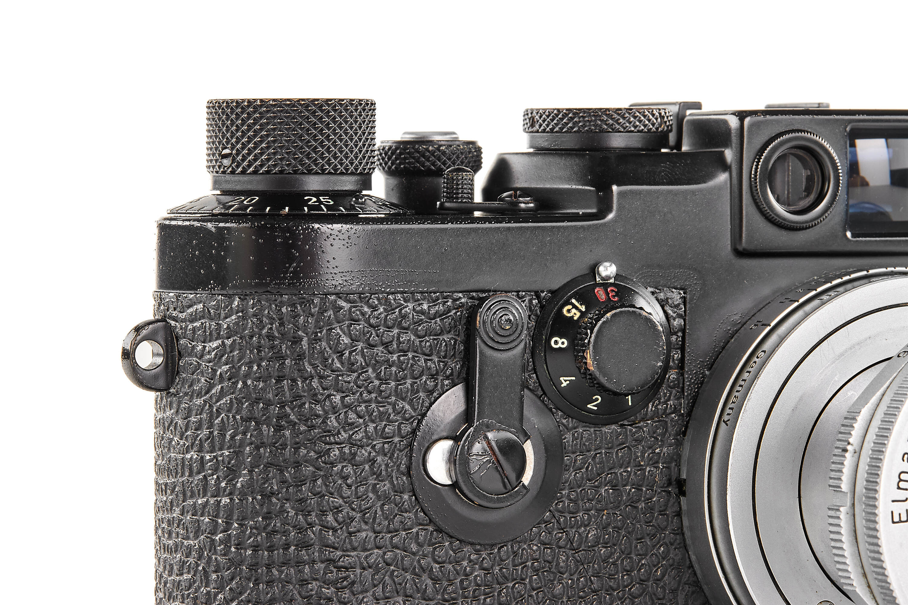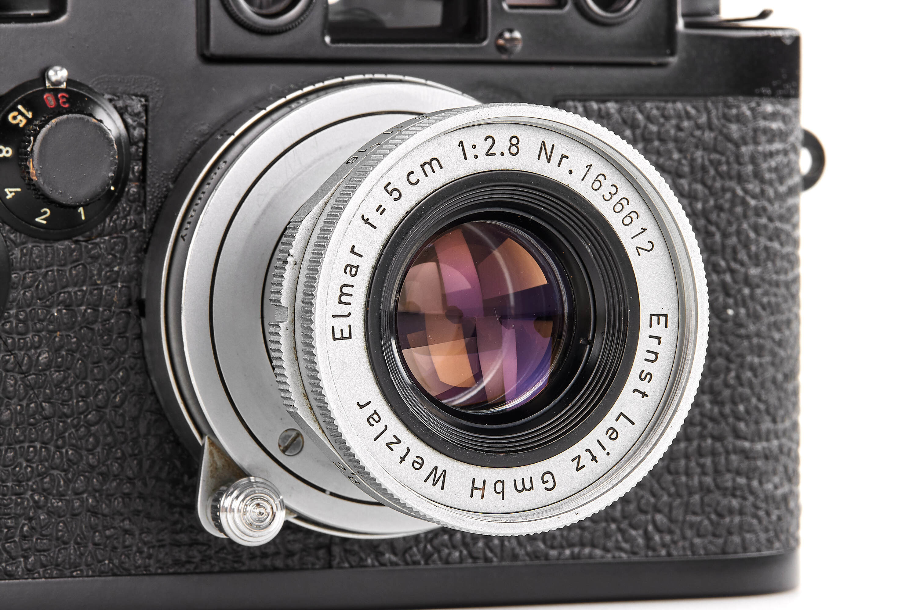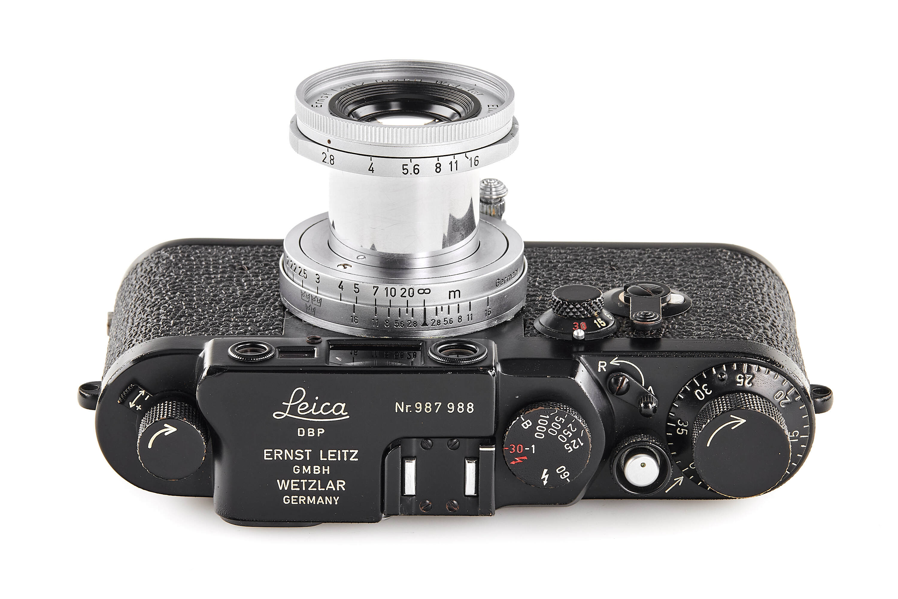 The present example is preserved in almost New Old Stock condition — an extraordinary state for a military-issued camera. The black paint finish remains beautifully intact, with minimal handling traces and small bubbles appearing in the paint. Swedish Army IIIg cameras were generally issued and used; examples surviving in such remarkable preservation are exceedingly rare, making this a true condition-rarity.