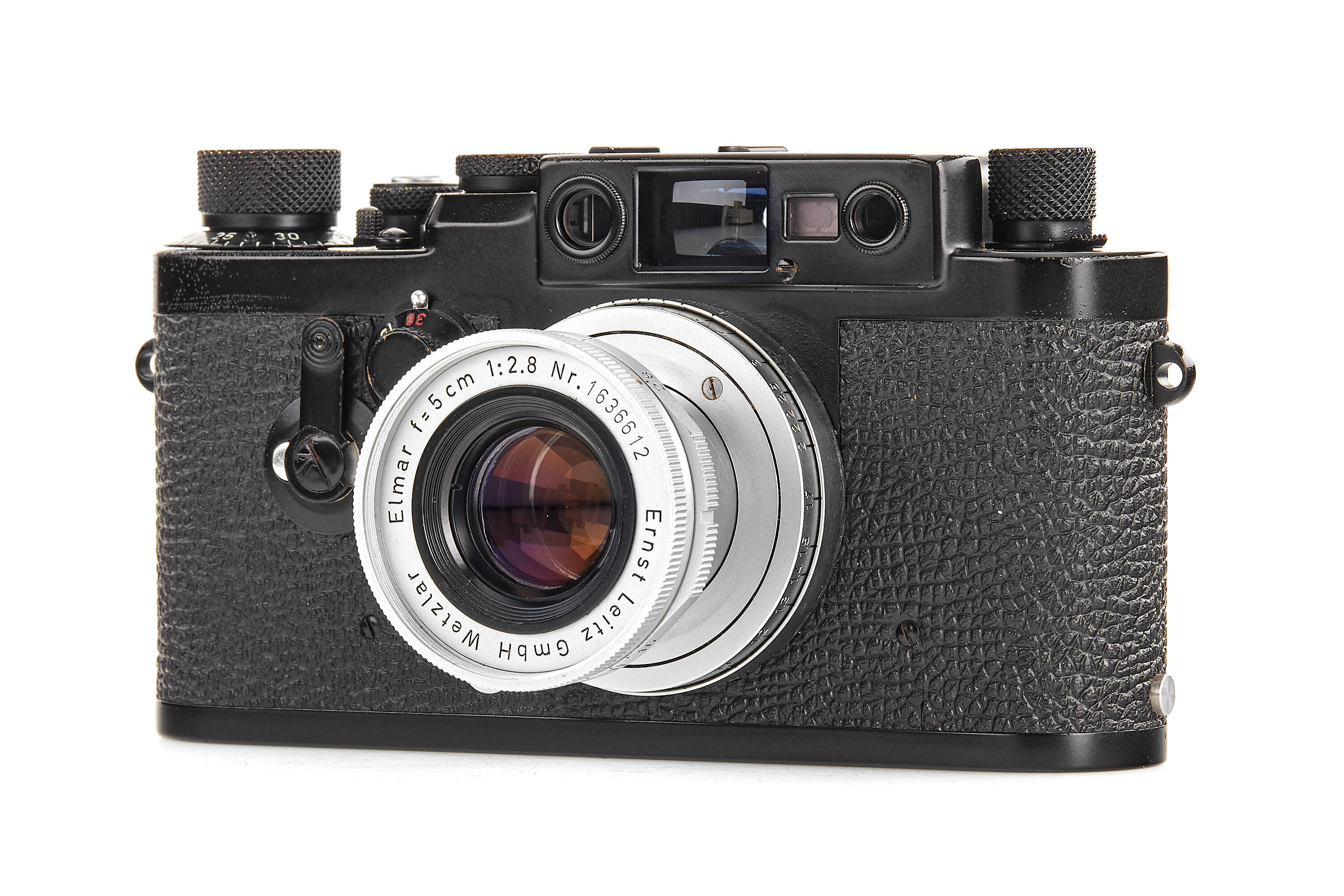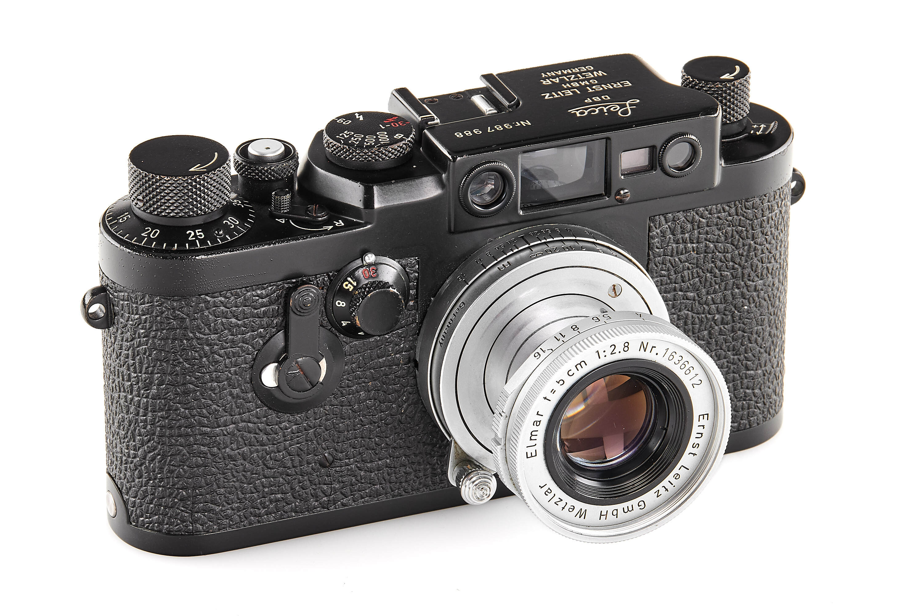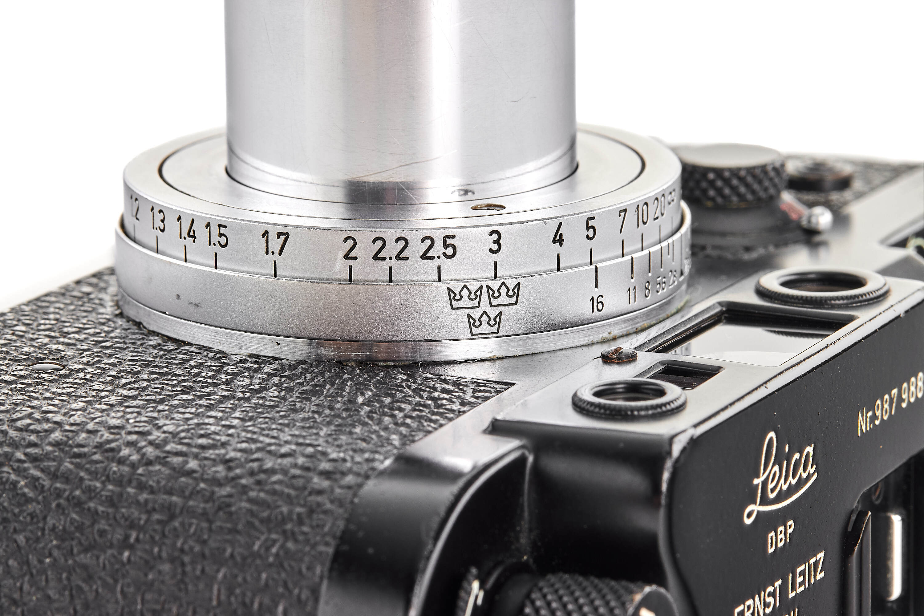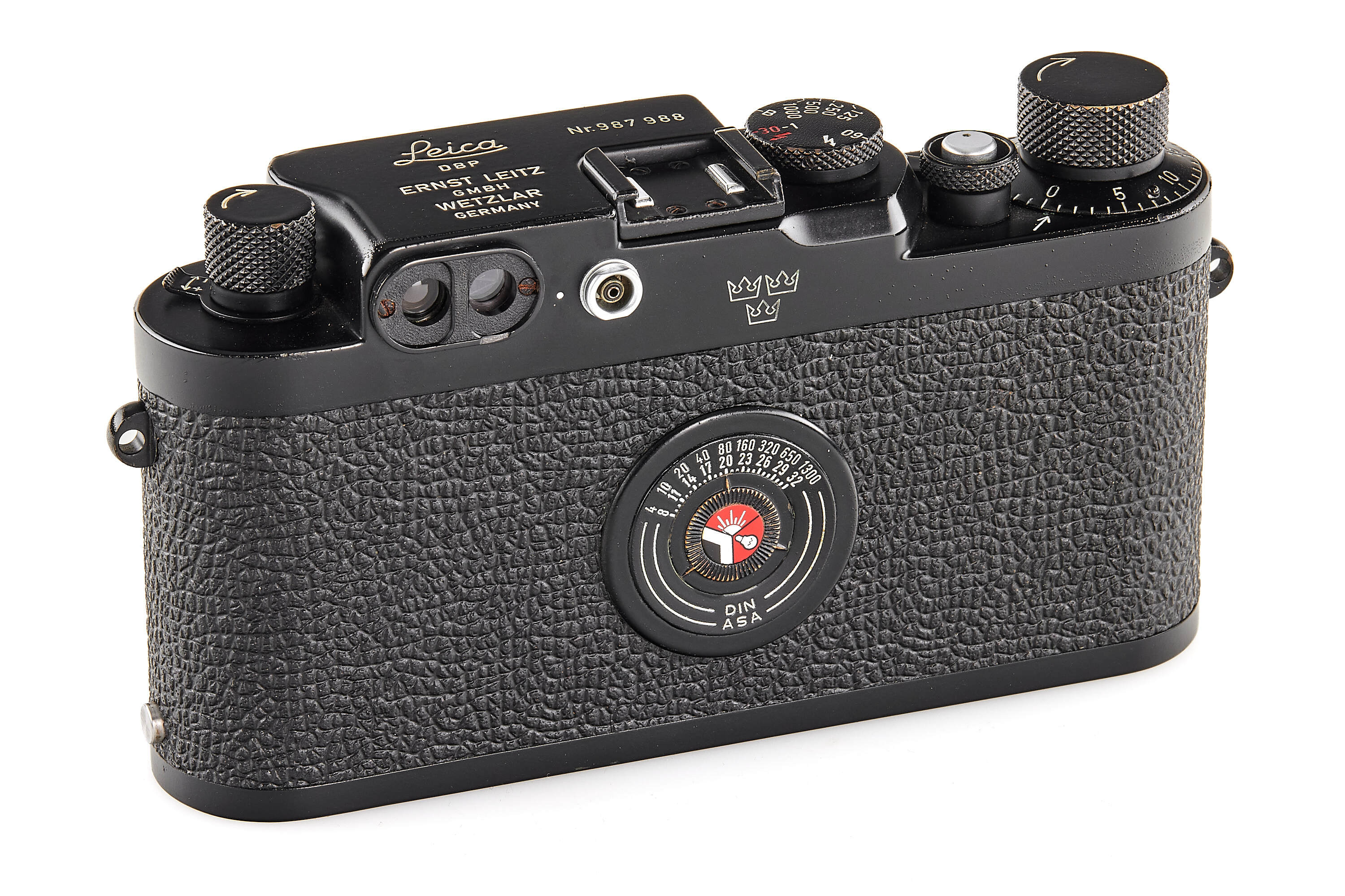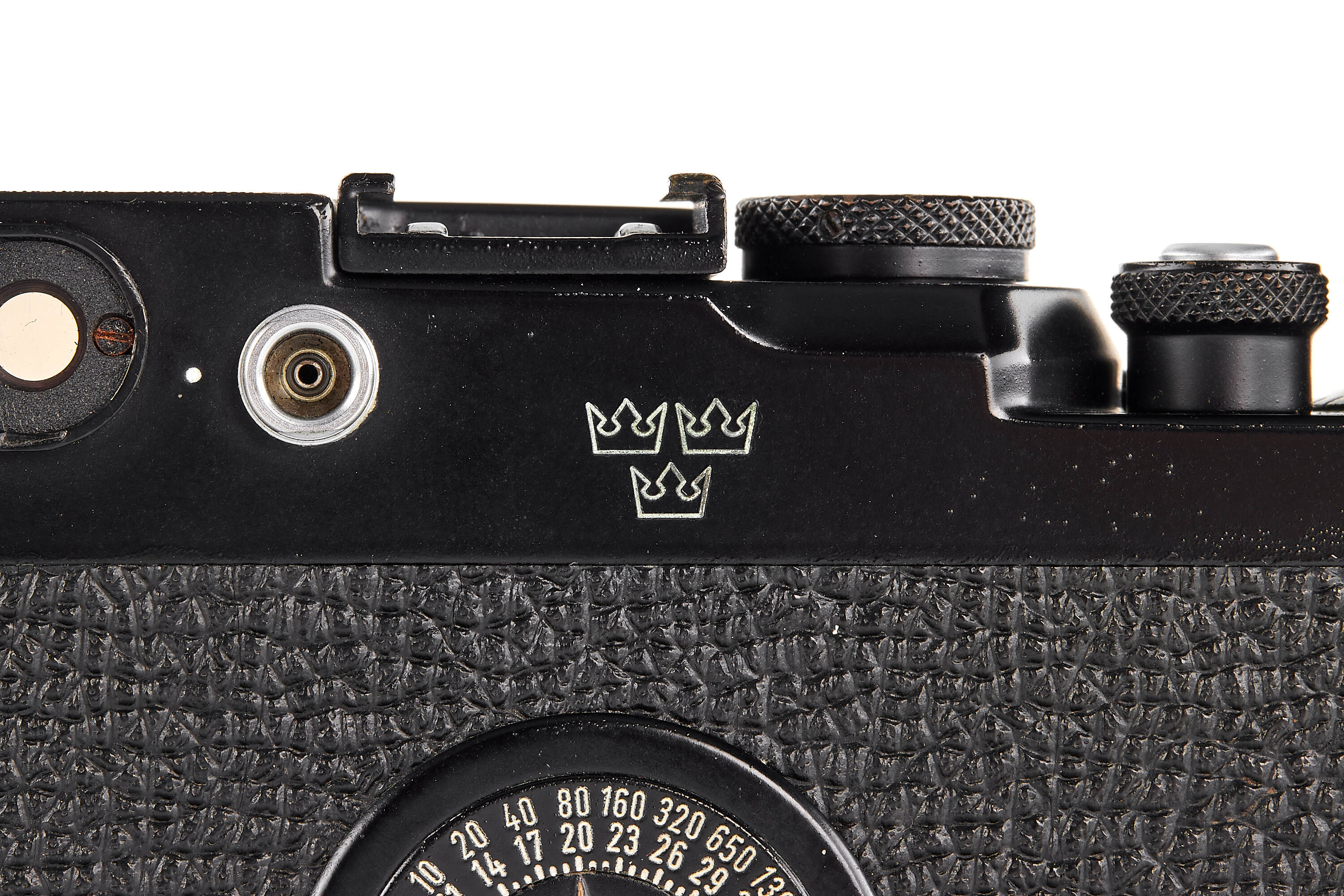 A highly important and exceptionally rare military version of the Leica IIIg, produced in satin black paint for the Swedish Armed Forces and engraved with the distinctive Three Crowns of Sweden on the rear of the top plate. Of this special Swedish Army batch, only approximately 125 cameras are recorded (serial range 987901–988025), making it one of the rarest regular-production screw-mount Leicas of the post-war era.