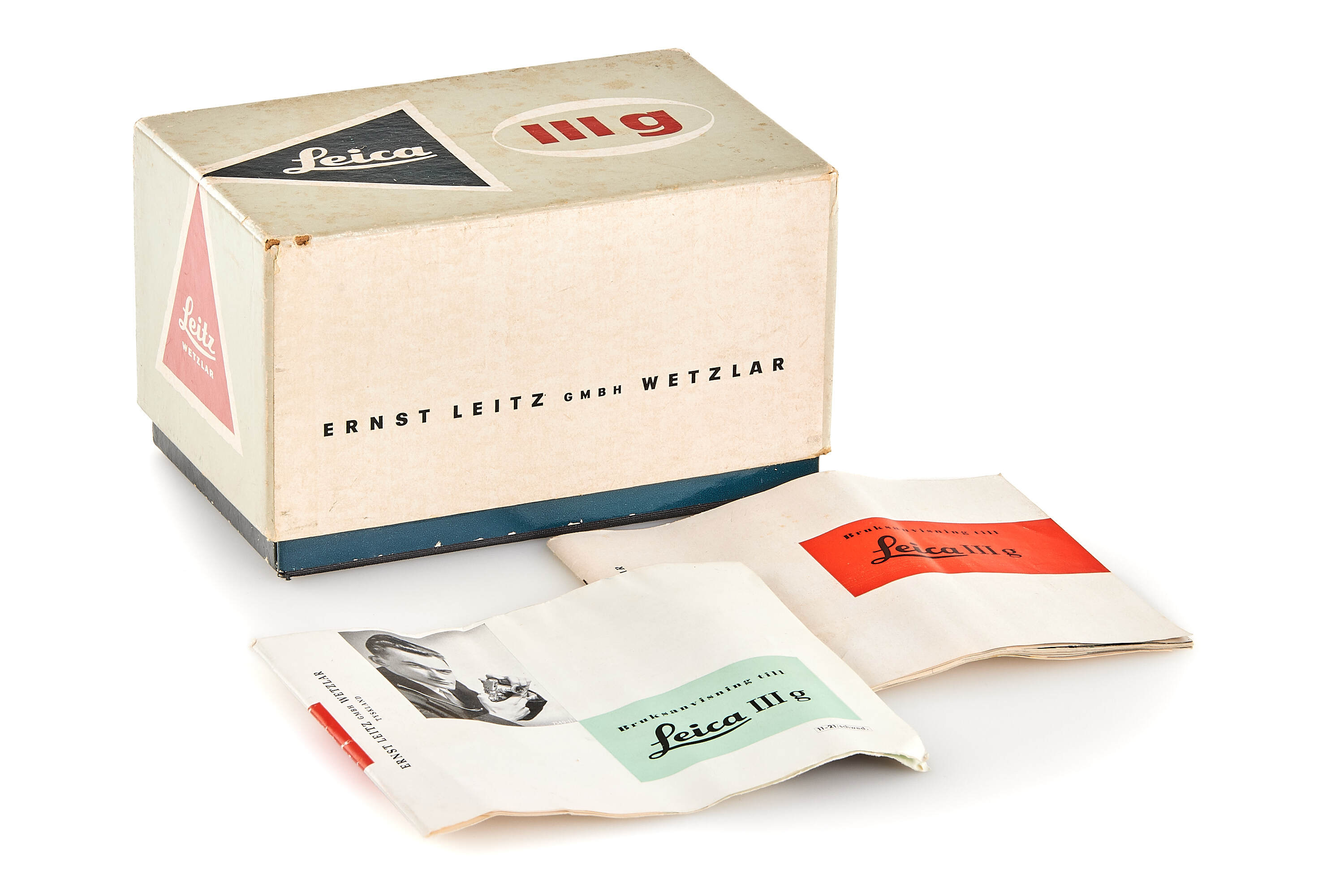 The camera is fitted with its matching Leitz Elmar 2.8/50mm lens, no.1636612, also engraved with the Swedish Three Crowns. The set is accompanied by the matching maker’s box, bearing the corresponding serial number, as well as the original Swedish-language instructions — an especially desirable survival seldom encountered with these military deliveries.