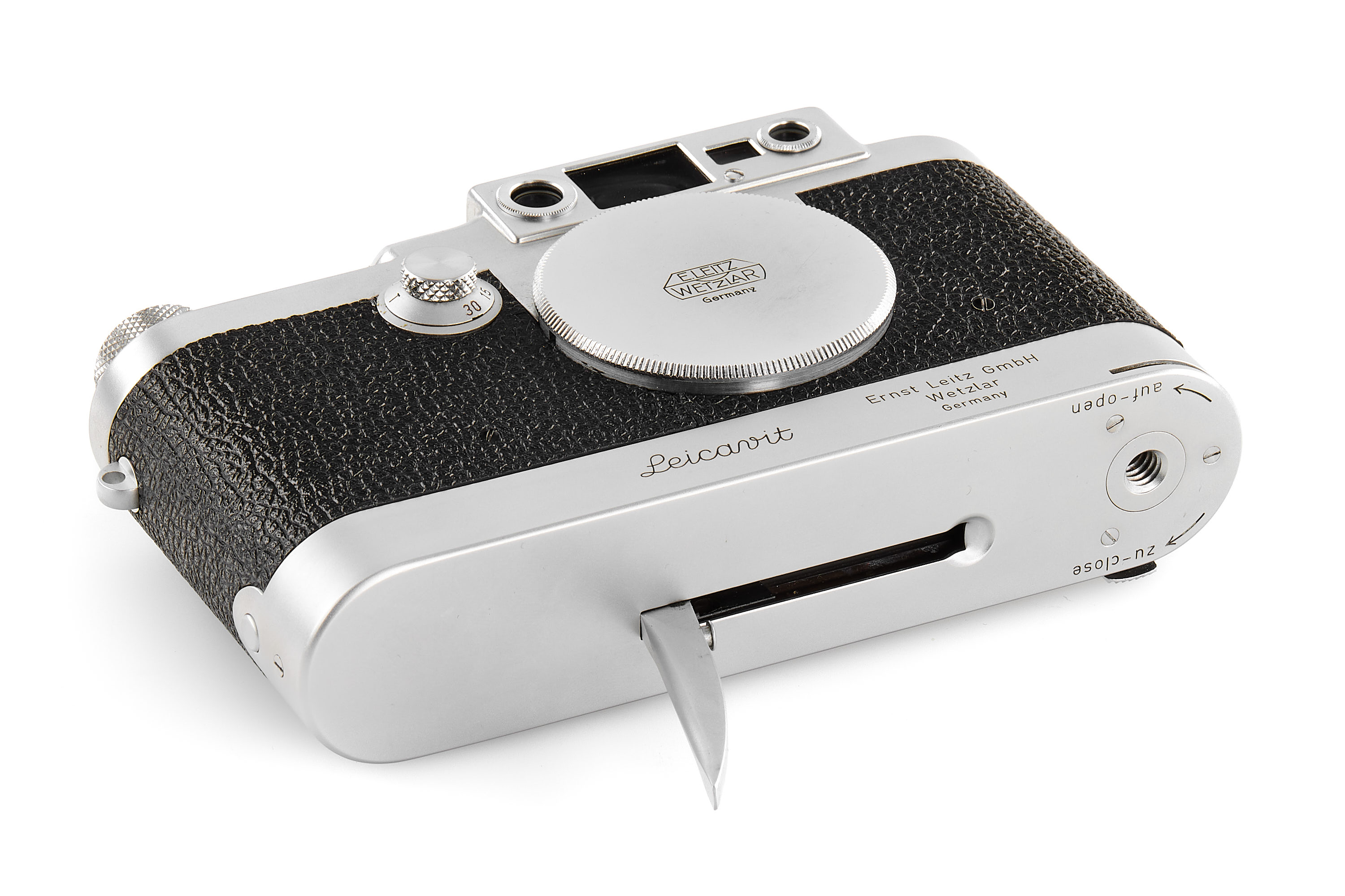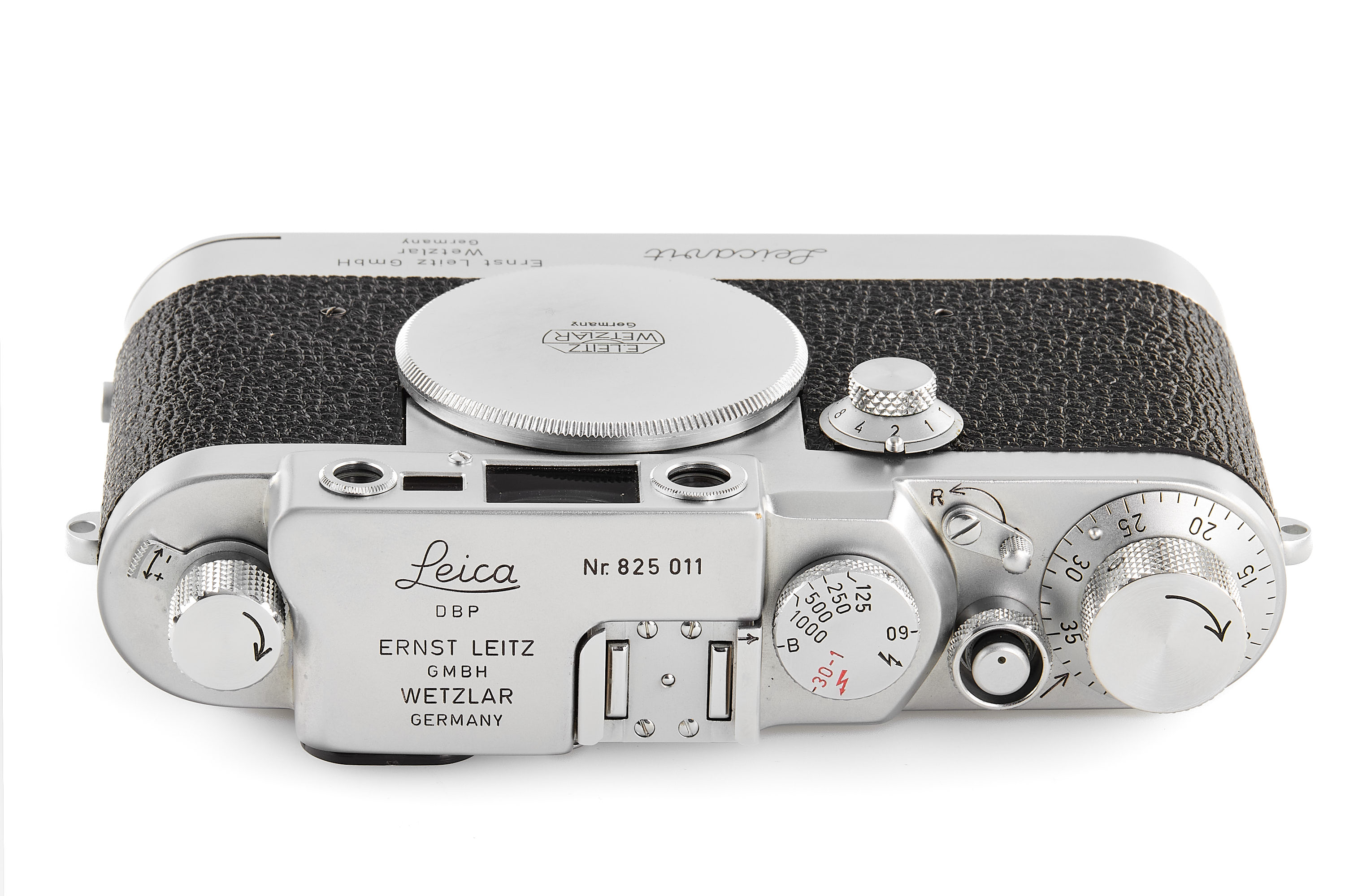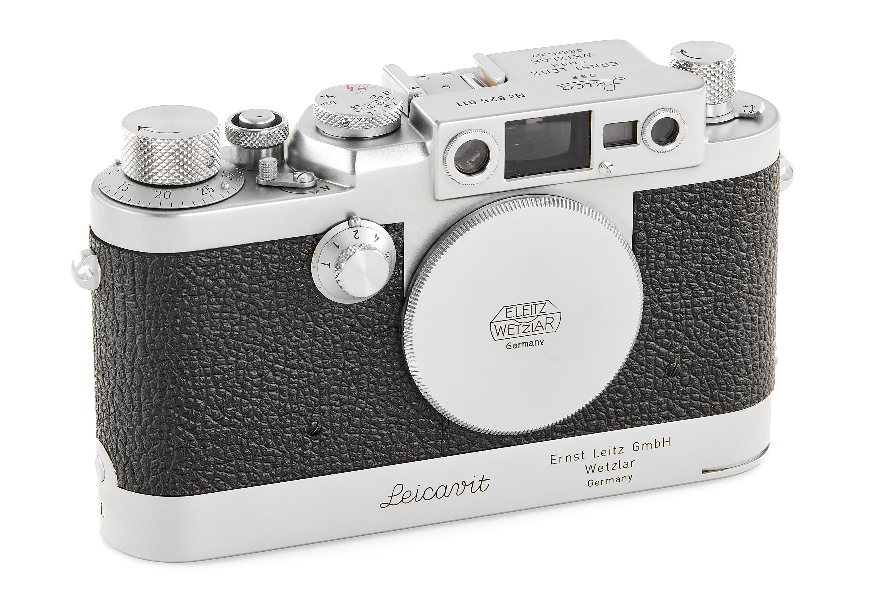Beautiful Leica IIIg from the very first batch of production (nos.825001-826000), in absolutely mint condition and working order, delivered to Manca, New York, on 08.03.1957, with body cap engraved 'E. Leitz Wetzlar Germany', together with Leicavit chrome, Elmar 4/9cm chrome no.1035761 in feet scale, clean and clear optics with both caps, with matching SVGOO 9cm finder in feet scale.