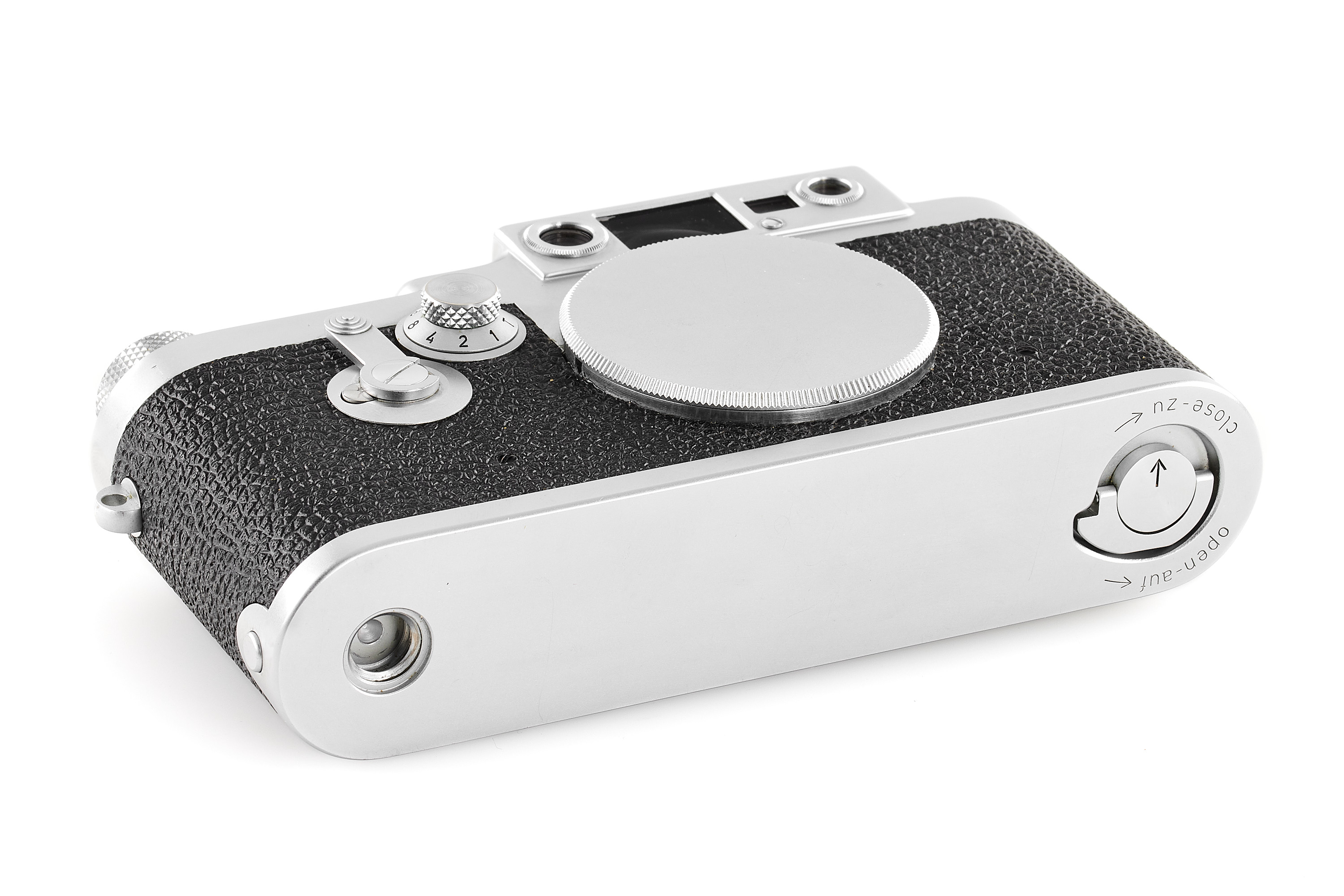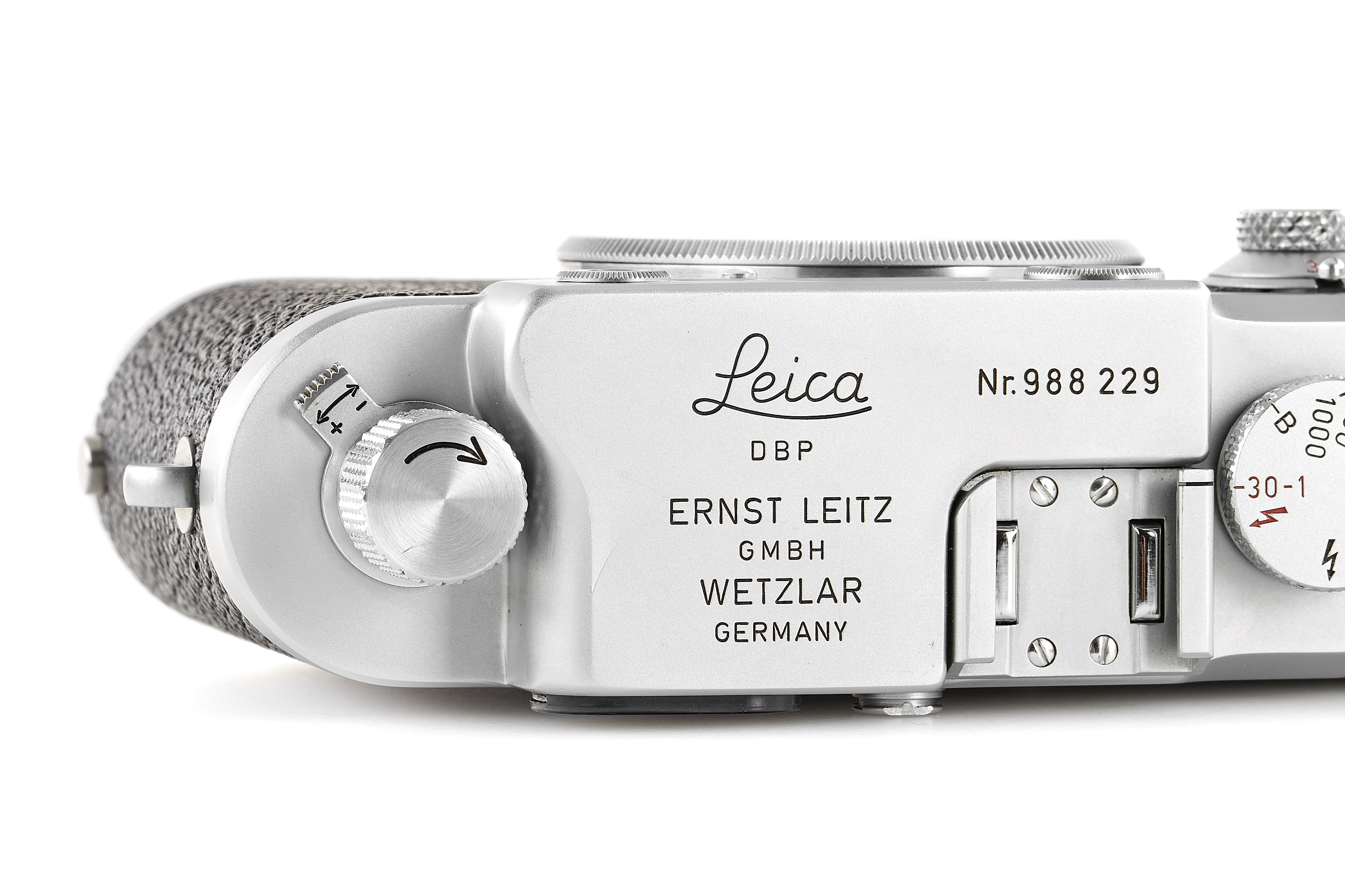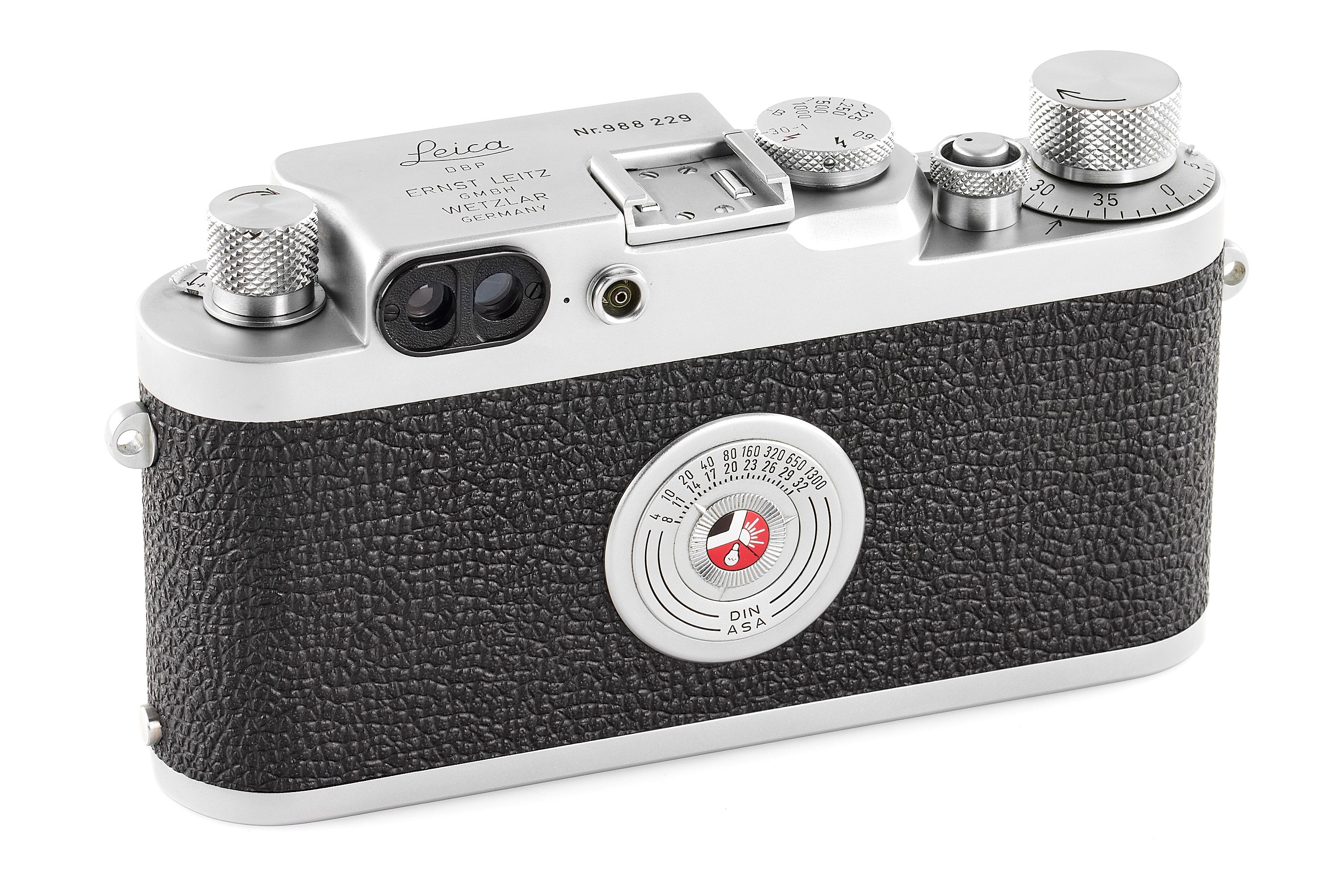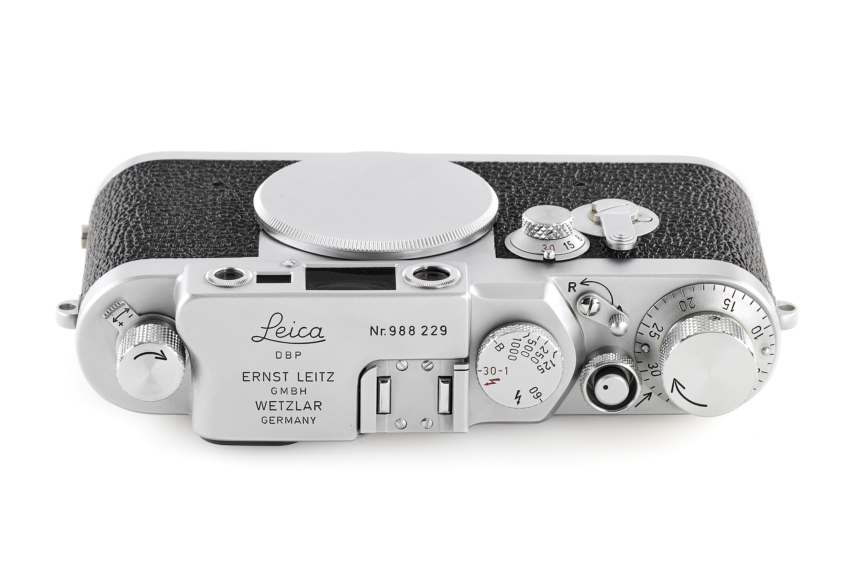 Extremely late chrome body from the last official batch (ends with the no.988252!), in almost mint condition and working order, only showing some light signs of use, with body cap, delivered to Süss on 07.11.1960.