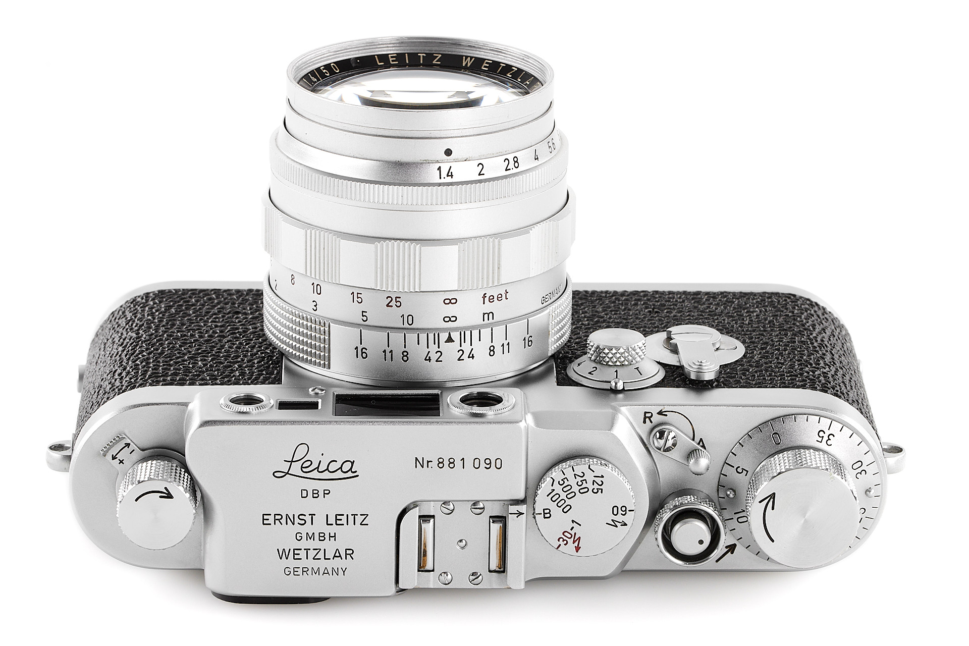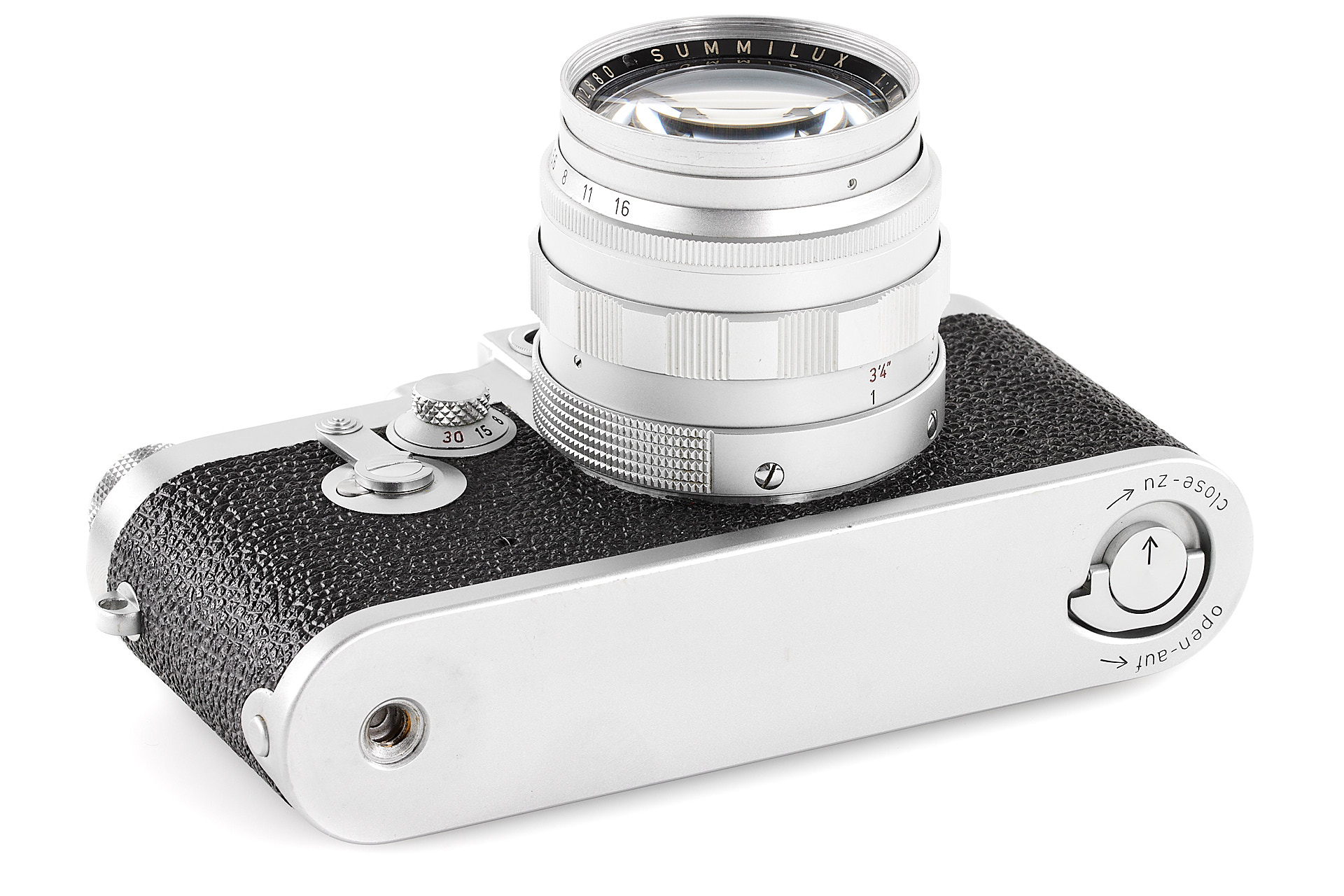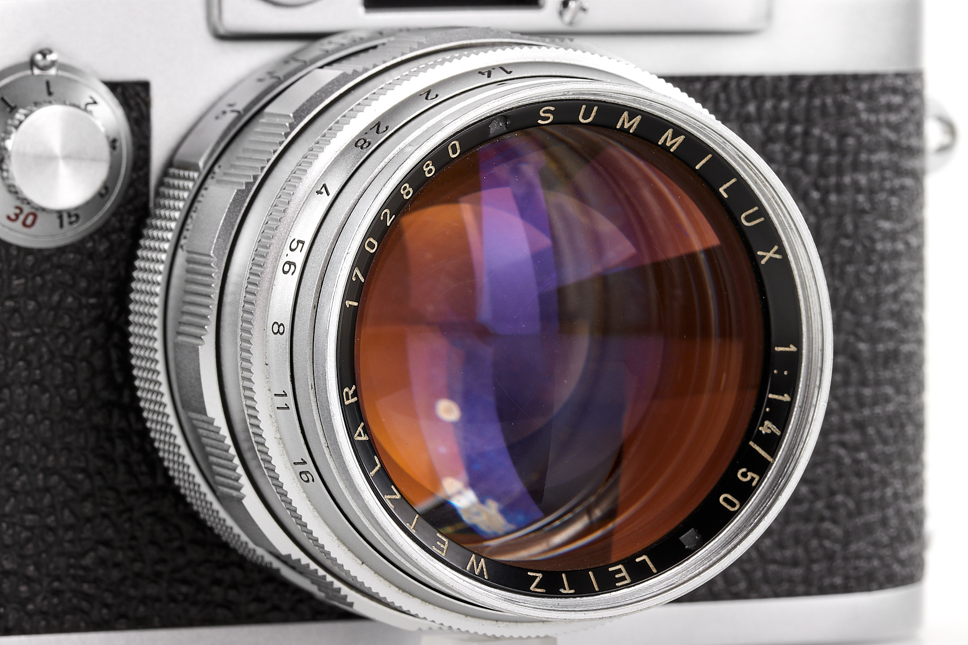 Body in near-mint condition and working order, with very rare and beautiful Summilux SOWGE 1.4/50mm no.1702880 (1959), optics showing traces of removed fungus and some haze, with XOOIM hood (with cap), only about 550 of these lenses have been produced!
