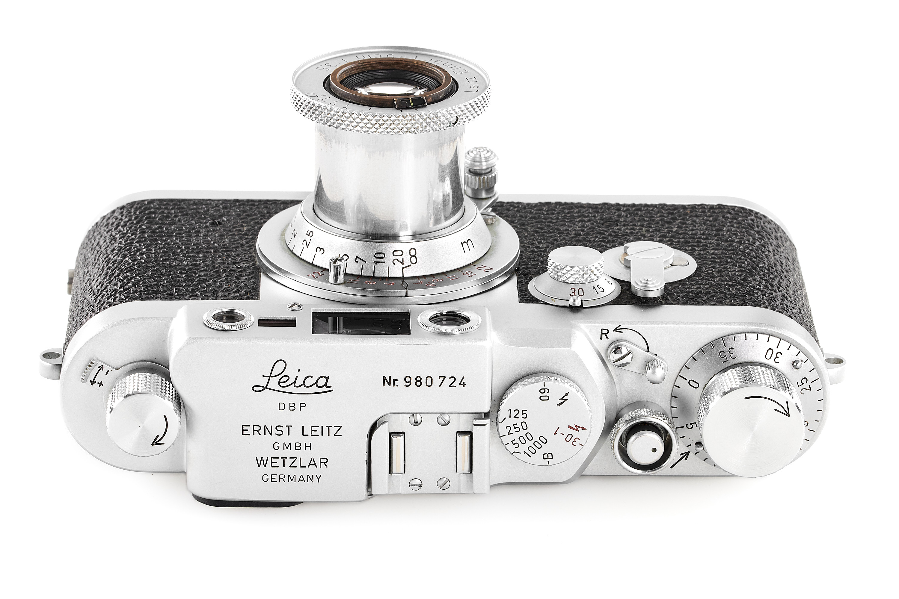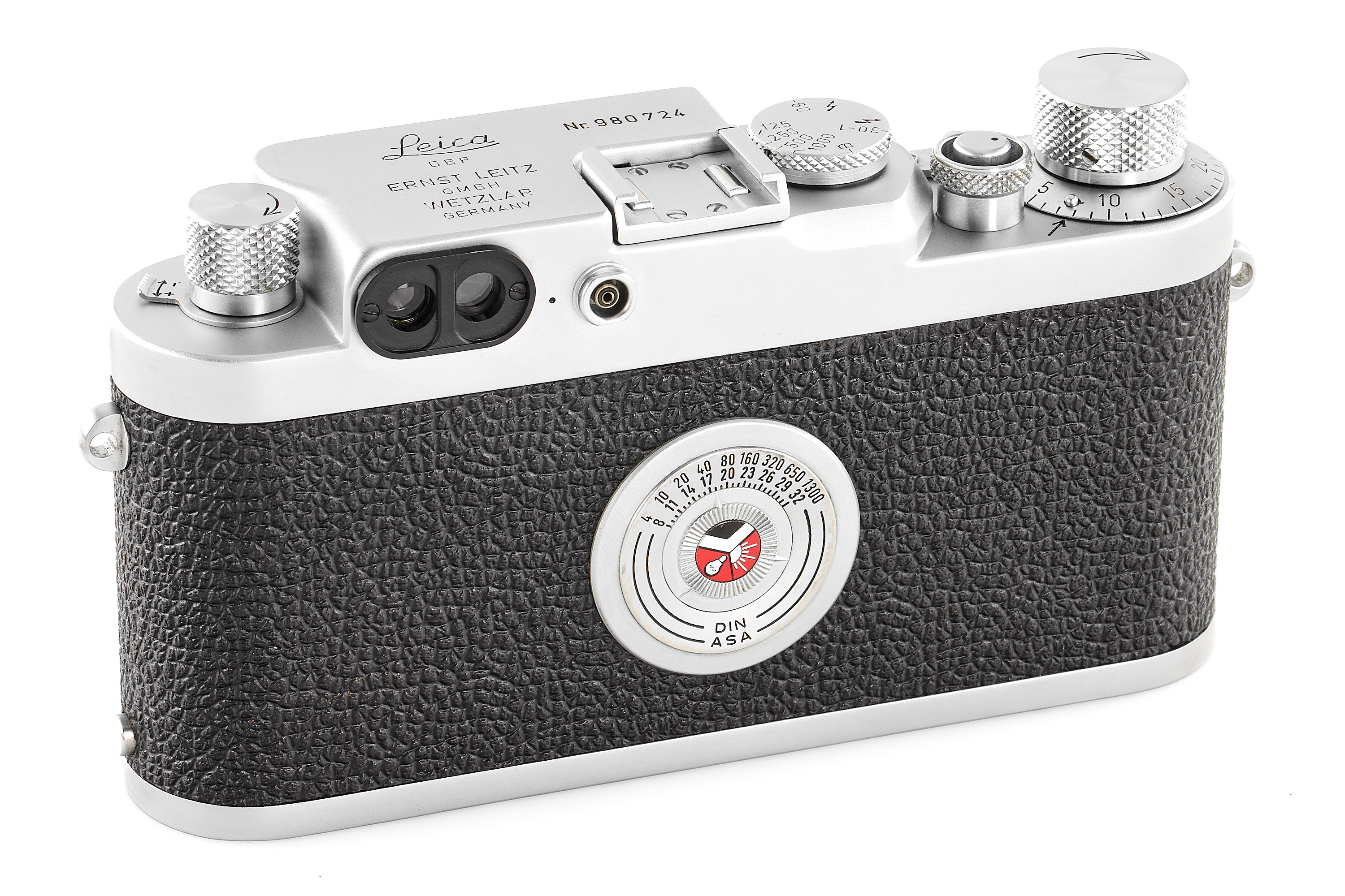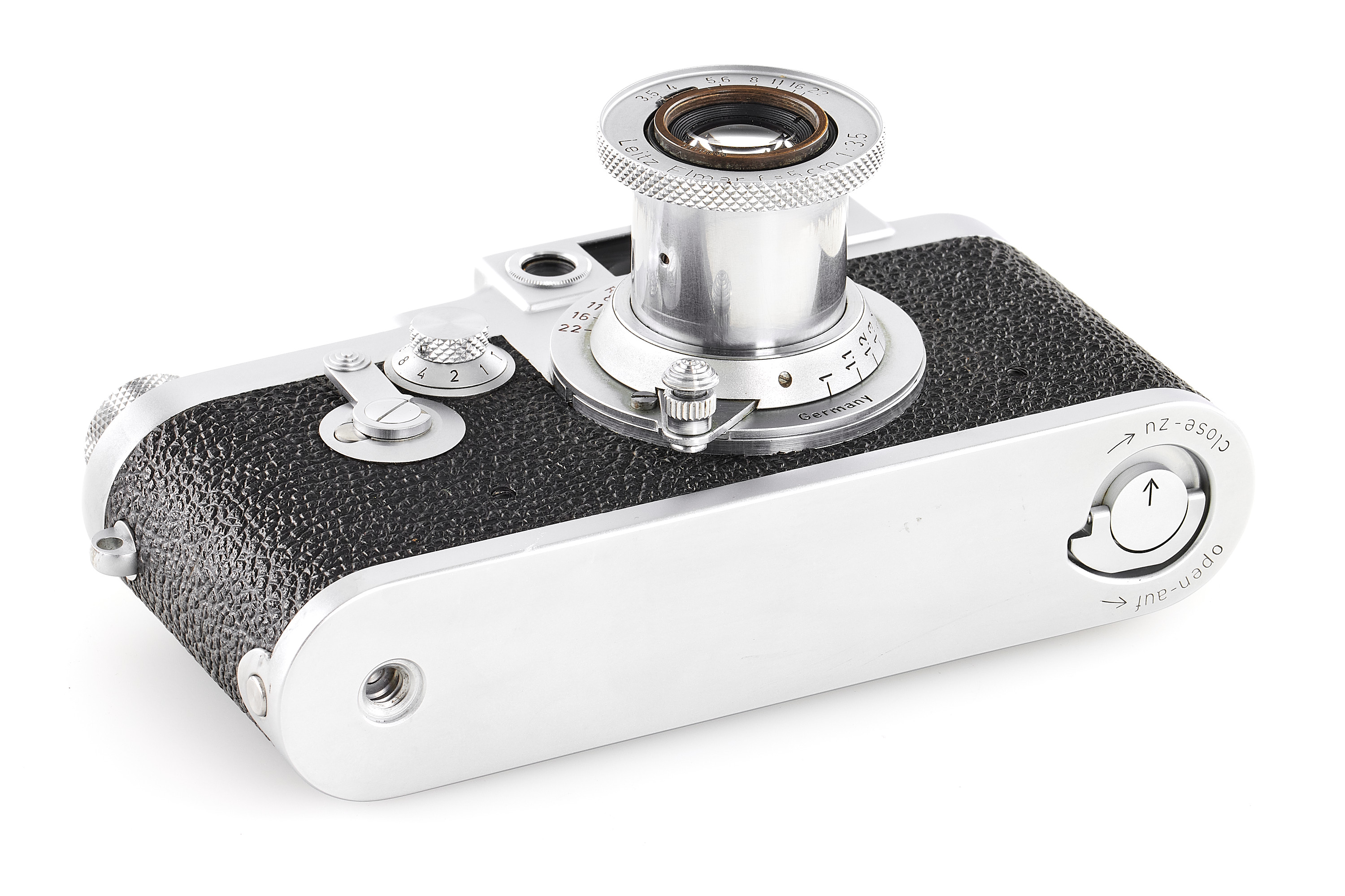 Very late chrome body from the last year of production, in absolutely mint condition and working order, together with red scale Elmar meter scale 3.5/5cm no.1010993, good optics only showing few light cleaning marks, with front lens cap, late Elmar 4/9cm no.1497503 (front lens cap).