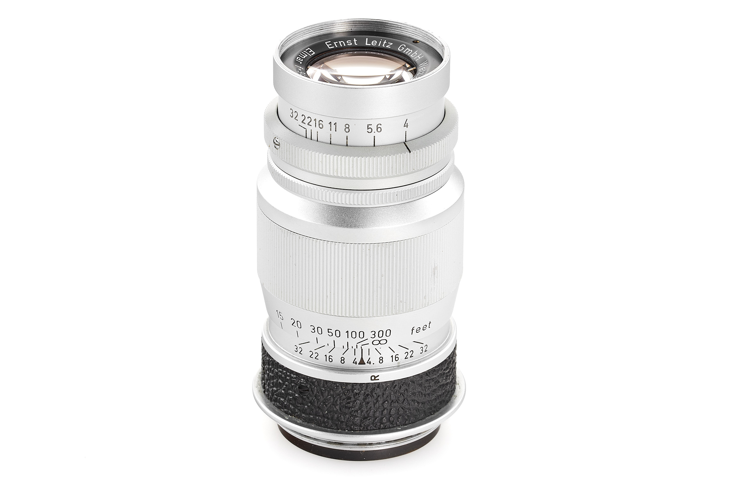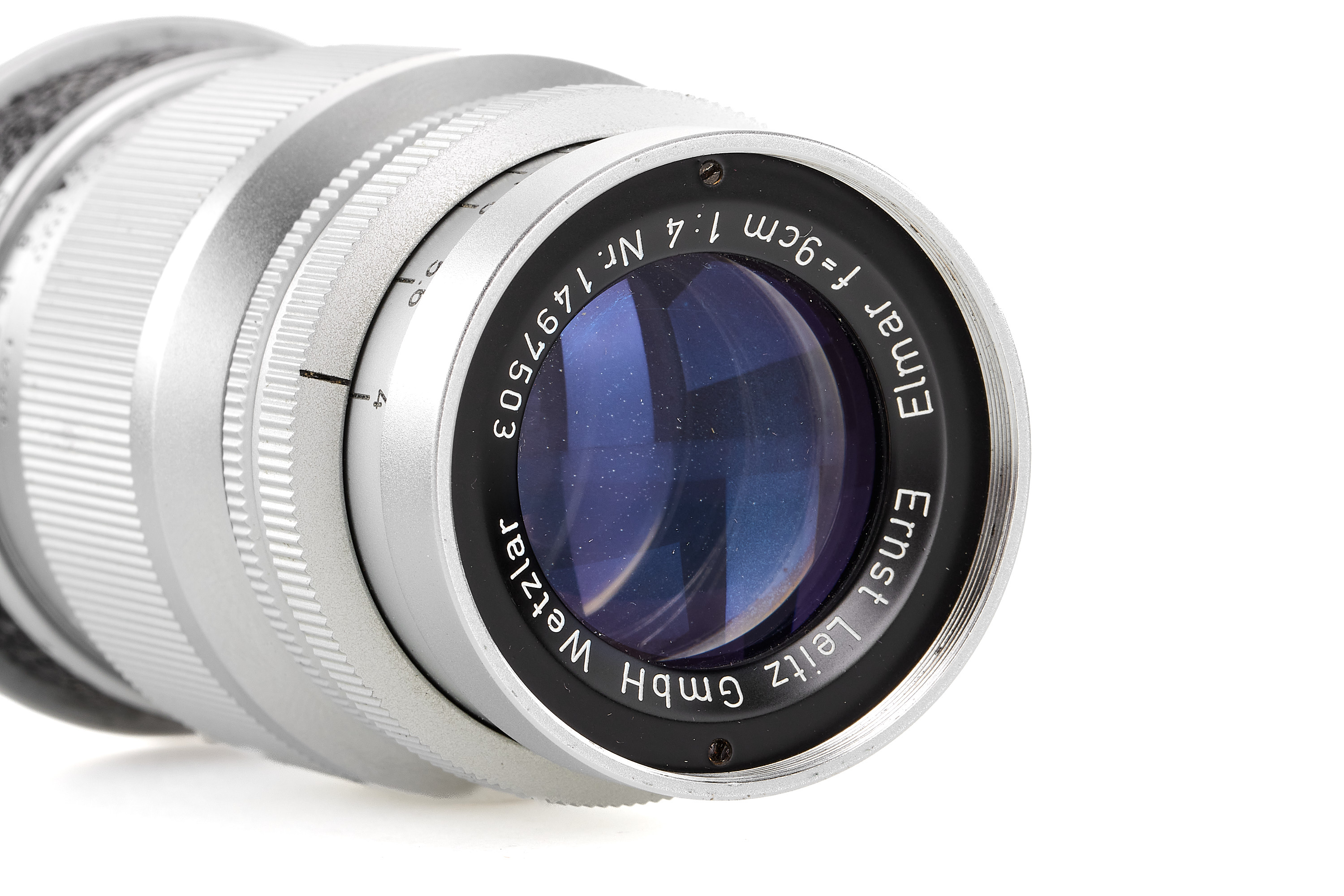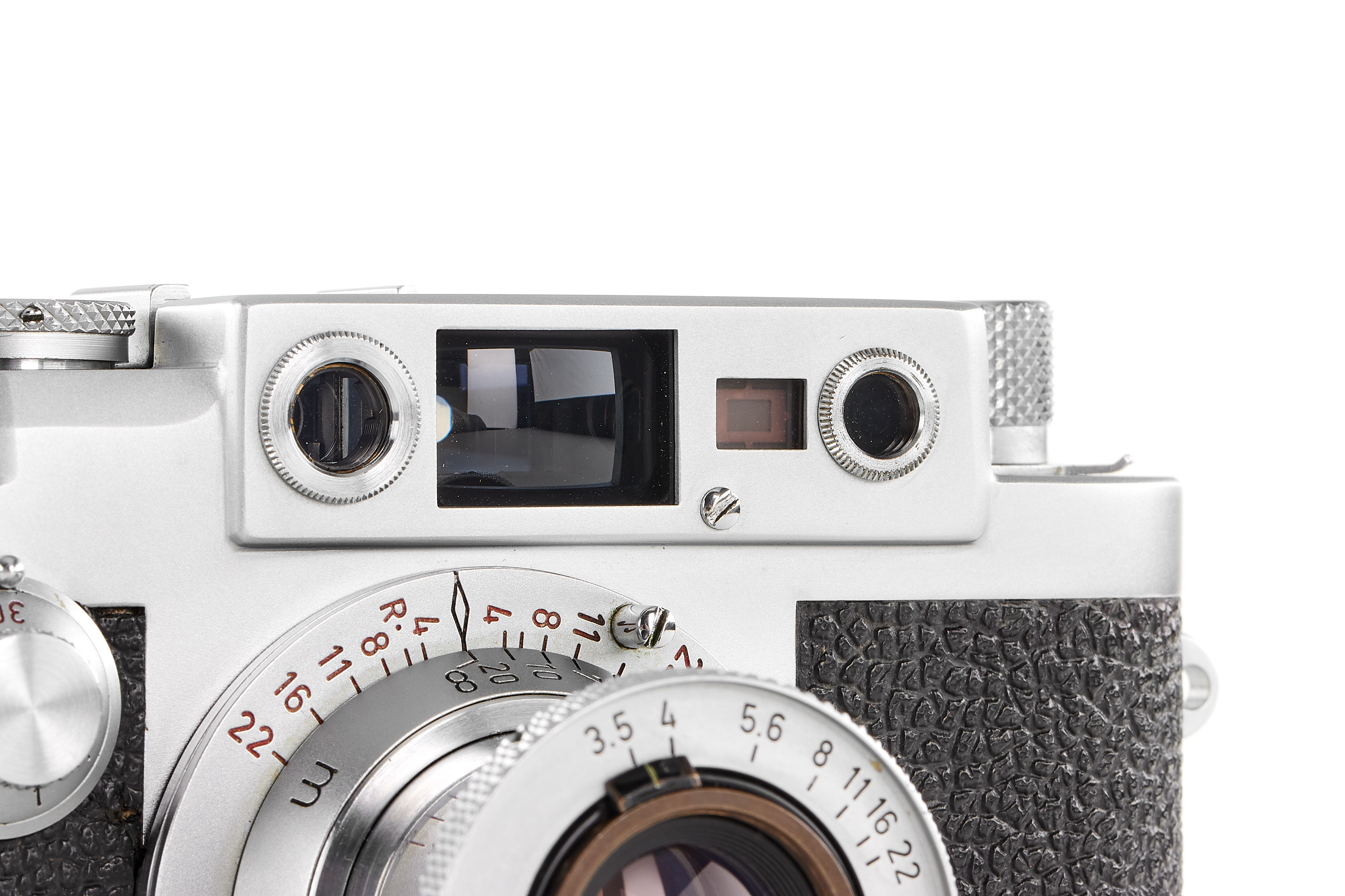 Very late chrome body from the last year of production, in absolutely mint condition and working order, together with red scale Elmar meter scale 3.5/5cm no.1010993, good optics only showing few light cleaning marks, with front lens cap, late Elmar 4/9cm no.1497503 (front lens cap).