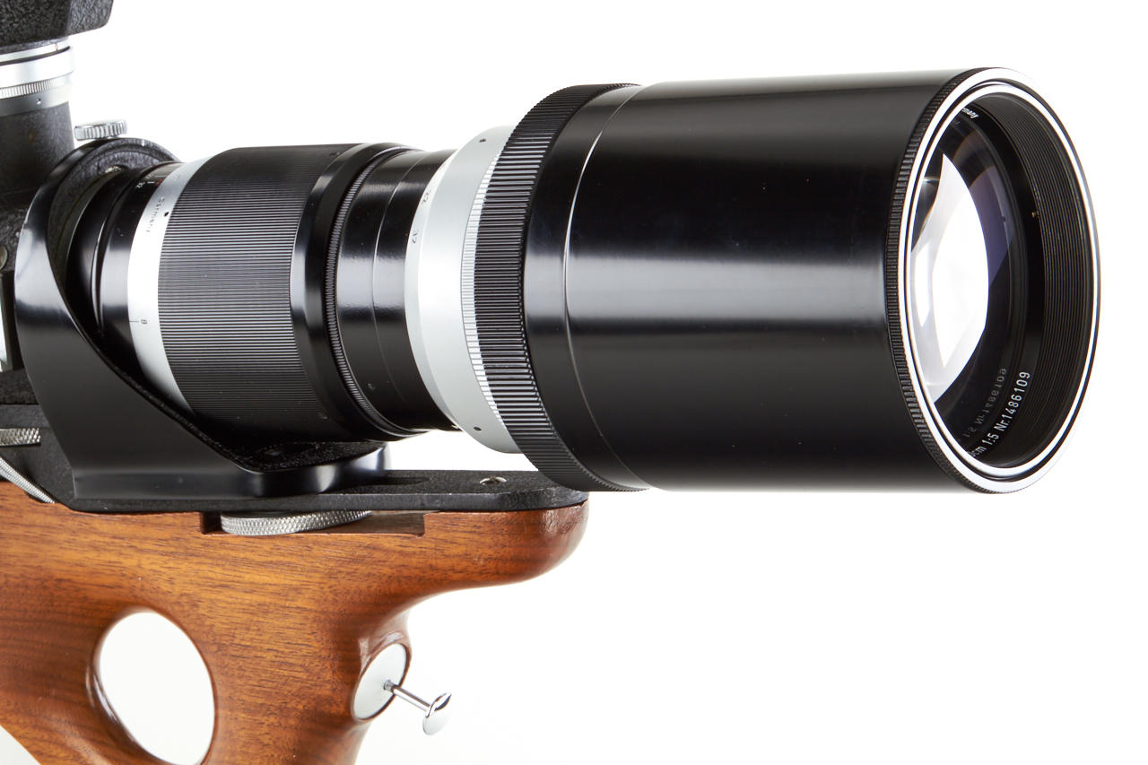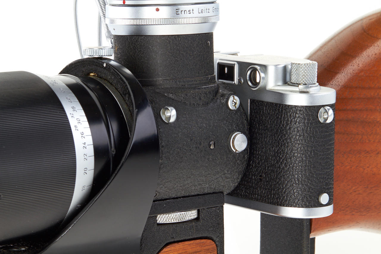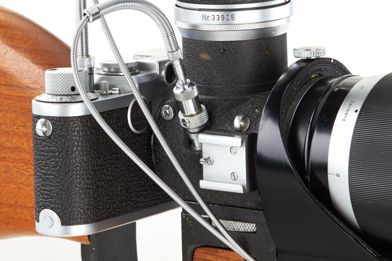 The complete set includes a matching Leica IIf no. 613603 and the Telyt 5/40 cm no. 1486109 (hood), Visoflex I no. 33925 with 45° PEGOO, SABRE gunstock with cable release – all in perfect condition. LITERATURE James L. Lager (ed.), Leica Illustrated History, Vol. II, Lenses, 1994, p. 188. The “Sabre Photographic Supply Company“, located in the state of Illinois in the USA, only produced the well known “Sabre Stock” Leica rifle, custom-made for the screw-mount and M-series Leicas, for one year (1956 to 1957), but this was never officially sold by Leitz. Therefore, we can only estimate how many of these were sold in the USA – conservative estimates ranging between two and three dozen. However, the “Sabre Stock”, painstakingly crafted in keeping with Leitz quality standards, was not only a piece of well thought-out photographic equipment for Leica cameras, but is also a joy to behold for any lover of high precision products. The use of high-quality materials as well as great accuracy and precision in its making led to a handy Leica rifle, sure to fascinate any Leica fan to this day.